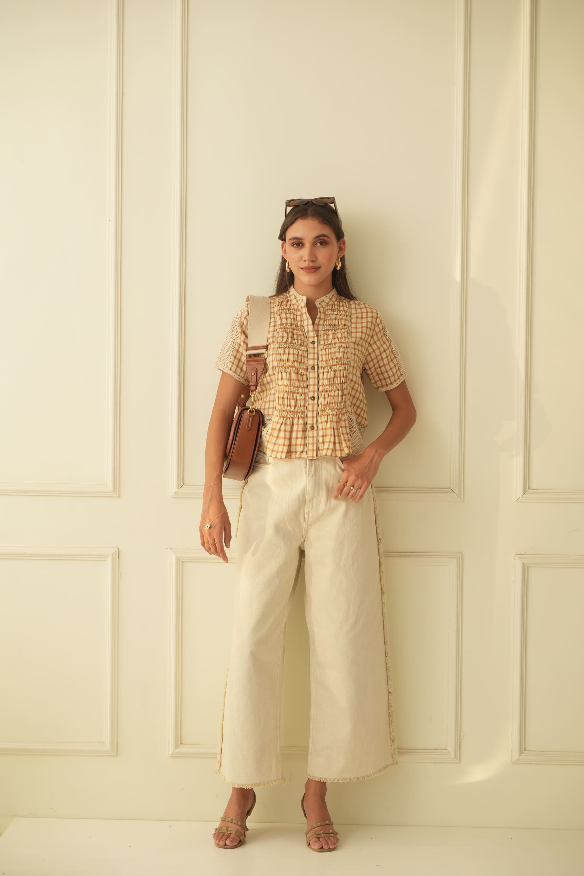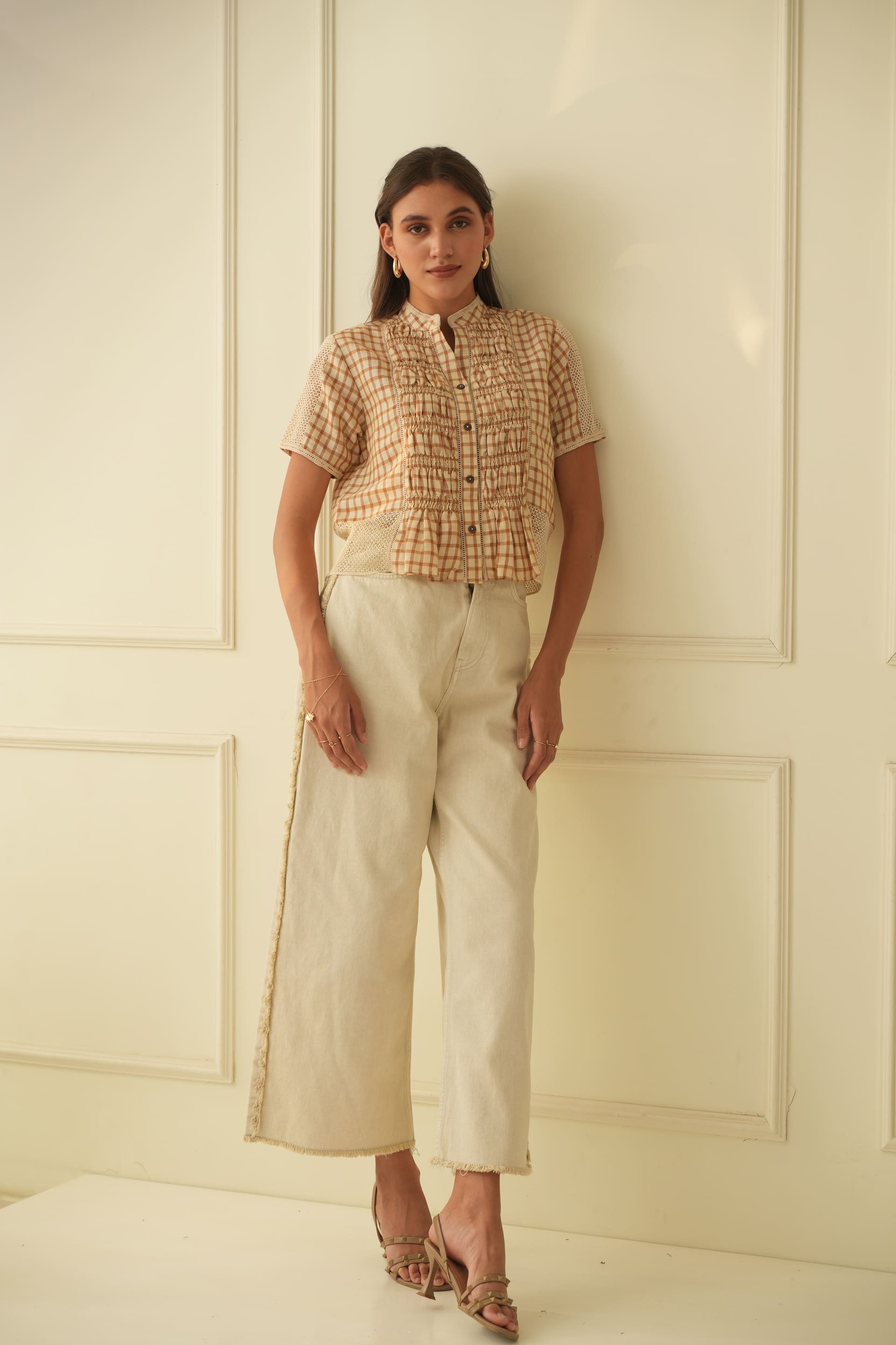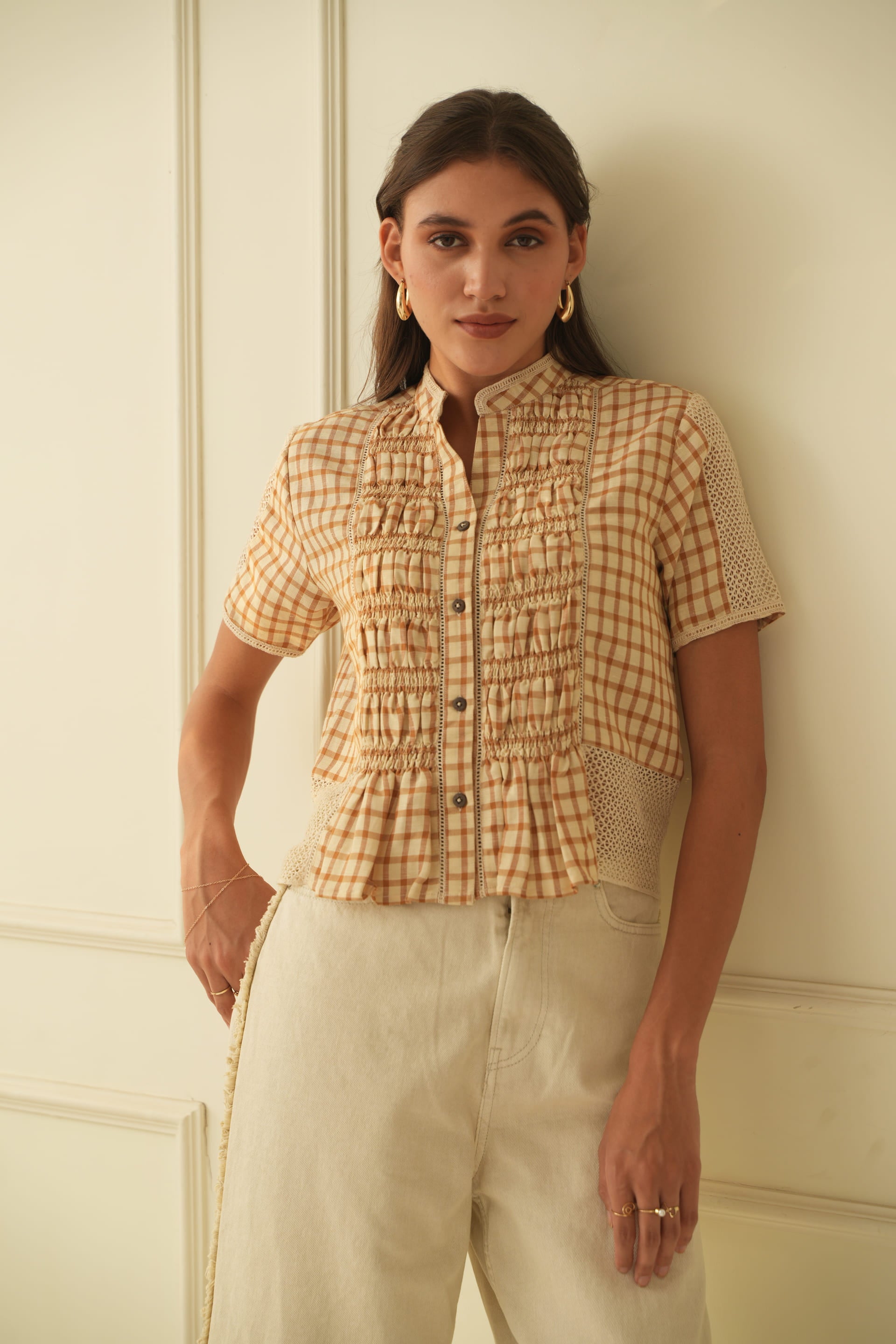 This Alice Yellow Laced shirt features a yellow cotton check fabric with a laced hem and smocked panels attached with delicate lace. The lace on the sleeve hem adds a unique touch to this summery and beautiful top. Made from high-quality cotton, it offers both comfort and style.