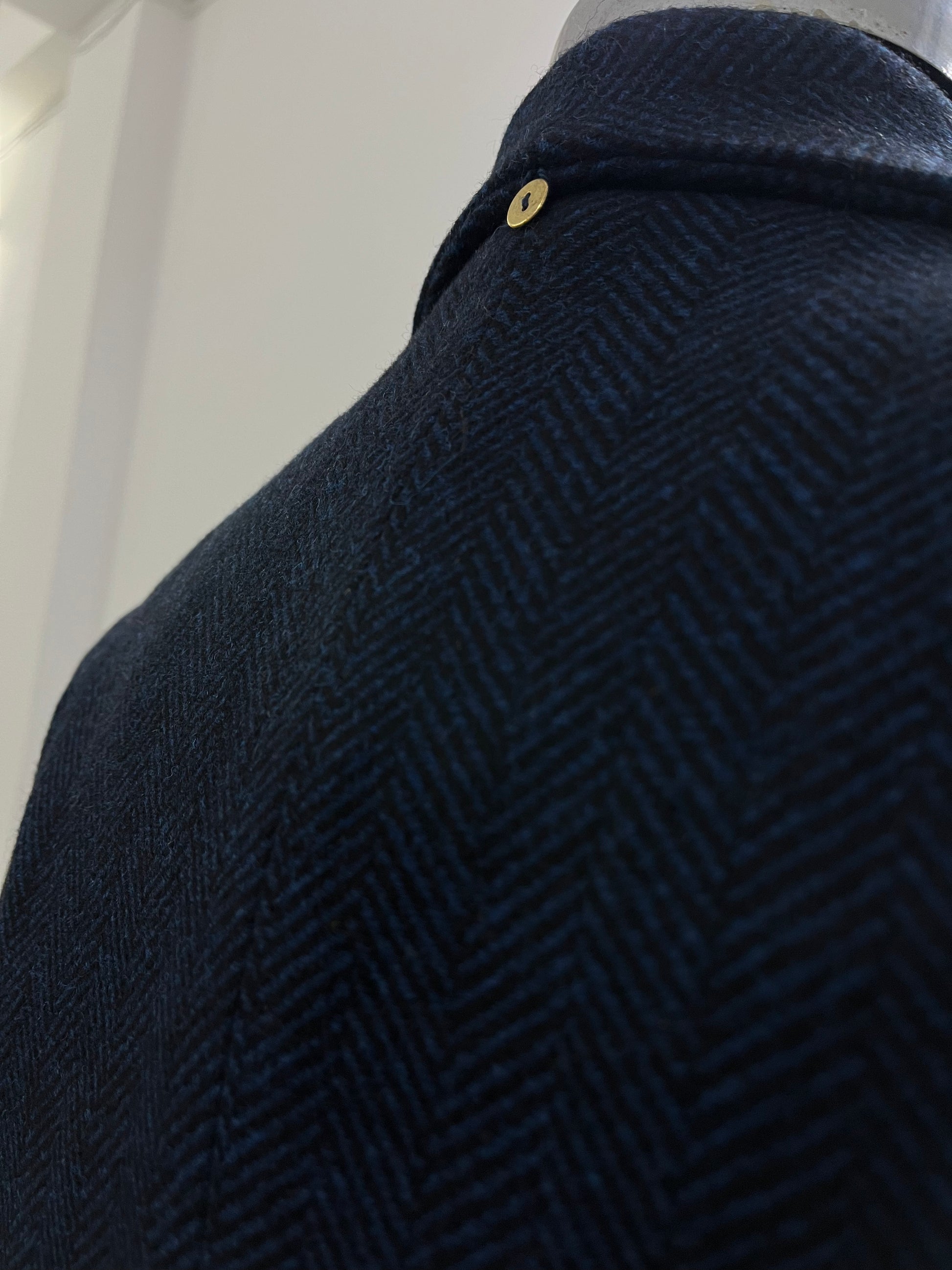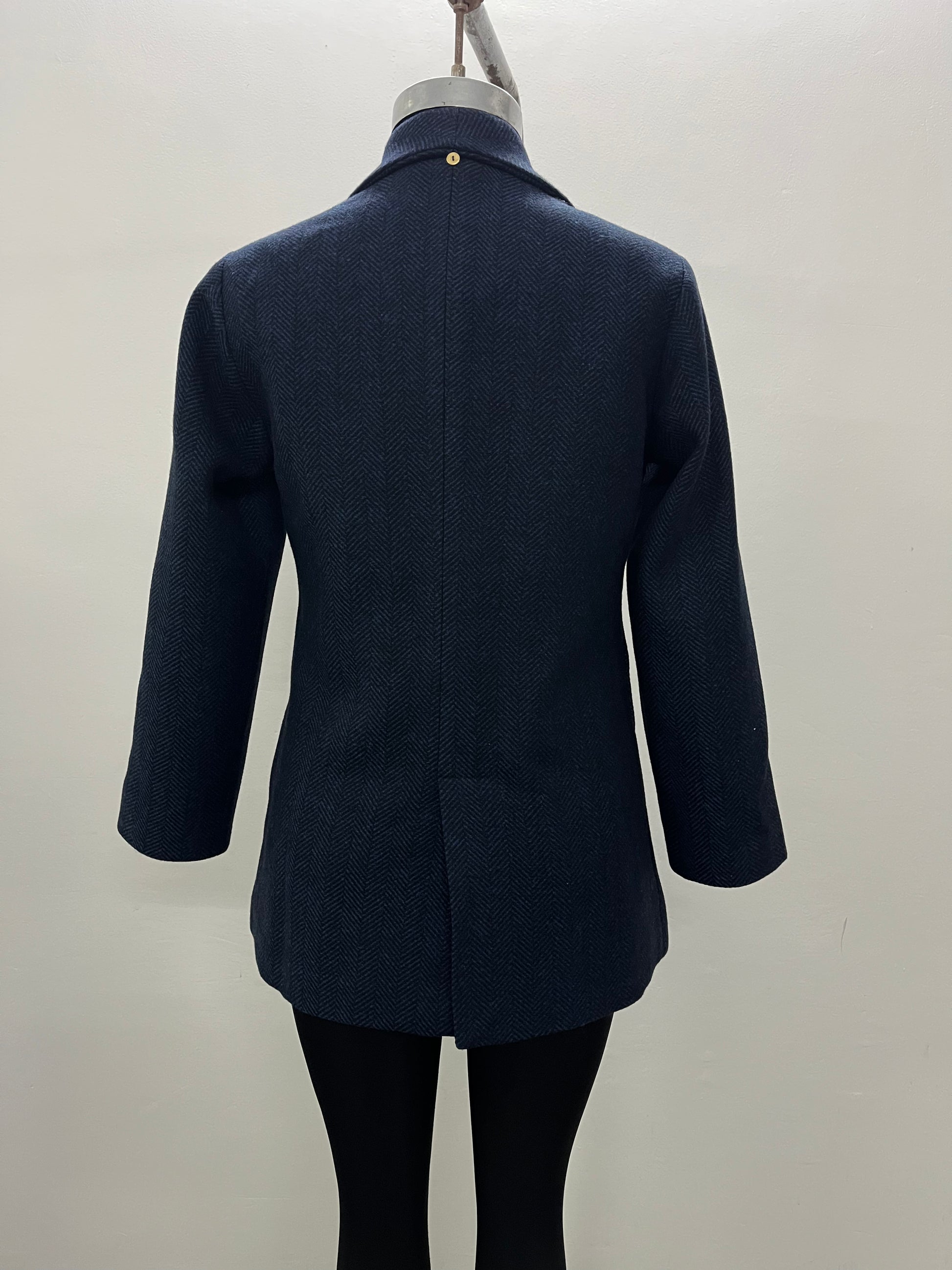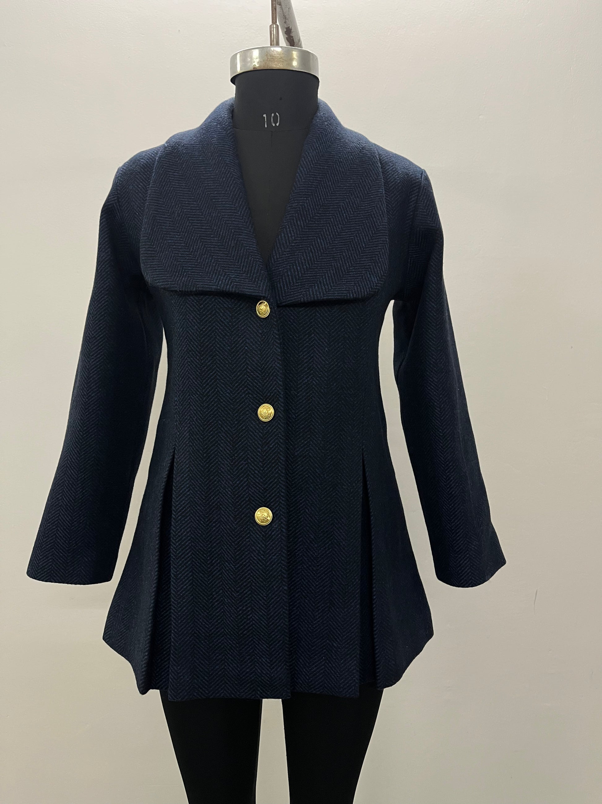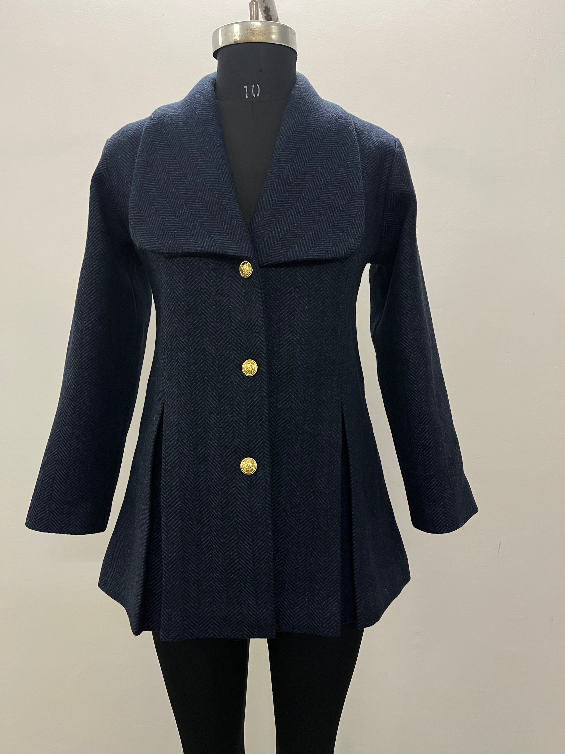 This chic and luxurious Blare jacket features a feminine cut, herringbone weaving, and a front box pleats for a flattering silhouette. The gold colour buttons add a touch of elegance to the blue woollen material. Stay warm and stylish with this must-have jacket.