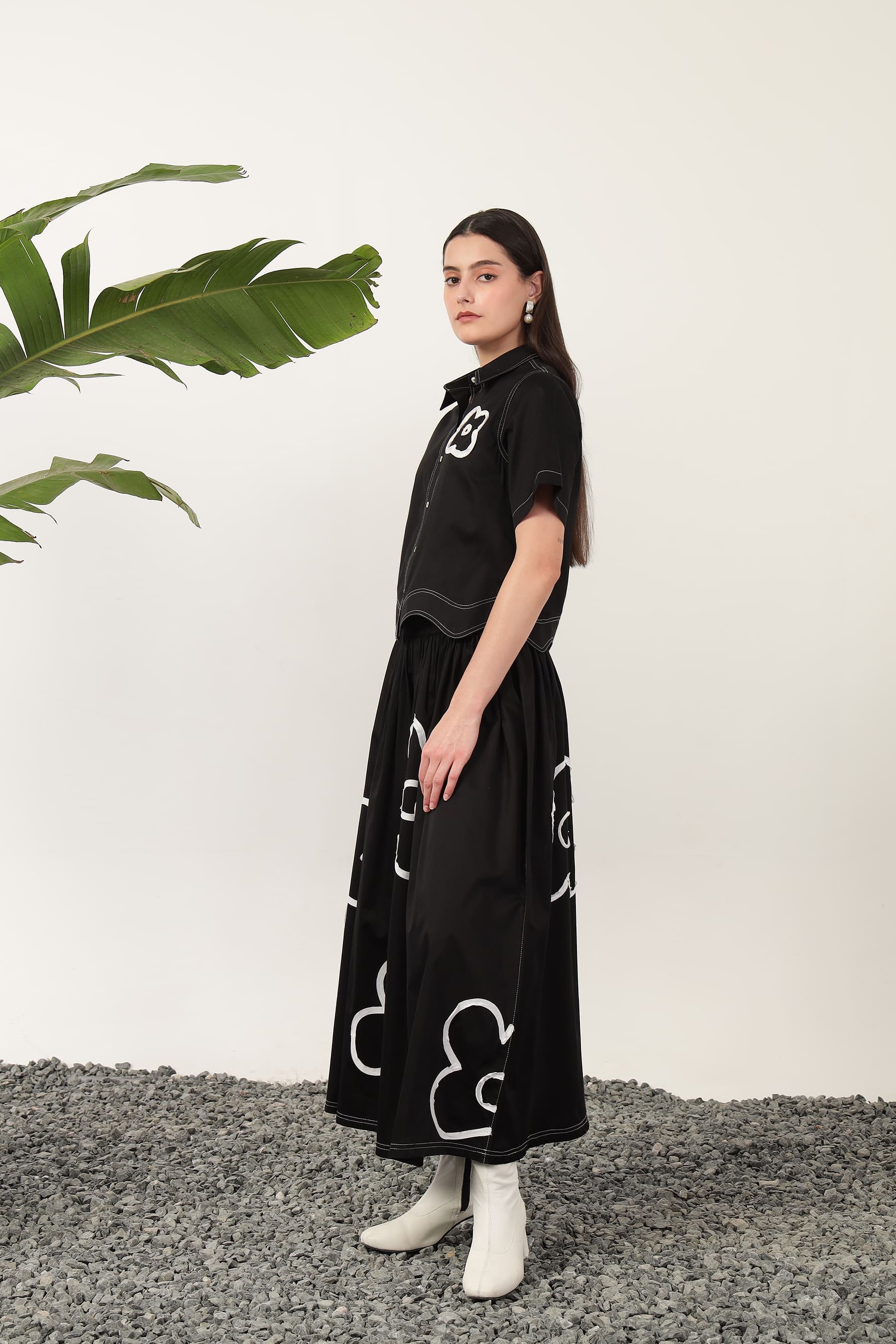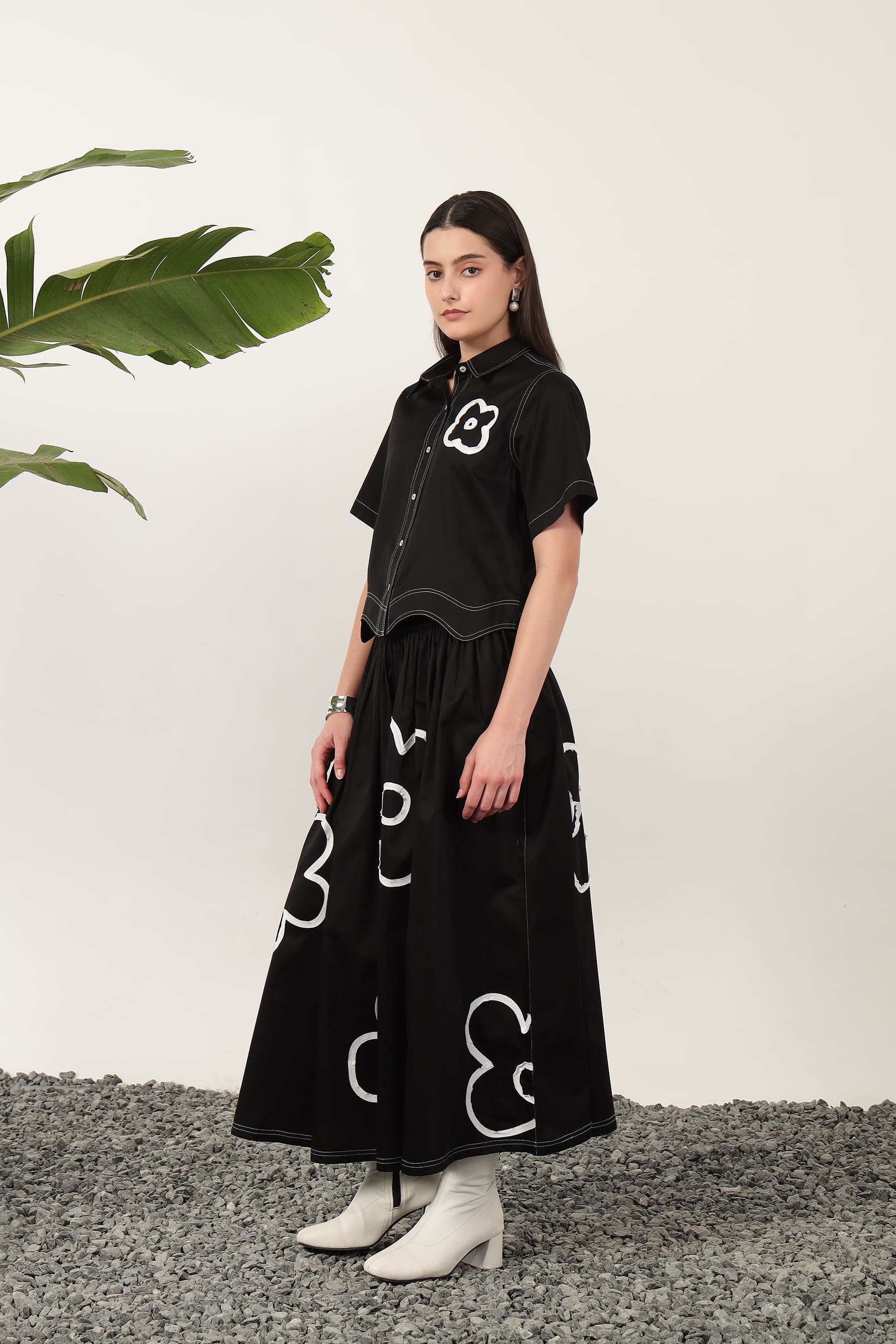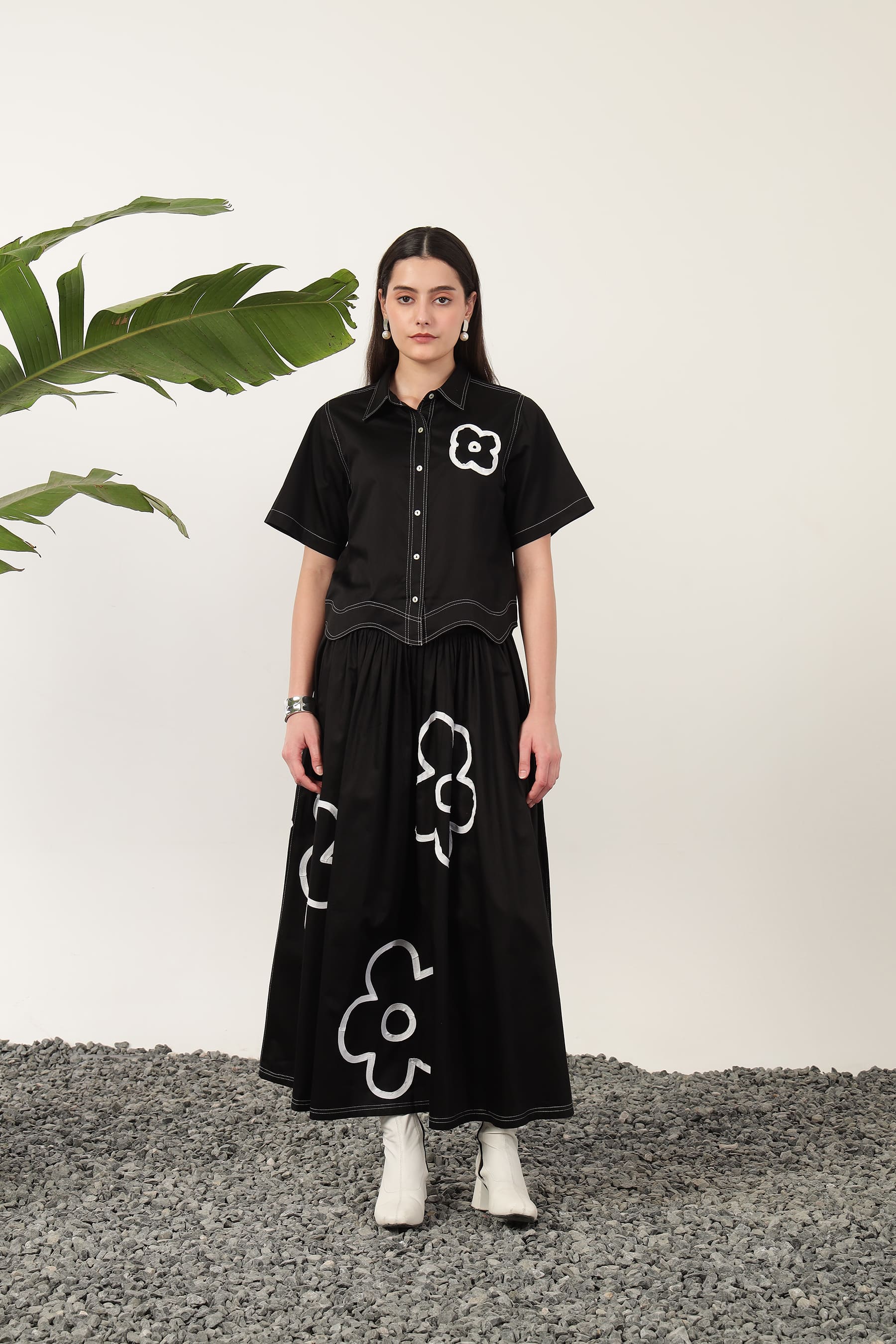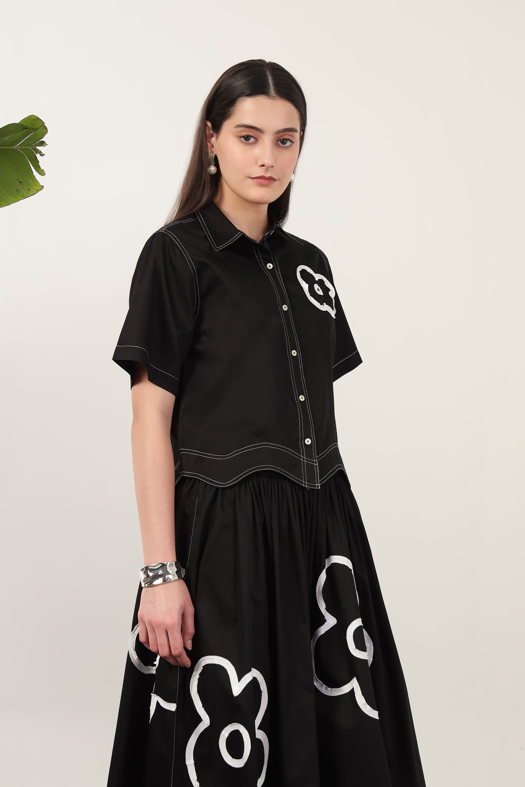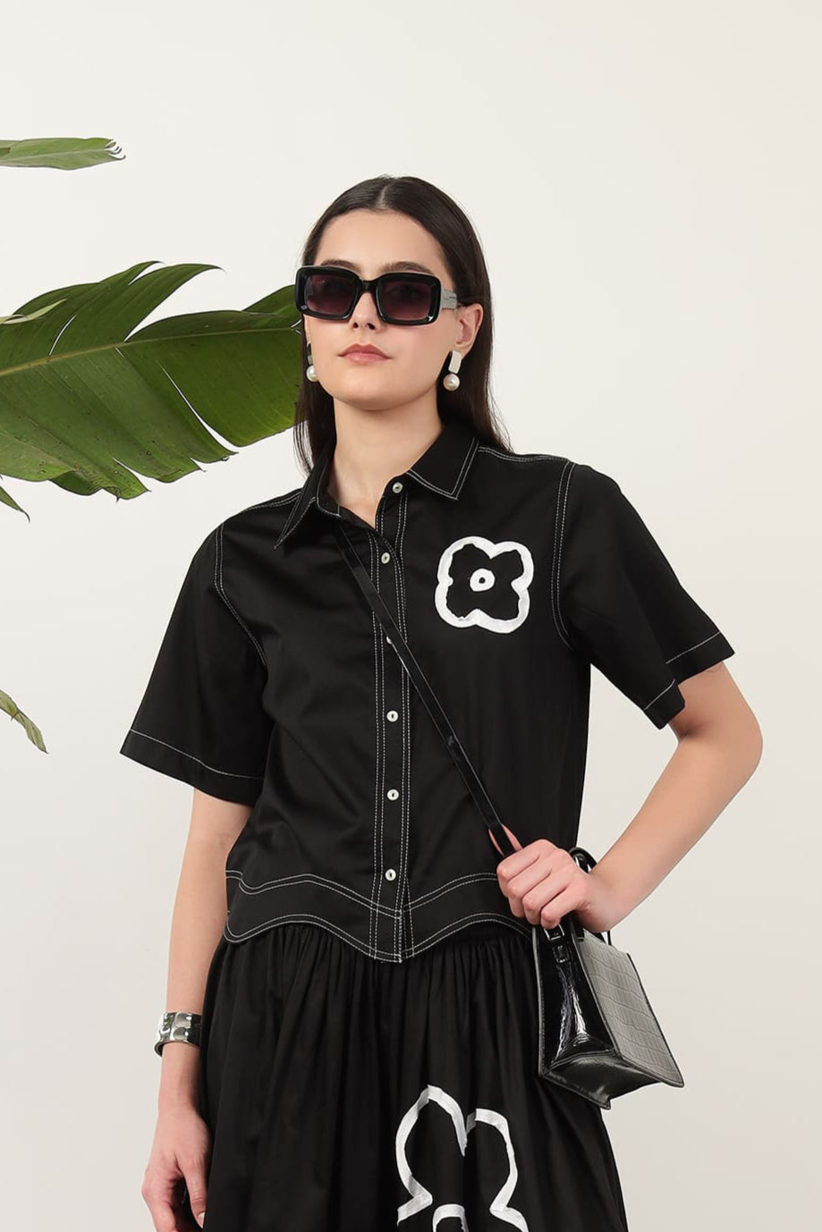 This distinguished Capri Appliqué Shirt in noir is a study in refined contrast. Crafted in classic black, it features meticulous white contrast stitching that adds subtle texture and sophistication. Delicate white flower appliqué details further elevate the design, blending artistic charm with contemporary elegance. A versatile piece that transitions effortlessly from day to evening.
