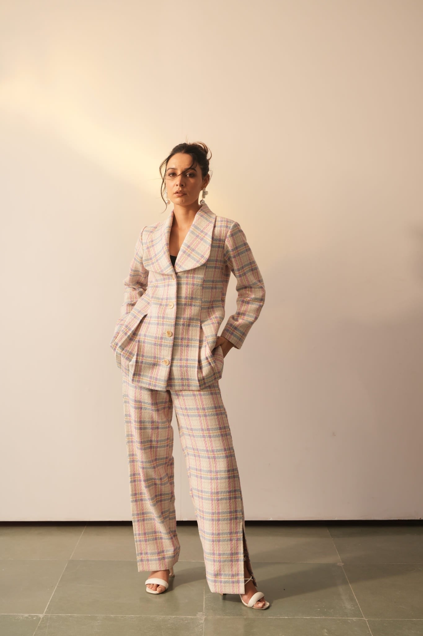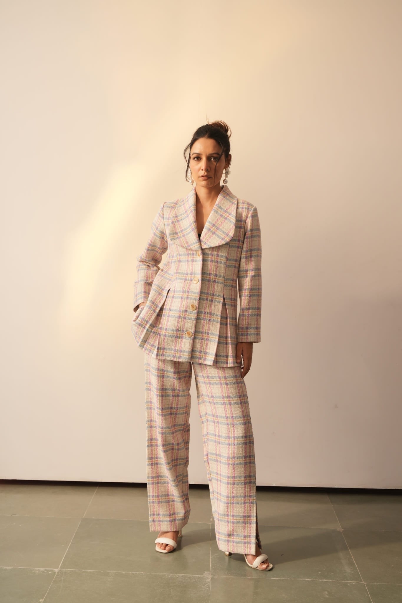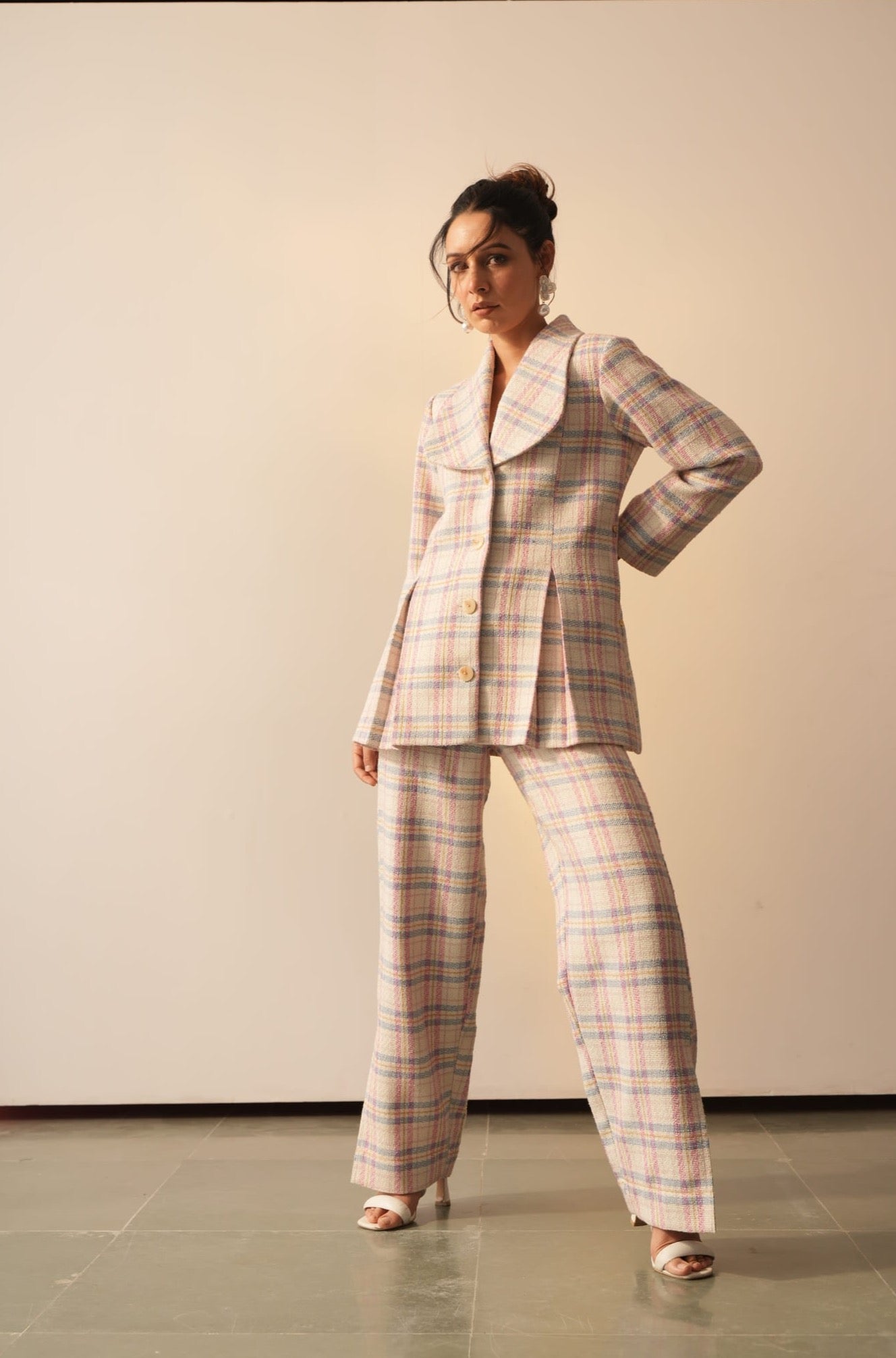 The Carol pink check Jacket is fashionable, versatile, and perfect for any occasion. Crafted with wool blend fabric in classic pink blue check and a sheen yarn for a timeless elegance, this jacket features a round, feminine lapel with a front box pleat and adorned with stunning buttons & pocket for a subtly sophisticated look. The set include a straight leg fit trousers, have functional pockets for ease. Whether you're dressing up or down, this set will provide the perfect look for every occasion.