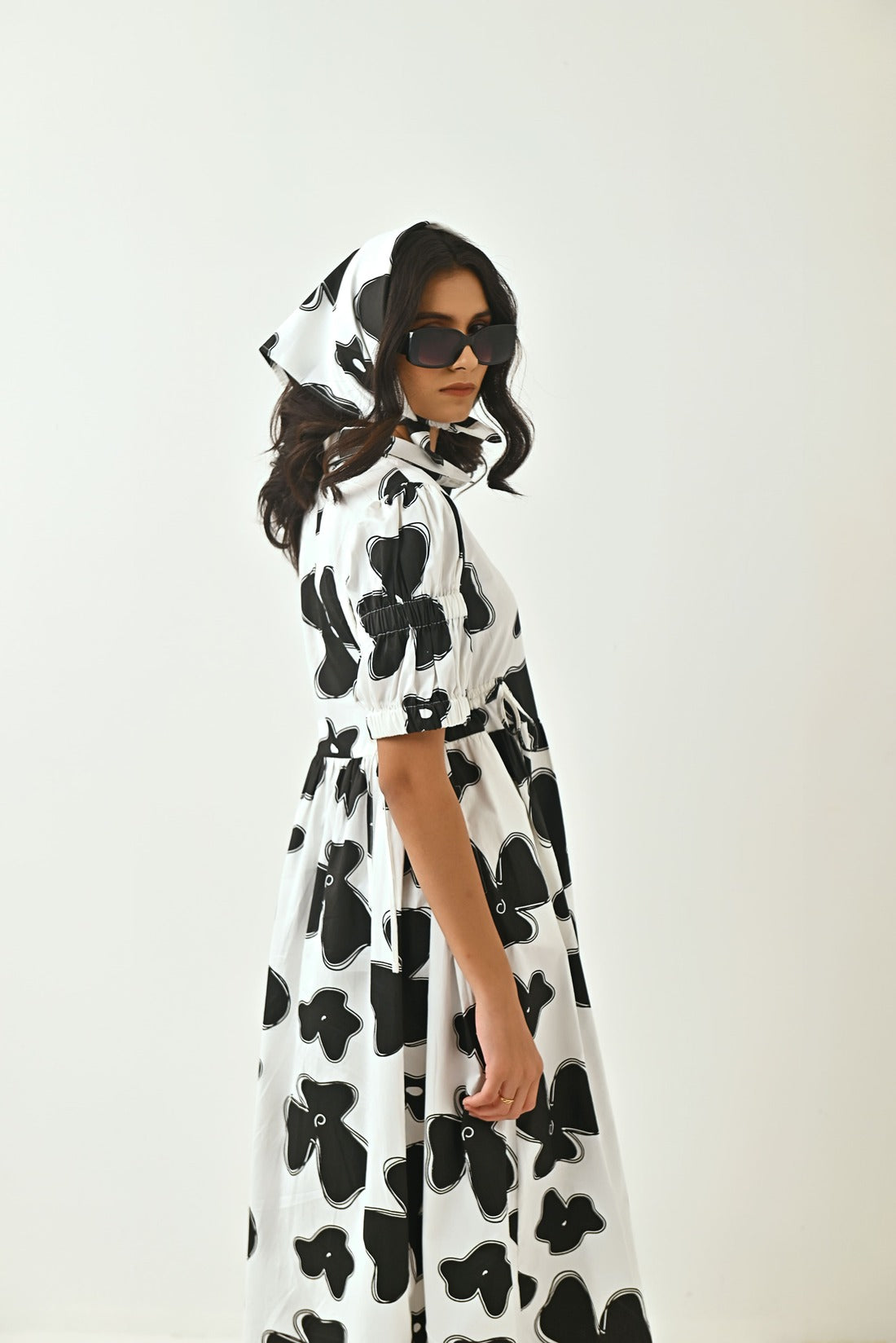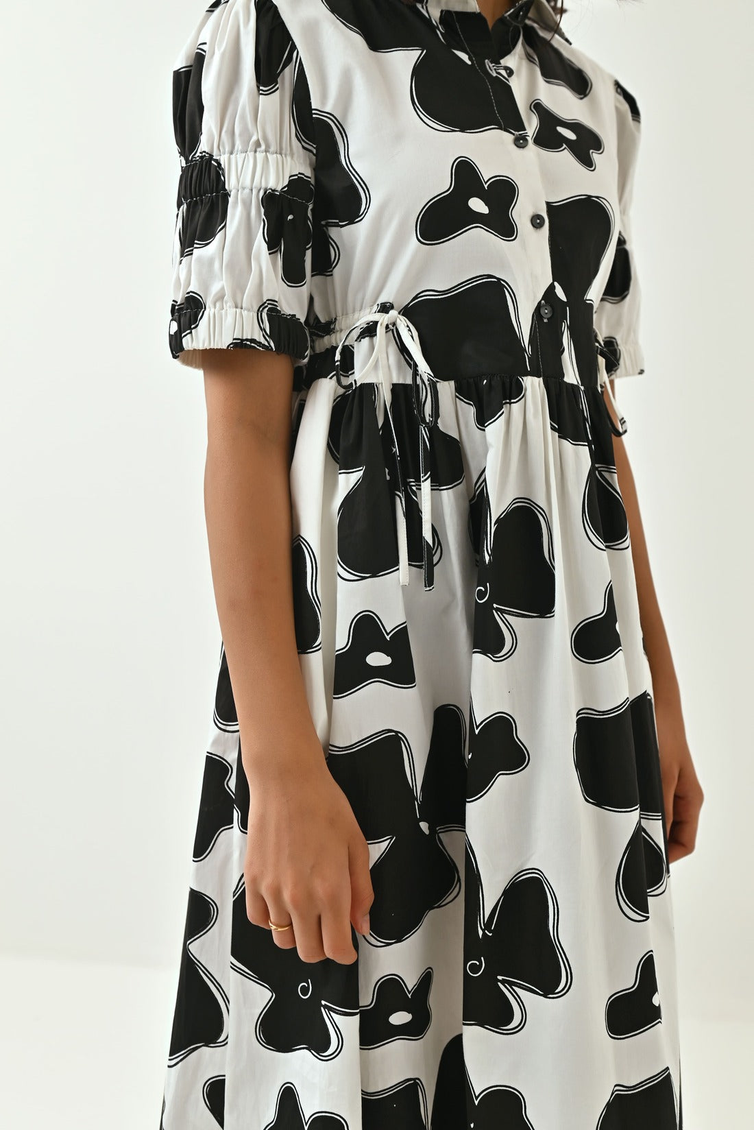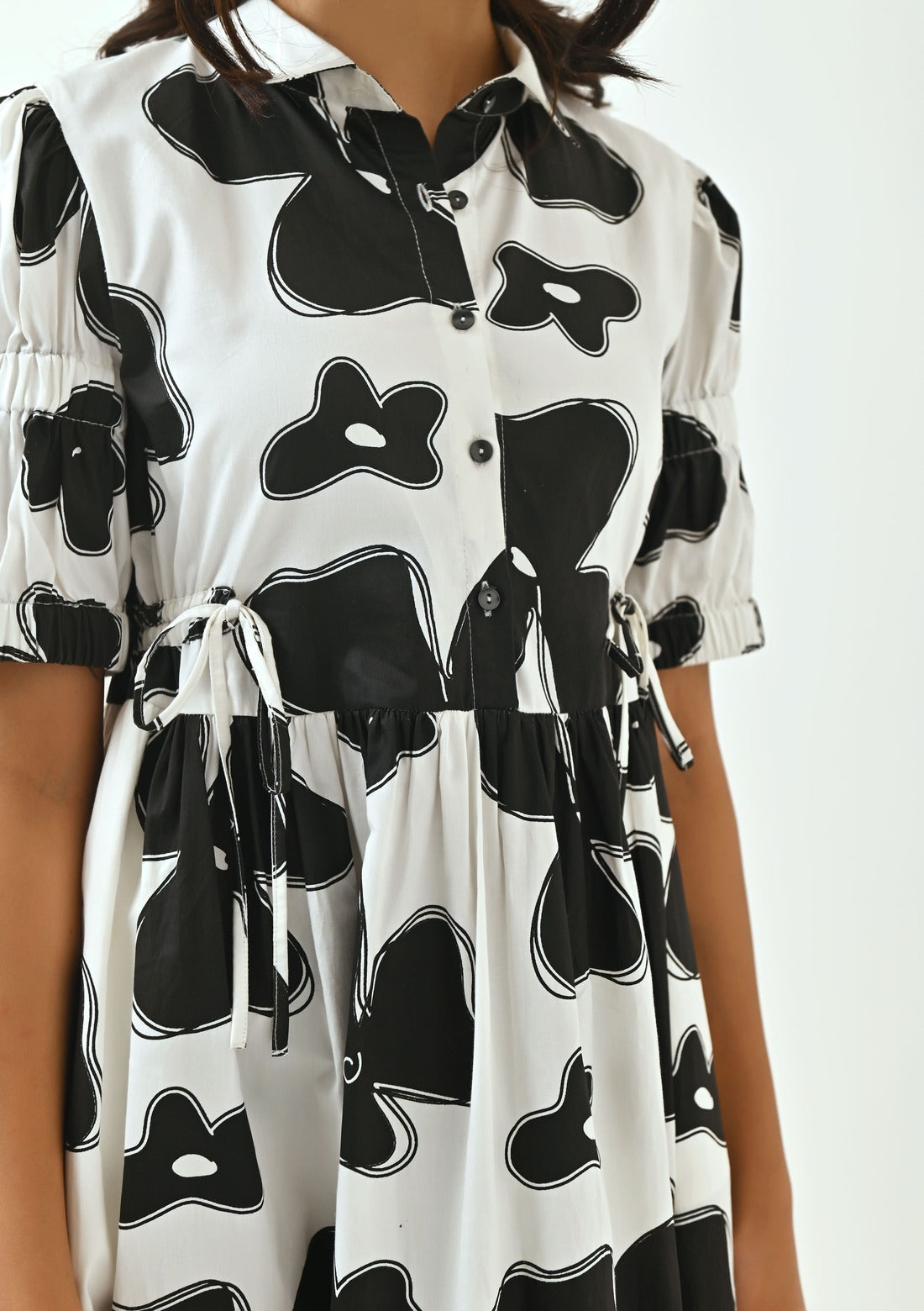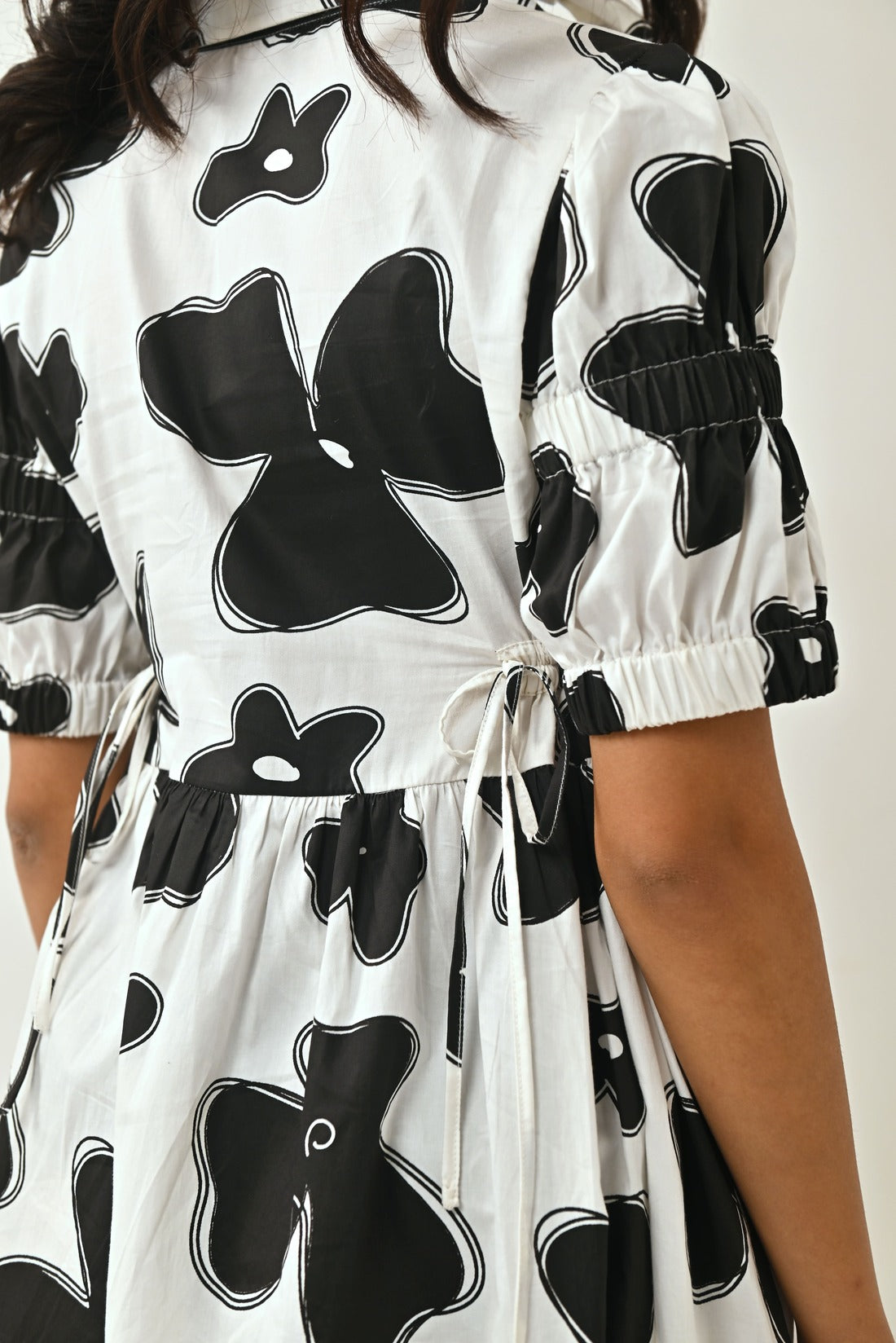 The Dress Is Known For Its Chic Personality And Playfulness.Carefully Crafted Flax Flower Print In Black Colour. Dress Comes With Shirt Collar, Elasticated Sleeves ,has Draw Strings To Adjust and Scrunch The Waist Line As Required, The Draw Strings Are Followed Till The Back Of The Dress. Style It up With a Bandana To Stand Out In The Crowd.