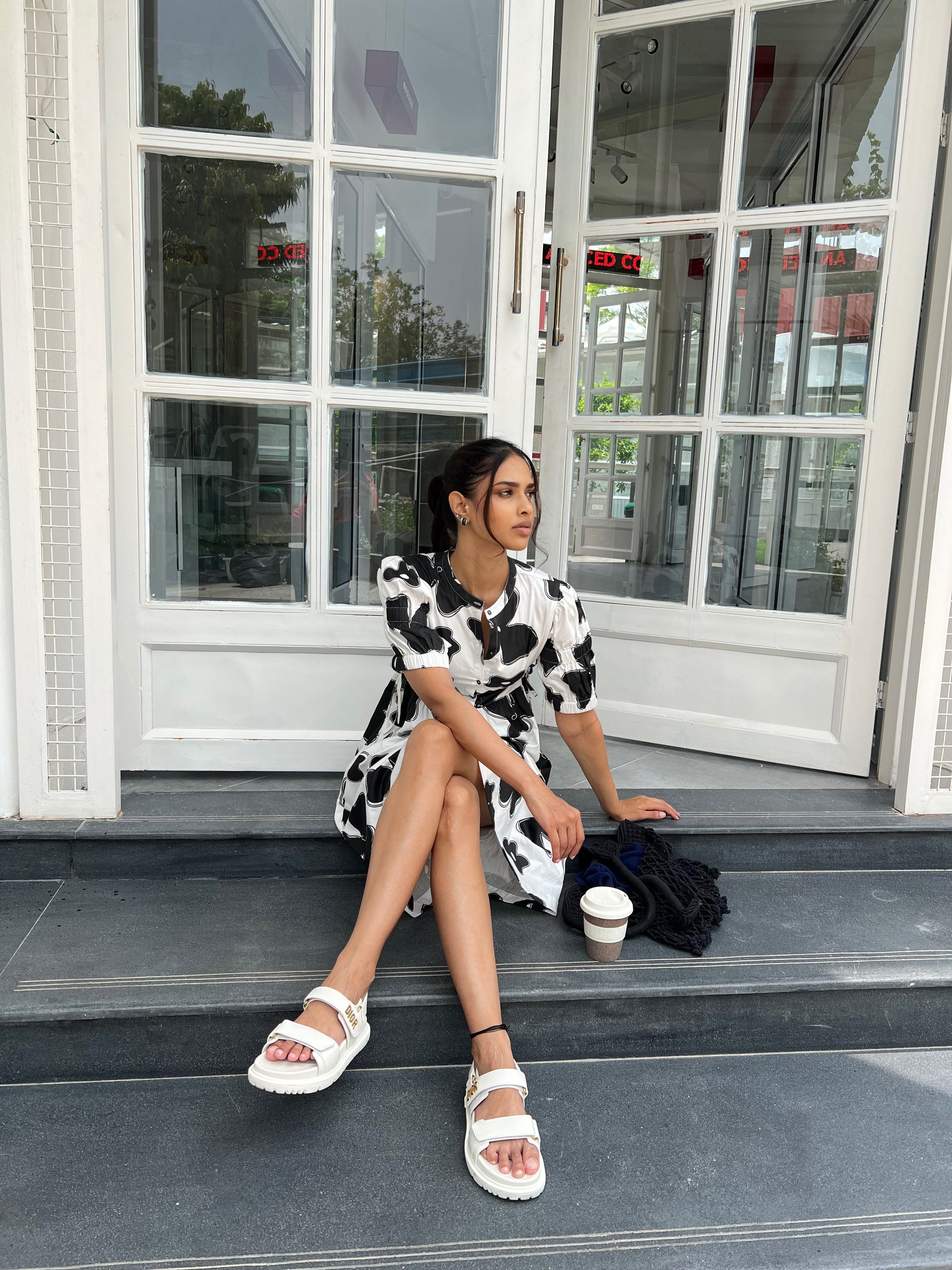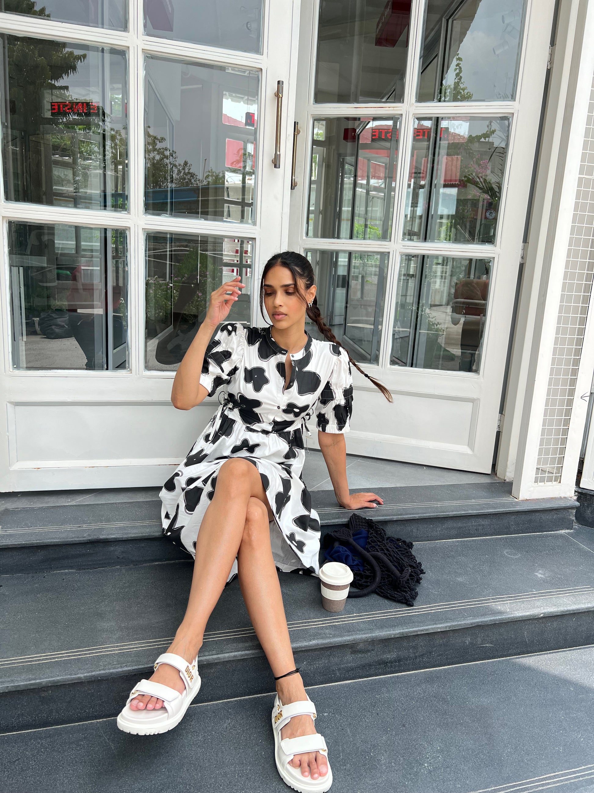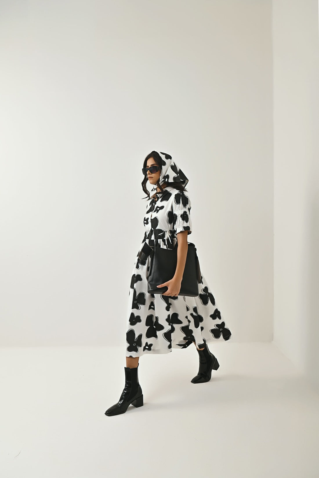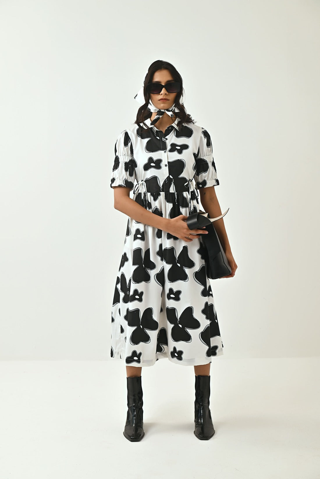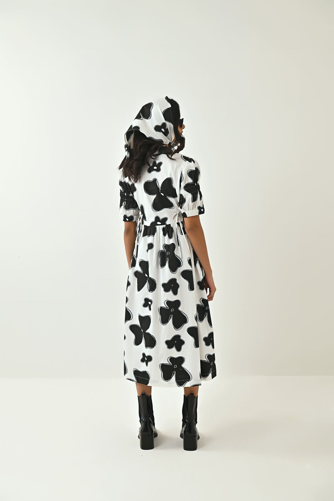 The Dress Is Known For Its Chic Personality And Playfulness.Carefully Crafted Flax Flower Print In Black Colour. Dress Comes With Shirt Collar, Elasticated Sleeves ,has Draw Strings To Adjust and Scrunch The Waist Line As Required, The Draw Strings Are Followed Till The Back Of The Dress. Style It up With a Bandana To Stand Out In The Crowd.
