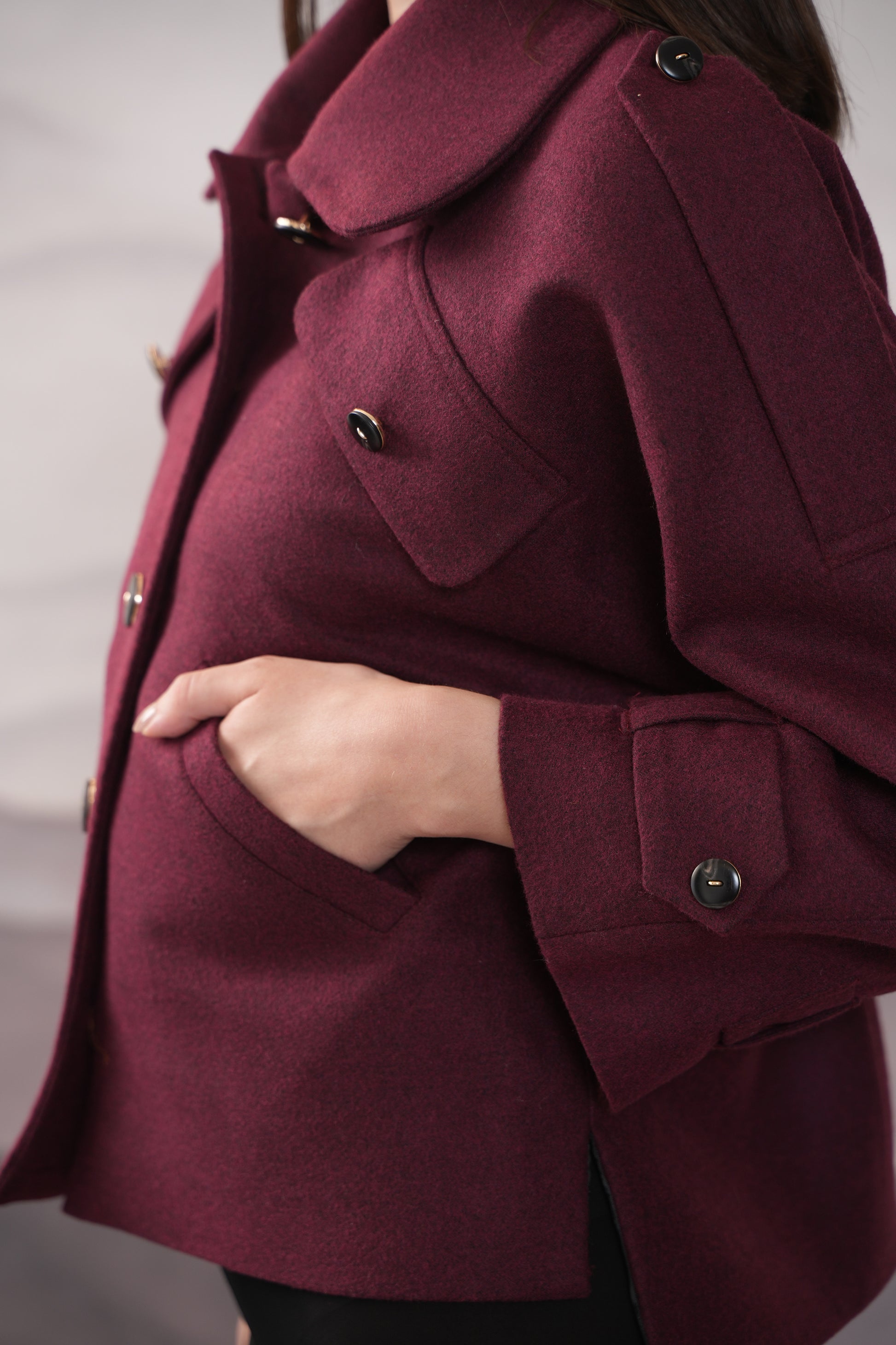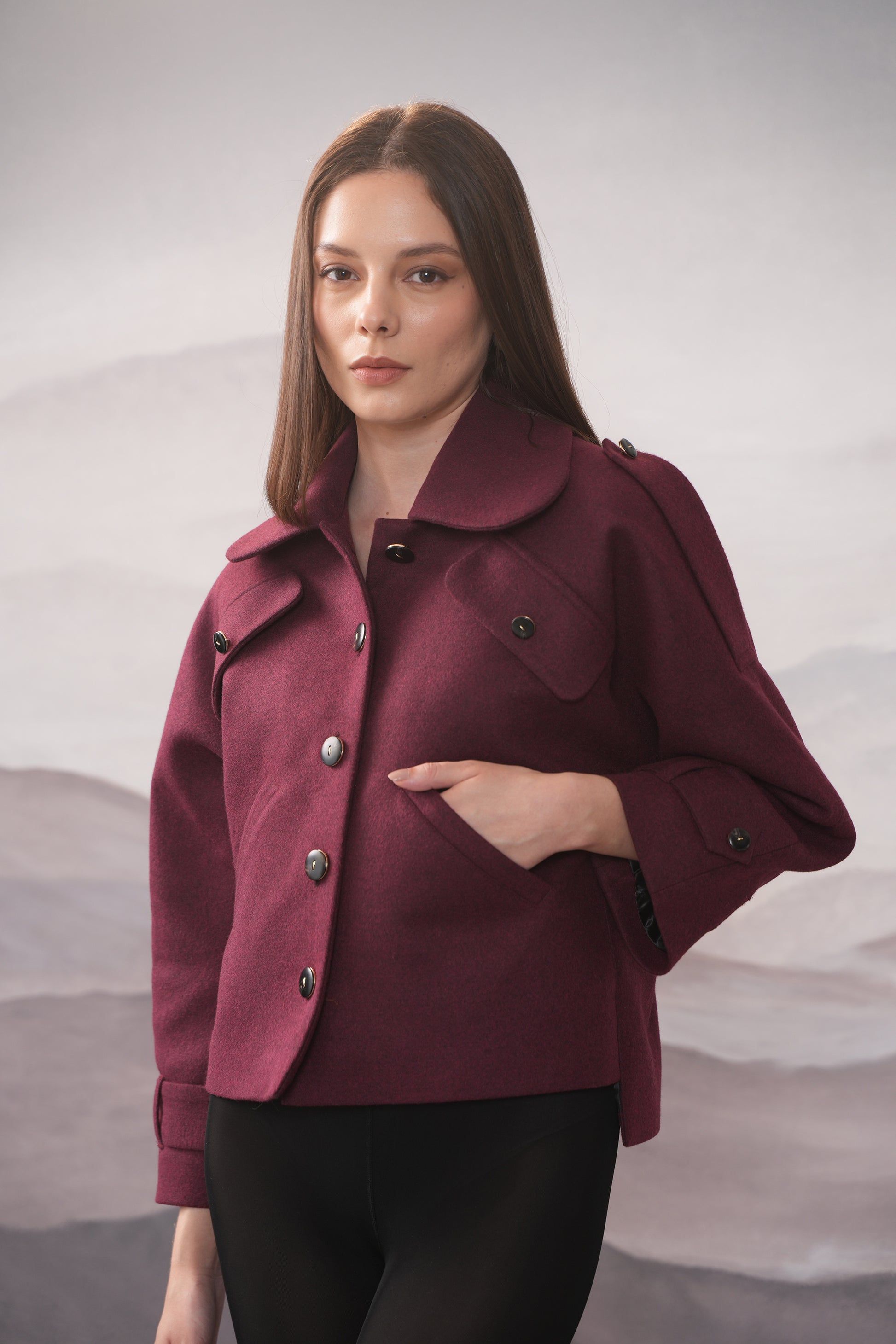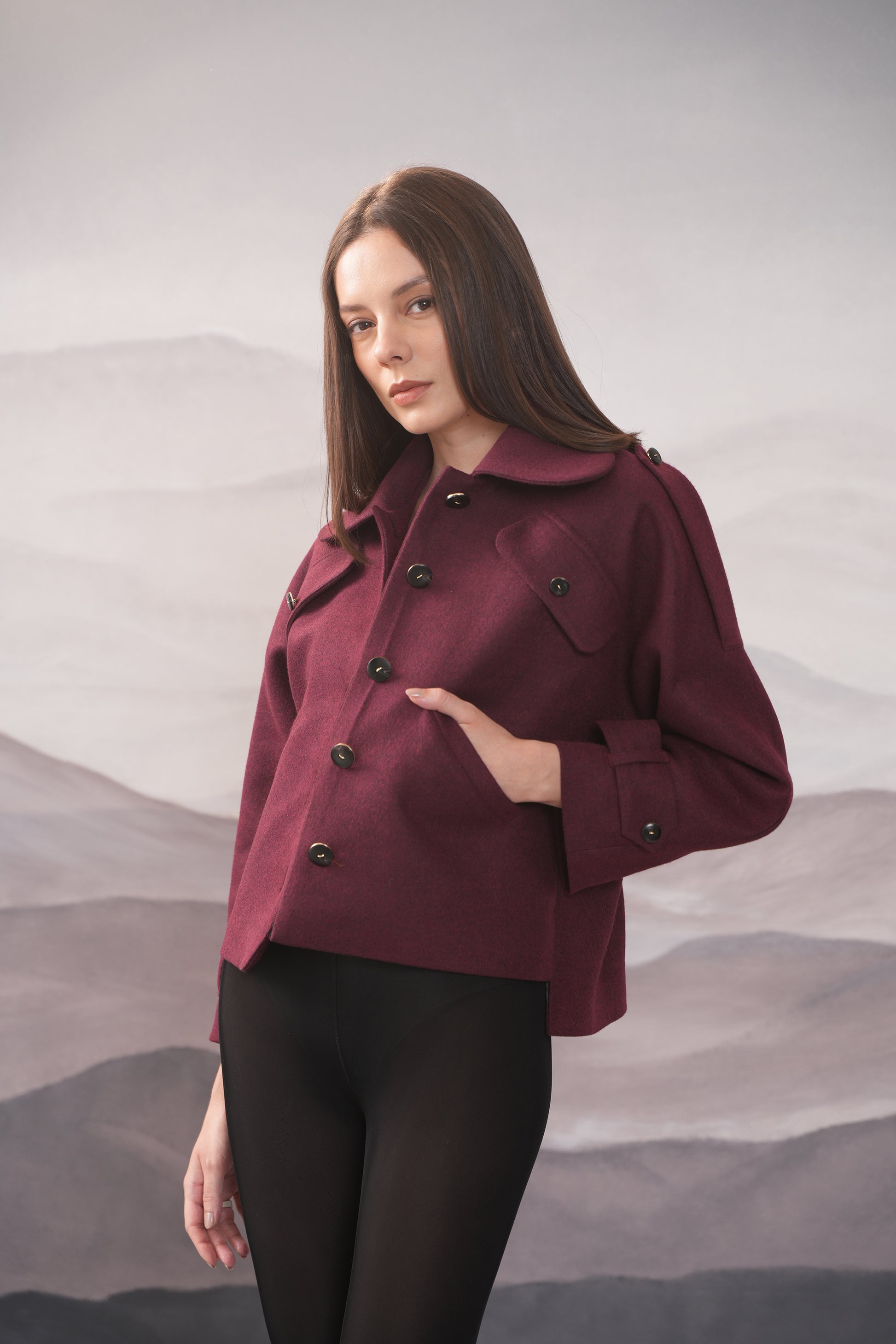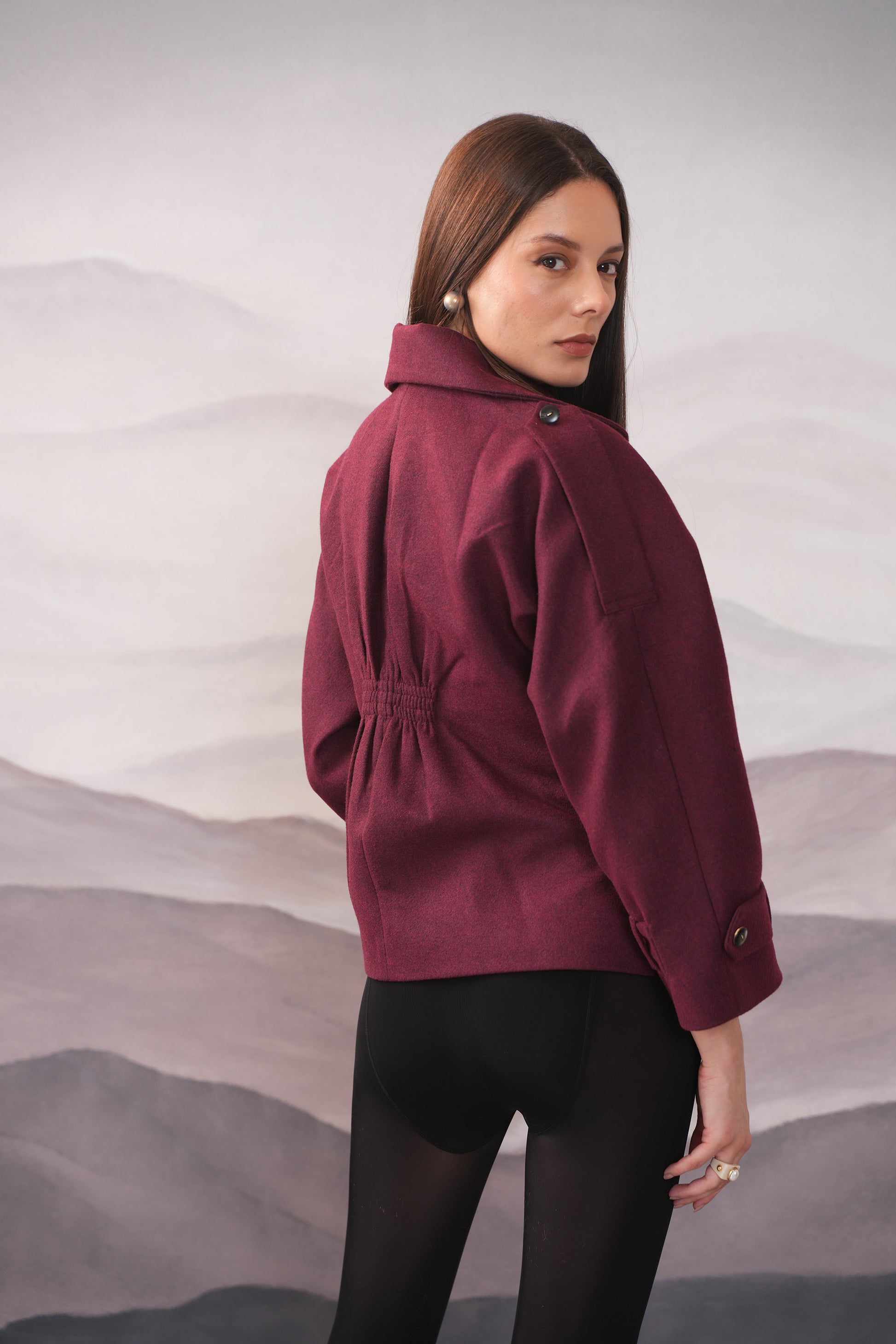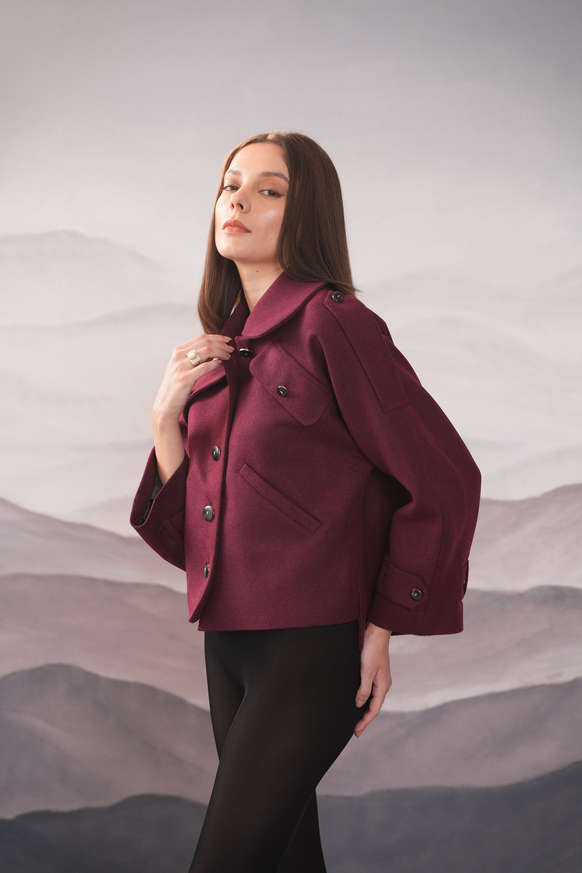 Get ready for cold weather with the Chloe Burgundy Wool Jacket. The rich maroon hue adds a touch of elegance while the high-quality wool fabric provides both warmth and durability. The cropped and boxy silhouette strikes a perfect balance between style and practicality. With multiple buttons and decorated flaps, this jacket offers a tailored fit for any occasion.