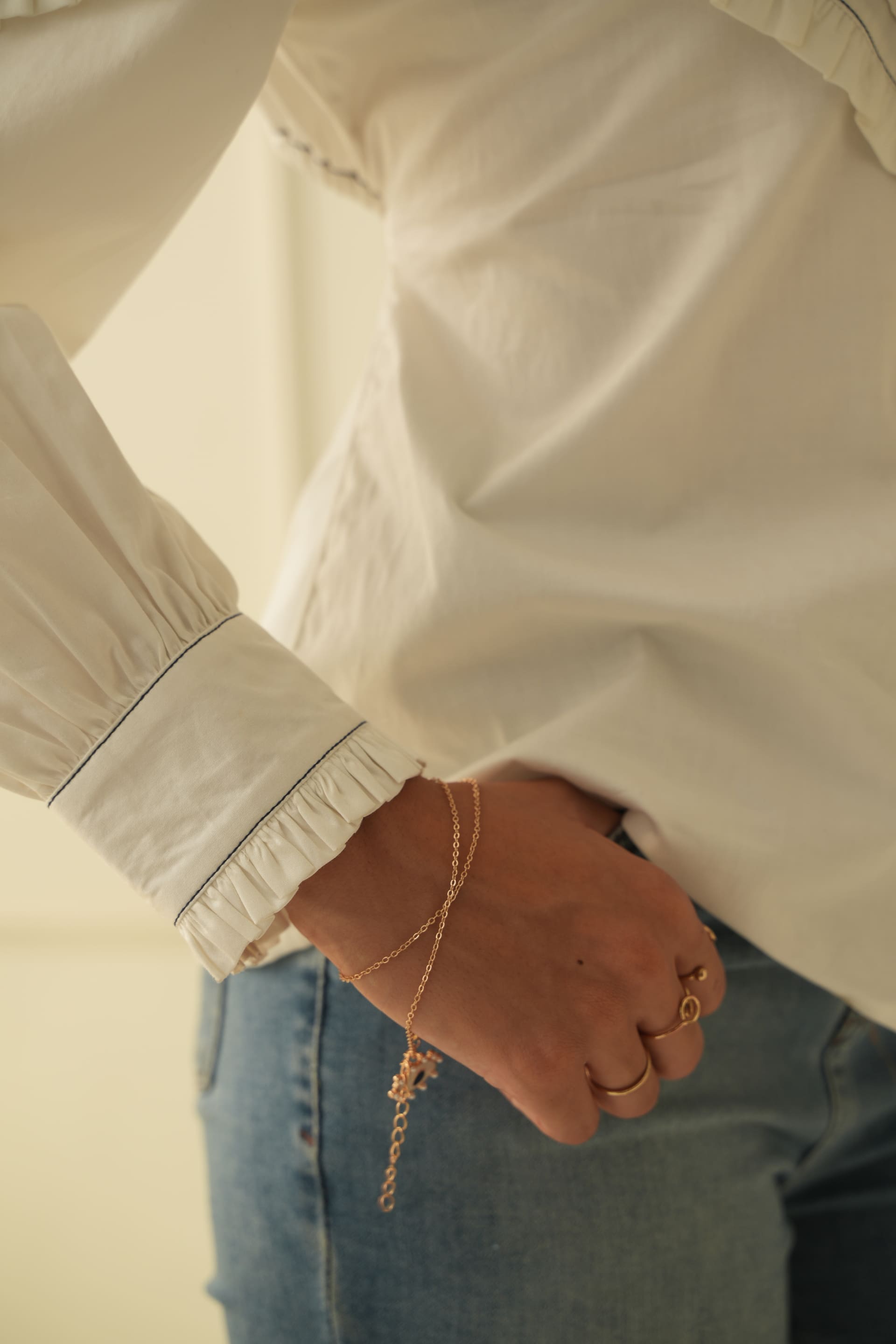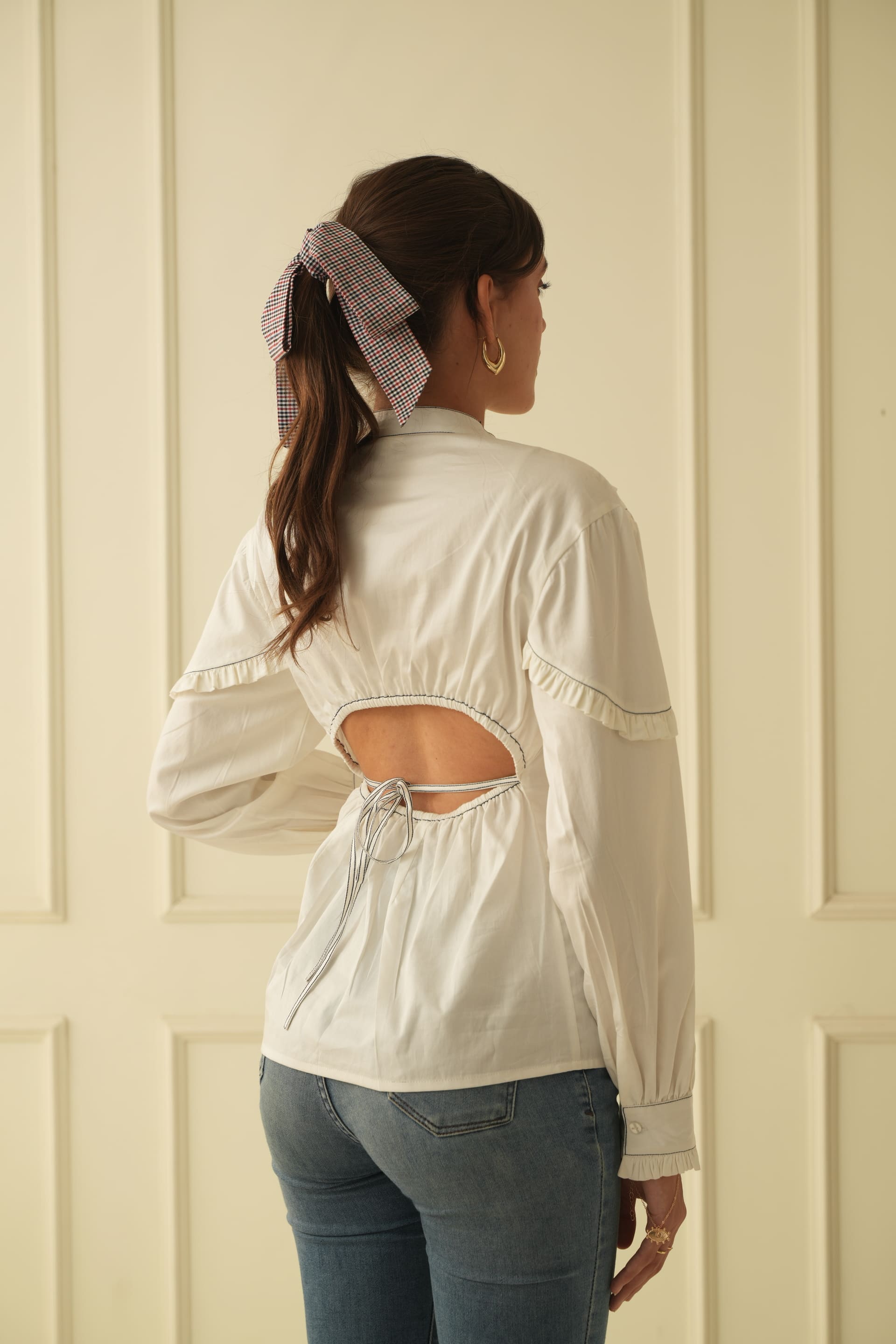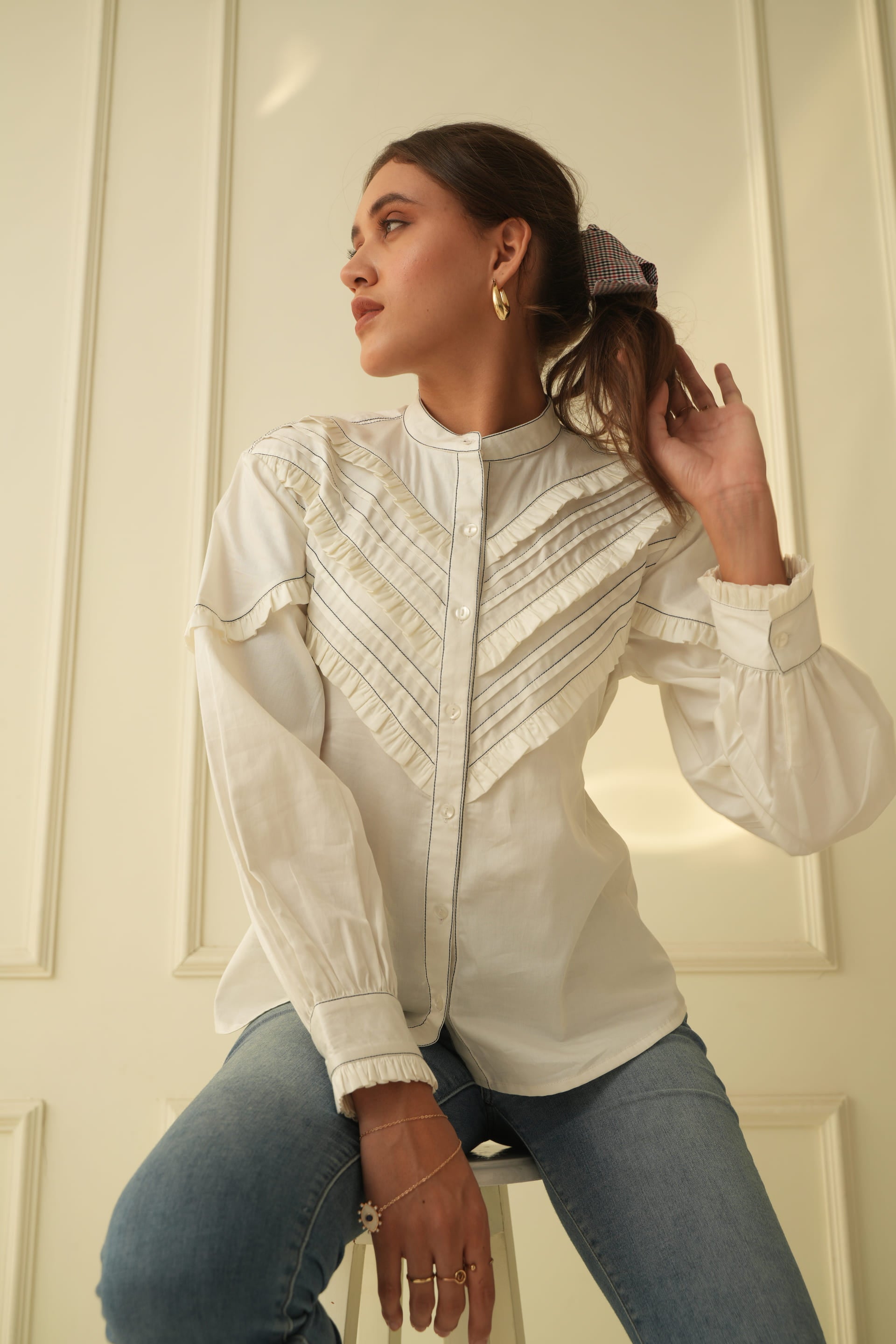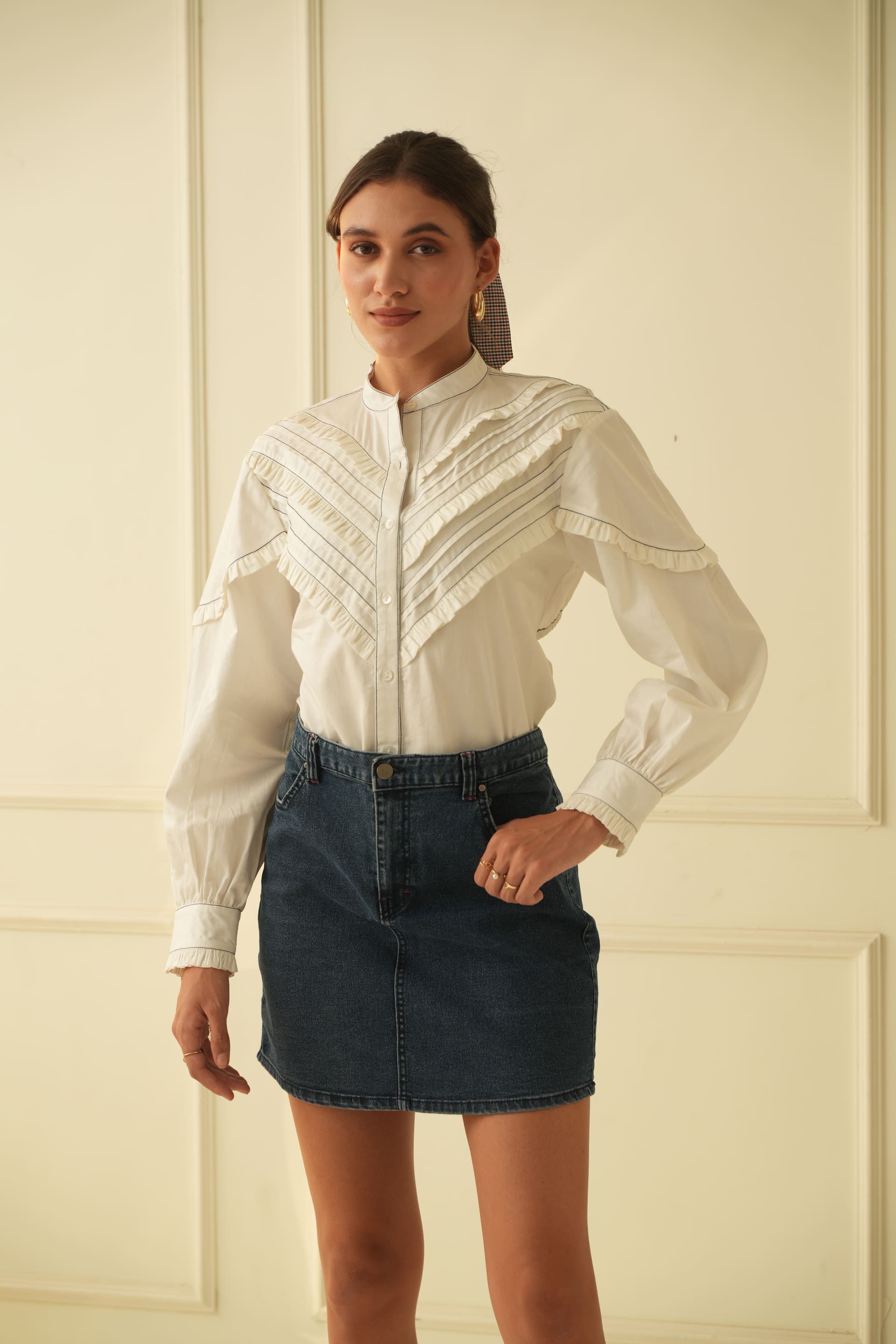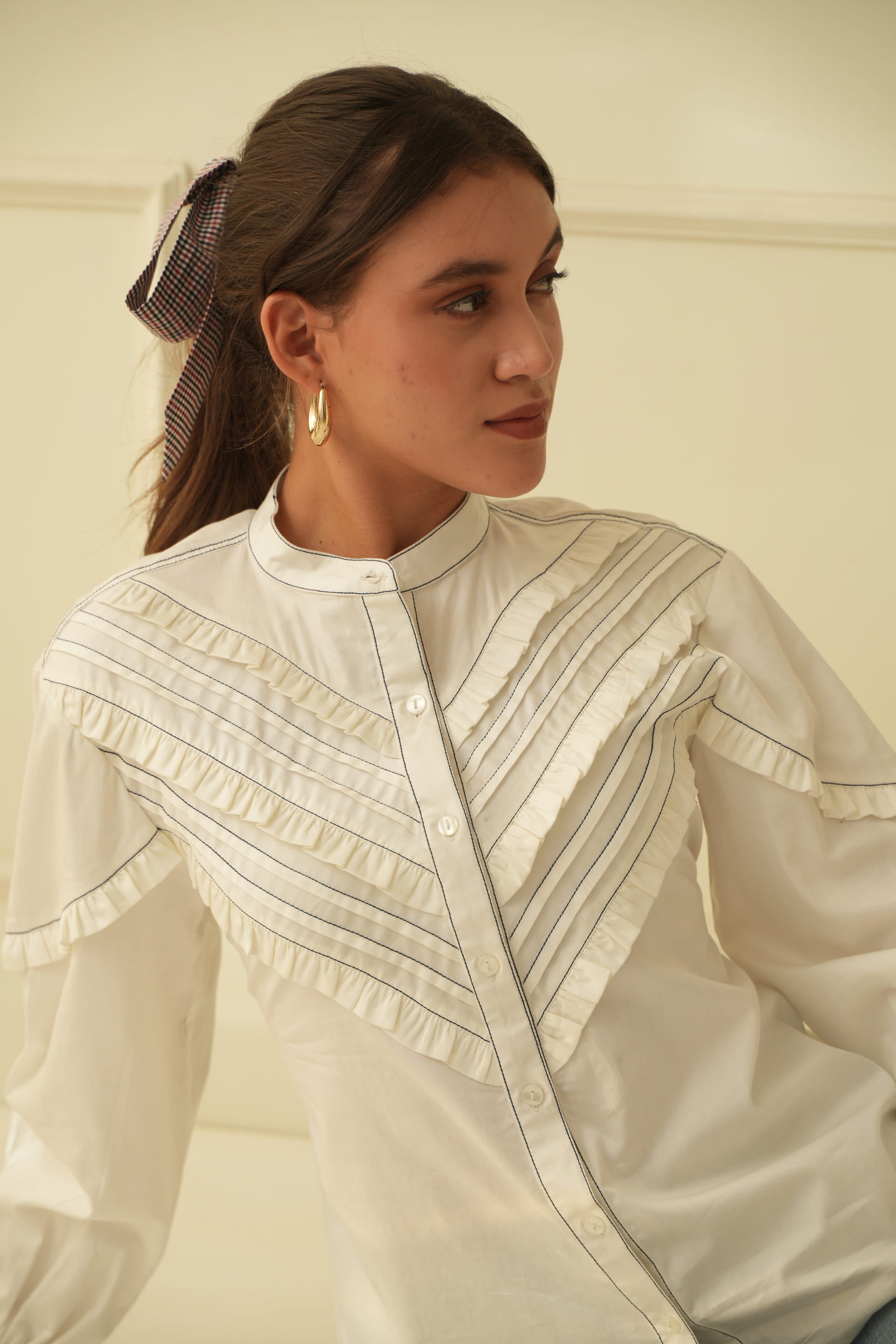 Say bye to boring shirts with apara's Ella White Shirt. Made from luxurious white cotton satin, this shirt features delicate front pin tucks and frills for a feminine yet strong look. Perfect for both travel and everyday wear, the contrast blue thread stitching and back cutout detail add a touch of elegance. Complete the fun and stylish look with denim bottoms or skirts. Even the sleeves and cuffs have frill details for added charm.