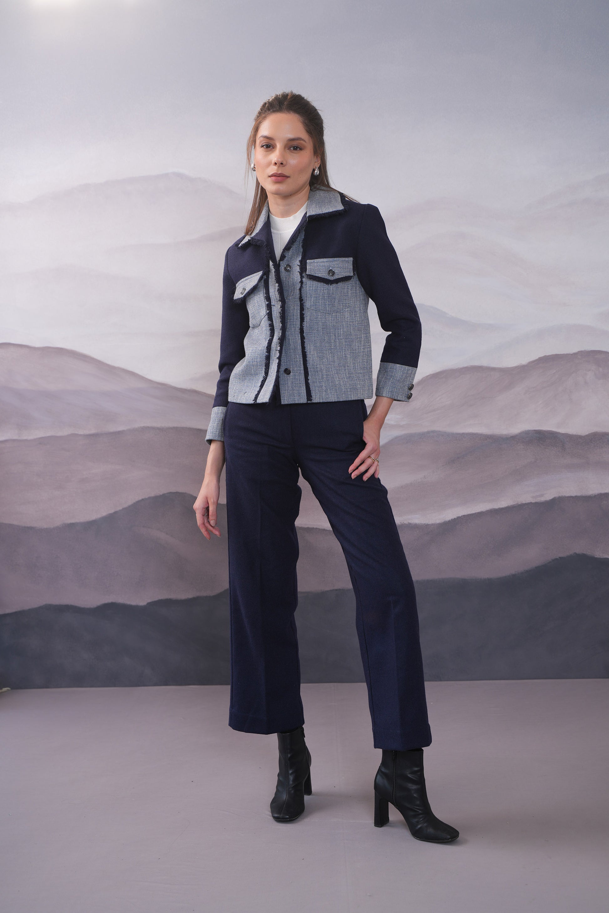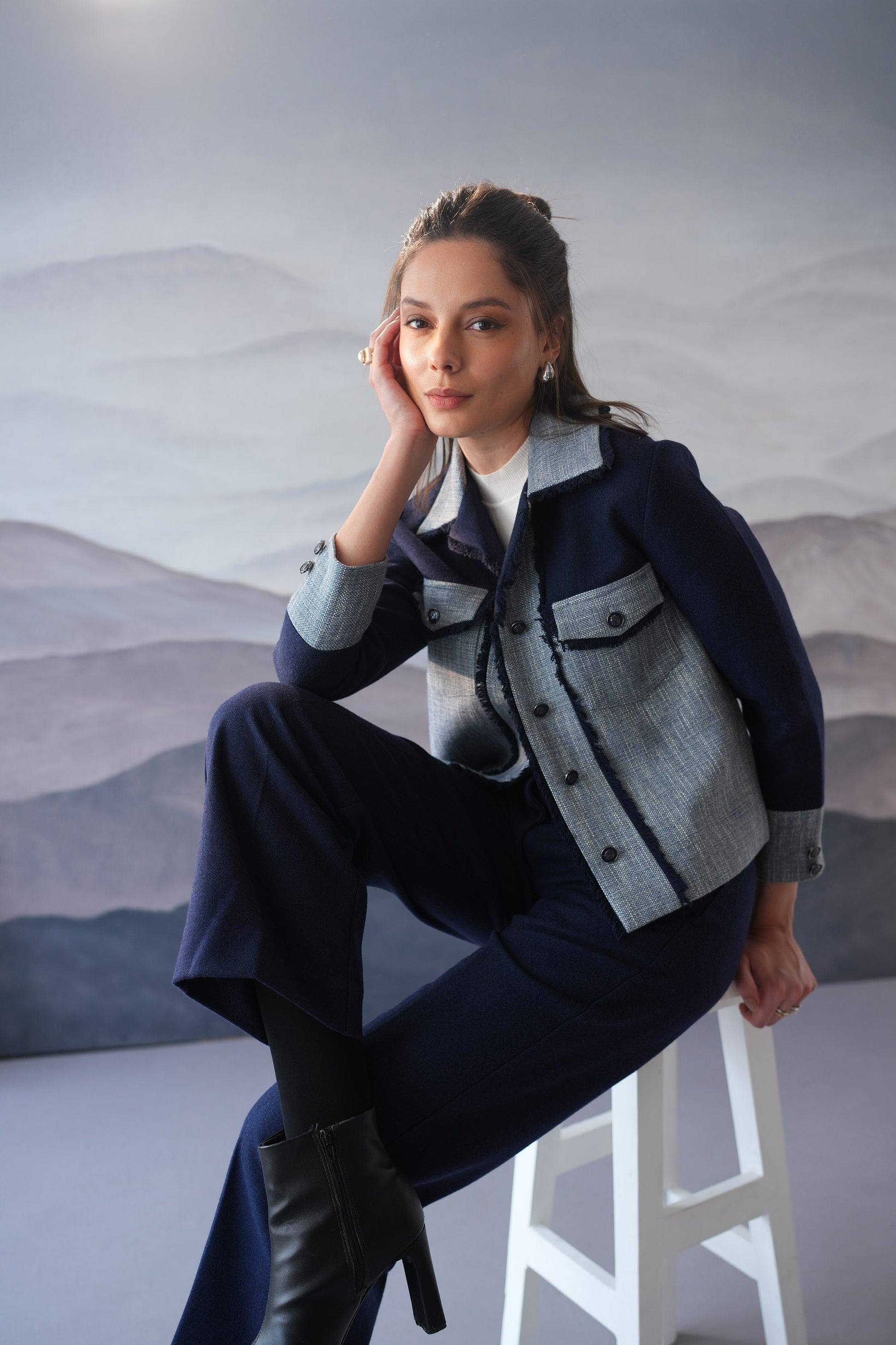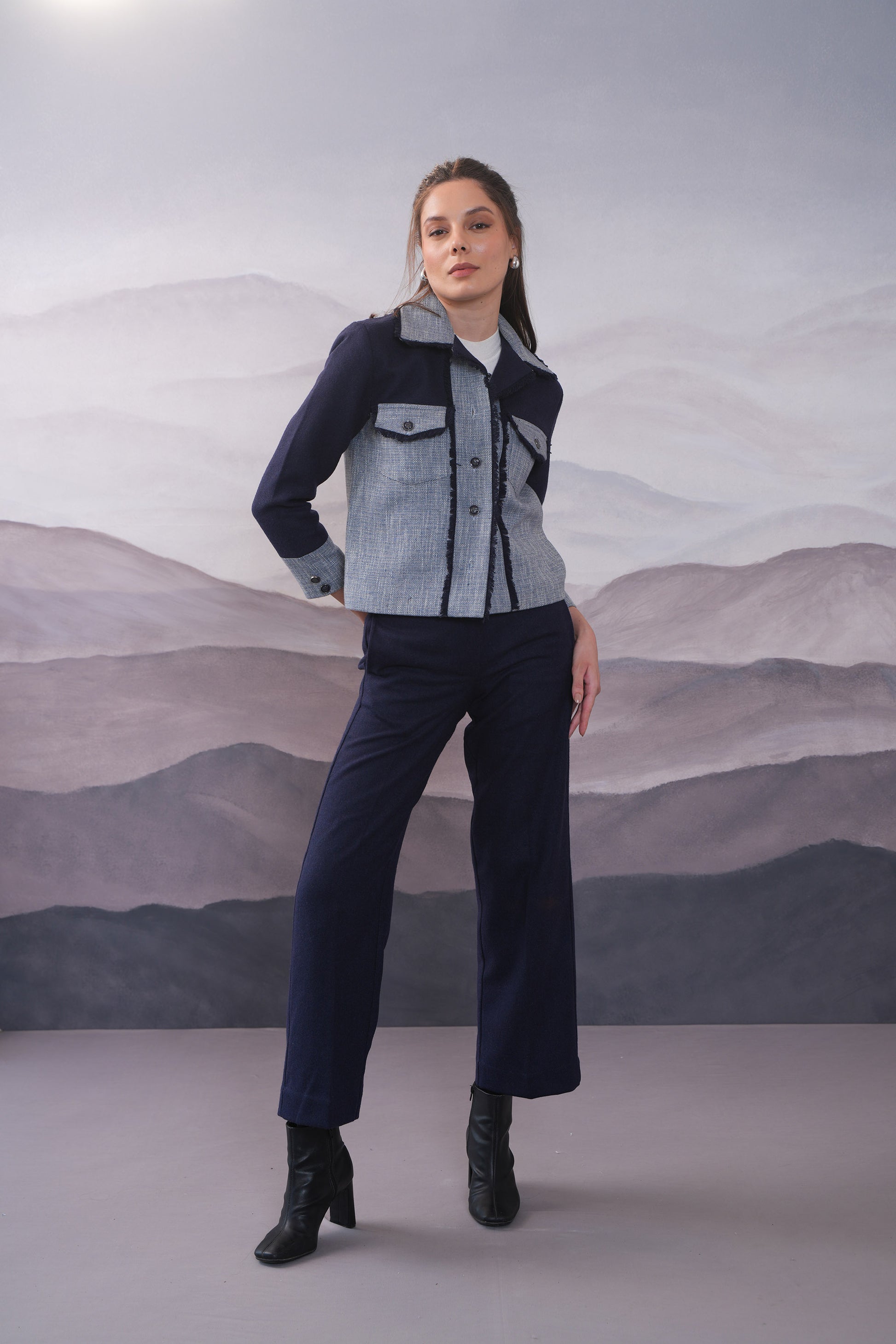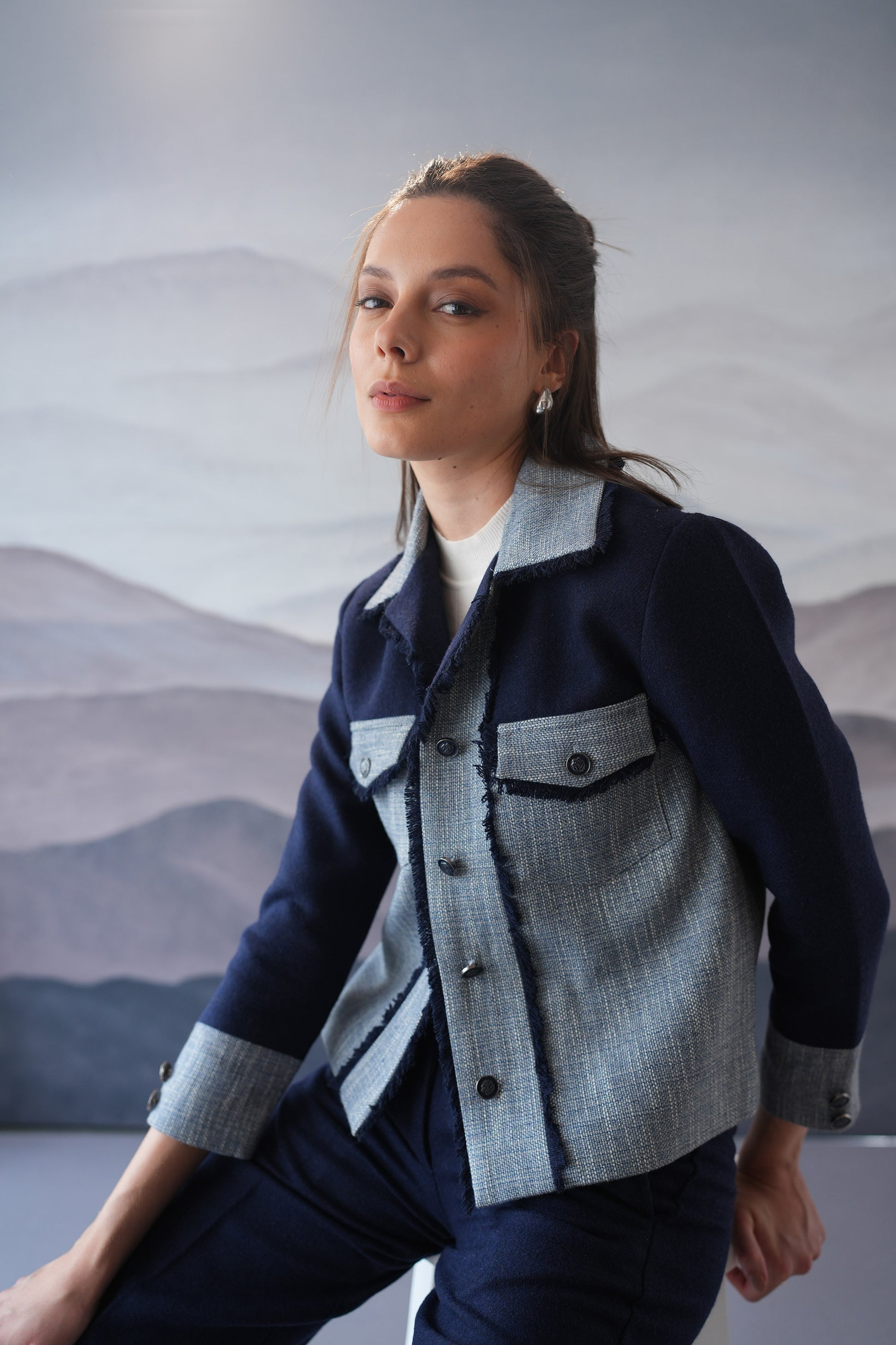 Expertly crafted with a light blue texture fabric and dark solid blue contrast detailing, the Elle Blue 2 Tone Jacket is the perfect combination of style and comfort. The boxy fit and fray detailing add a unique touch, while the beautiful buttons, cuff sleeves, and collar make it a versatile addition to any wardrobe. The set comes with dark blue half lined woollen trouser.