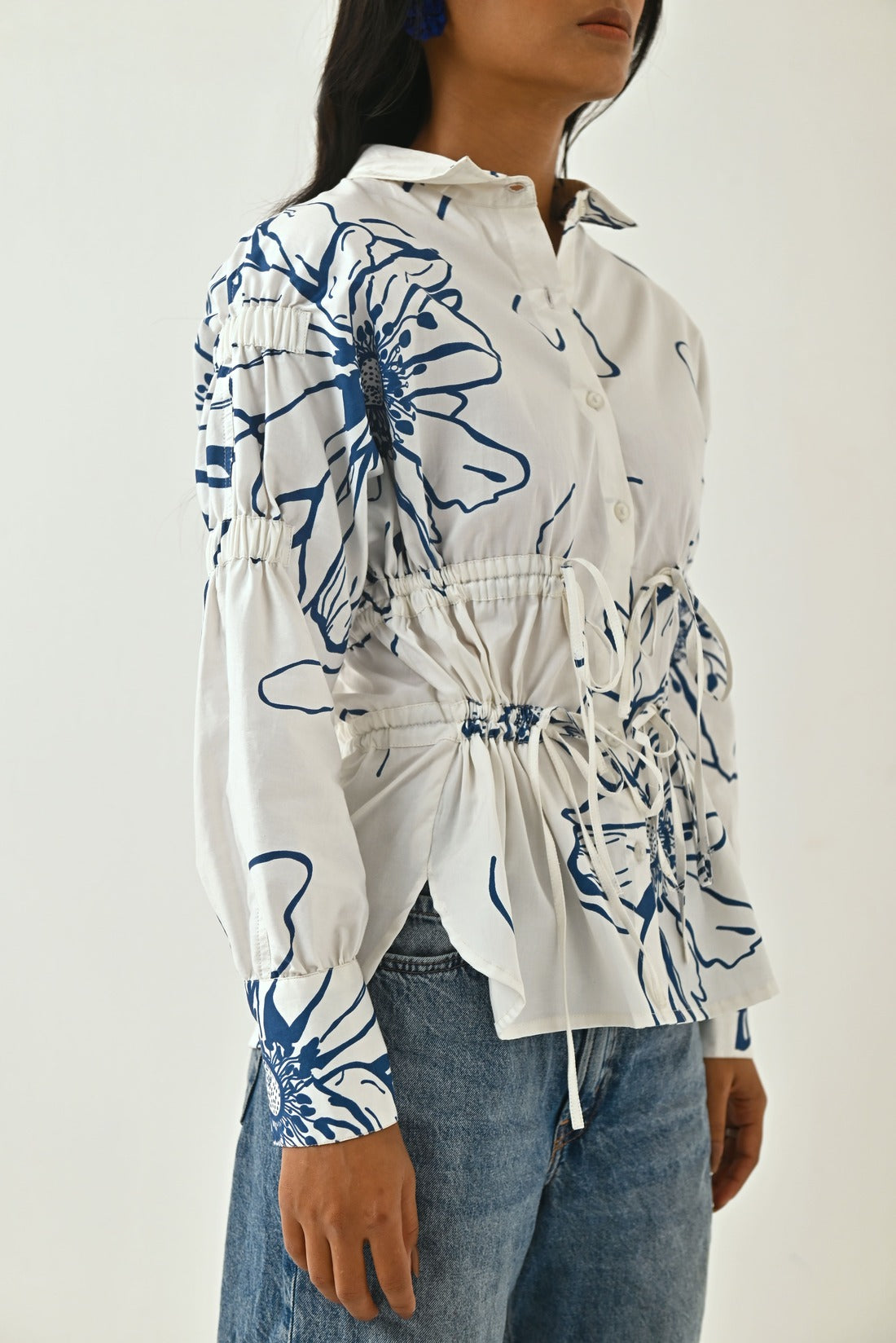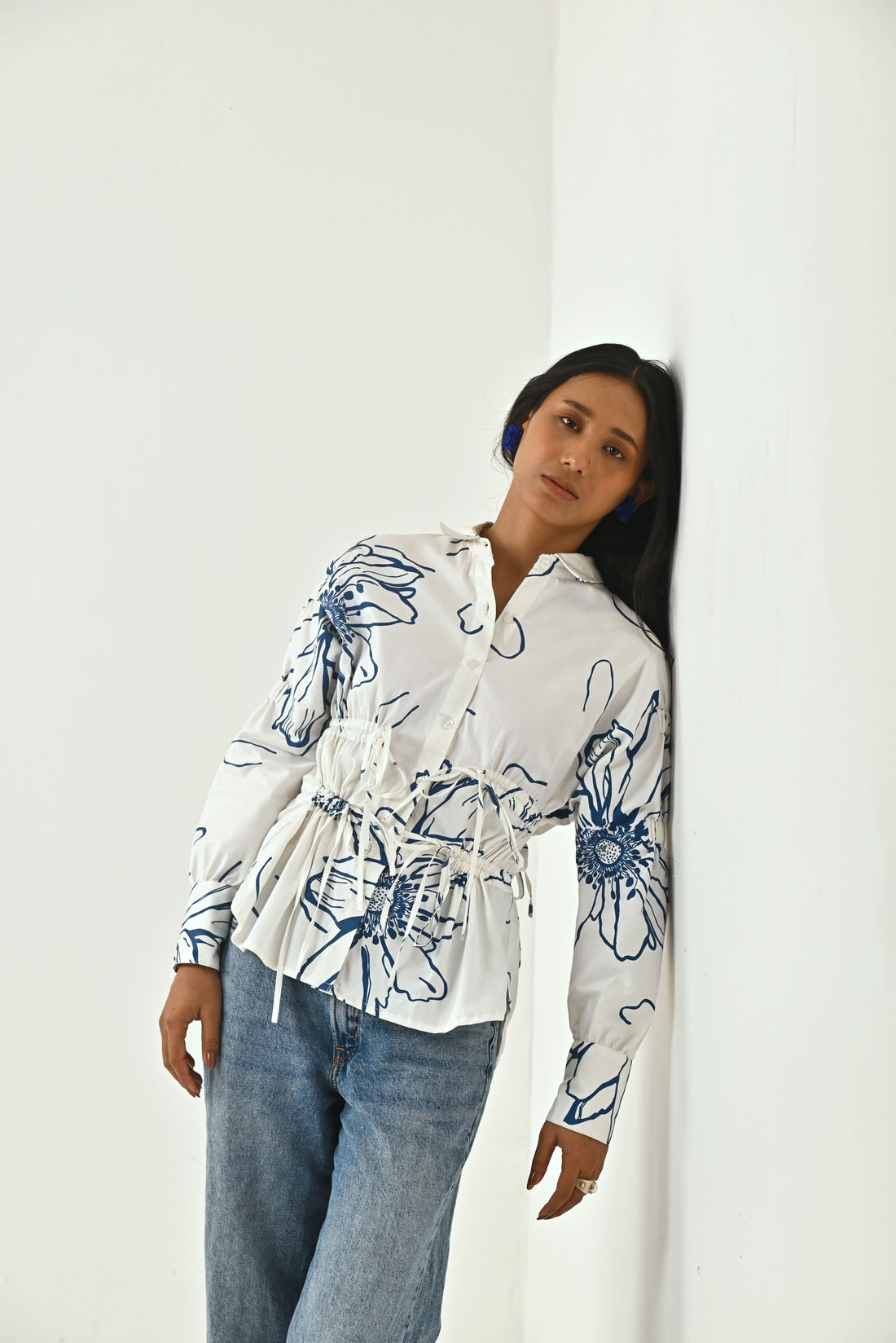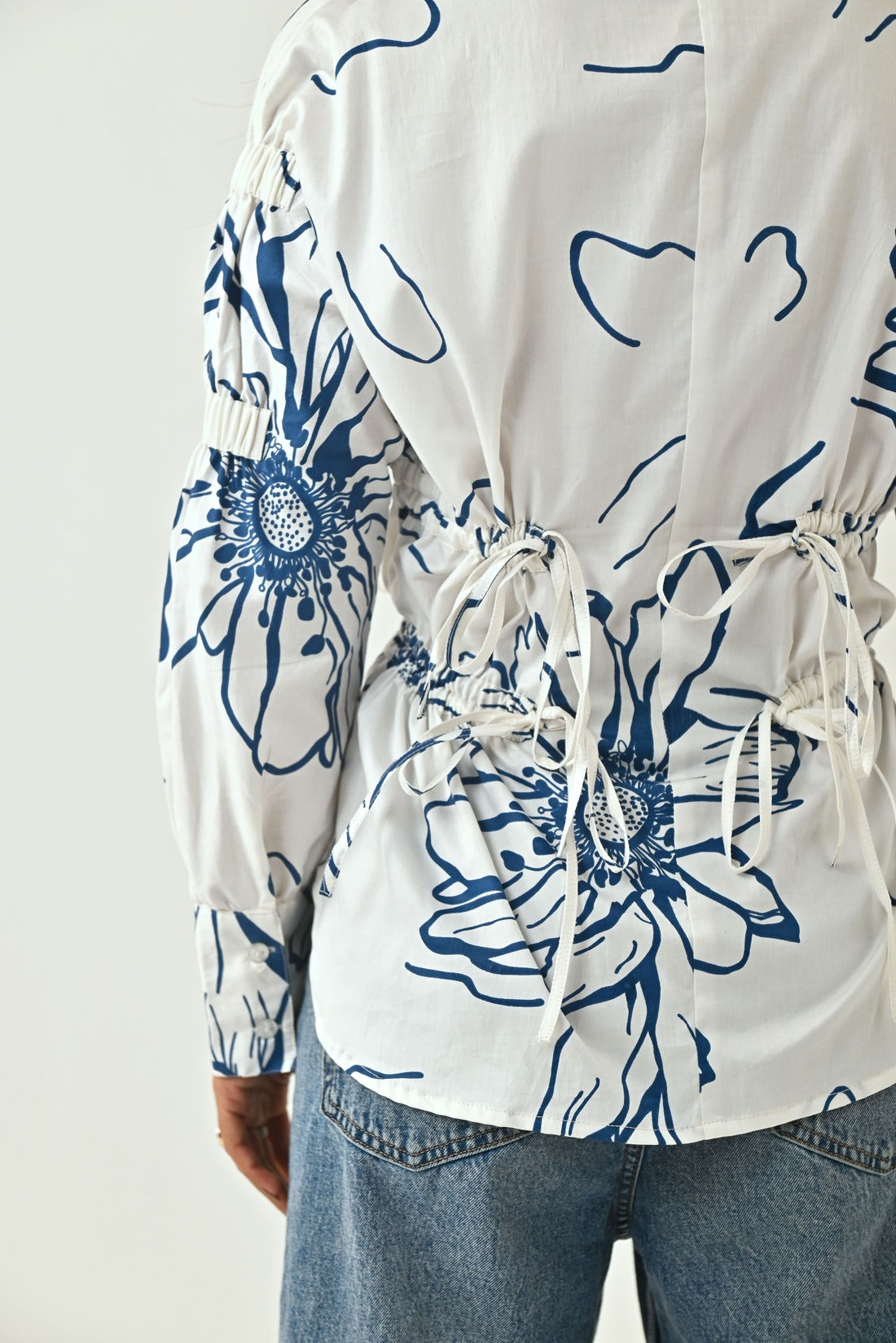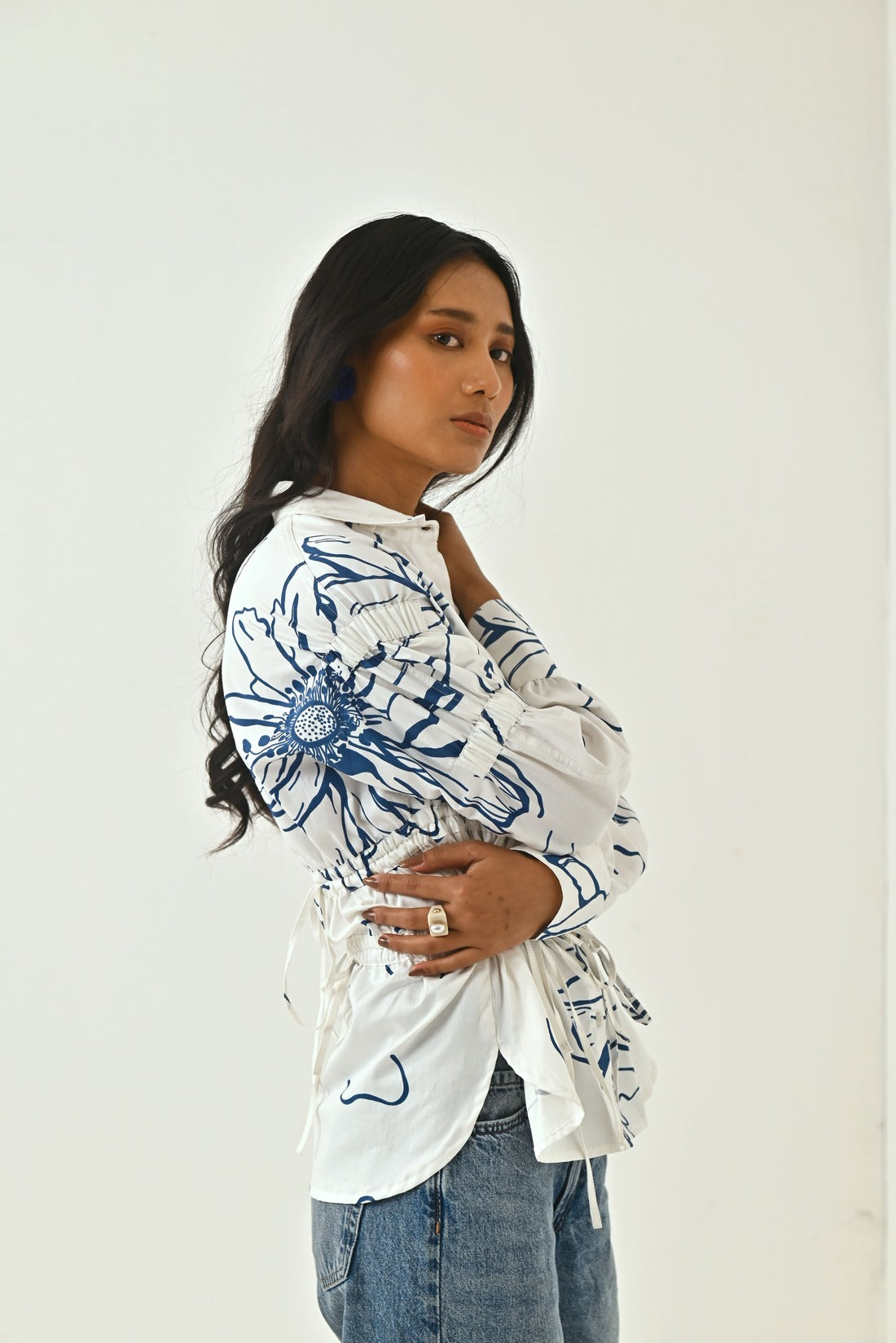 Flora, the name of the Roman goddess of flowers and spring, who enjoyed eternal youth, same as our flora shirt. Hand printed in blue colour on luxurious cotton satin fabric. Has draw strings on the waist to scrunch it the way you want it. Flora shirt is definitely the best to pair up with your favourite pair of denims.