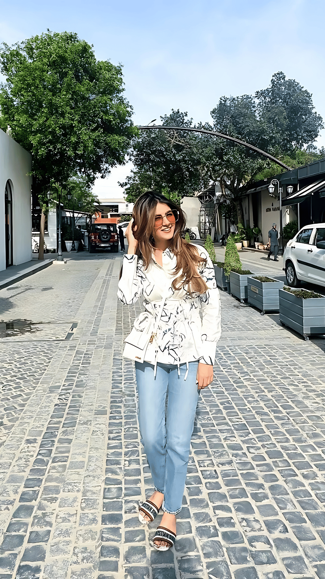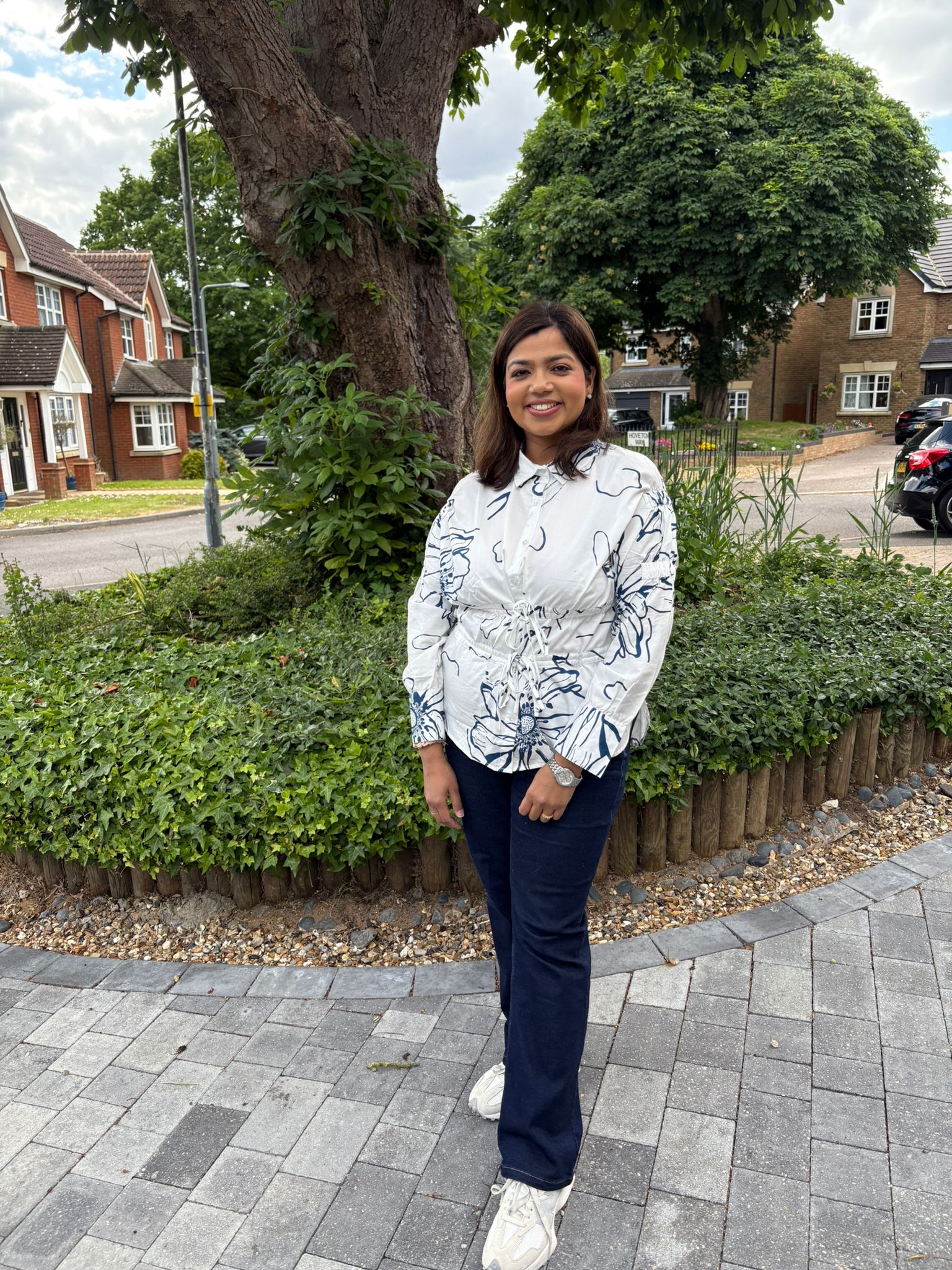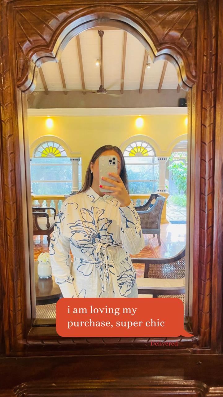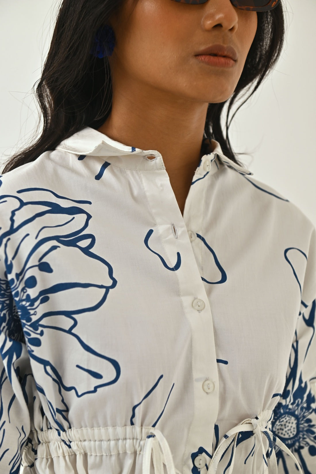 Flora, the name of the Roman goddess of flowers and spring, who enjoyed eternal youth, same as our flora shirt. Hand printed in blue colour on luxurious cotton satin fabric. Has draw strings on the waist to scrunch it the way you want it. Flora shirt is definitely the best to pair up with your favourite pair of denims.