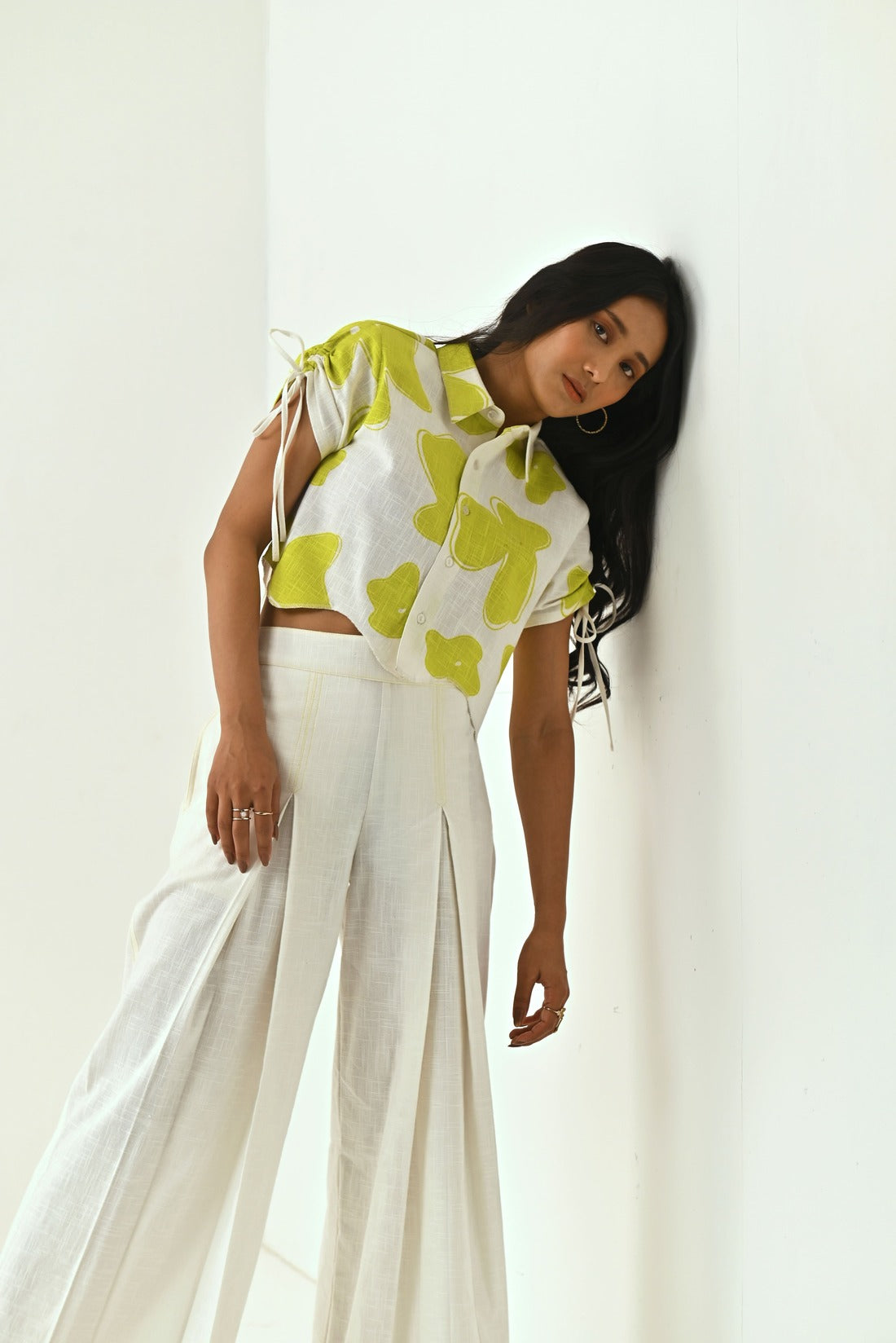 This Freesia Crop Shirt is perfect for a summer look. Crafted with cotton khadi, the top features a playful, fresh green print and a wavy hem. The sleeves have drawstrings to adjust the styling, creating an effortless and stylish look.