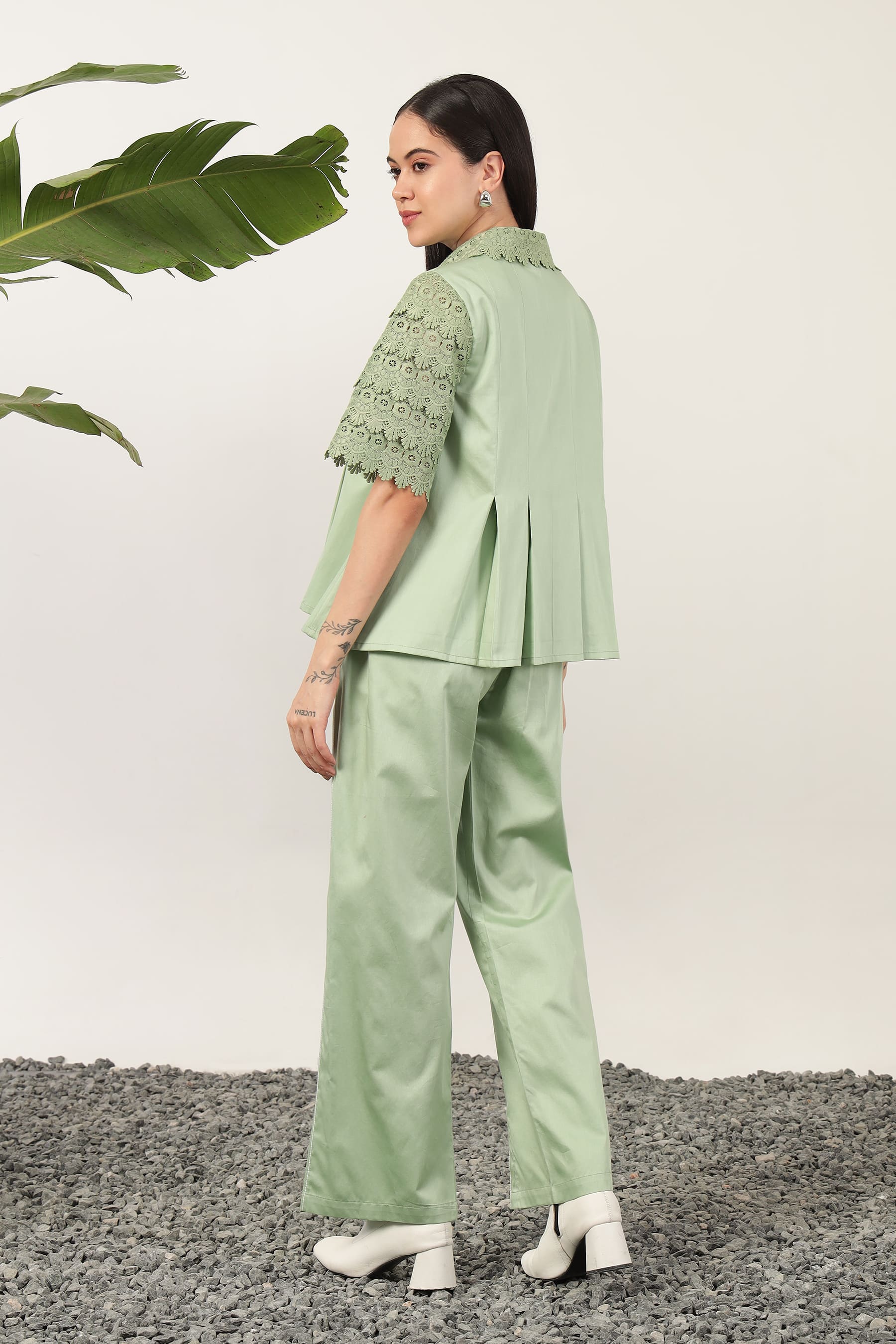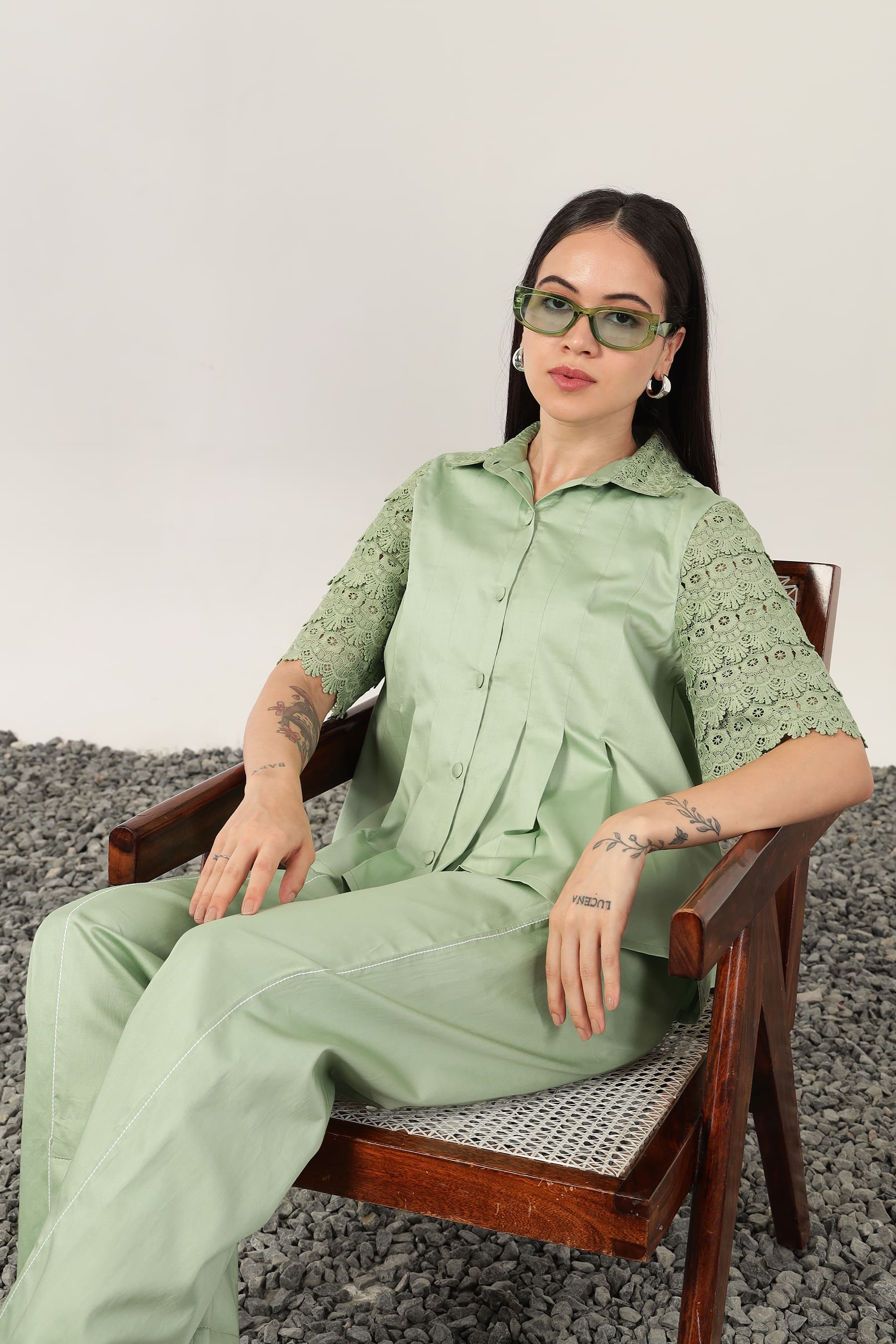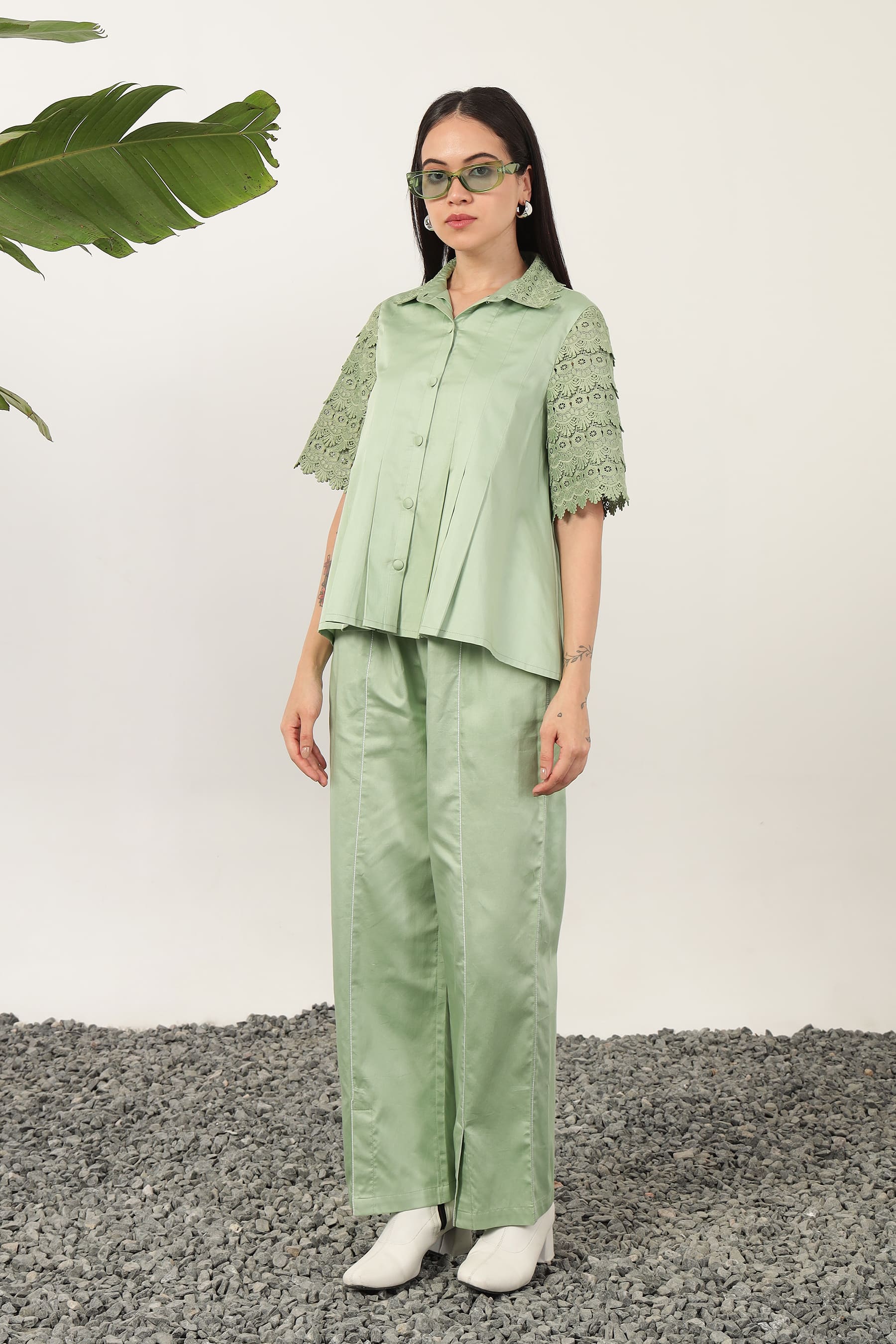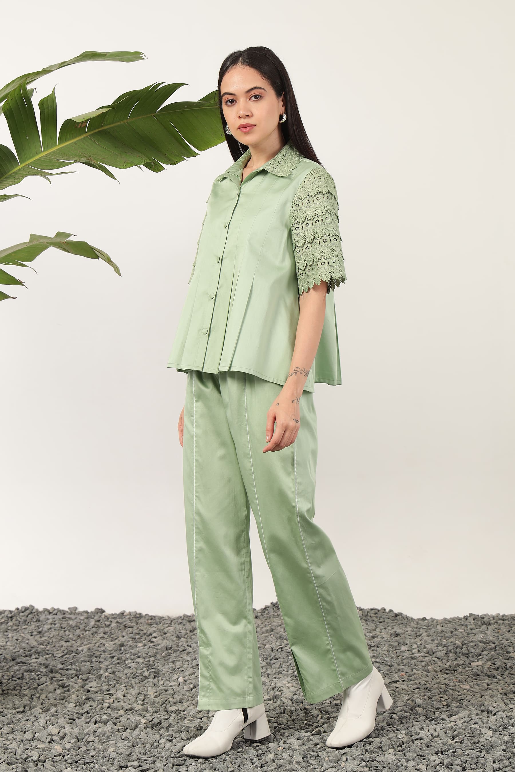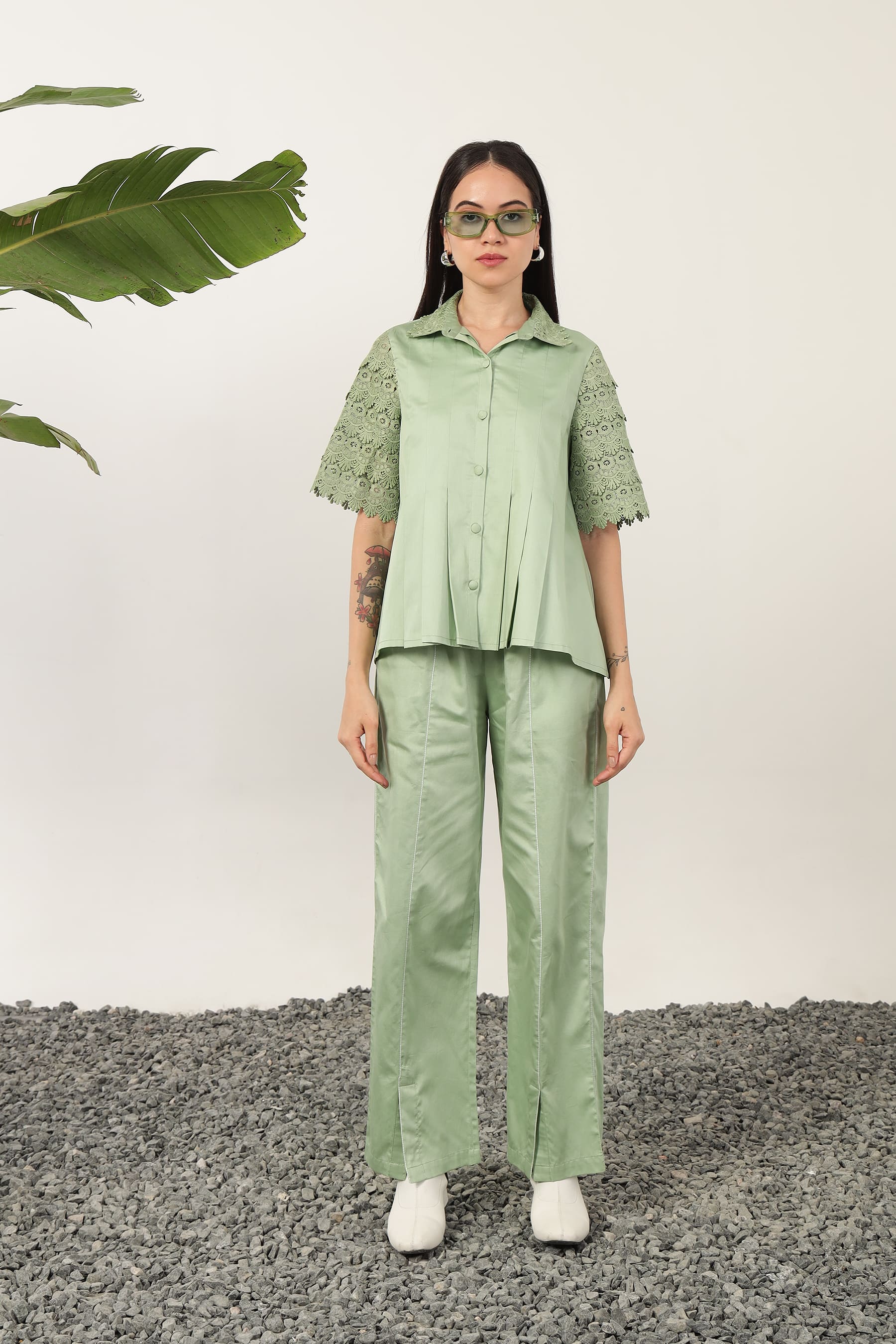 The Fresca Pleat Shirt in serene sage green is a statement in understated elegance. Featuring meticulously crafted pleats on both the front and back, and finished with delicate lace-trimmed sleeves, this shirt exudes refined sophistication. Crafted from soft, breathable fabric, it’s a perfect choice for elevated daywear—whether you're headed to brunch or a polished daytime engagement.