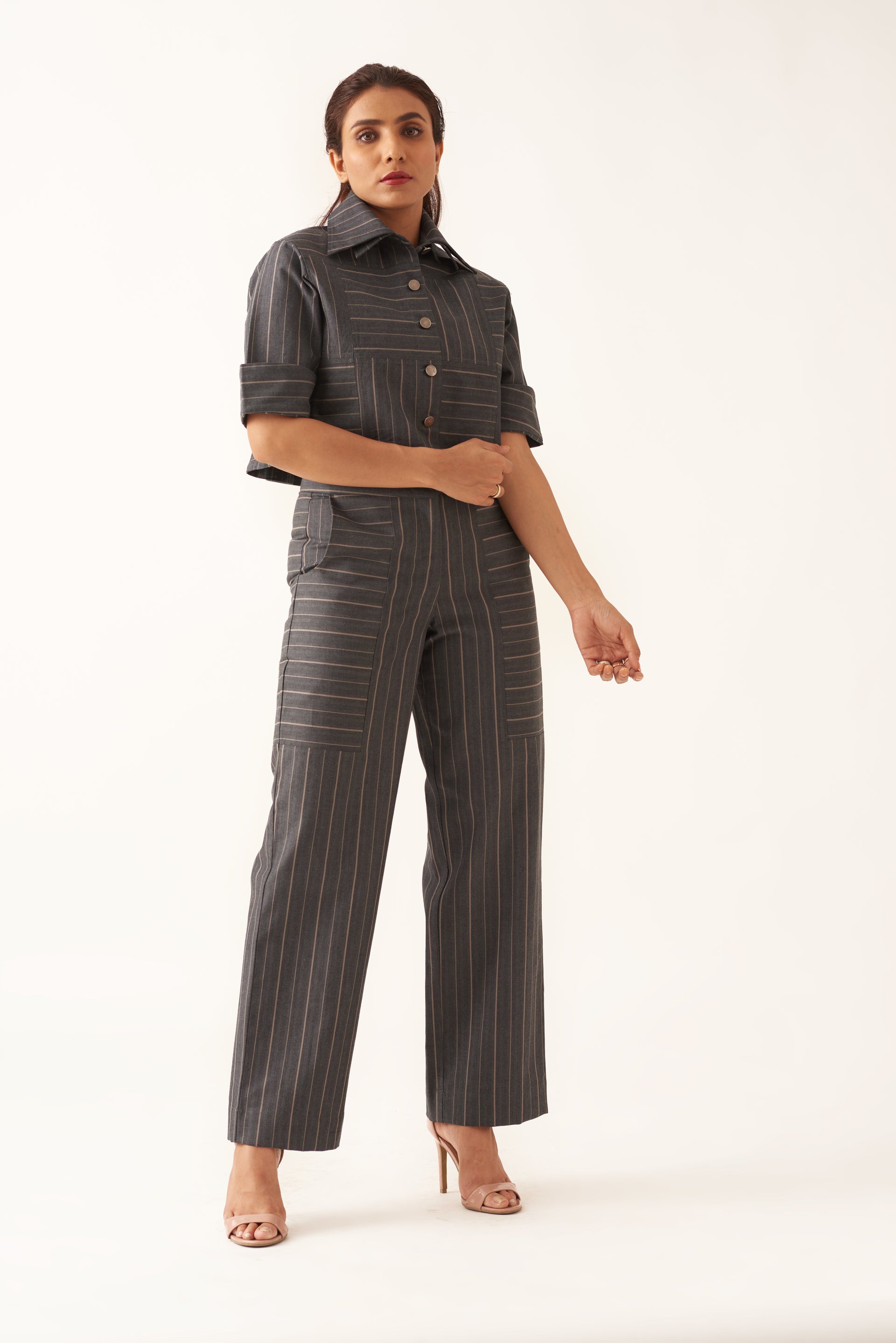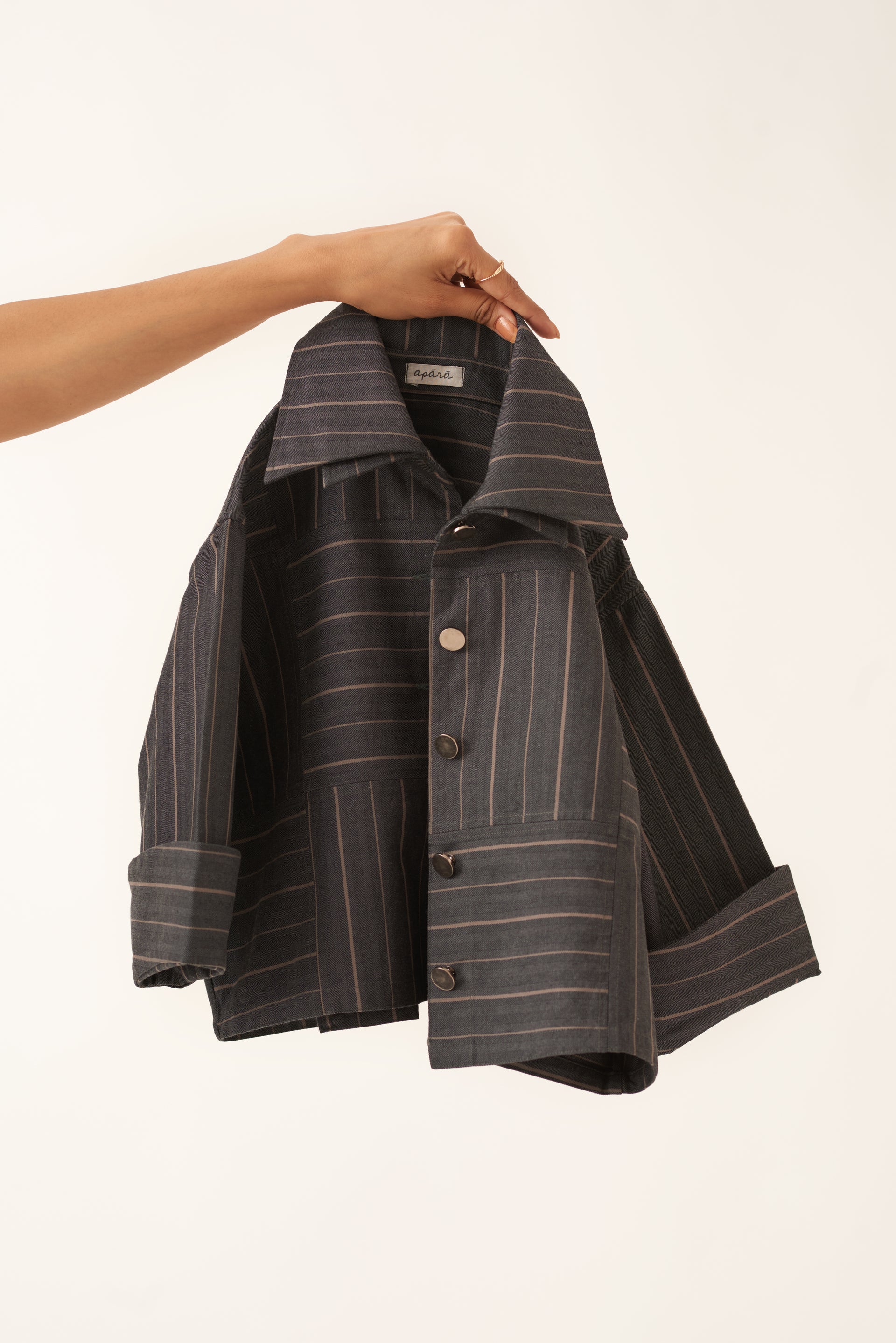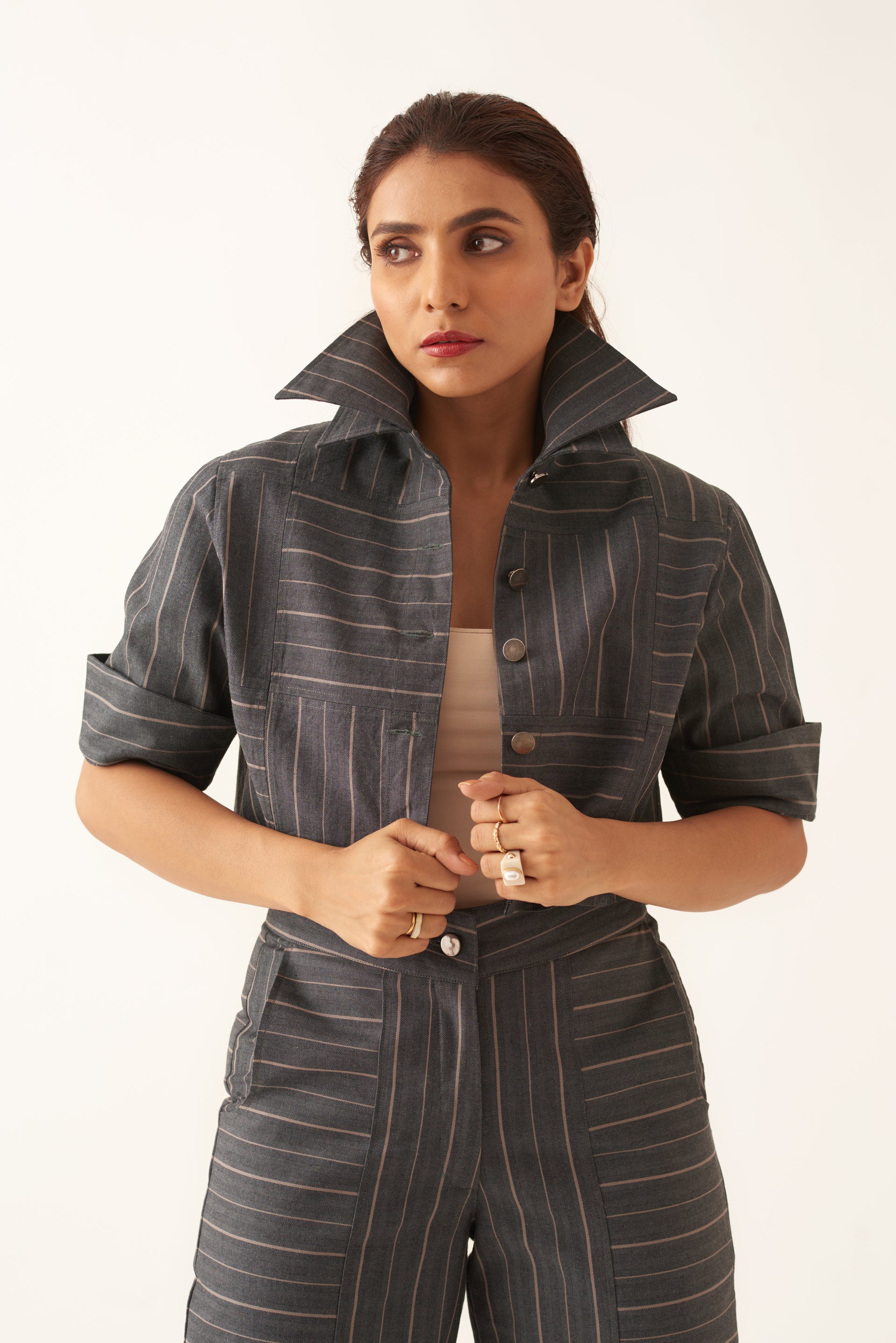 Zero-waste is a design technique that eliminates textile waste at the design stage. Leftover katrans from cutting were used as panels in the jacket, joined vertically and horizontally giving it a playful yet formal feel.