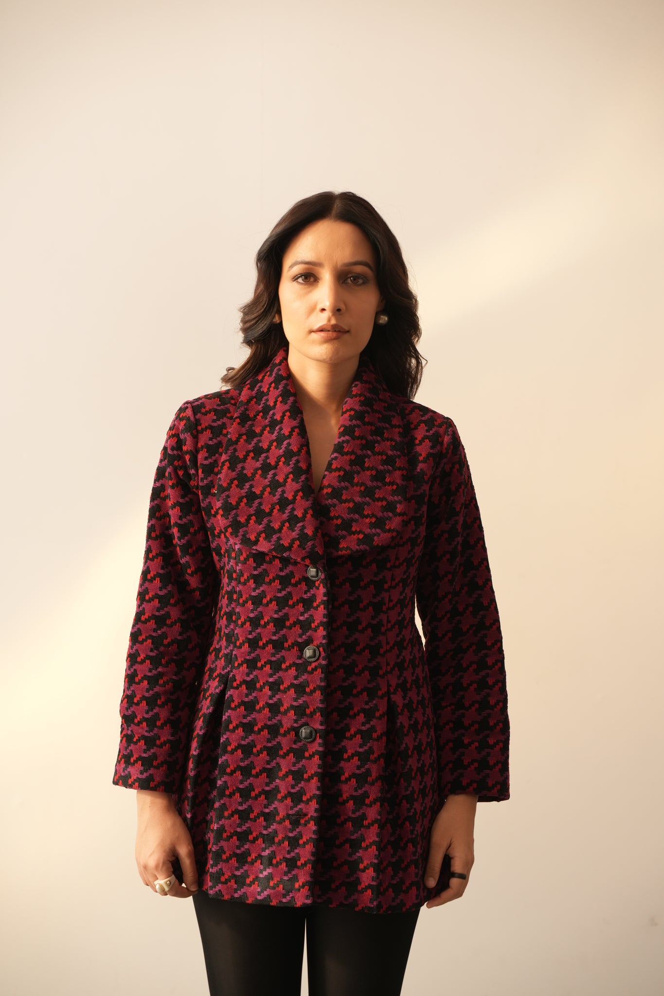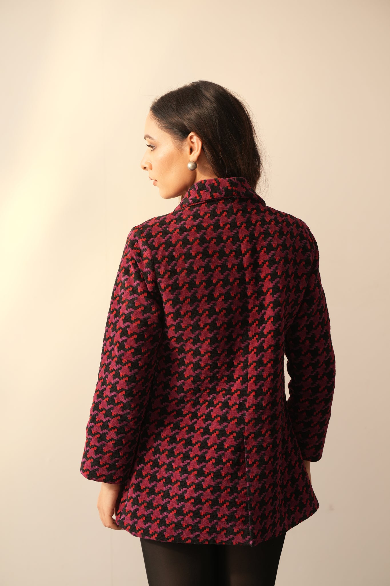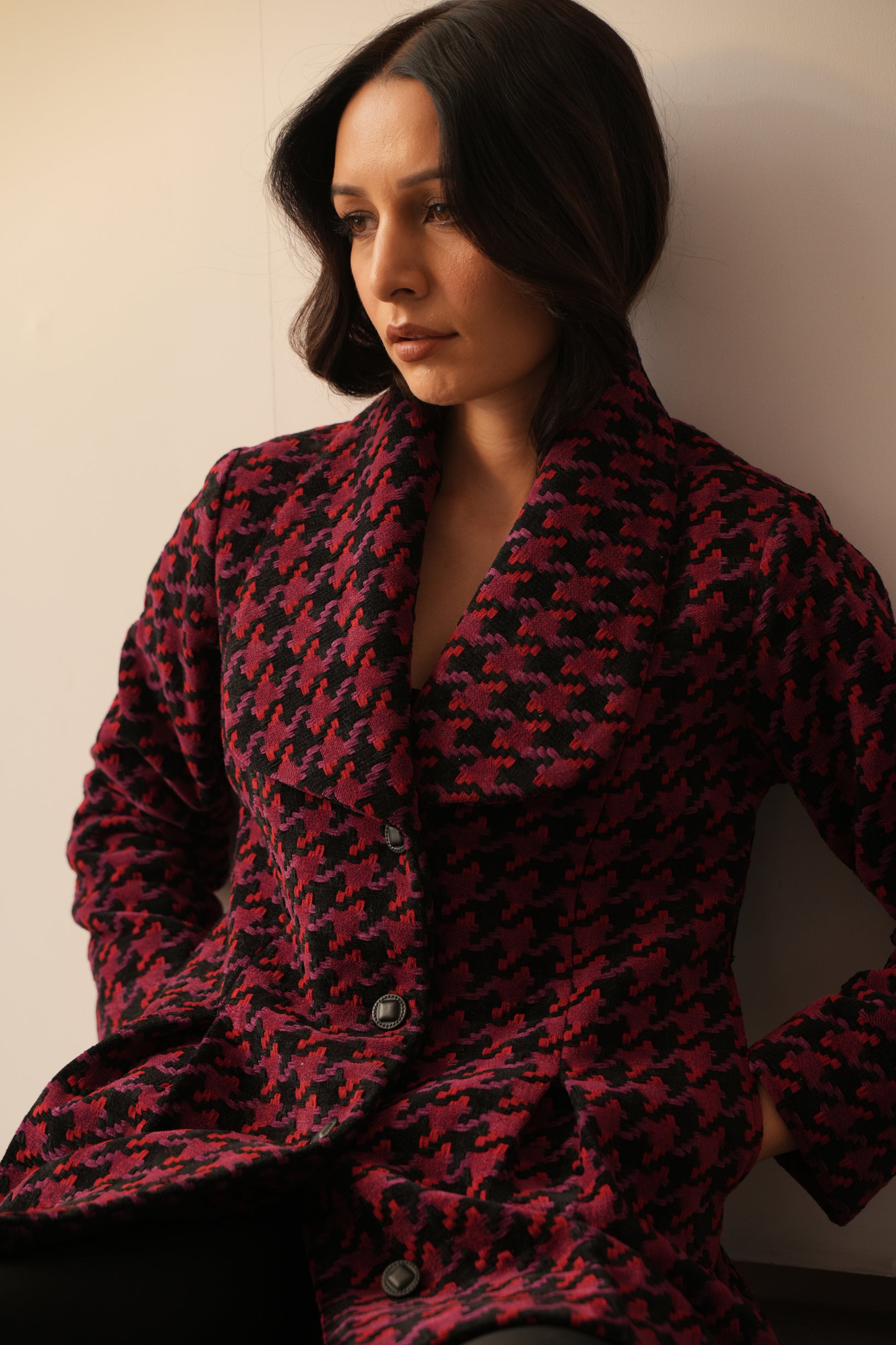 The Hannah Jacket is designed to be feminine and strong. Perfect for everyday to occasion wear, this chic and stunning jacket is made from warm wool fabric with an alluring houndstooth weaving pattern and red, black, and pink thread accents. Detailed with front box pleats and a practical pocket add to its versatility. Style it up with your beautiful sarees to turn heads.