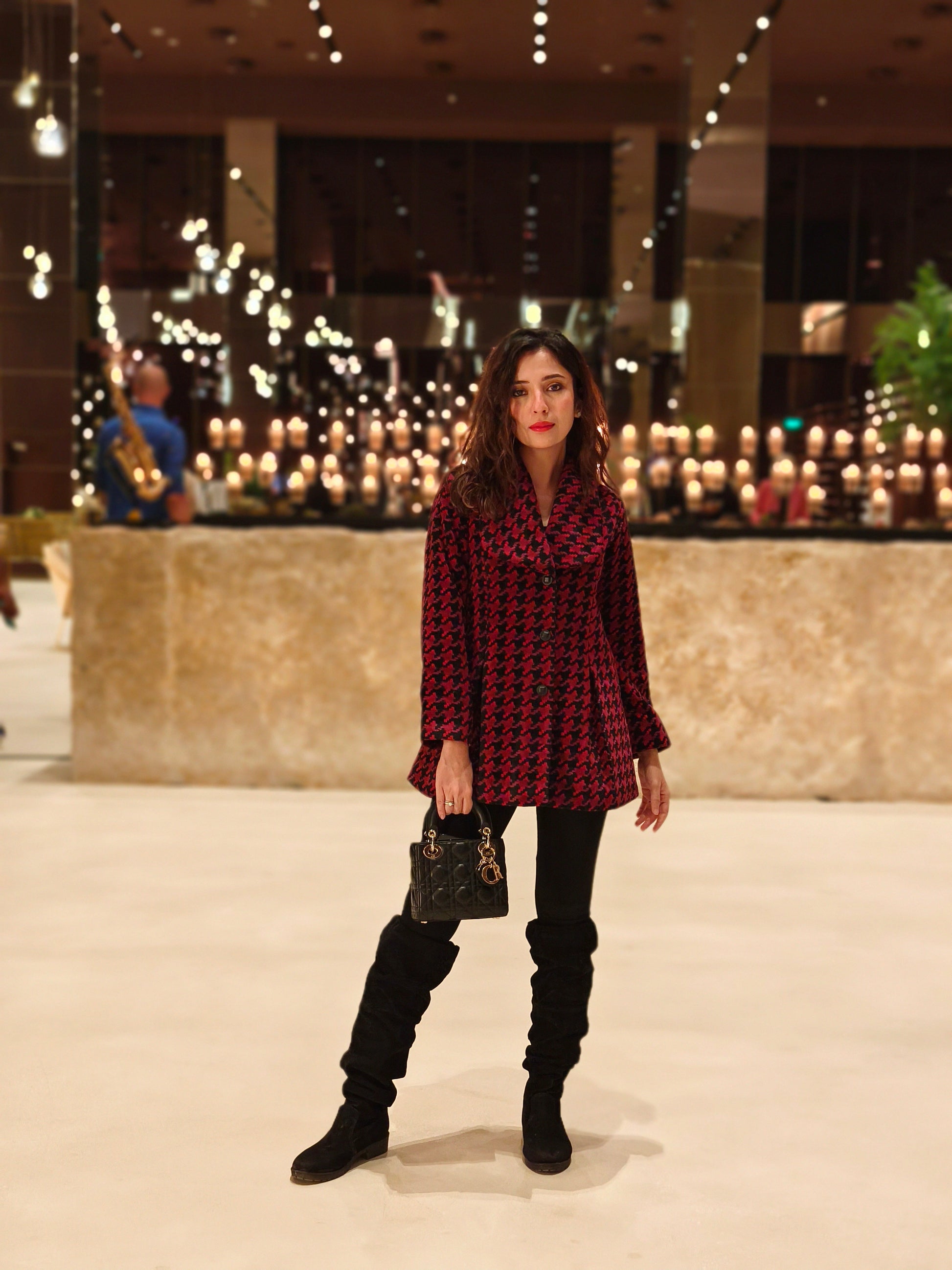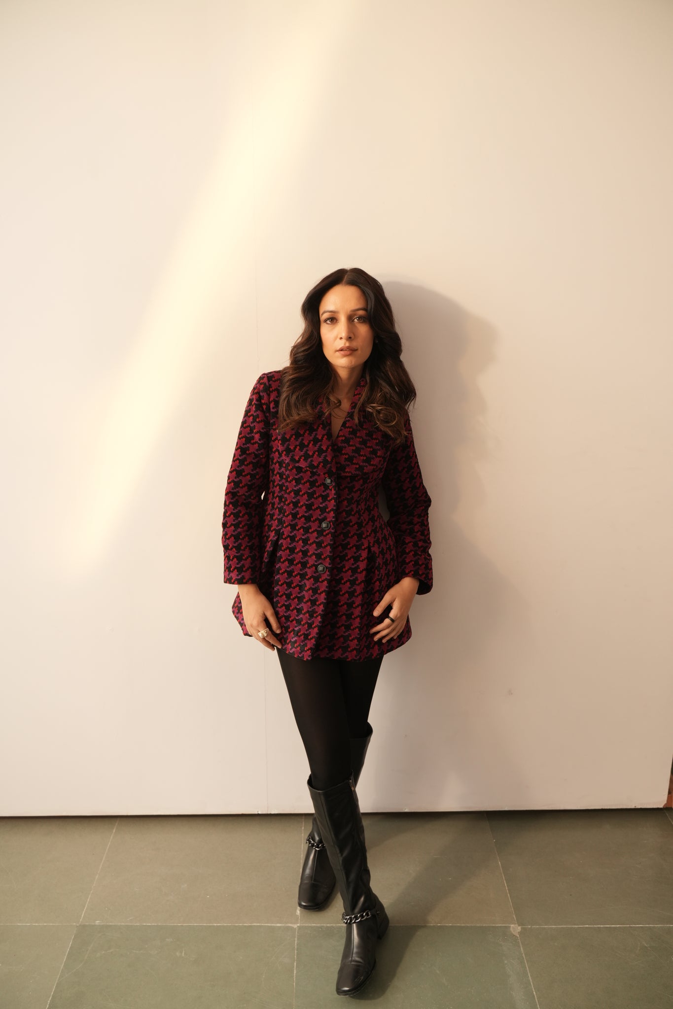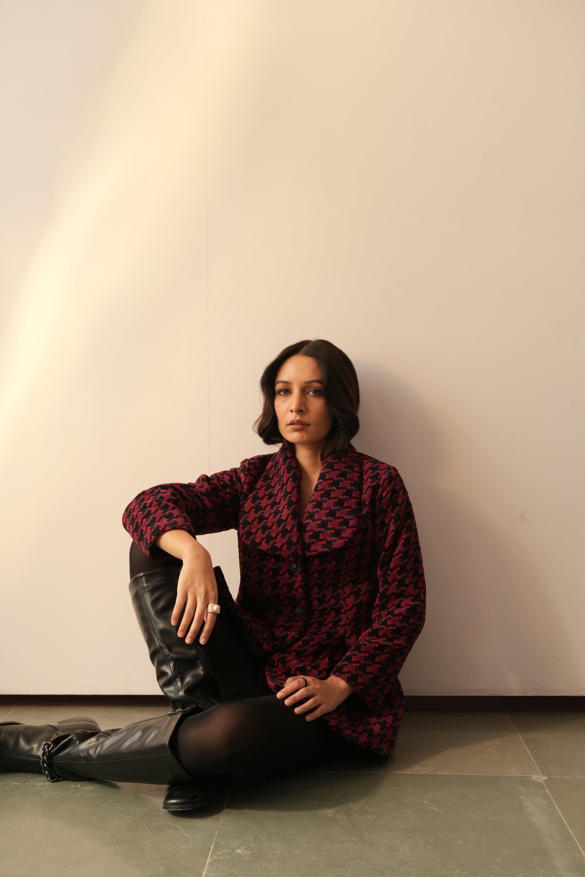 The Hannah Jacket is designed to be feminine and strong. Perfect for everyday to occasion wear, this chic and stunning jacket is made from warm wool fabric with an alluring houndstooth weaving pattern and red, black, and pink thread accents. Detailed with front box pleats and a practical pocket add to its versatility. Style it up with your beautiful sarees to turn heads.