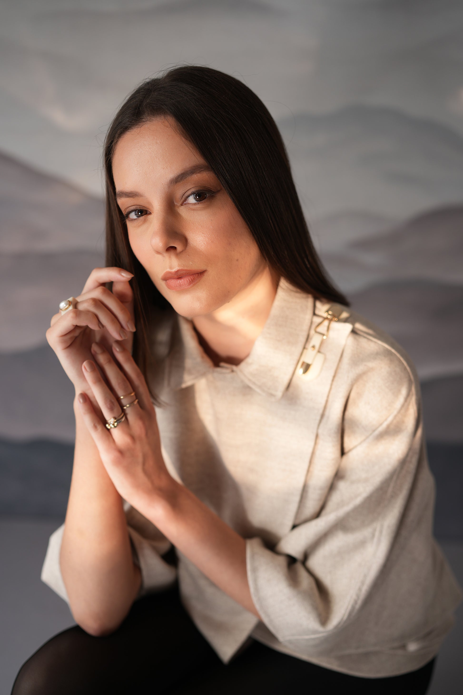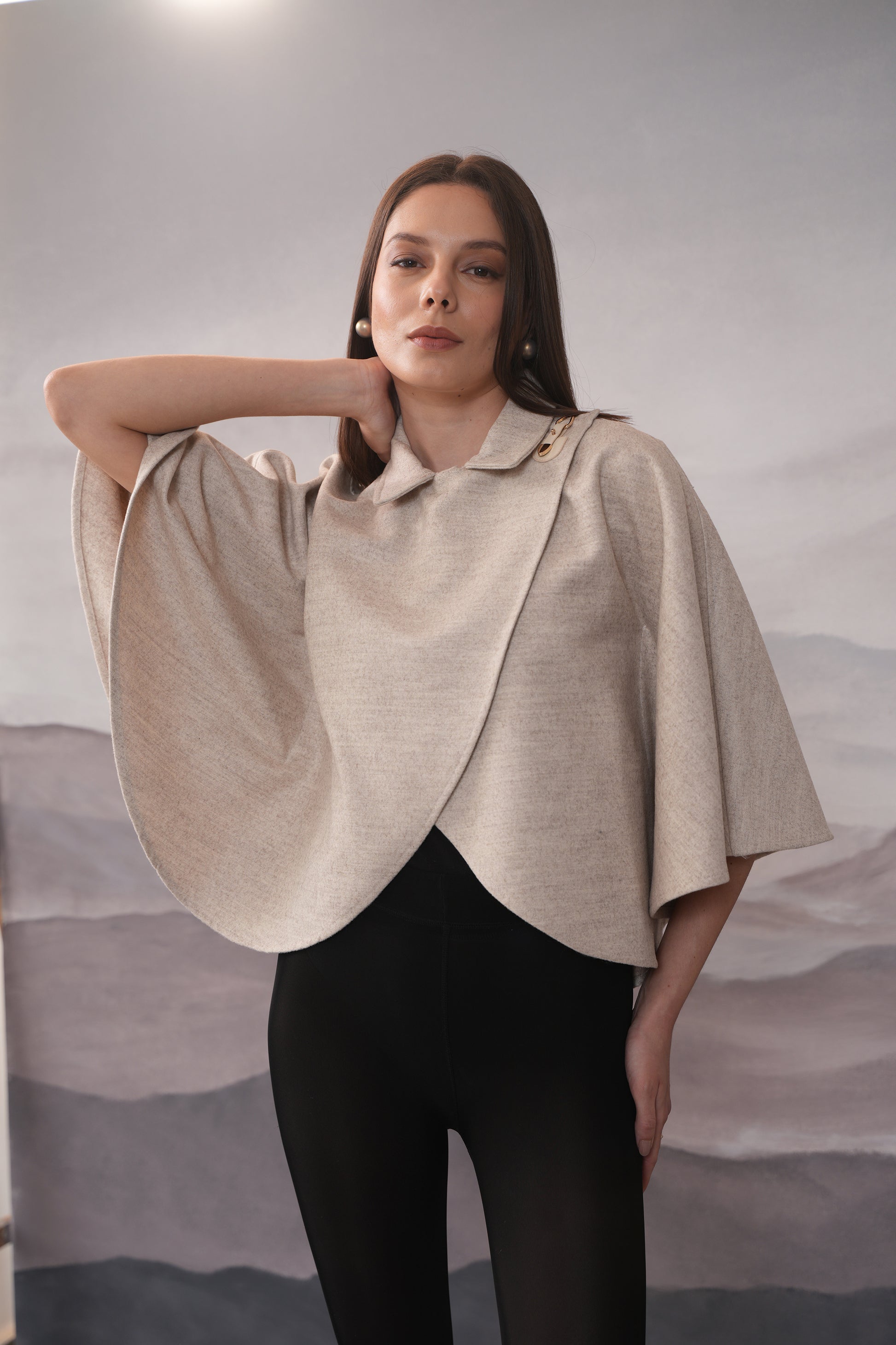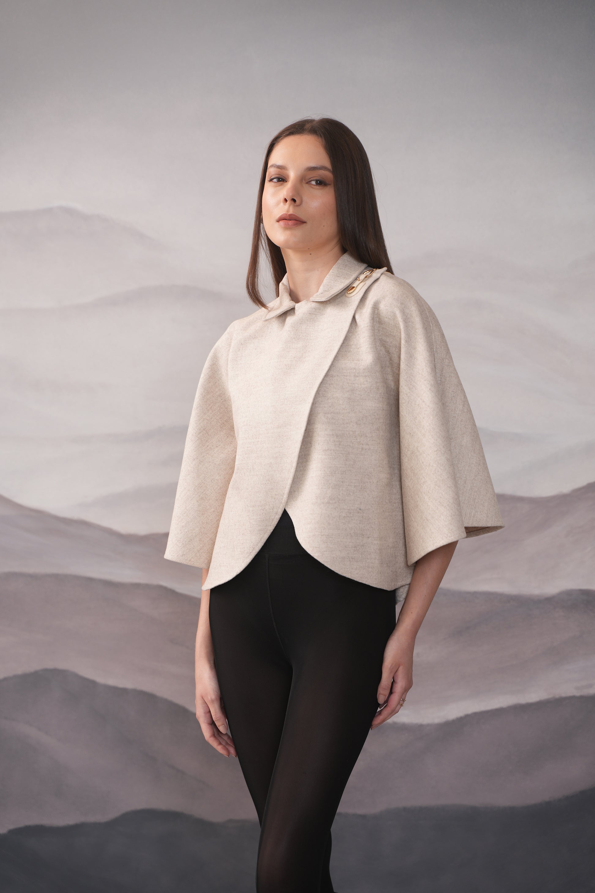 Stay warm and stylish with our cream wool cape. Made with high-quality woollen fabric, this chic cape is perfect for any occasion, from brunches to dinners. Pair it with your favorite bottoms for a smart silhouette. With its classic cream color, this cape will elevate any outfit.