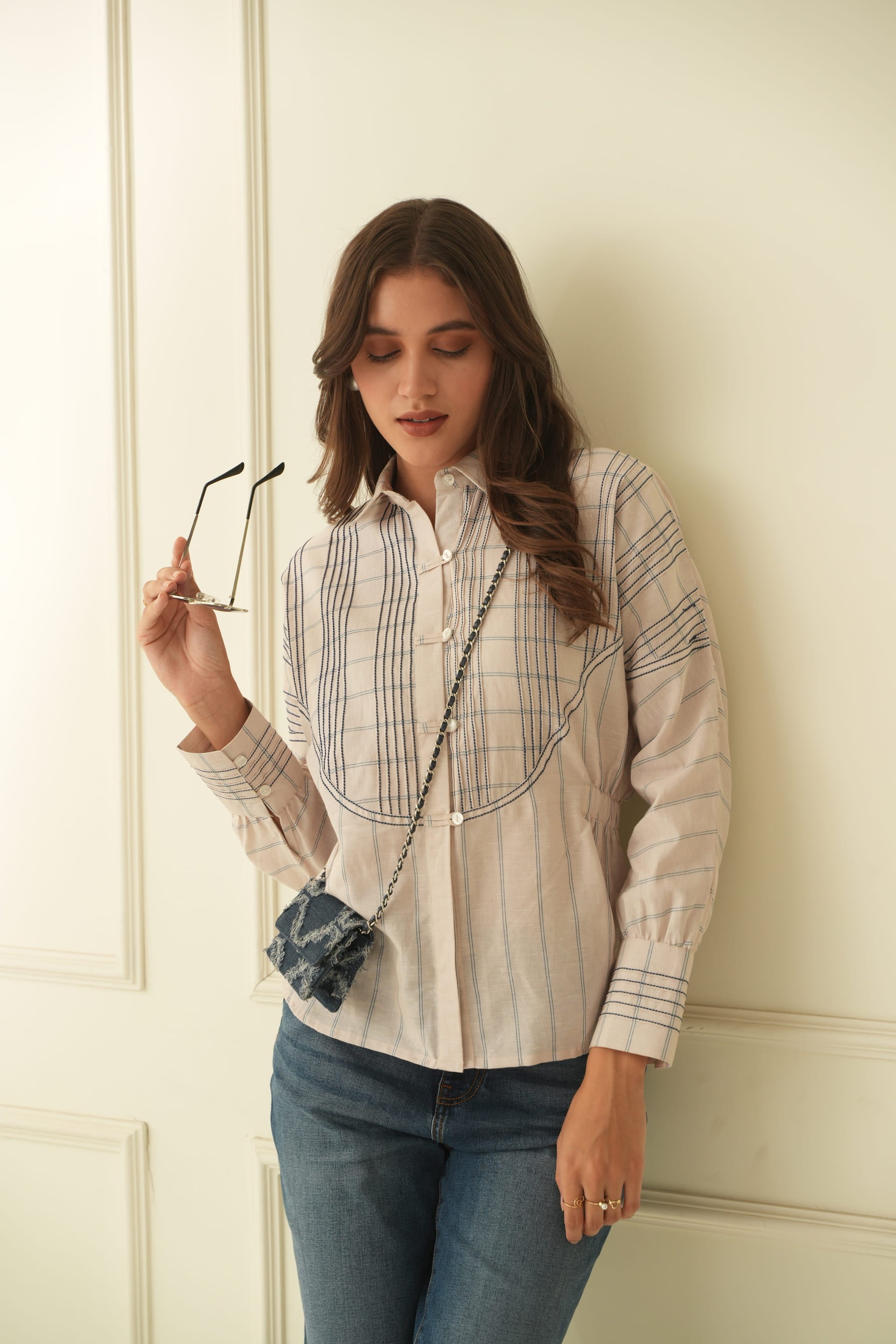 Expertly crafted with a front designed yoke and embroidered pintucked yoke with contrast thread, the Beige Harvey Linen Stripe Shirt exudes elegance. Its kimono sleeves and elastic waist add comfort, while the embroidered and pinktucked cuffs bring a touch of sophistication. Perfect for summery occasions, this shirt is chic and classy.