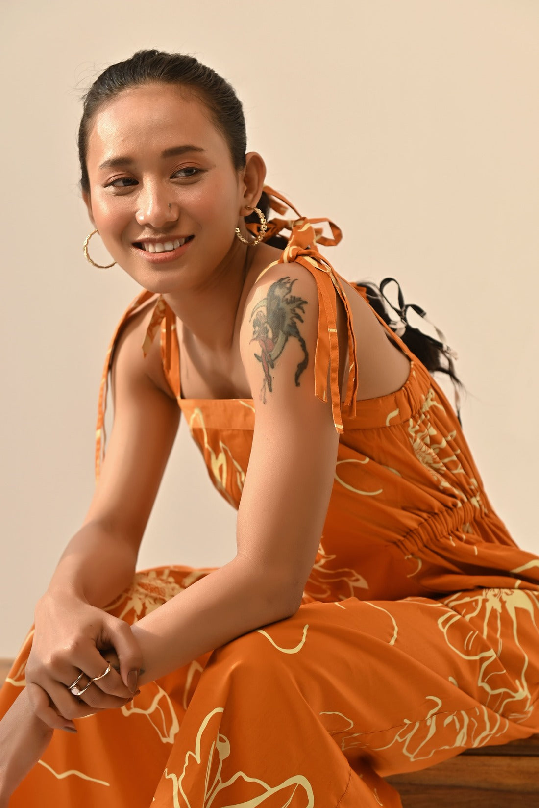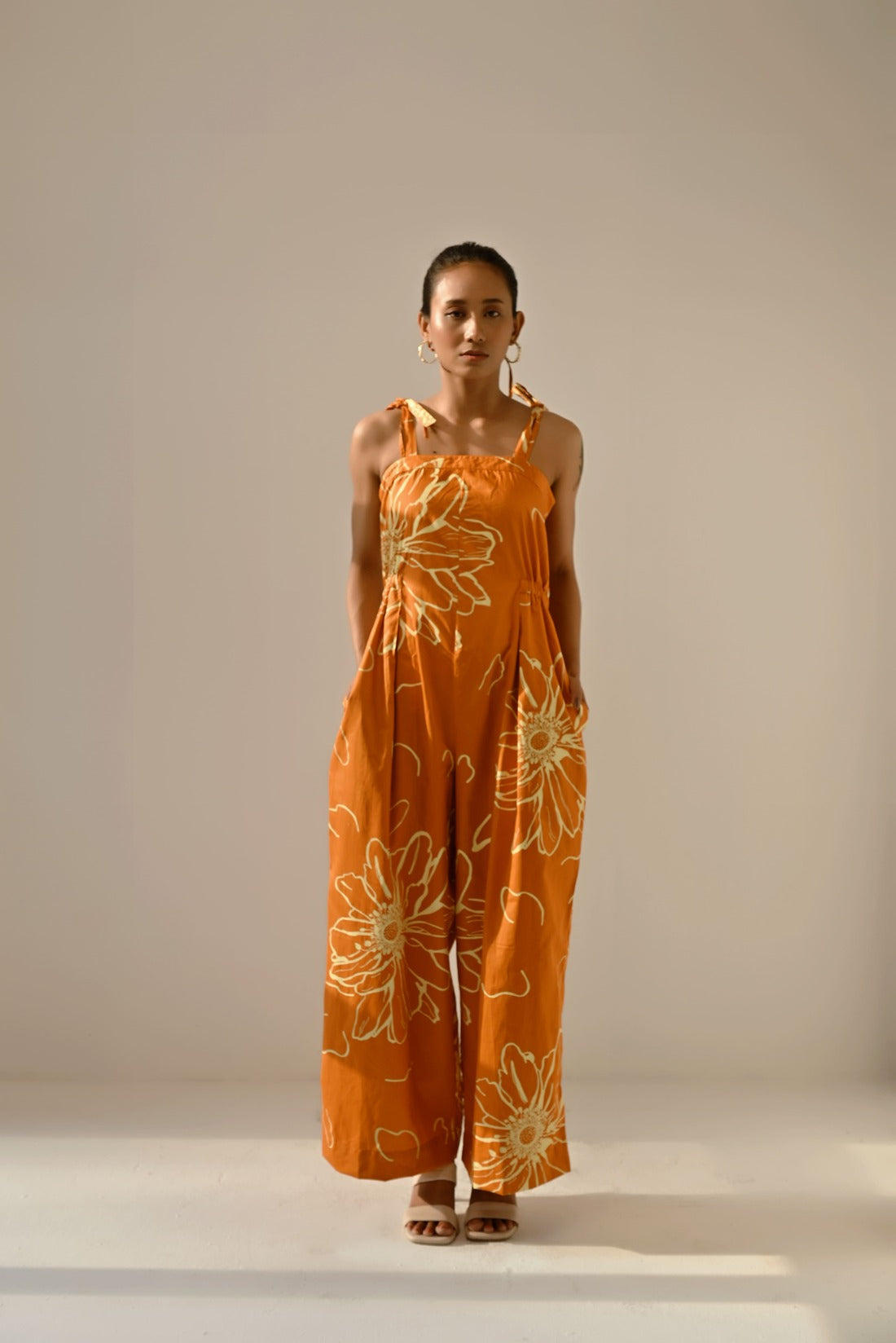 The Blossom Jumpsuit is the perfect summer wardrobe addition. Crafted from breathable cotton satin, it features knots, straps, and an orange print for a sassy and chic look. It has an easy, relaxed fit for maximum comfort, and the wide leg is ideal for a playful mood.