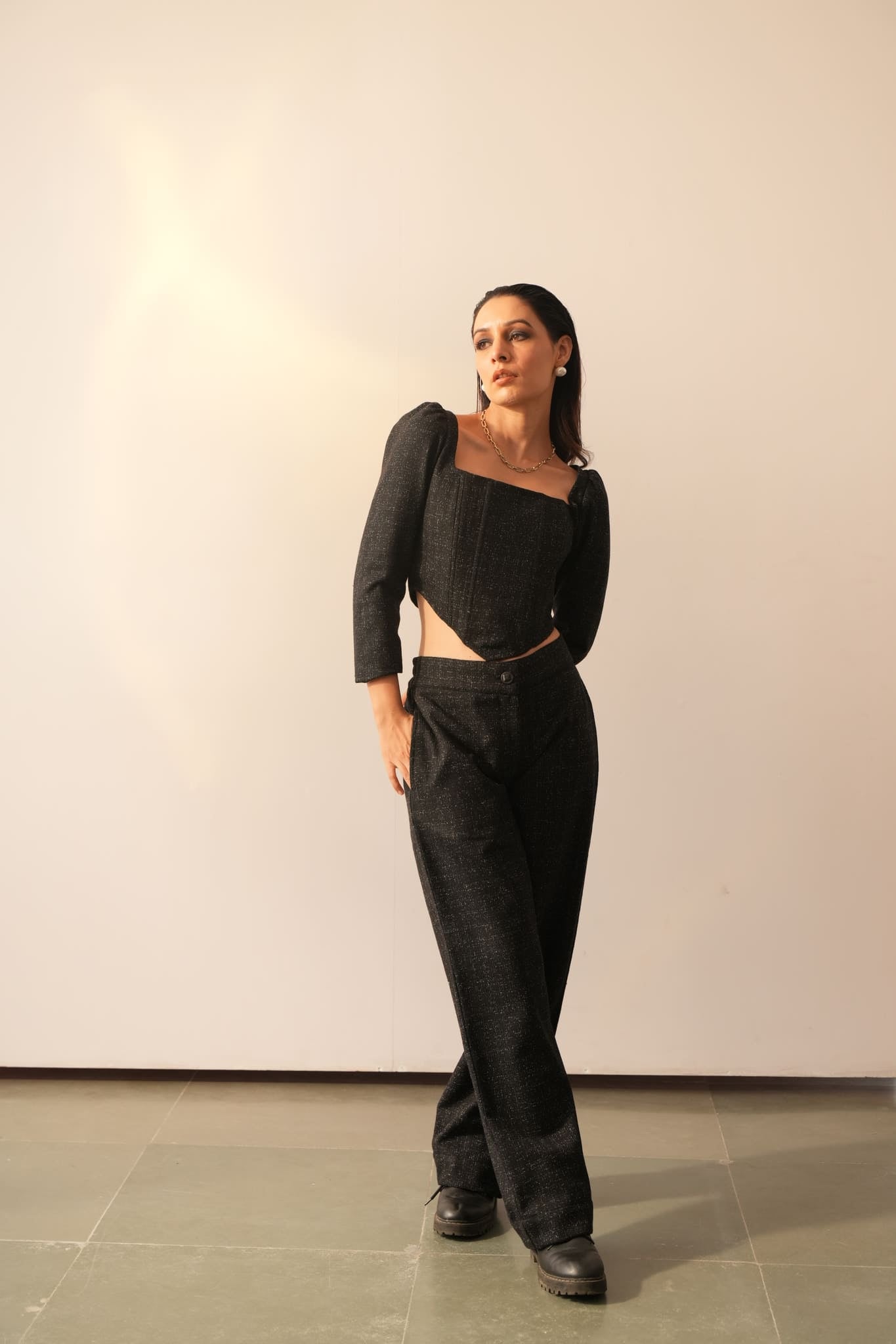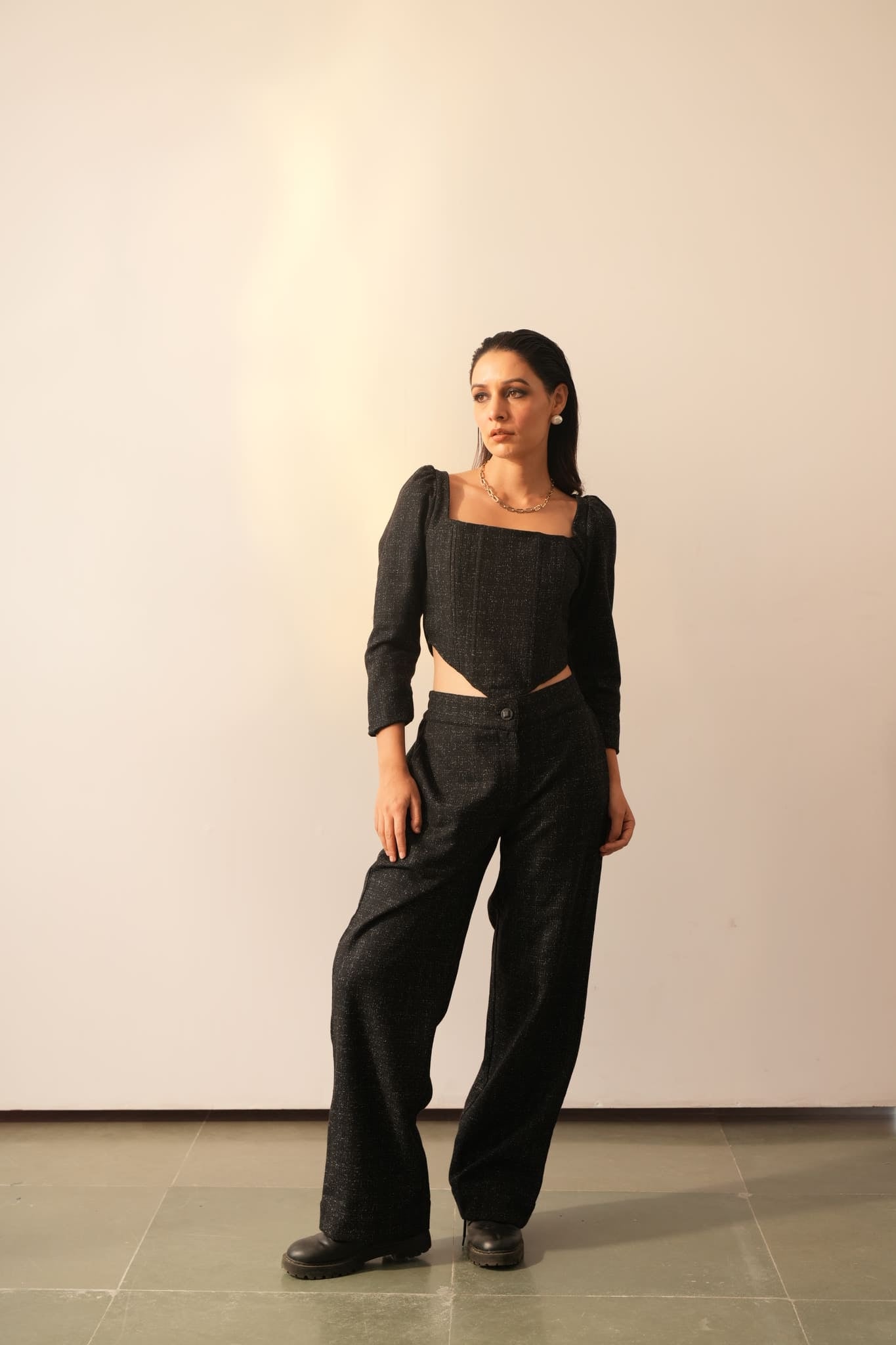 The Juliet Black Corset Cord set is crafted with warm corset detailing and luxurious black slub wool fabric. The stylish full sleeve and gathering detail on the sleeve crown adds a classy and sassy edge to your wardrobe. Perfect for occasions and parties, this high street style top will make you feel empowered. Comes with the trousers that features a front zipper and button closure, as well as an elasticated back (can be customised w/o back elastic) . The straight leg fit ensures lasting comfort and easy movement.