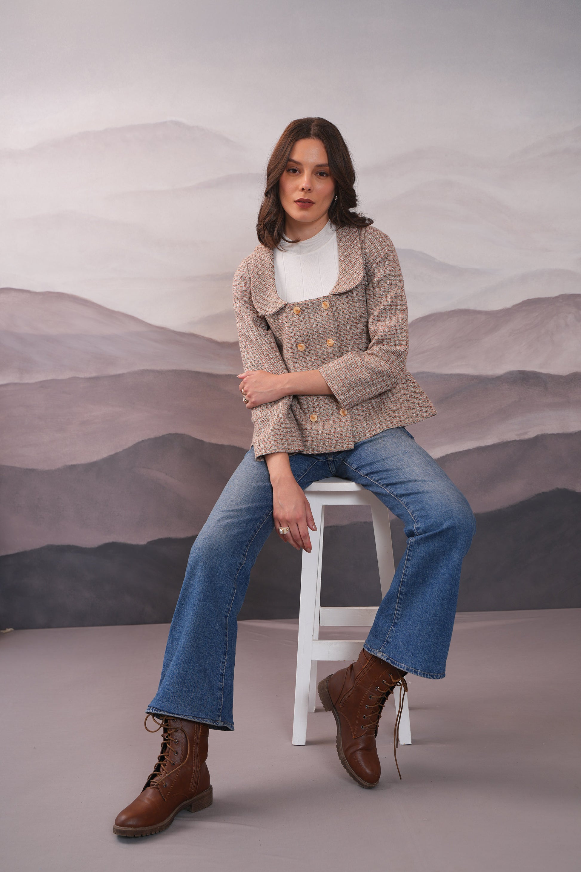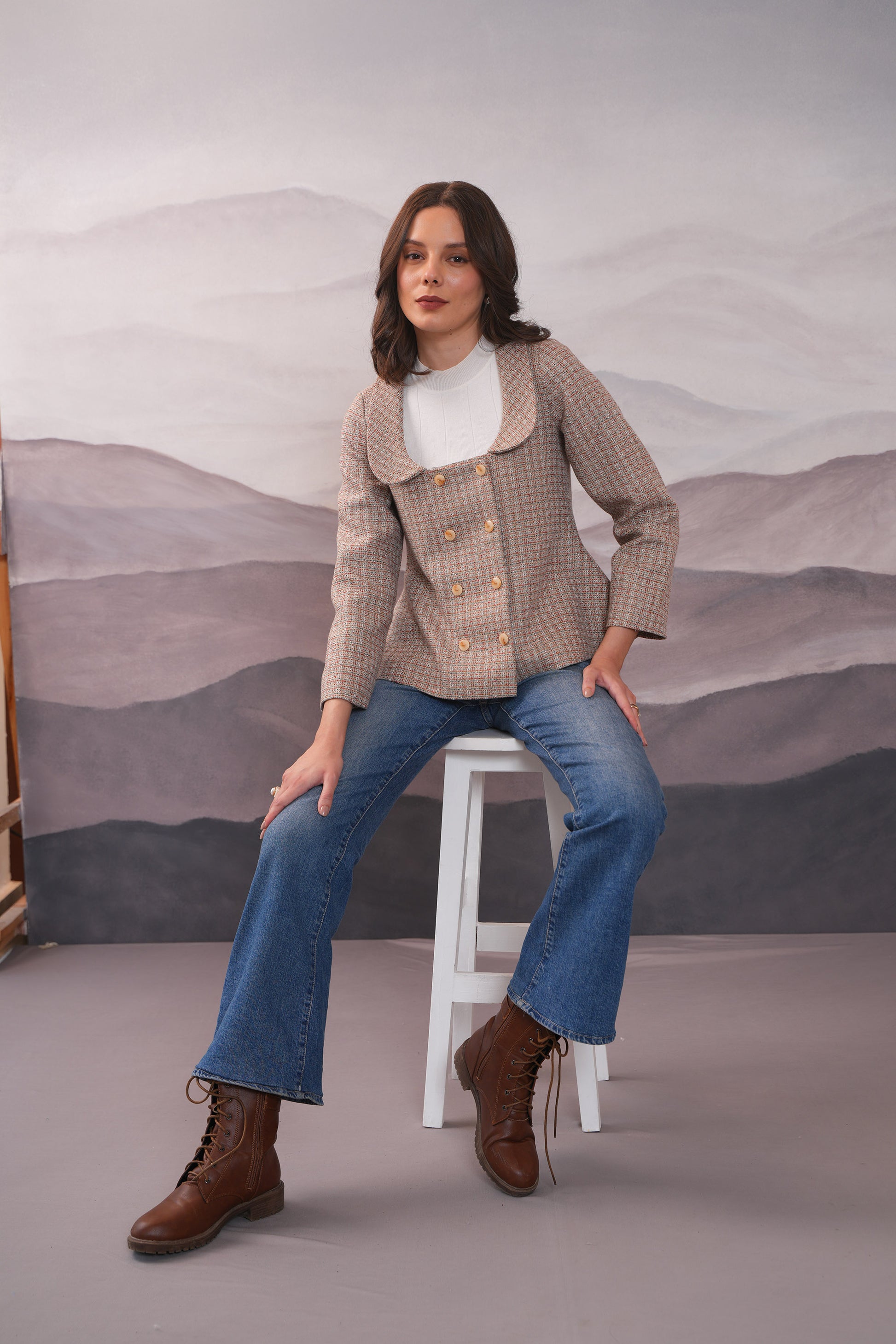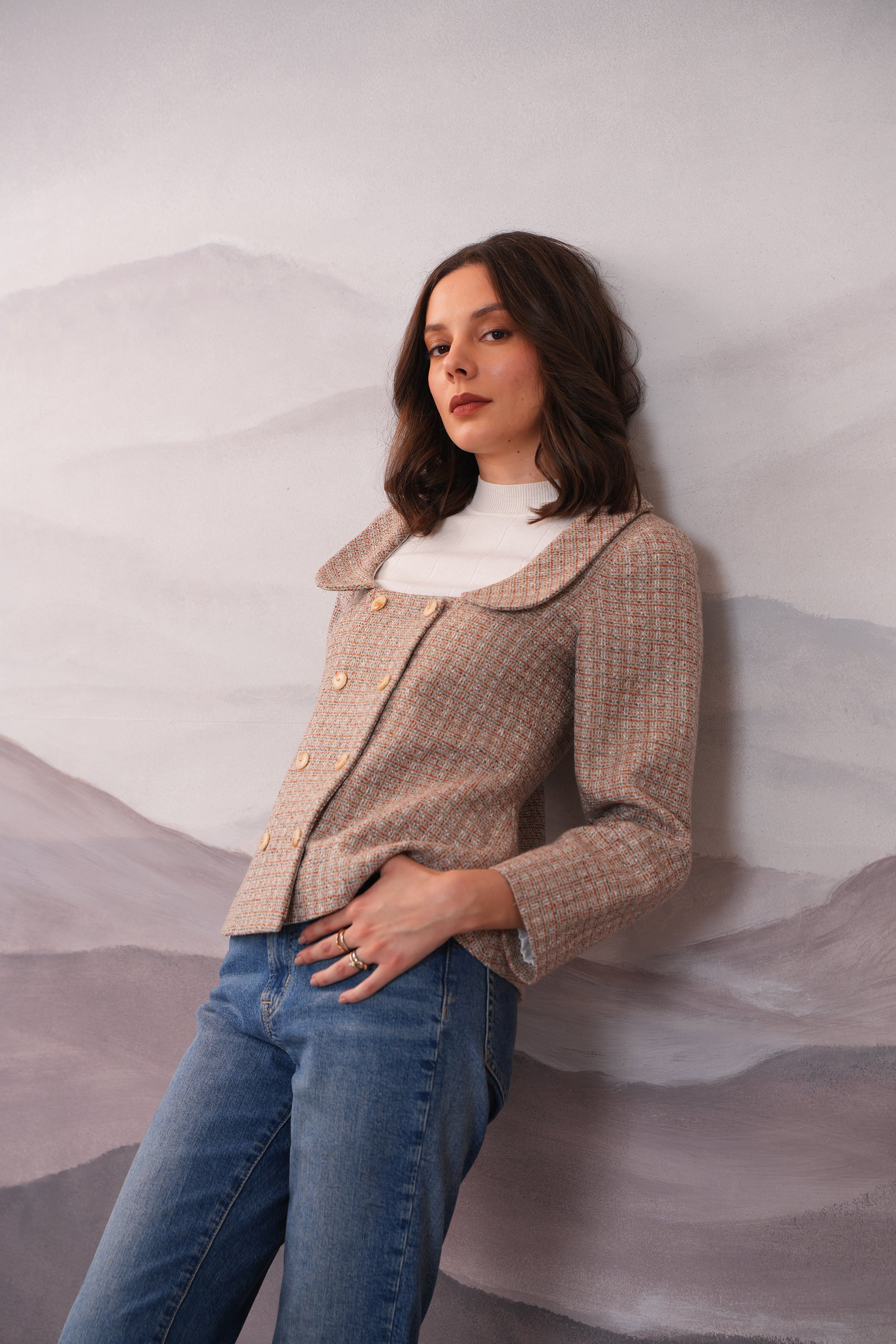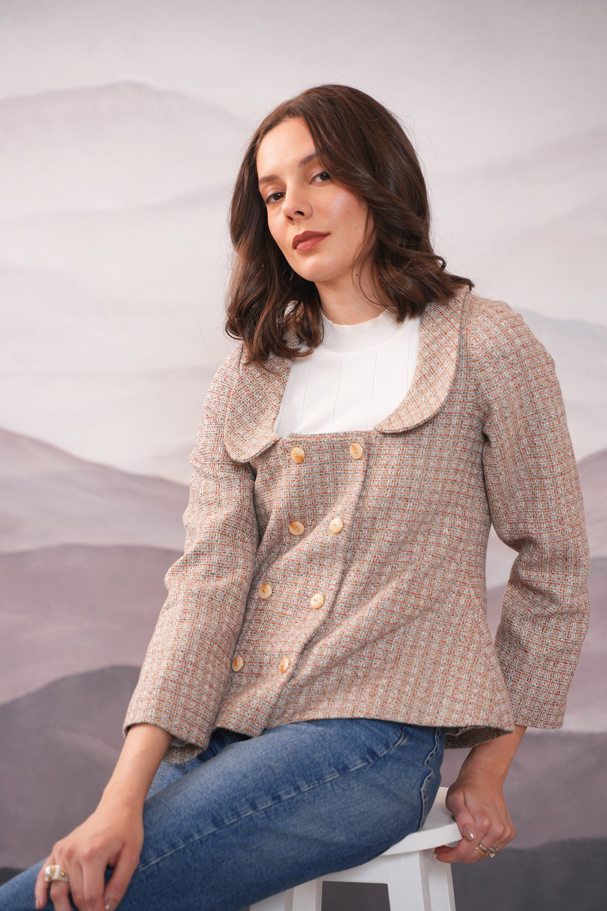Indulge in luxury with the Jullie Flare Warm Cordset. The double breasted jacket features a square neck and round flat lapels, while multicolour yarns provide a cozy yet sophisticated touch. Complete the look with our warm skirt for a polished ensemble. Perfect for those who appreciate high-quality craftsmanship and a chic style.