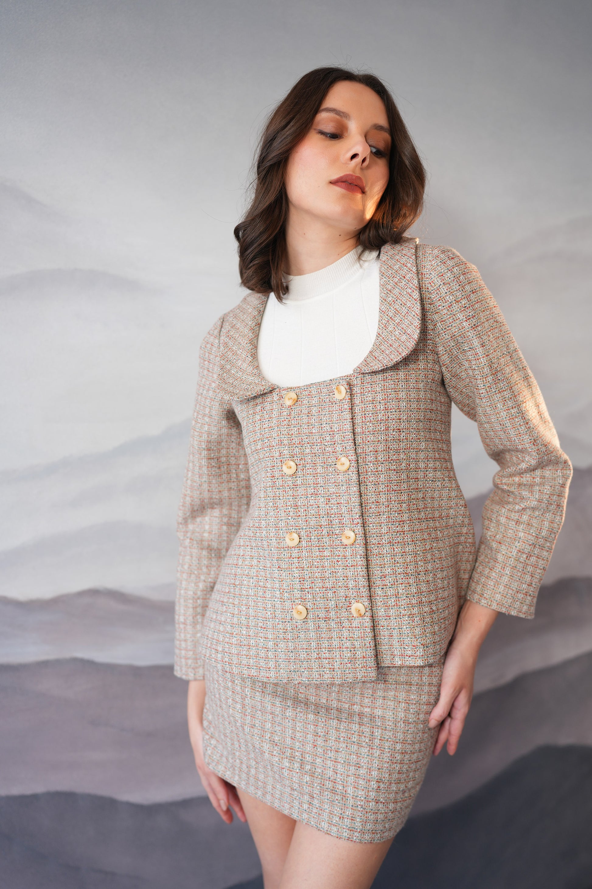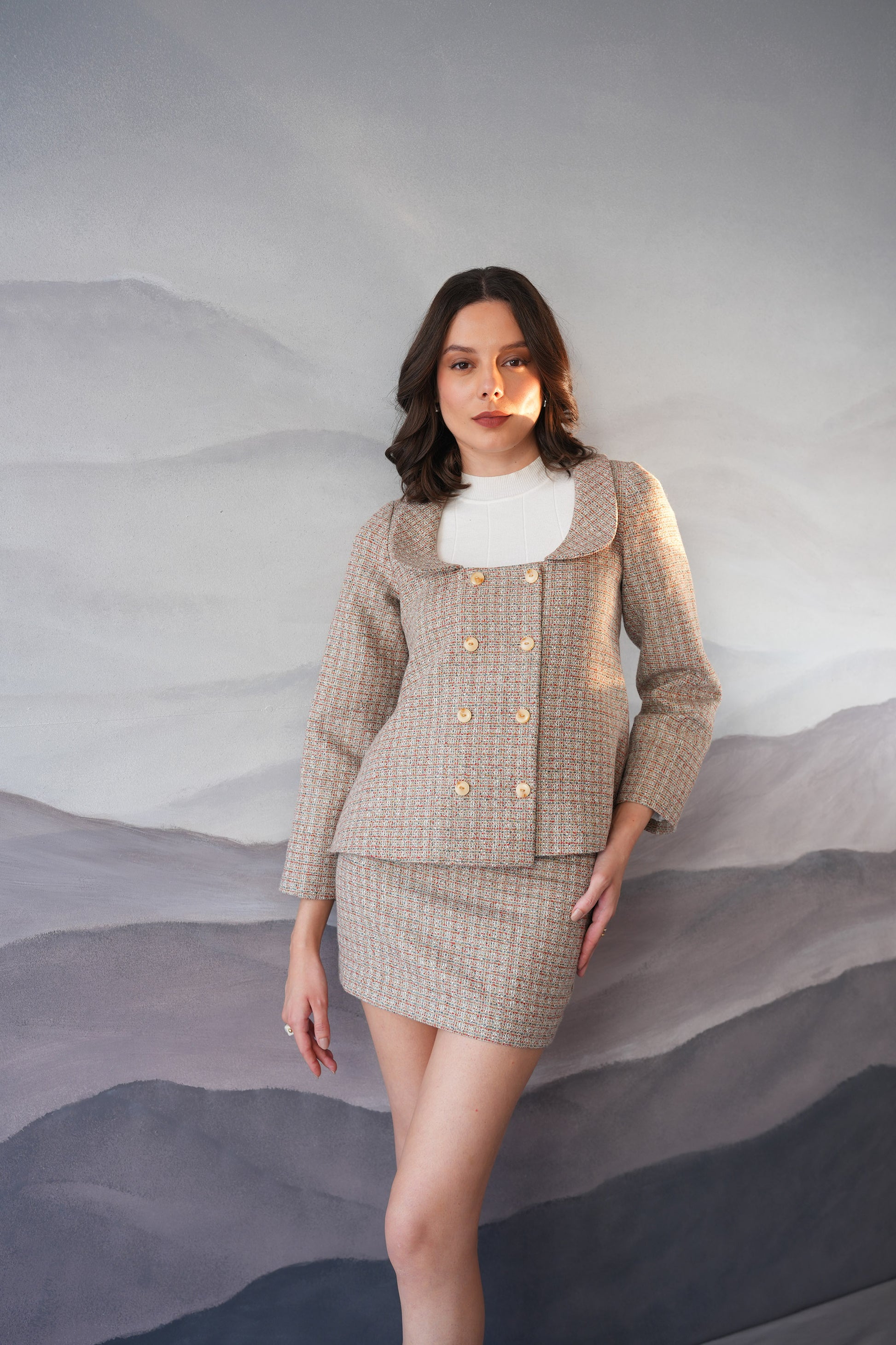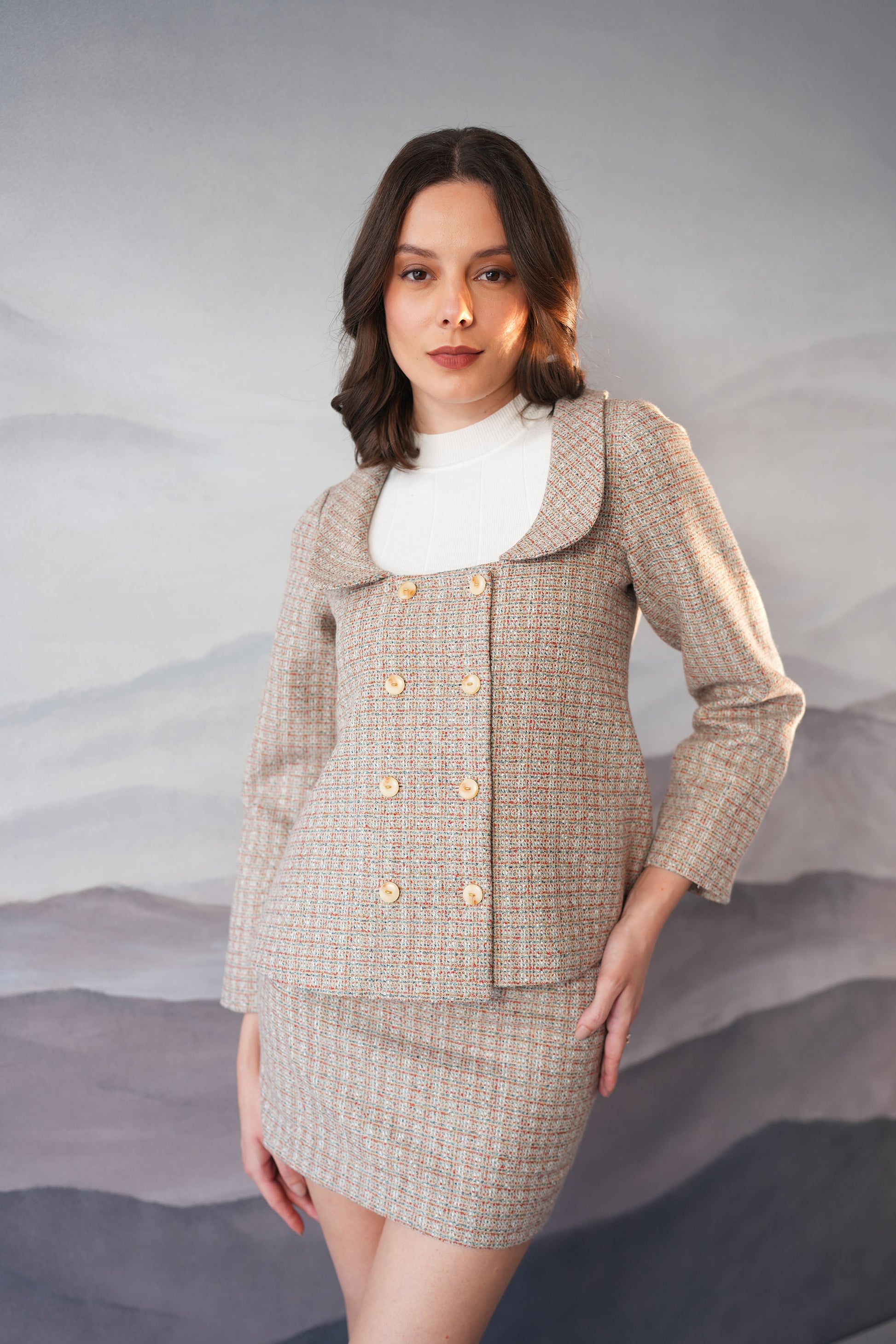 Indulge in luxury with the Jullie Flare Warm Cordset. The double breasted jacket features a square neck and round flat lapels, while multicolour yarns provide a cozy yet sophisticated touch. Complete the look with our warm skirt for a polished ensemble. Perfect for those who appreciate high-quality craftsmanship and a chic style.