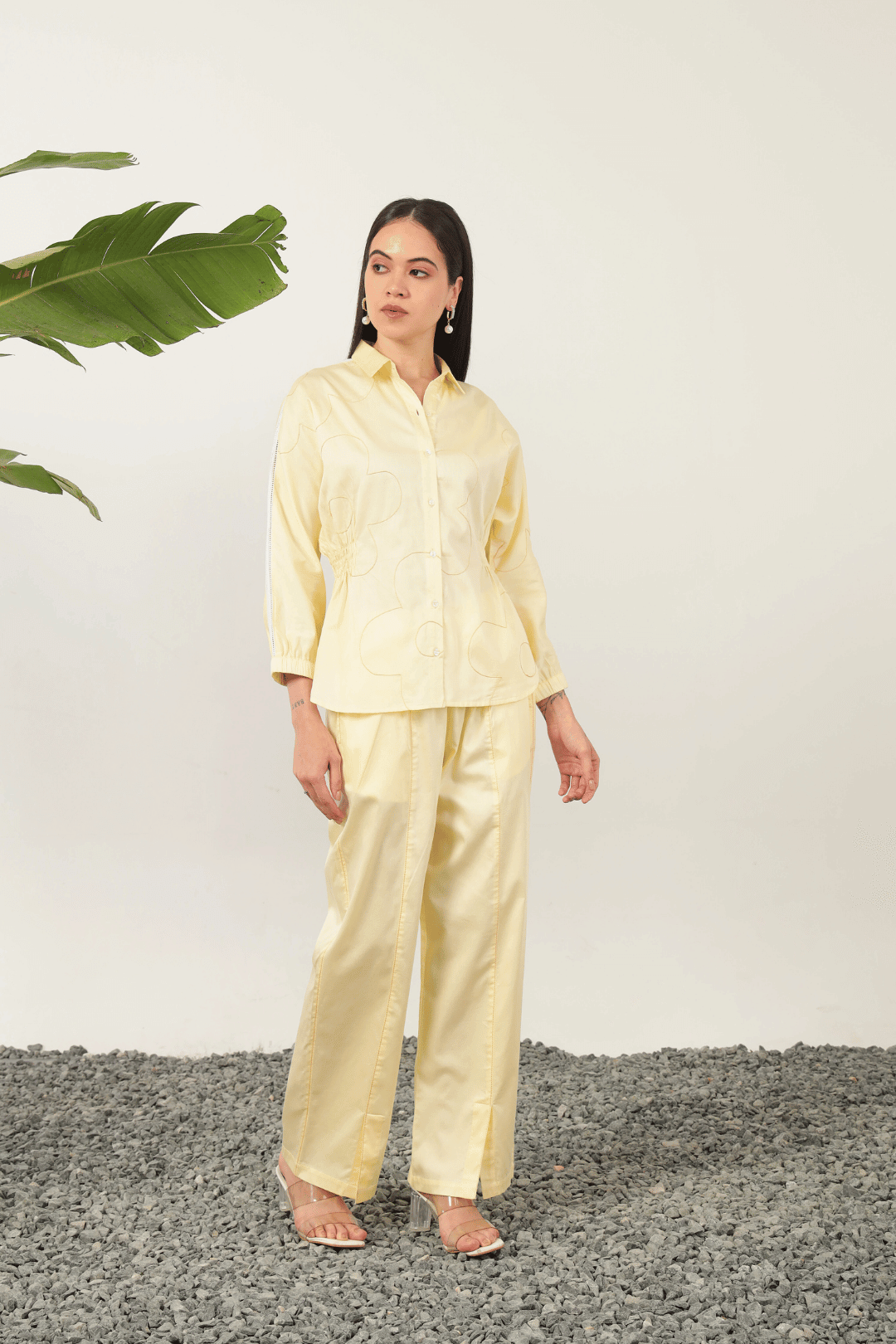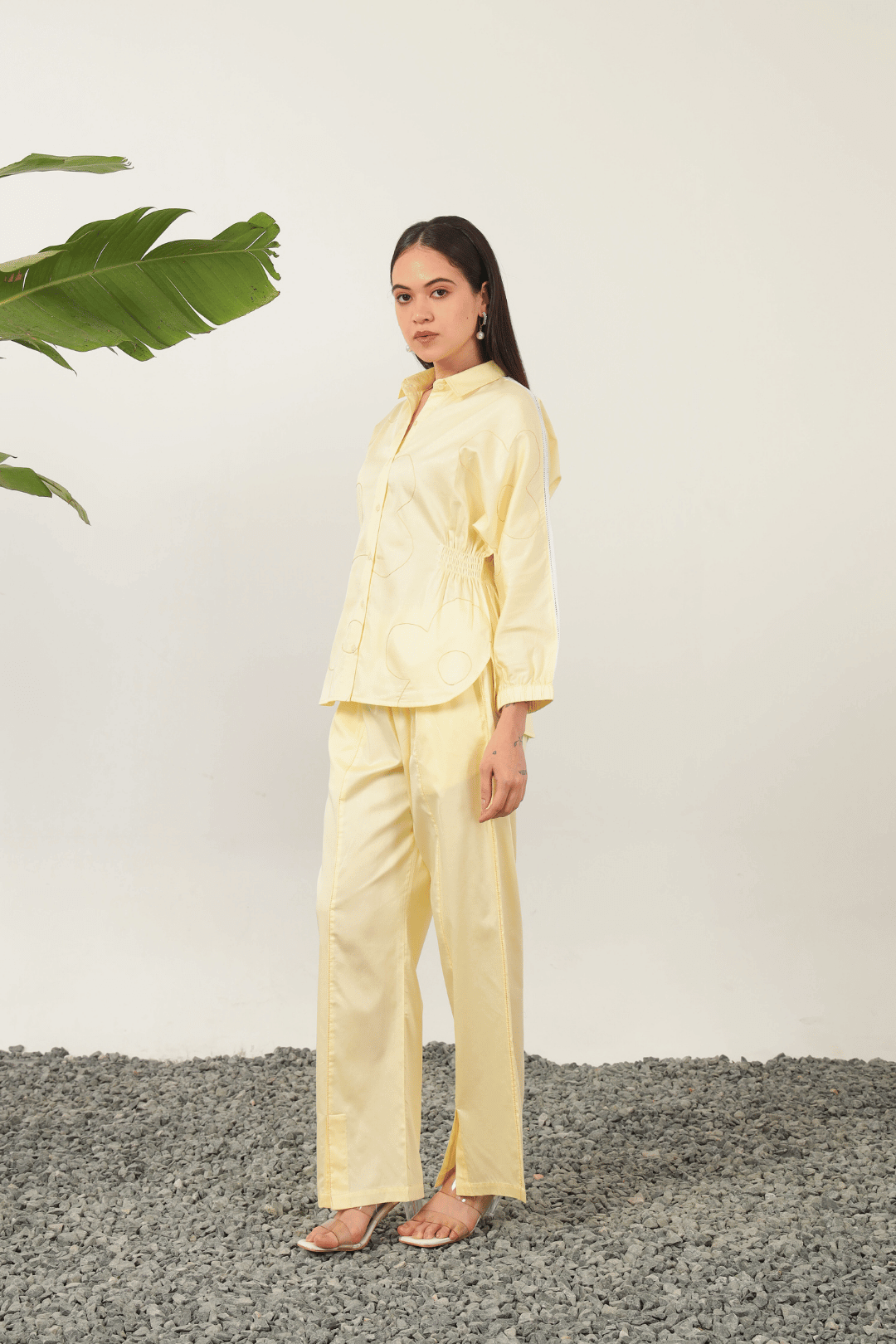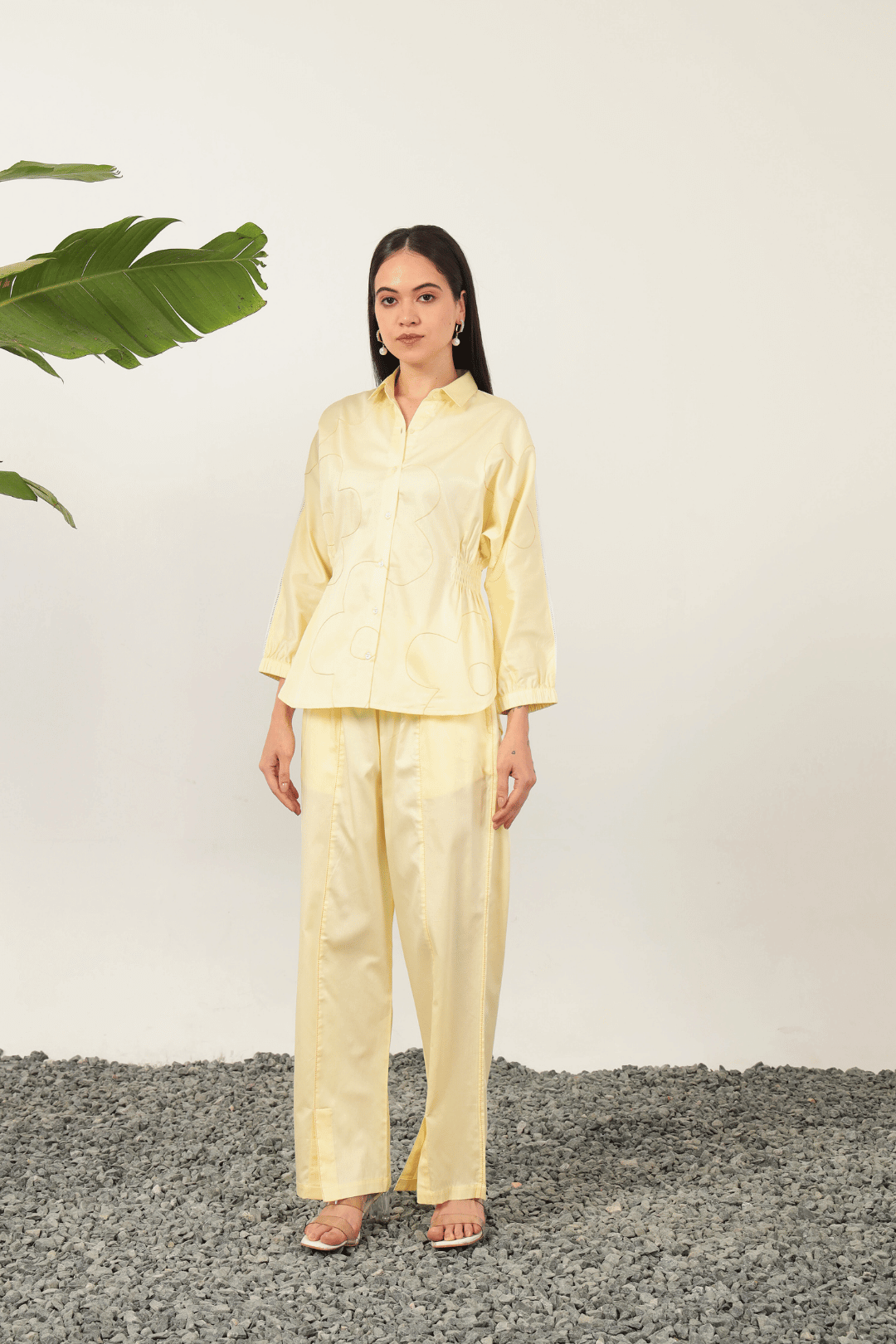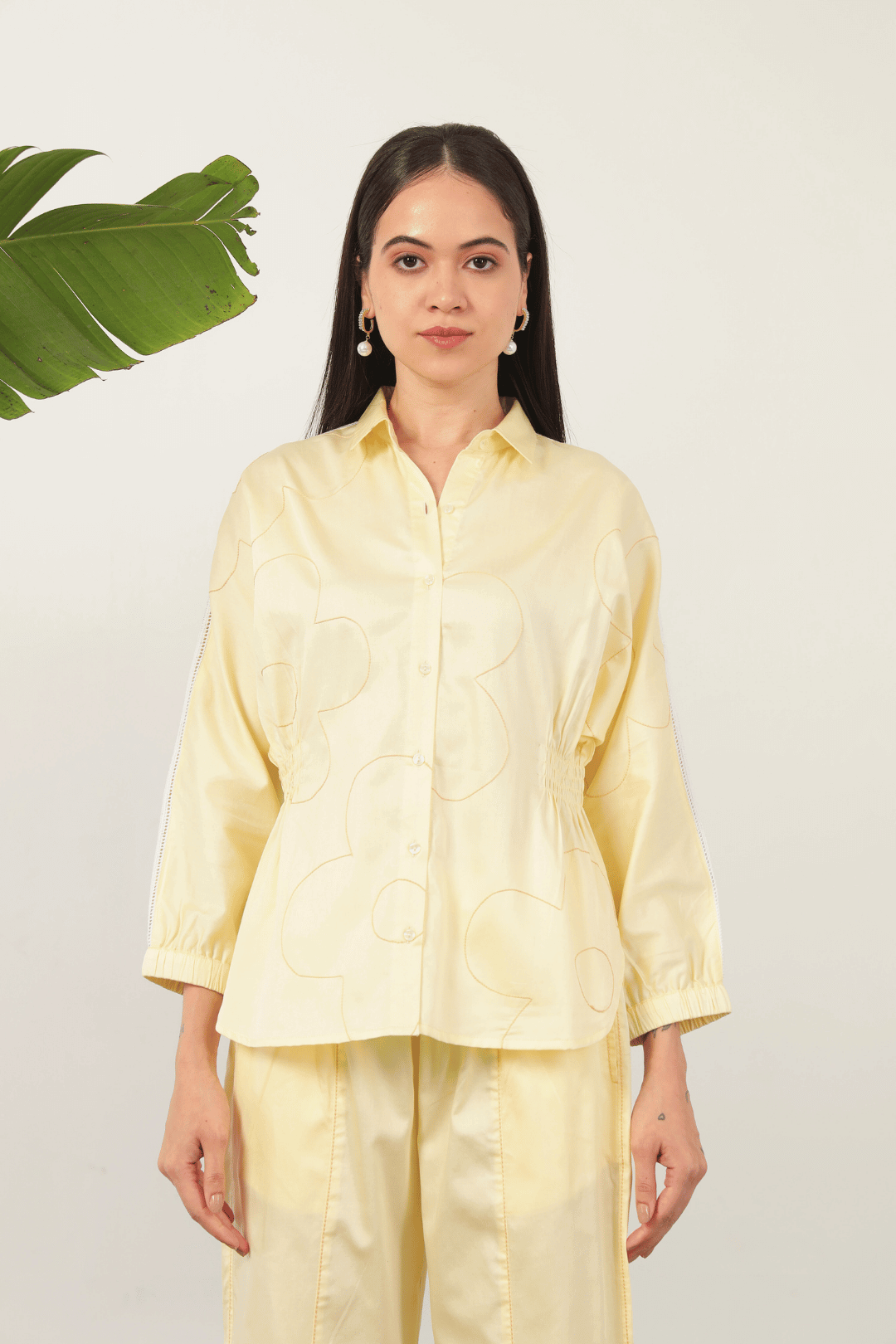 Exquisitely crafted with delicate flower line thread embroidery, the Catalina Cord Set in Lemon offers refined elegance. The shirt features a sophisticated relaxed silhouette with graceful kimono sleeves and intricate shoulder lace detailing. This chic ensemble is complemented by elasticated pants, ensuring both comfort and polished style for discerning tastes.