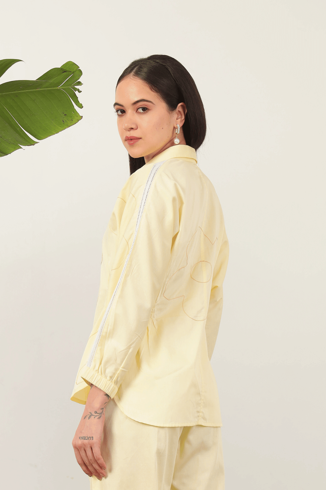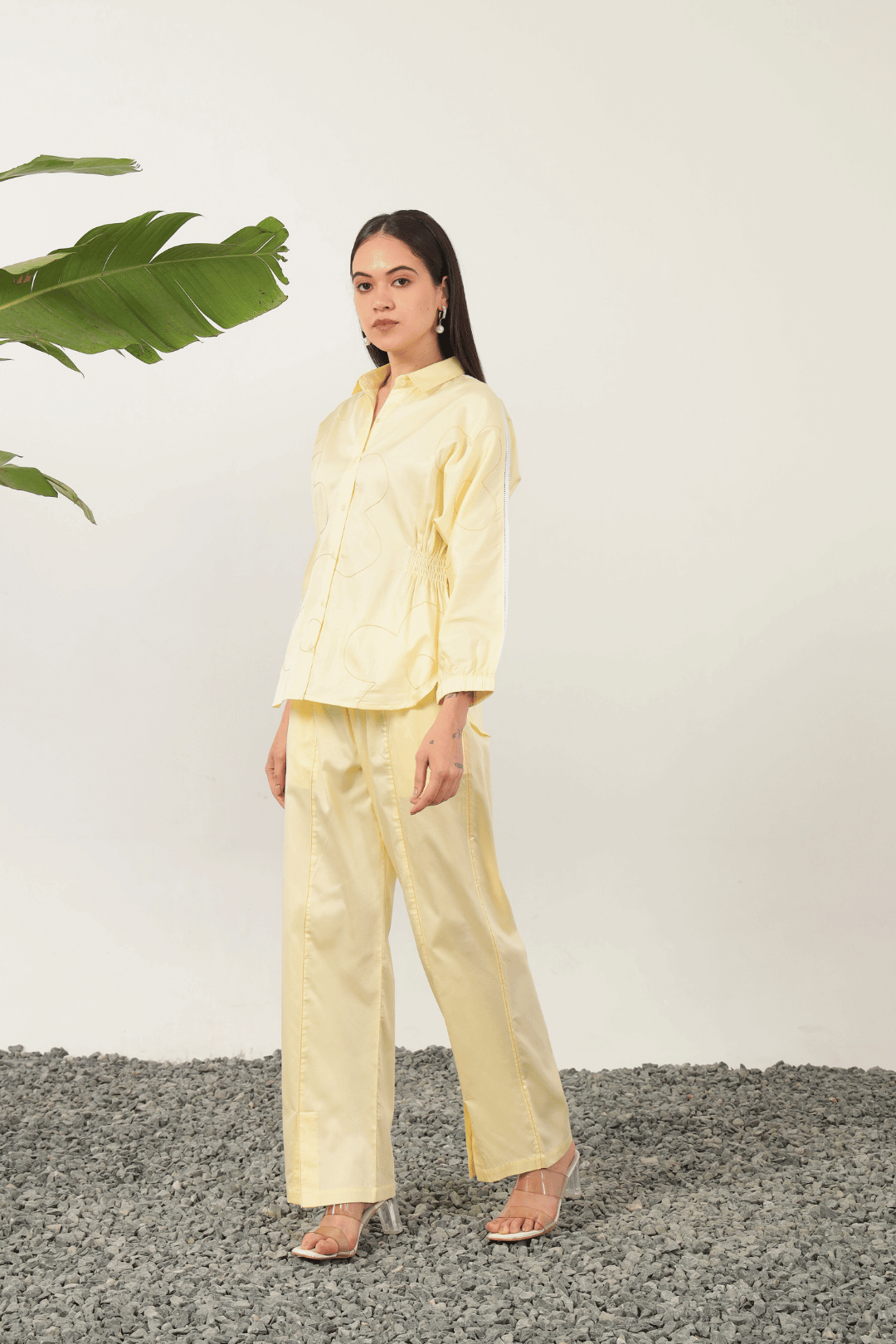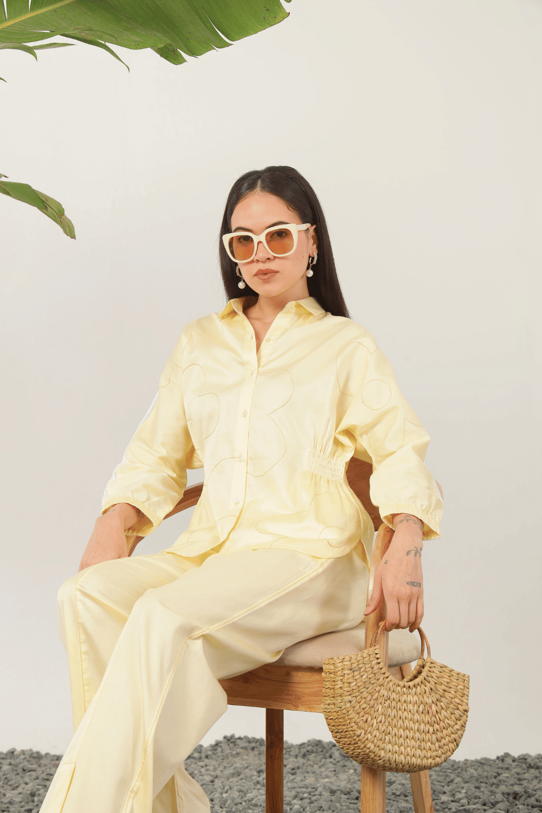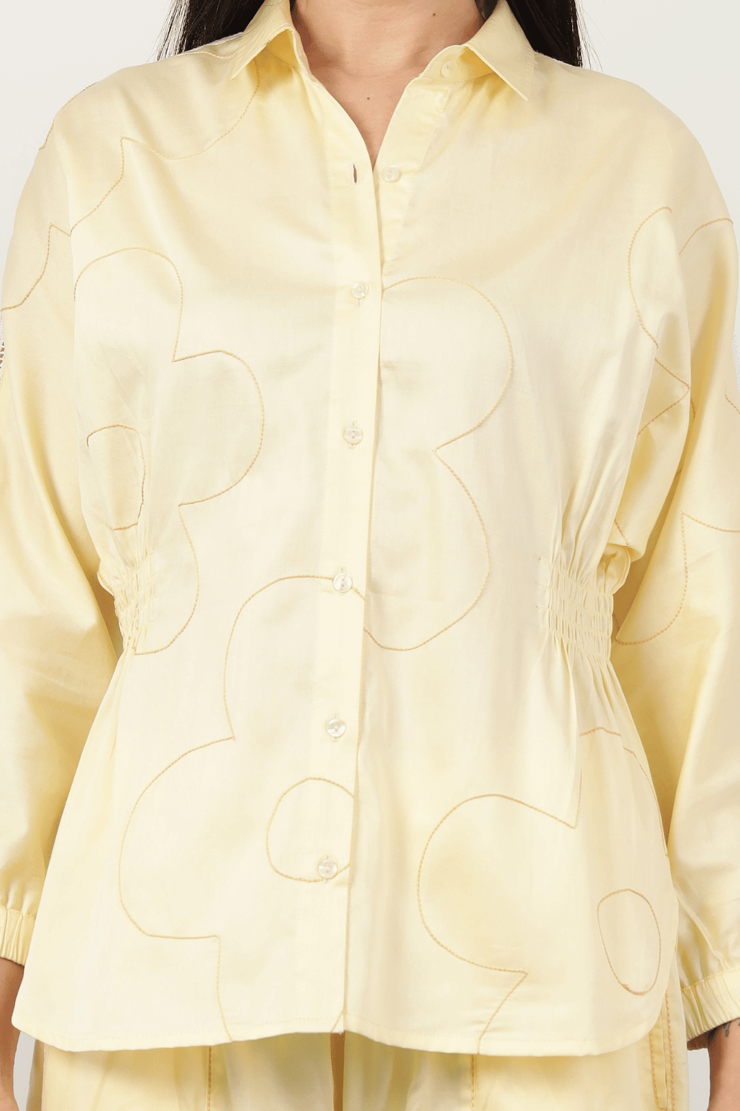 Exquisitely crafted with delicate flower line thread embroidery, the Catalina Cord Set in Lemon offers refined elegance. The shirt features a sophisticated relaxed silhouette with graceful kimono sleeves and intricate shoulder lace detailing. This chic ensemble is complemented by elasticated pants, ensuring both comfort and polished style for discerning tastes.