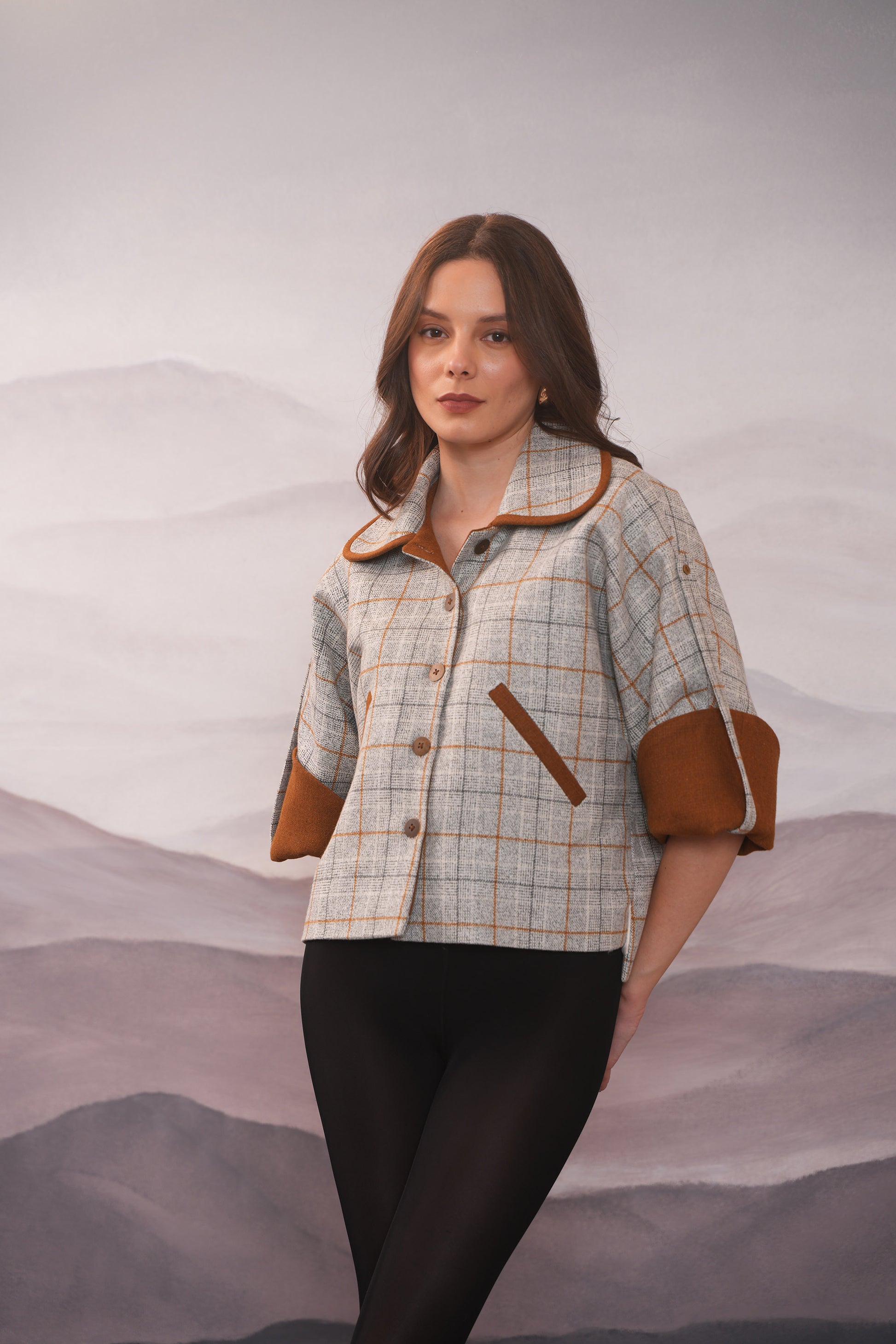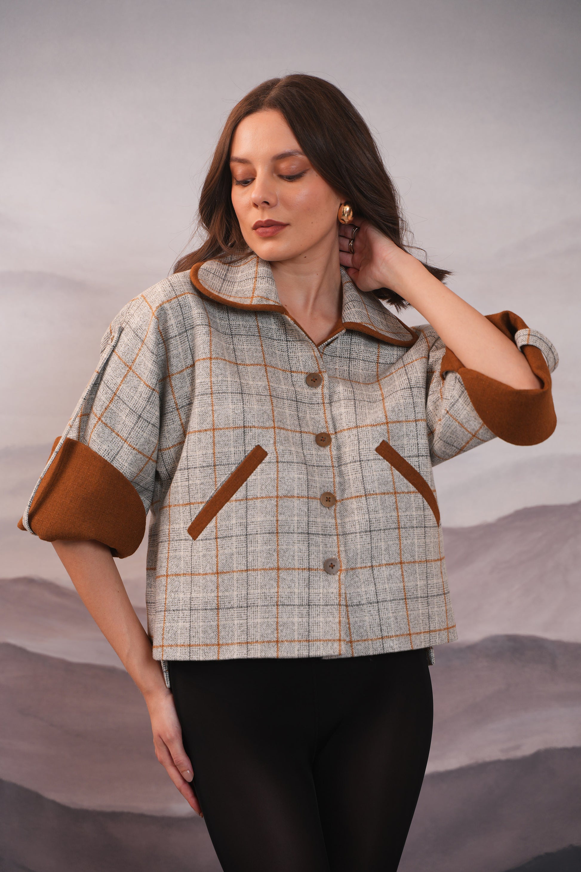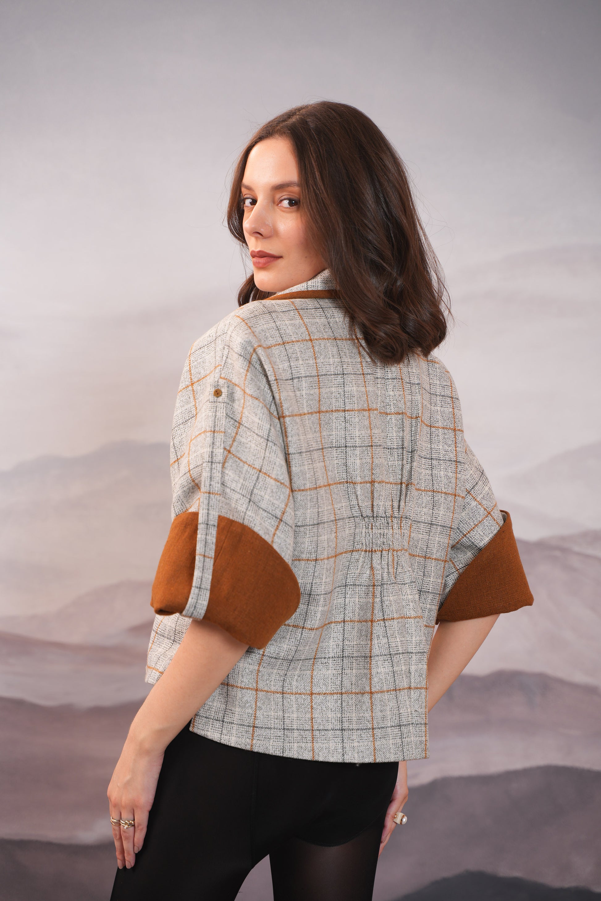 Expertly crafted from check wool fabric, the Kimono Jacket blends chic style with casual comfort. The mustard contrast detailing and metal button add a touch of sophistication, while the back gathers and round sleeves provide a stunning silhouette. Elevate your wardrobe with this must-have piece.