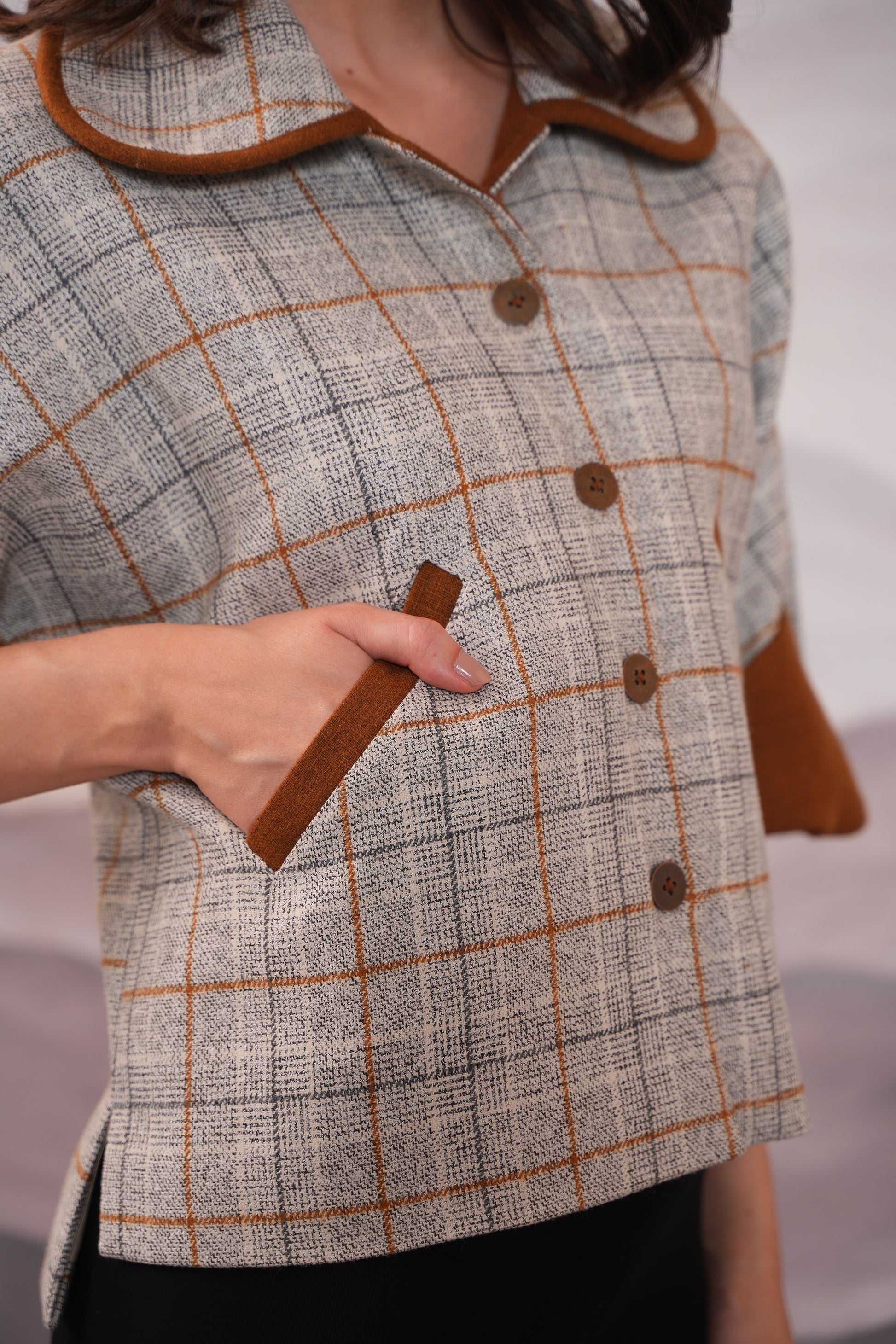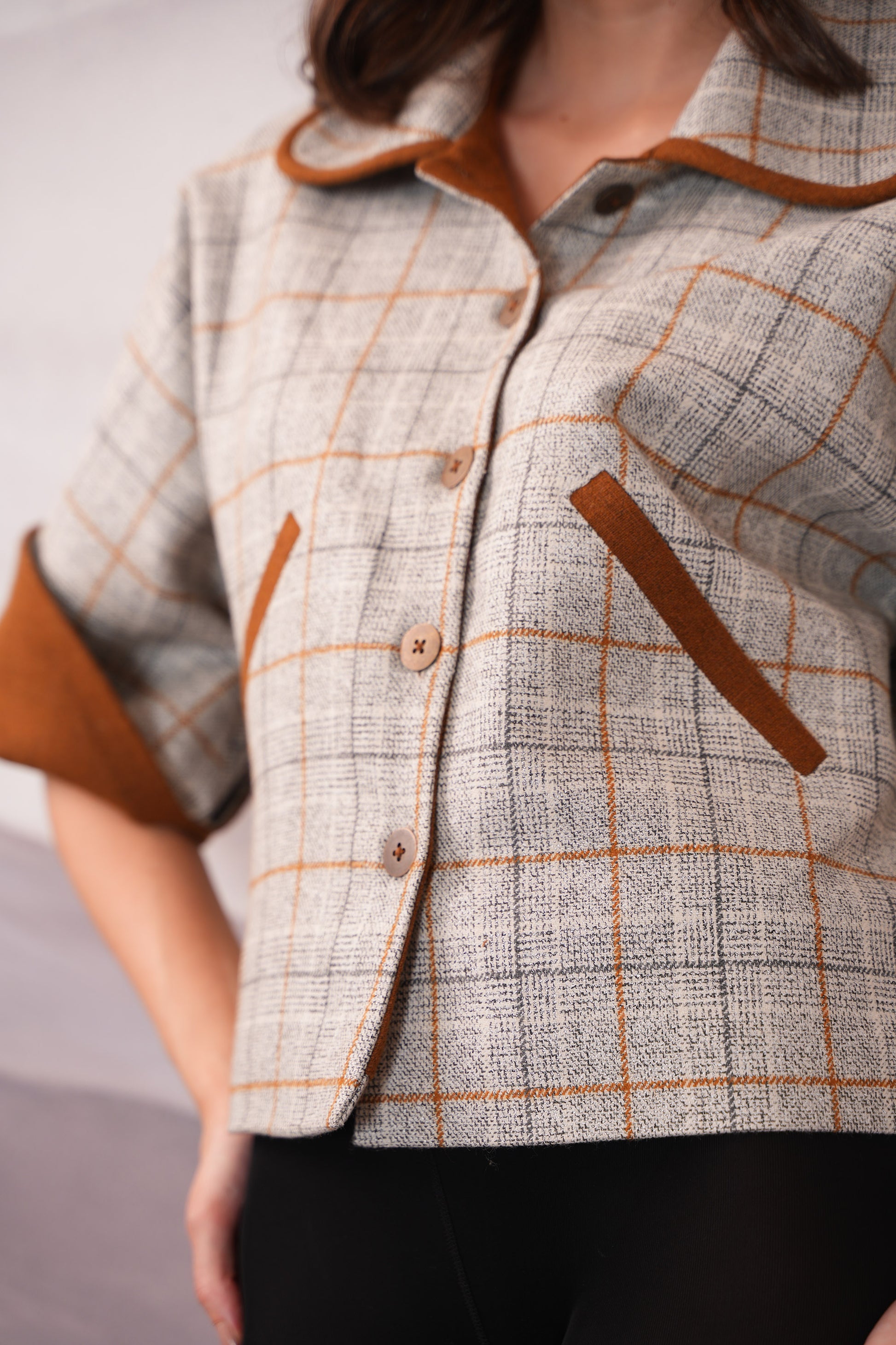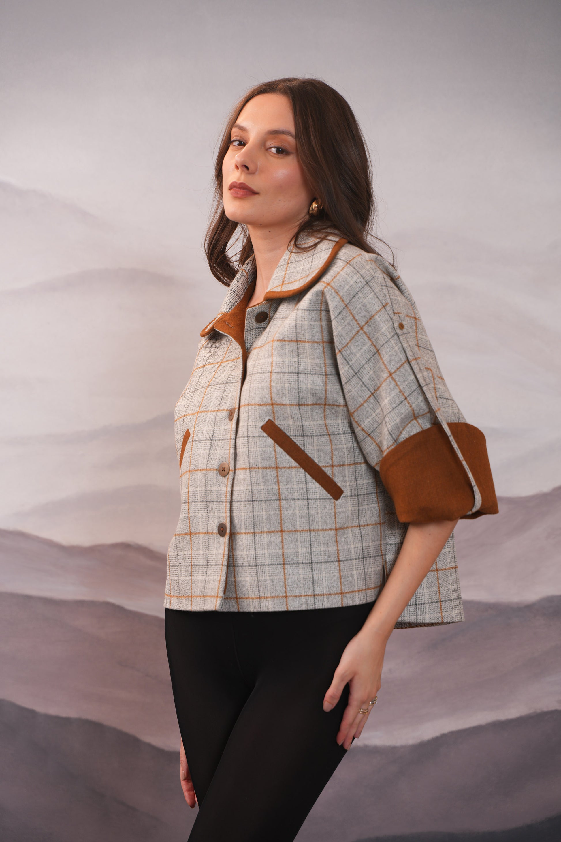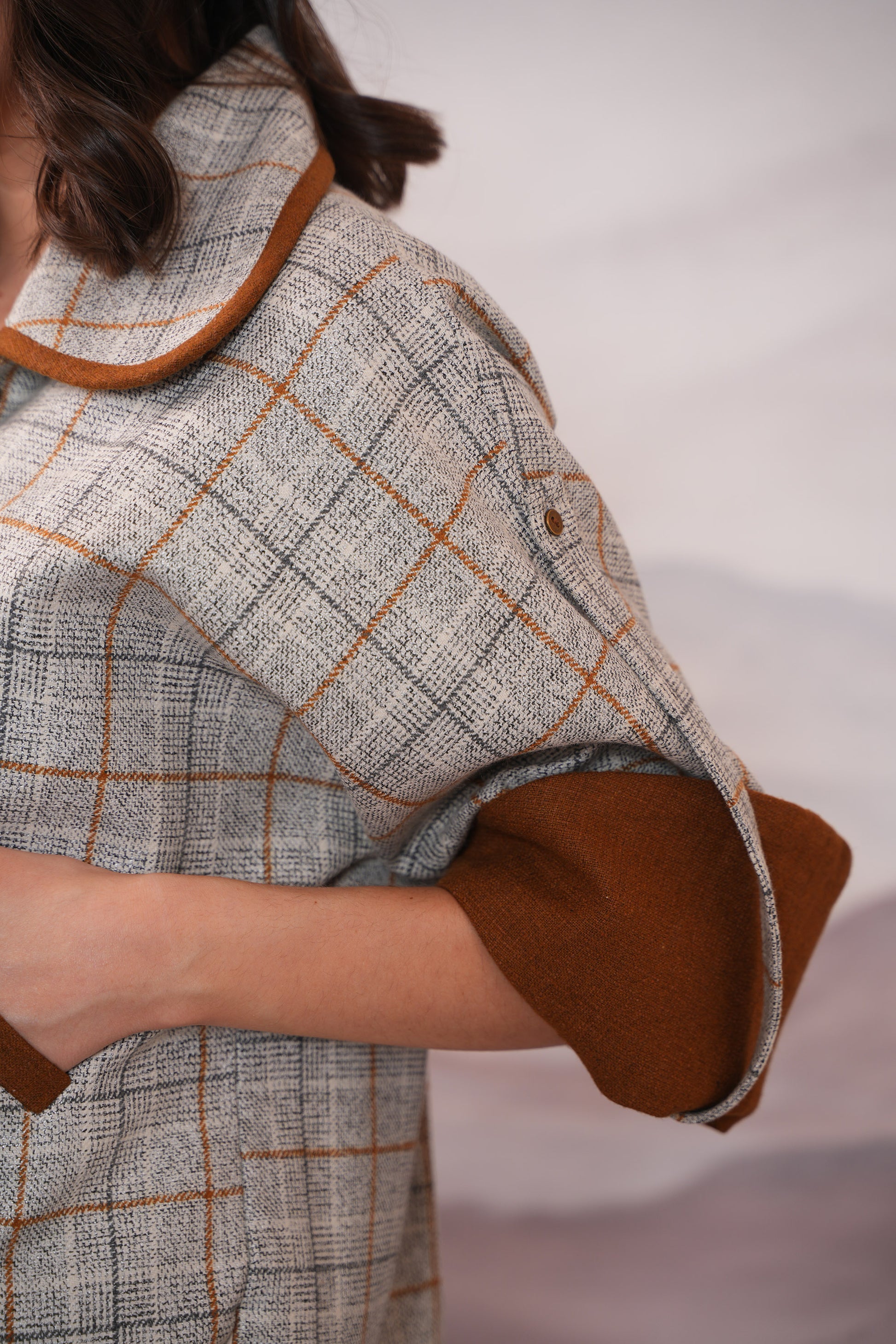 Expertly crafted from check wool fabric, the Kimono Jacket blends chic style with casual comfort. The mustard contrast detailing and metal button add a touch of sophistication, while the back gathers and round sleeves provide a stunning silhouette. Elevate your wardrobe with this must-have piece.