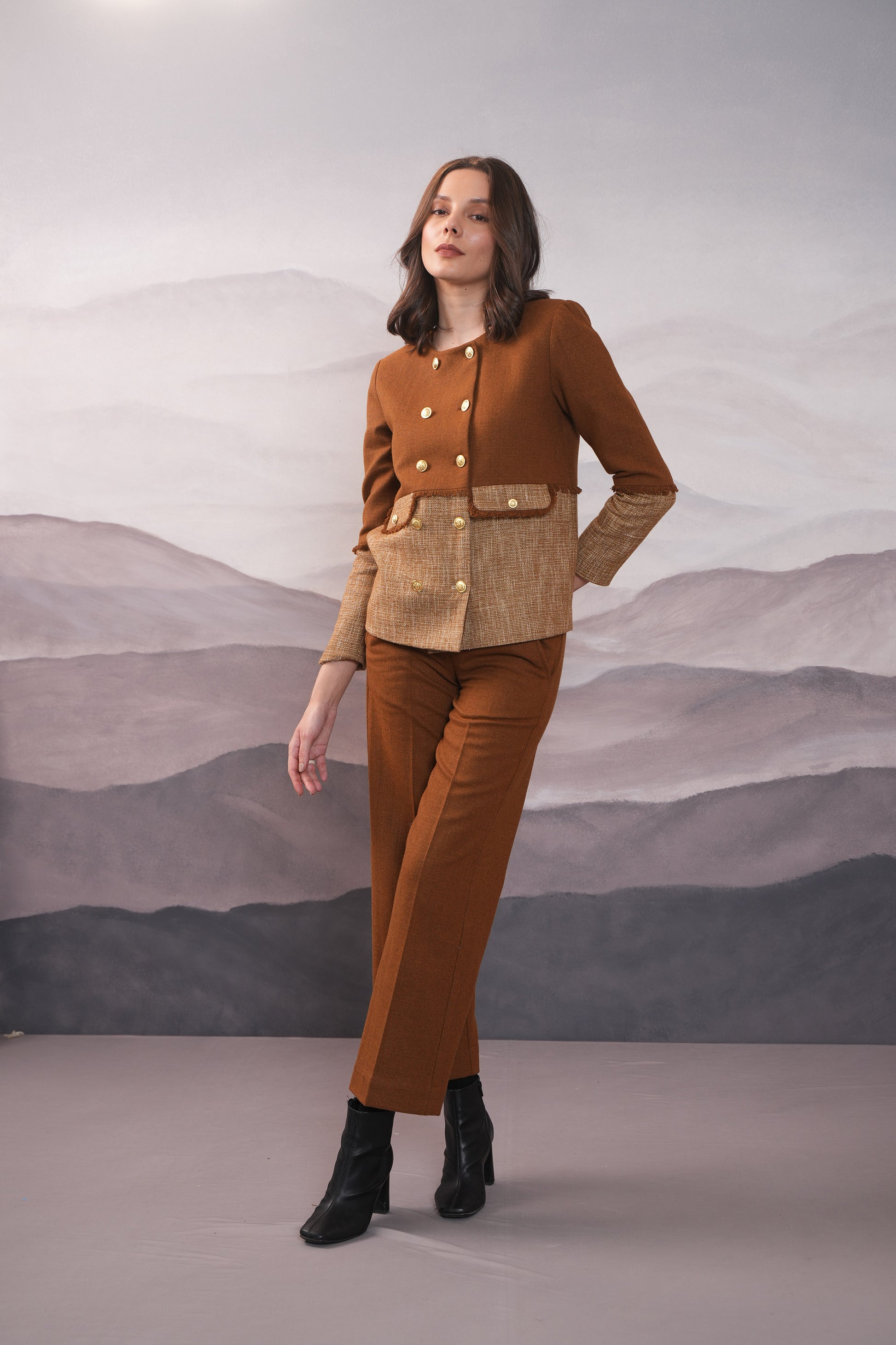Elevate your style with our mustard Half n Half Coat. Crafted from a luxurious mustard and light mustard tweed fabric, this double breasted coat features chic golden buttons and fray detailing for a sophisticated touch. The flaps add an extra element of elegance, while the smart silhouette and buttoned sleeves make it perfect for any occasion. Upgrade your wardrobe today. The set comes with half lined woollen trousers