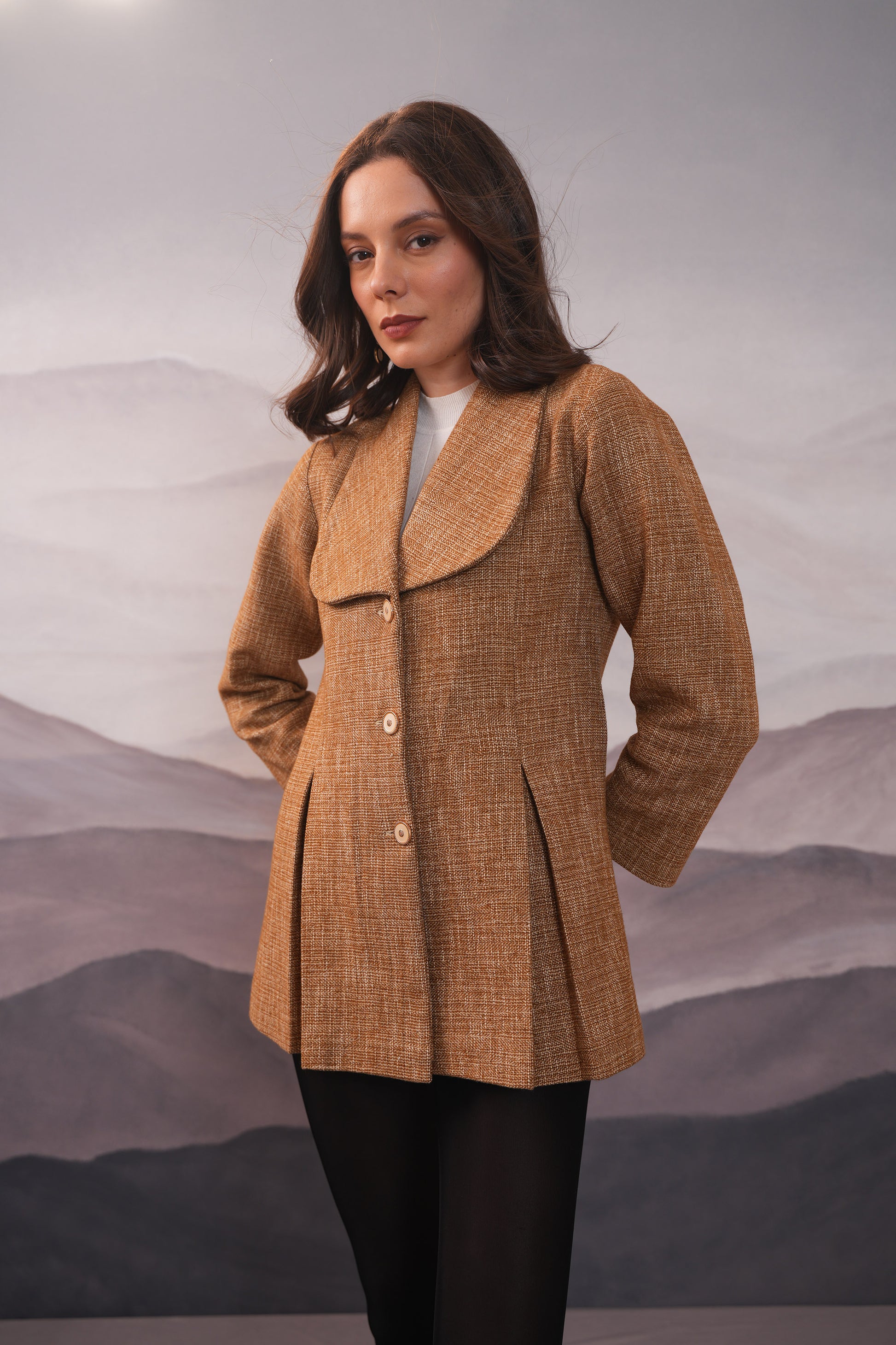 Crafted from luxurious mustard woollen fabric , this Box Pleat Wool Coat exudes class and elegance. The front box pleat and round big lapels create a feminine silhouette, while the beautiful buttons add a touch of sophistication. Stay warm and stylish all winter long with this must-have coat.