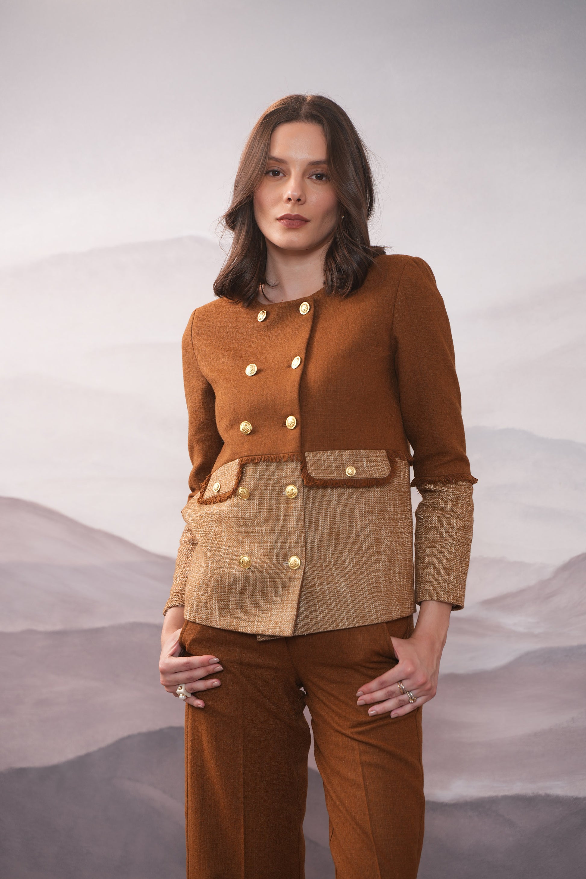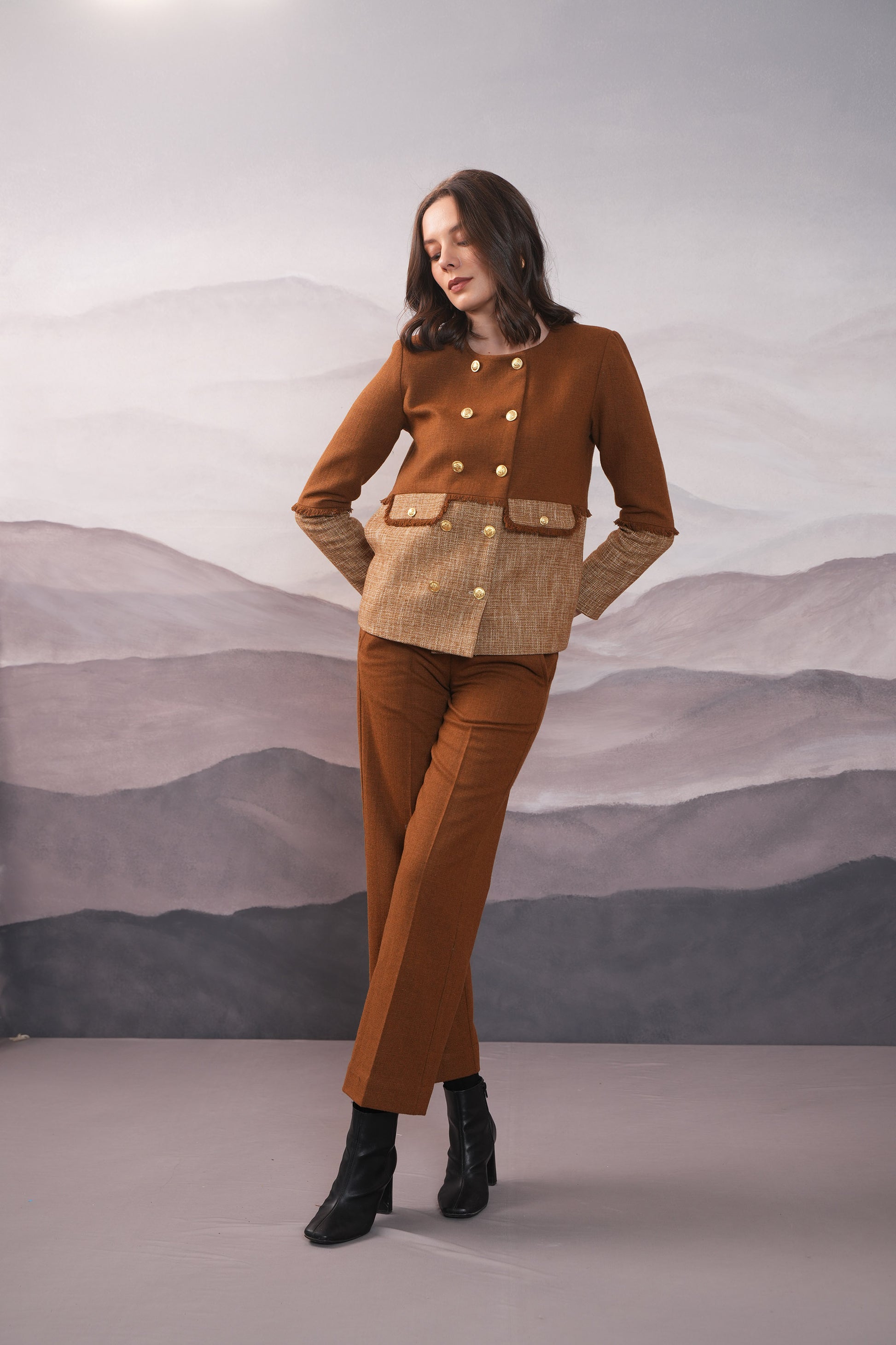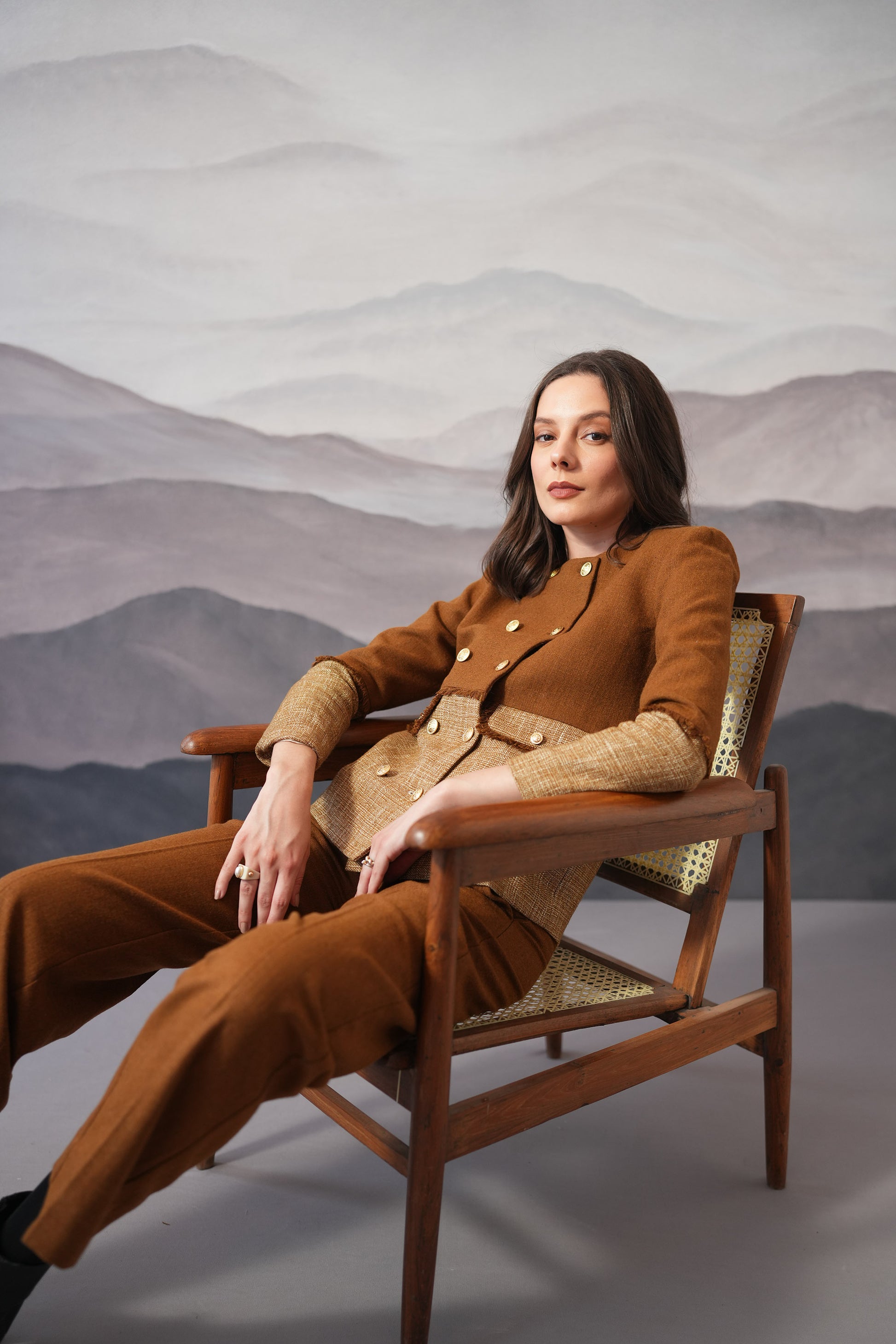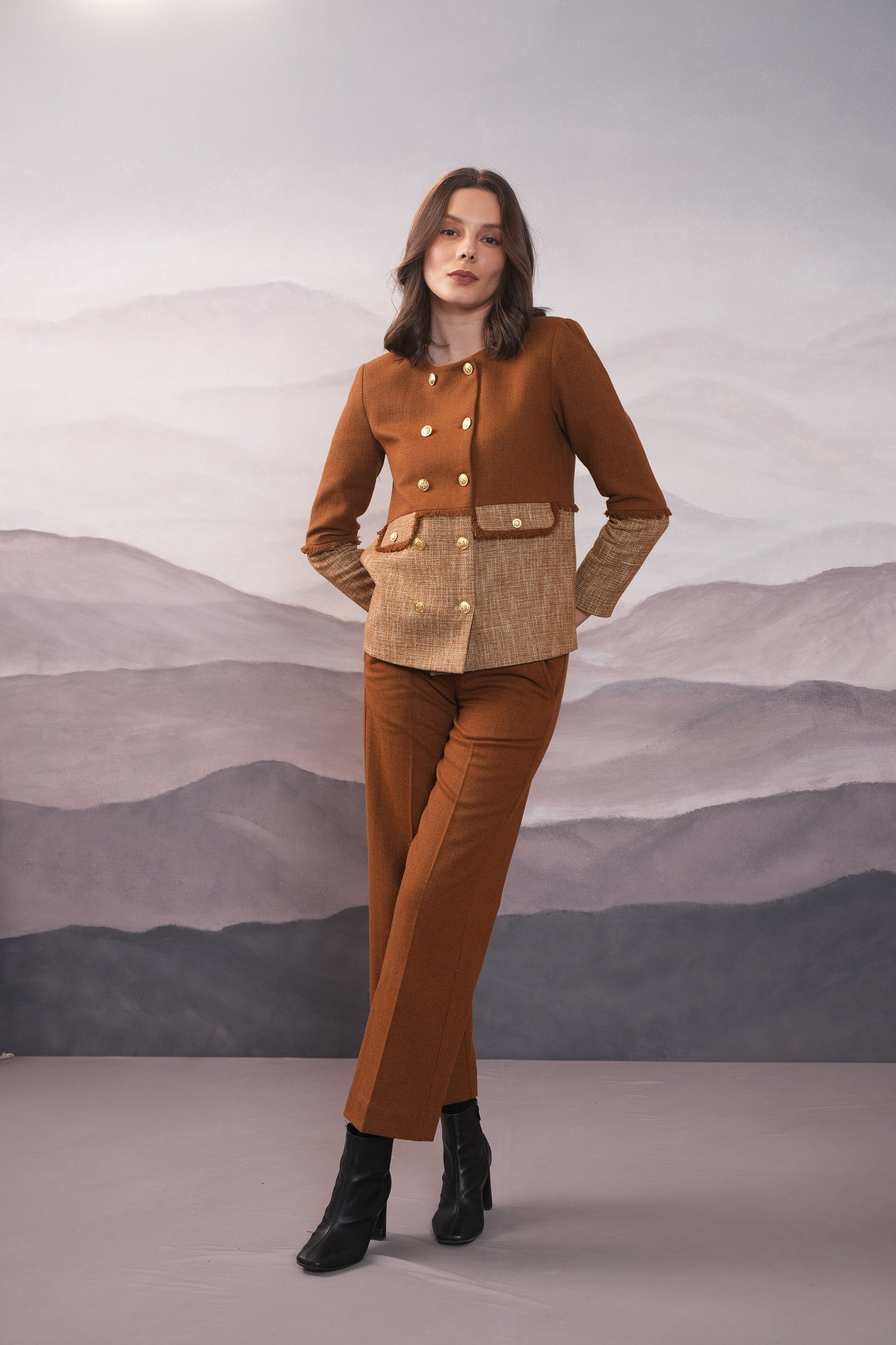 Elevate your style with our mustard 2 tone Coat. Crafted from a luxurious mustard and light mustard tweed fabric, this double breasted coat features chic golden buttons and fray detailing for a sophisticated touch. The flaps add an extra element of elegance, while the smart silhouette and buttoned sleeves make it perfect for any occasion. Upgrade your wardrobe today. The set comes with half lined woollen trousers