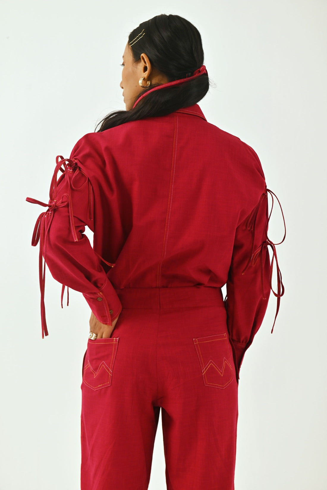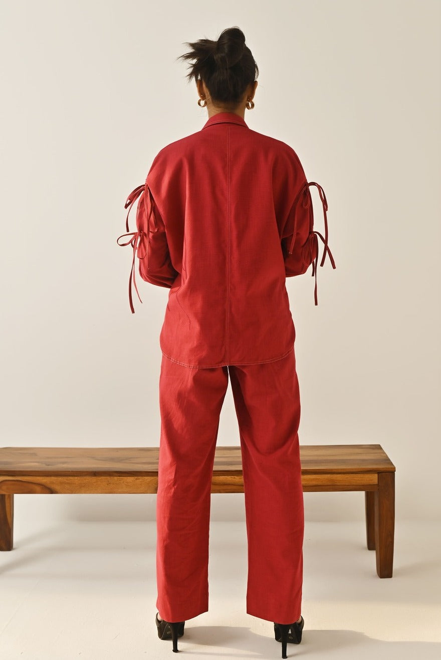 Serving elegance and style, Petunia co-ord set is crafted in cotton dobby fabric, detailed with contrasting stitches. Sleeve is decorated with our this seasons signature drawstrings. Slit pants adds grace to the outfit.