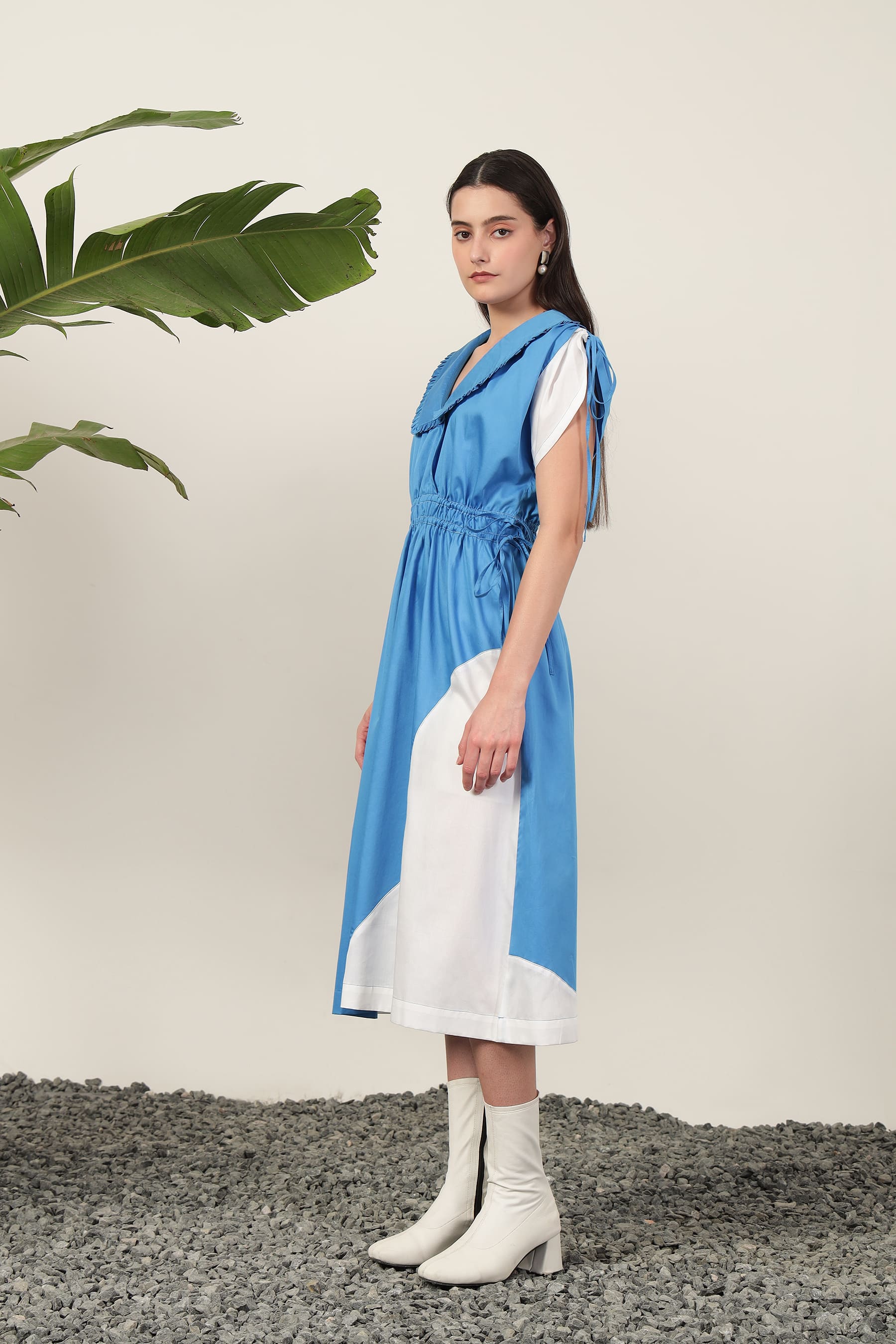 Elevate your ensemble with the Grazia Dual Dress in Blue, featuring sophisticated abstract panelling in harmonious blue and white tones. Thoughtfully designed with adjustable waist and sleeve drawstrings for a customized silhouette, this collared piece transitions effortlessly from refined brunches to vacation soirées. A masterful balance of smart and chic, it embodies understated luxury for the discerning woman.