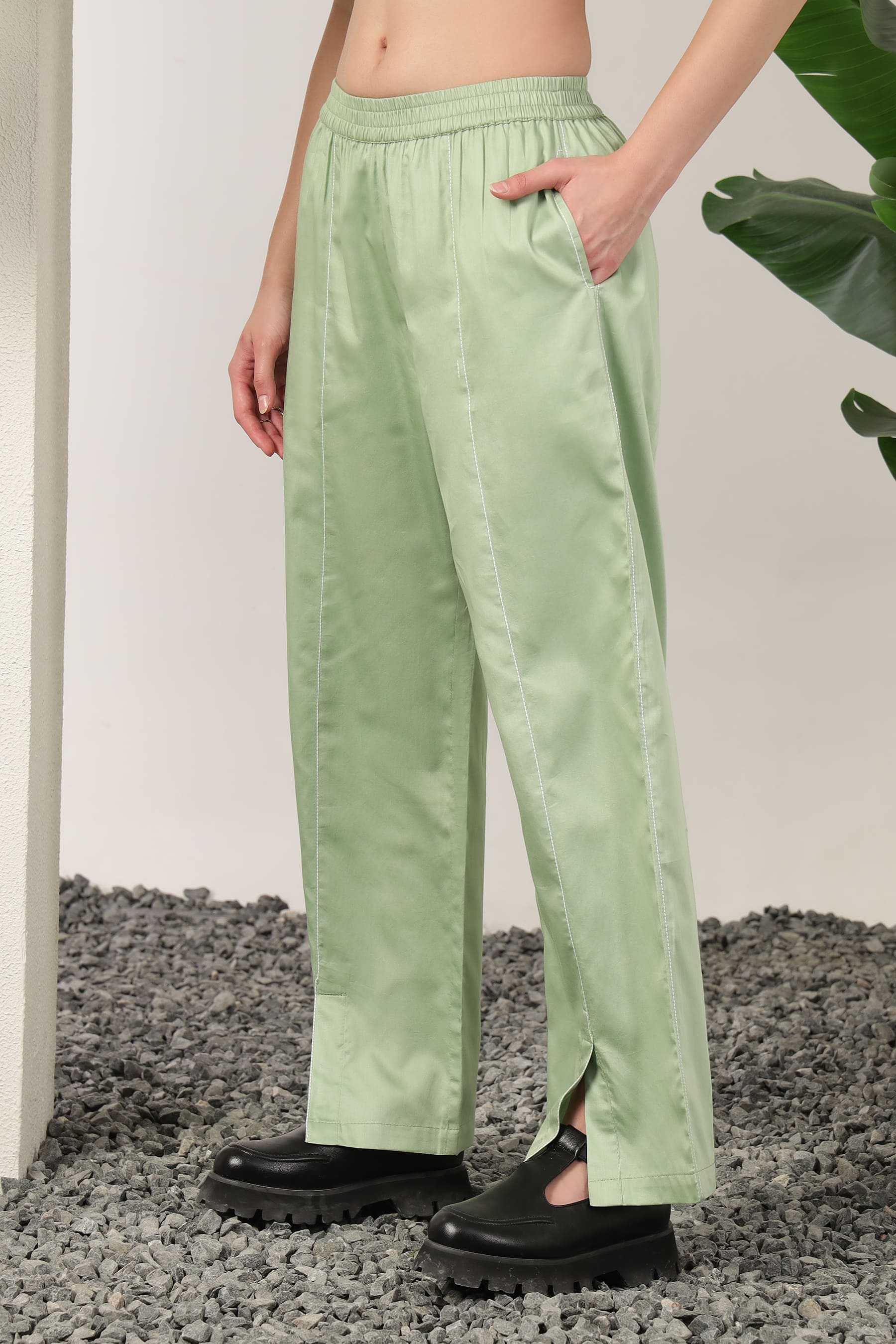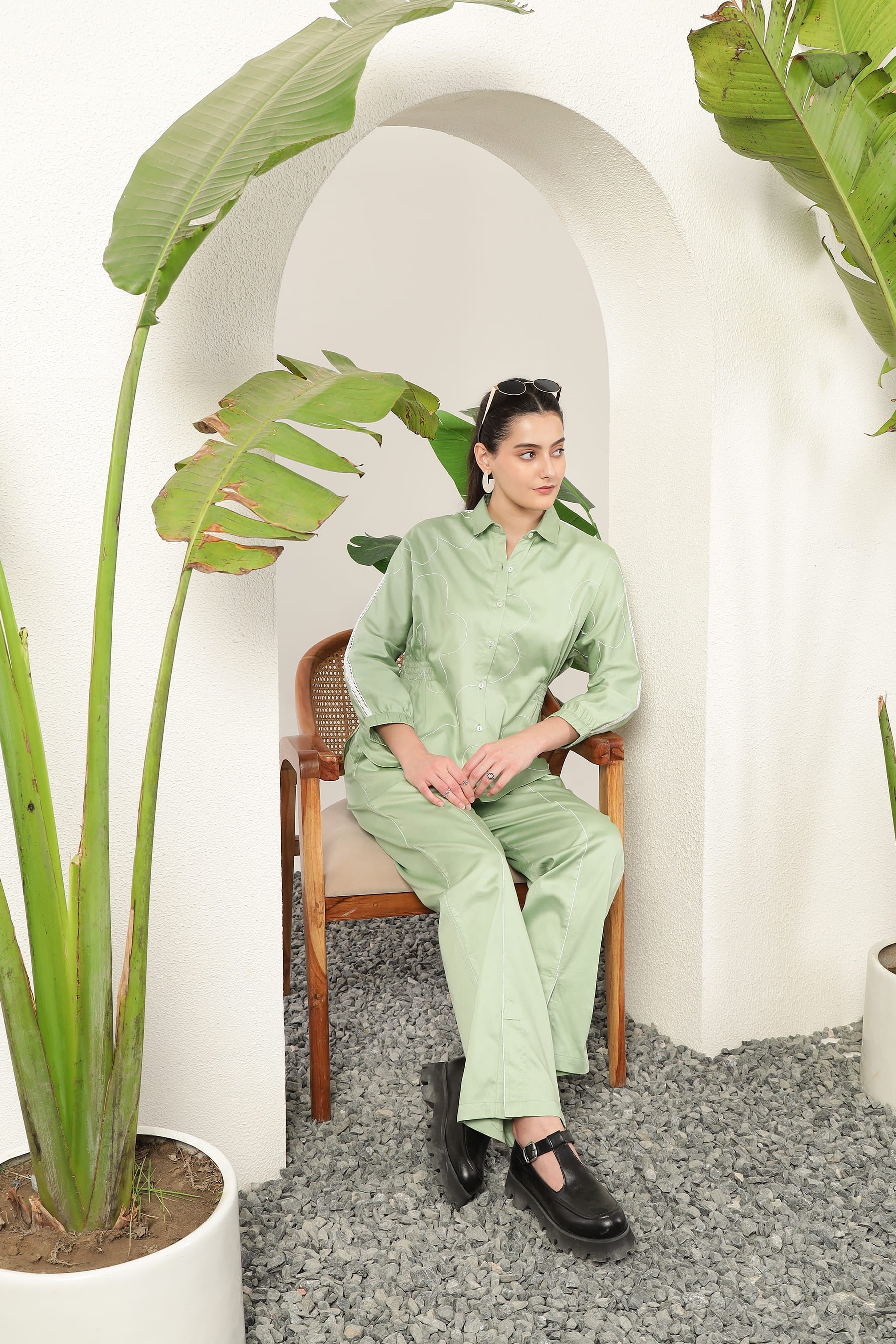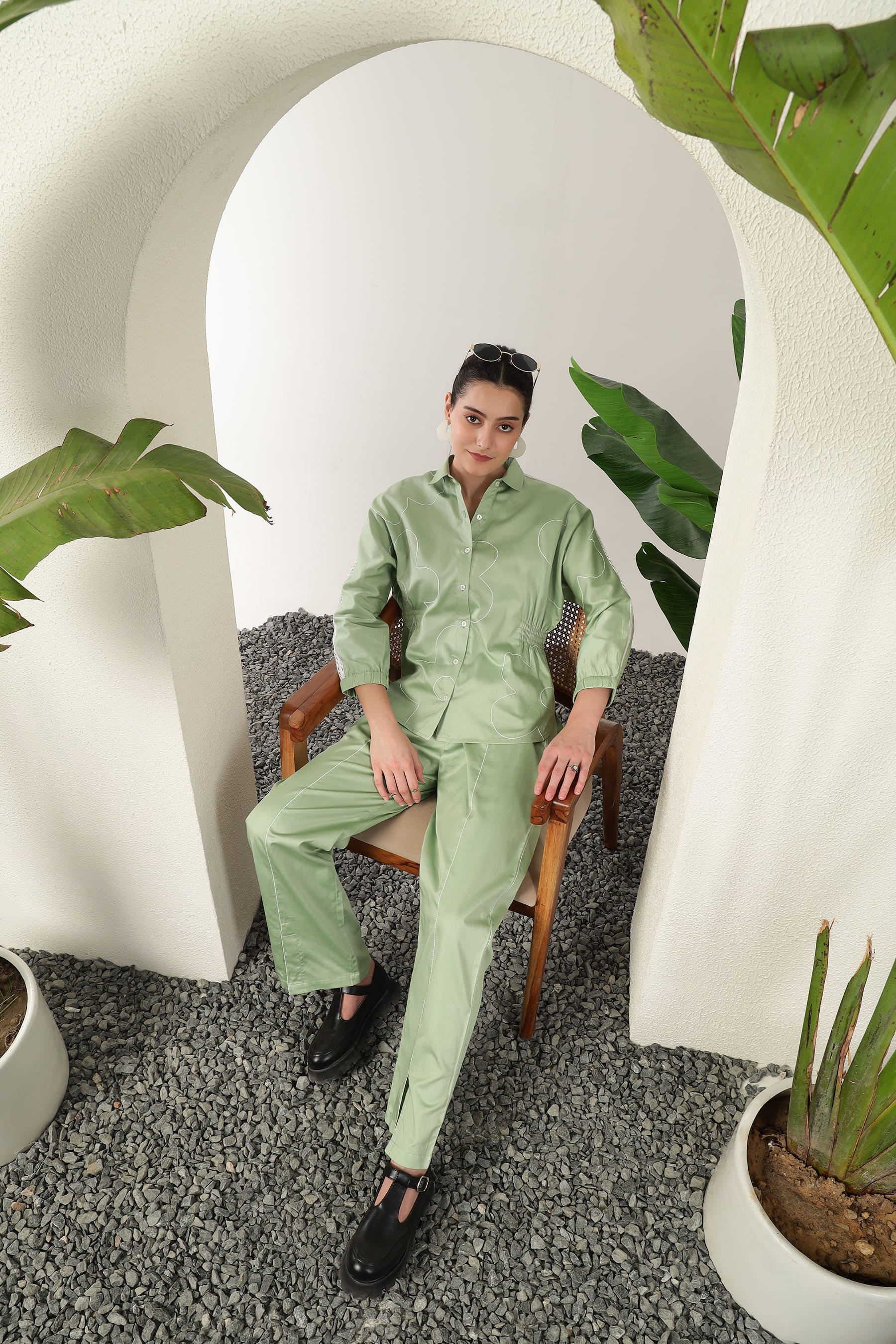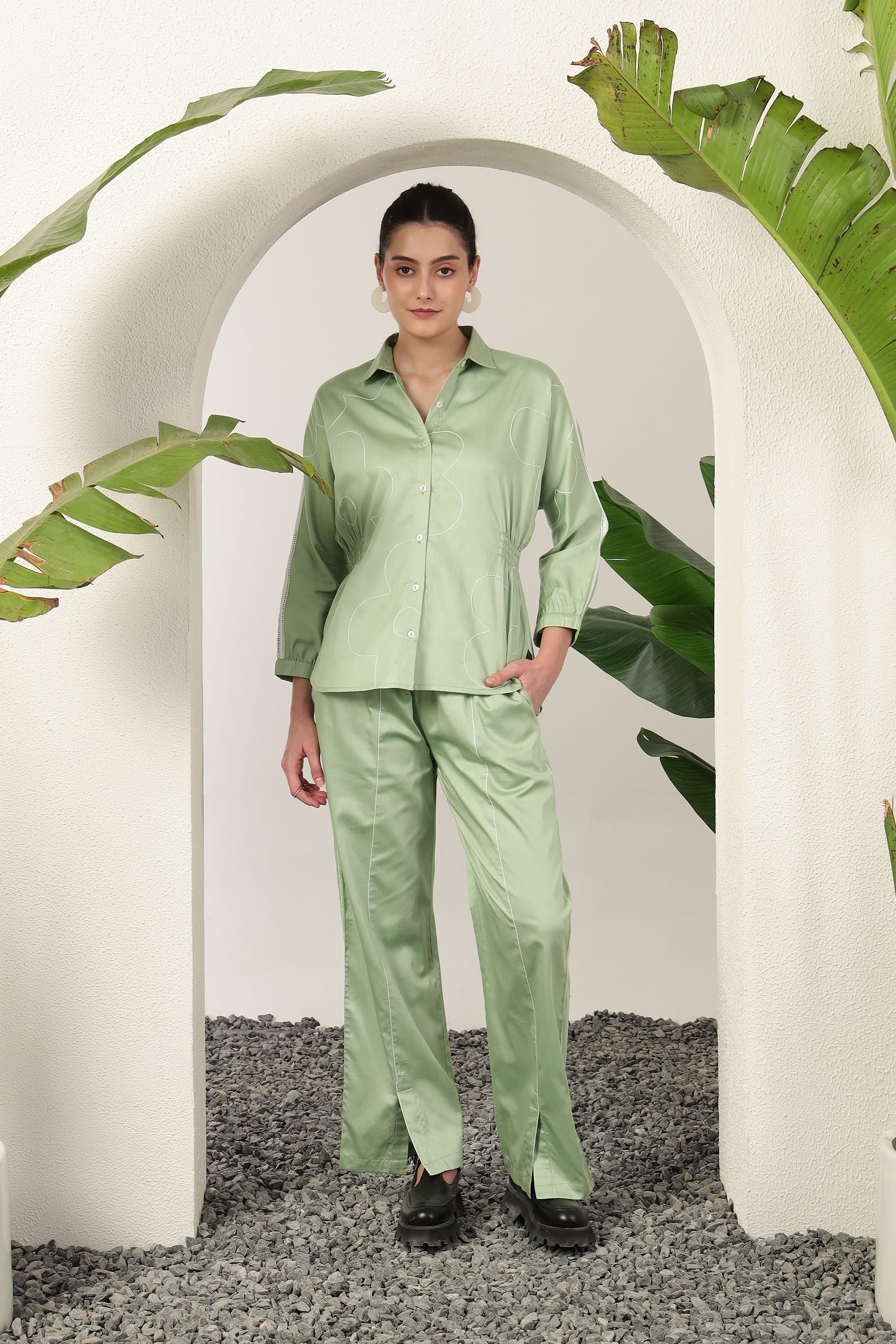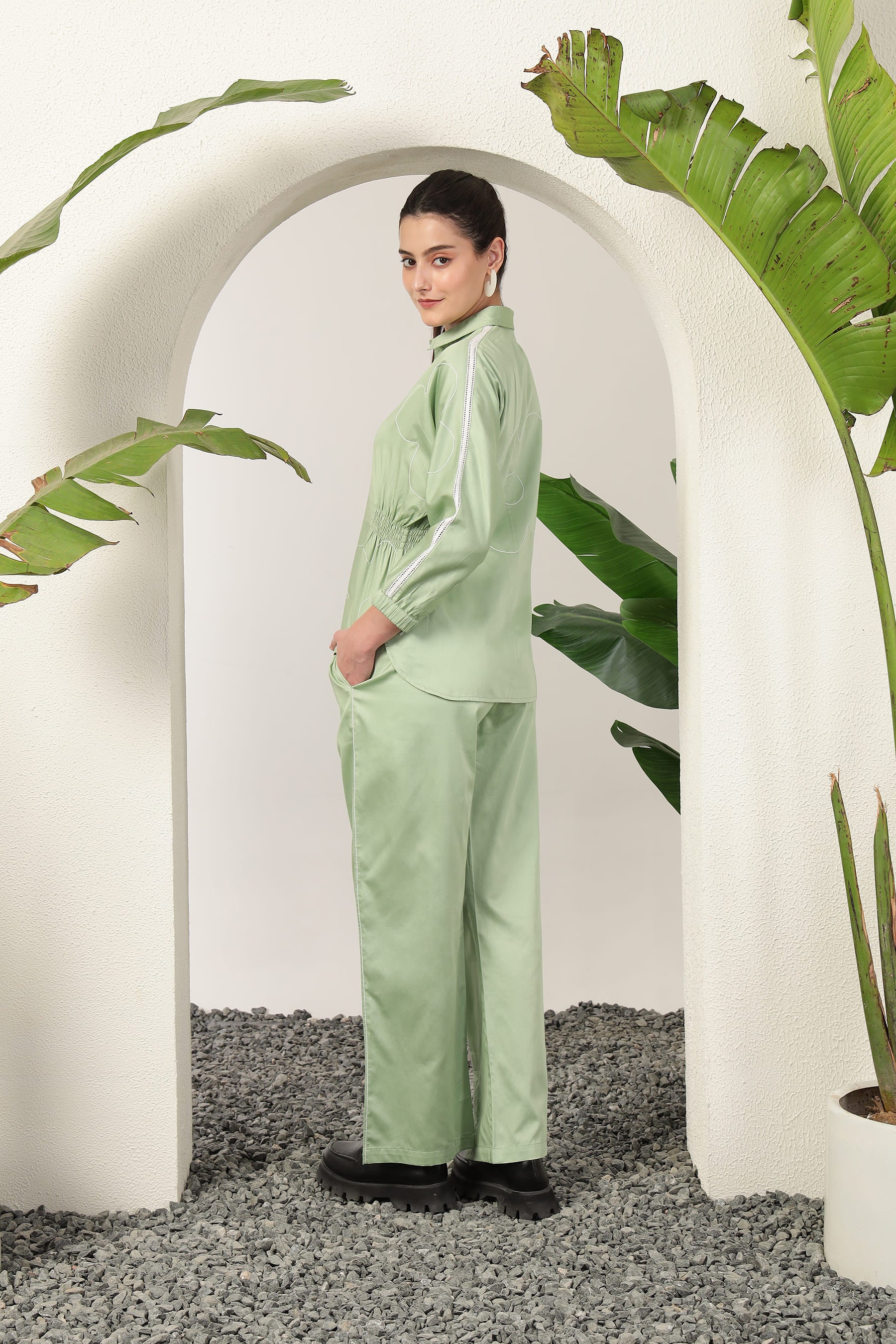 Exquisite sage green ensemble featuring delicate white thread flower line embroidery and elegant shoulder lace detailing. The chic corset design accentuates your silhouette with refined sophistication, while the accompanying elasticated pants with a tasteful front slit offer both comfort and allure. A harmonious blend of timeless craftsmanship and contemporary style.