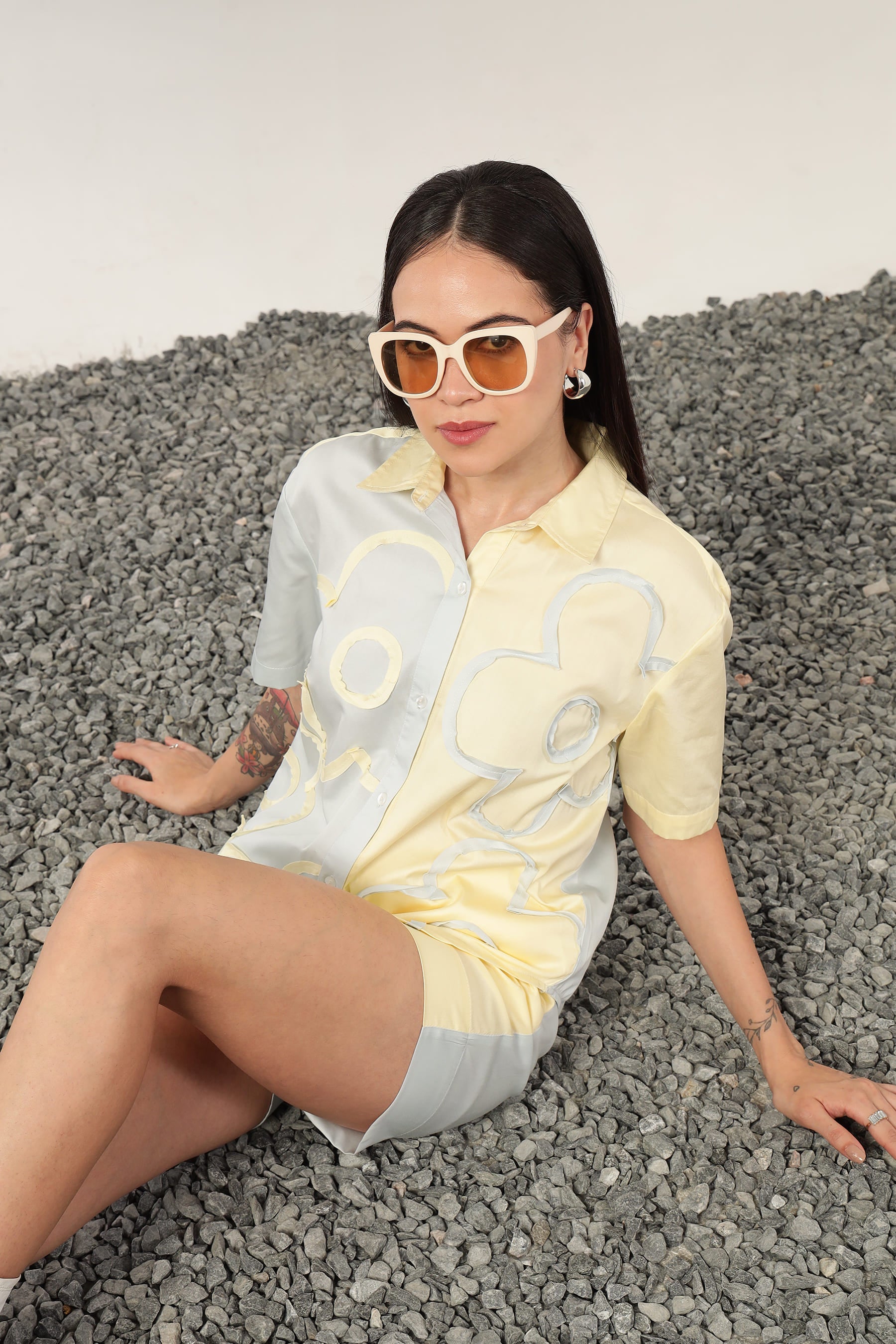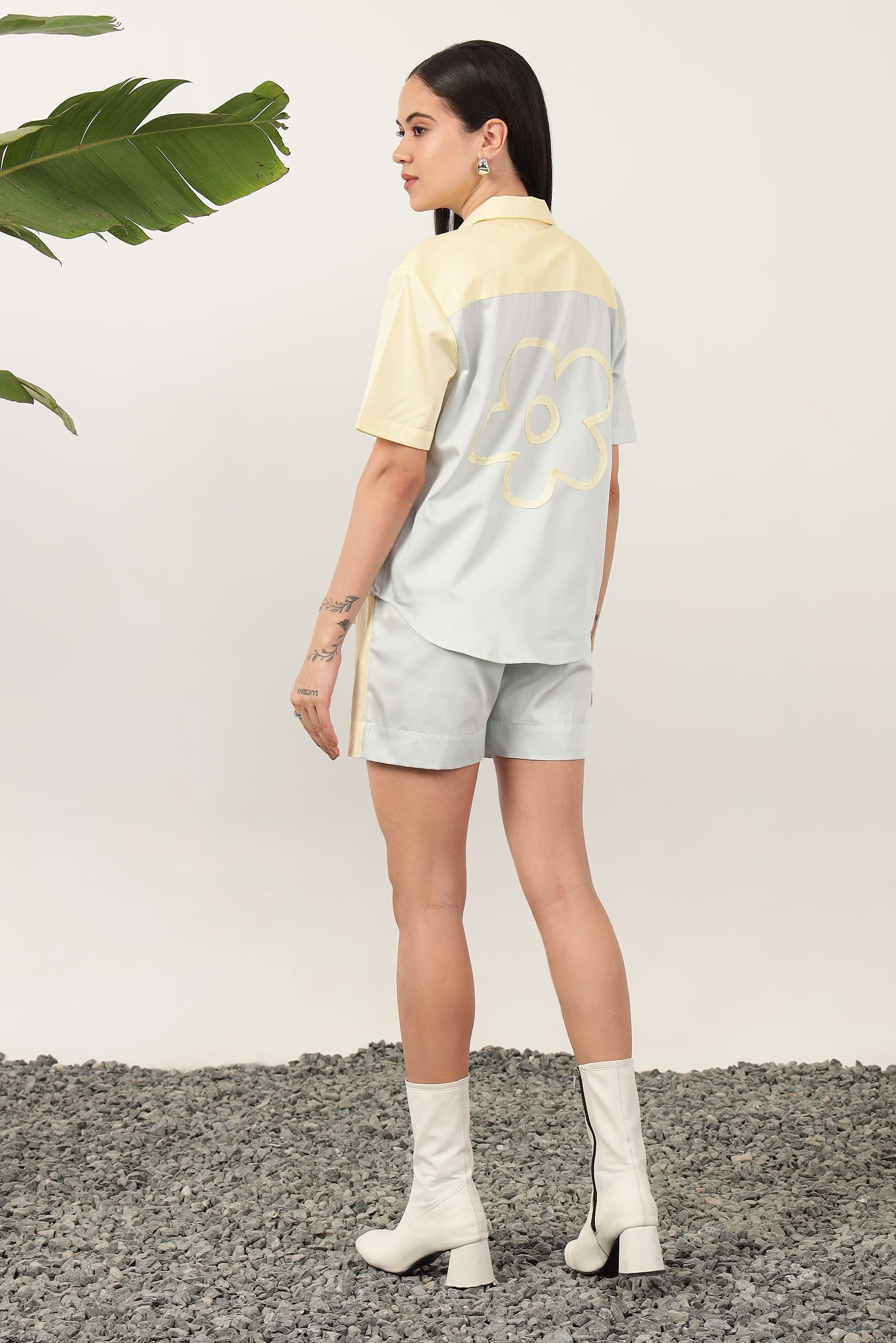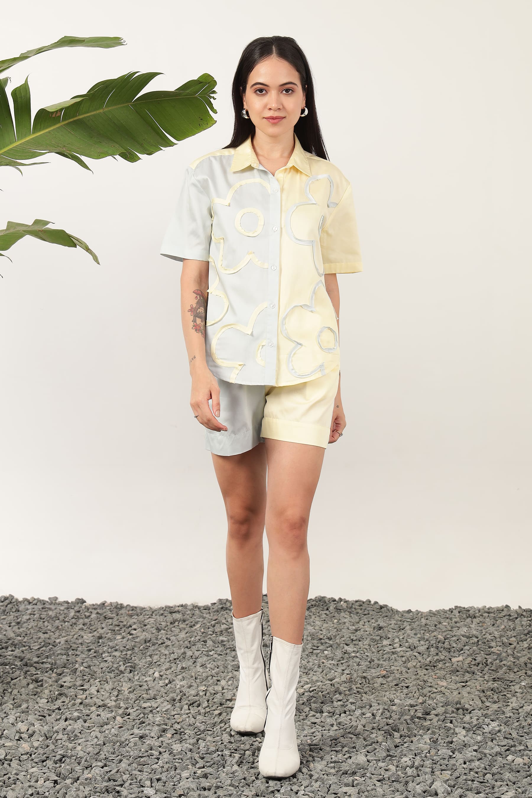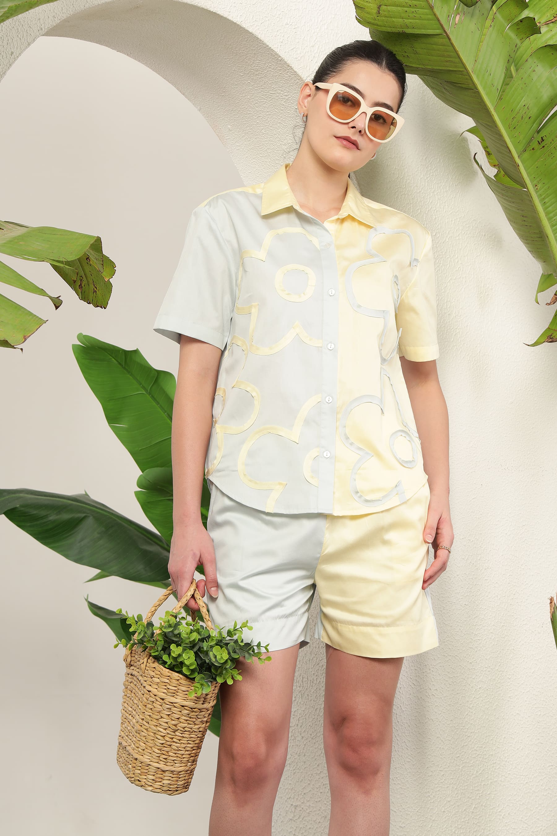 Elevate your child's vacation wardrobe with this exquisite Limon Dual Tone Cordset. The refined combination of sky blue and lemon hues creates a sophisticated aesthetic, while delicate flower appliqué work adds an artistic touch. This coordinated shirt and shorts ensemble offers both elegance and comfort, perfect for maintaining a polished appearance during warm-weather excursions.