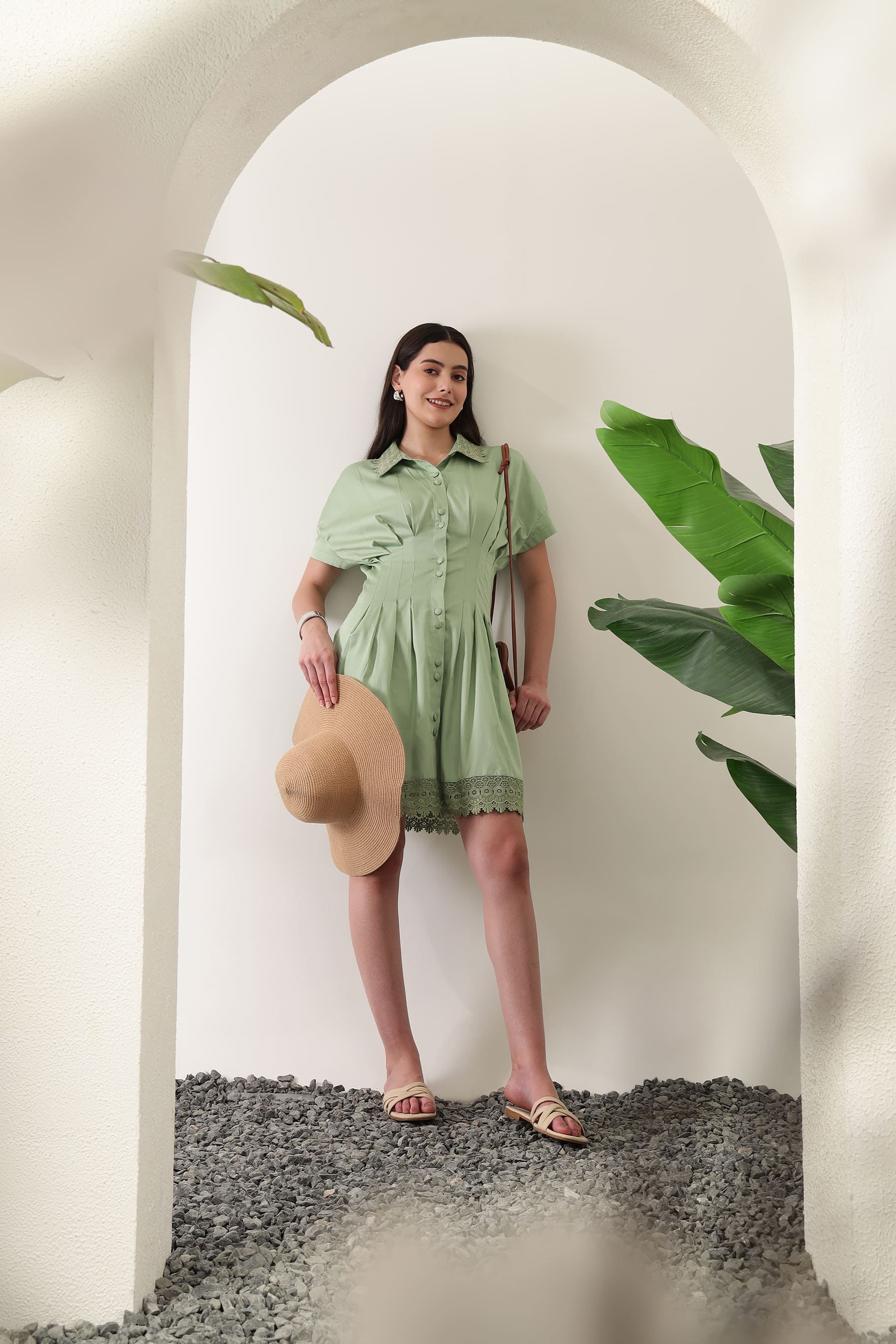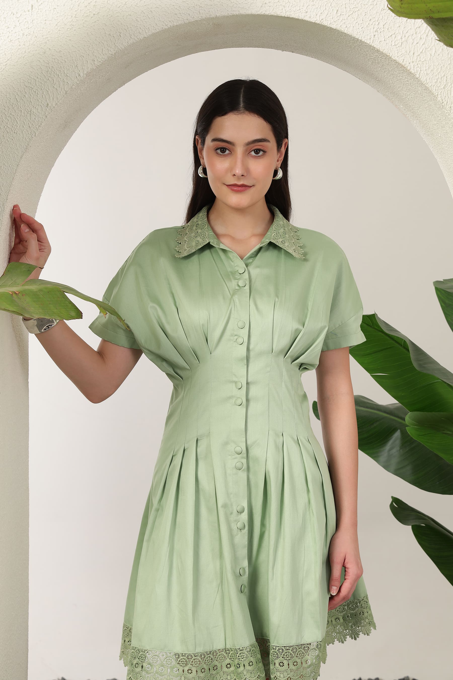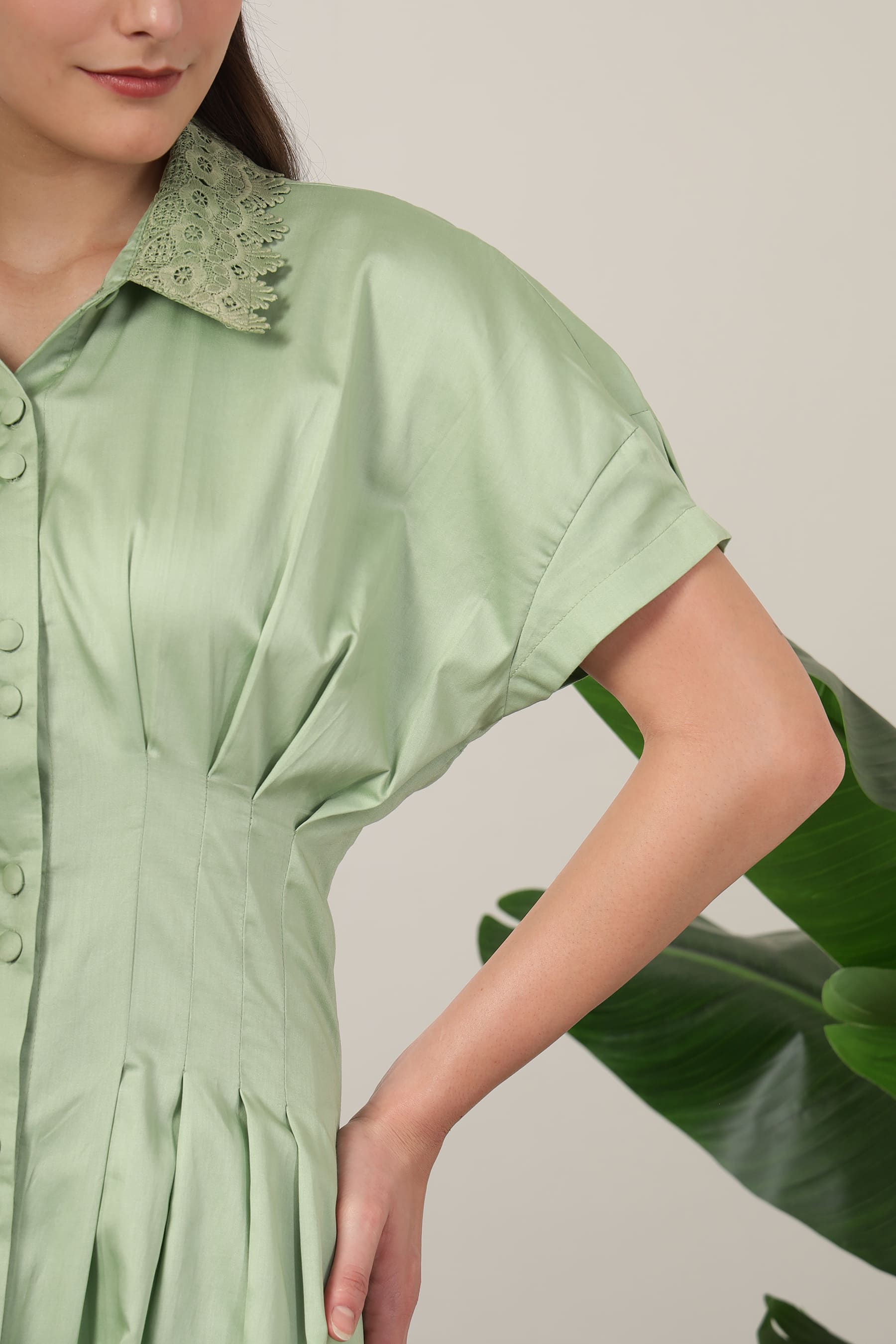 Exquisitely crafted with meticulous pleating on both front and back, the Olenna dress in sage green offers refined elegance for discerning tastes. The delicate lace detailing along the hemline provides a sophisticated finishing touch, creating a harmonious silhouette that transitions effortlessly from day to evening affairs.