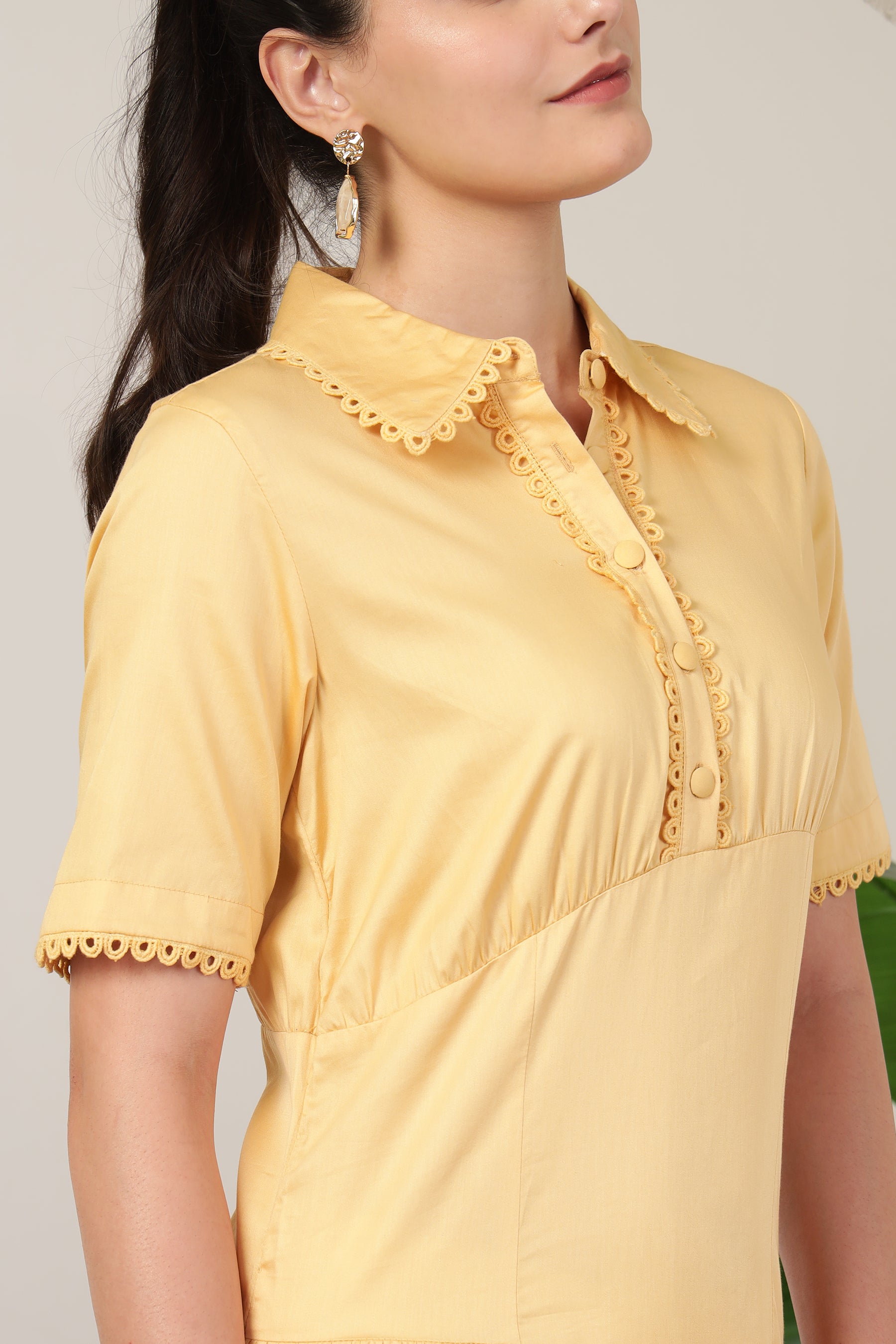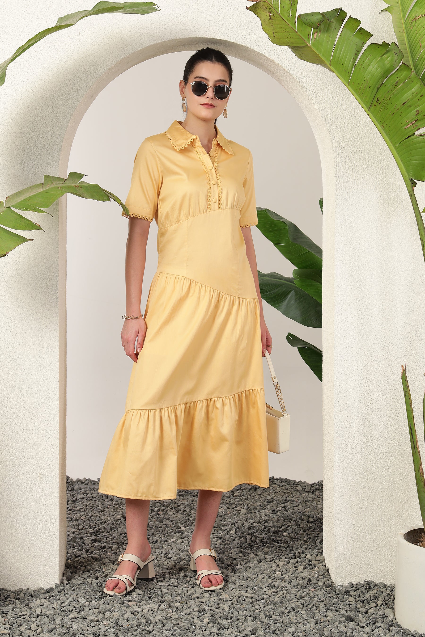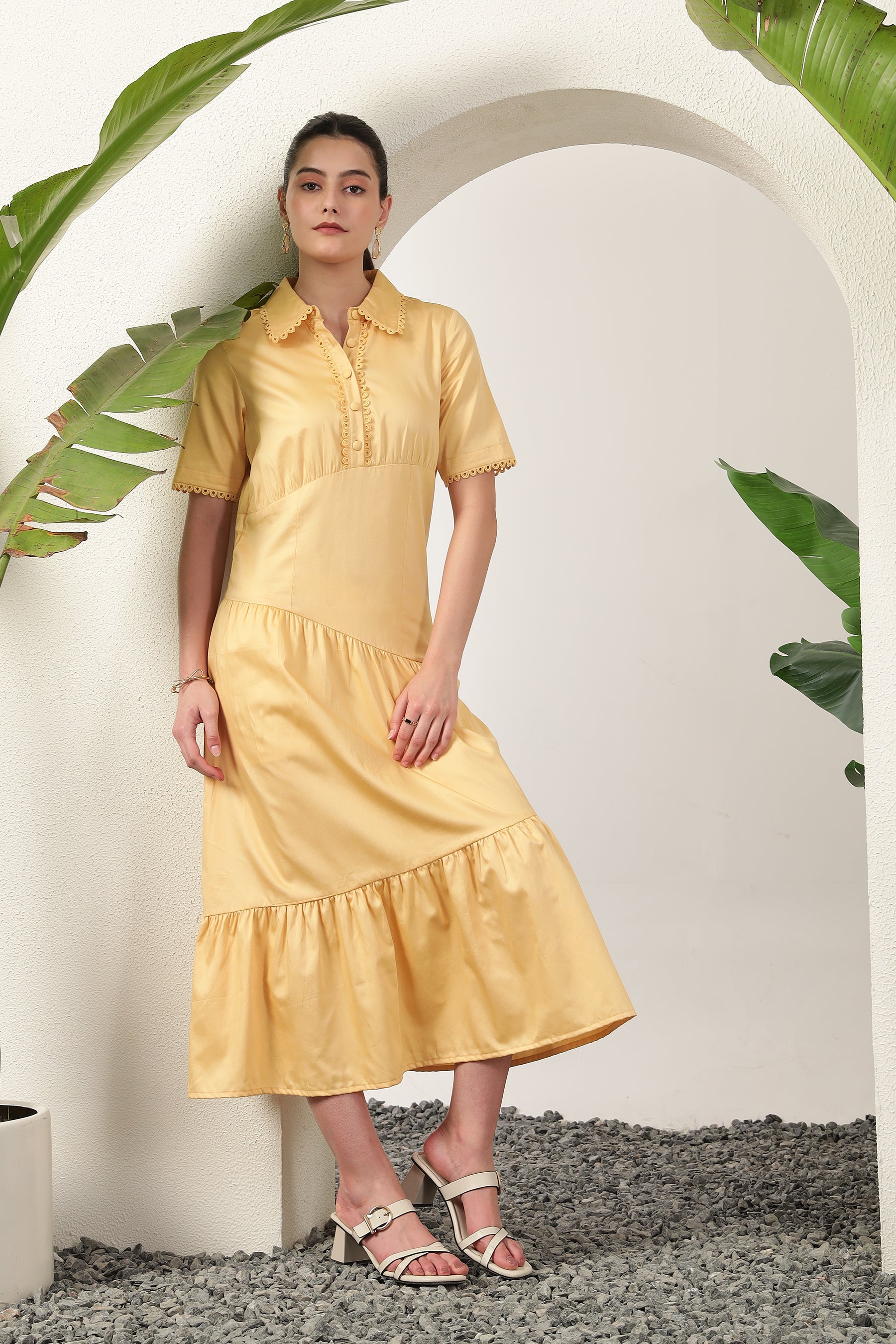 Elevate your wardrobe with the Junel Dress in butter yellow. This sophisticated silhouette features elegant panelling and thoughtful gathering that flatters your figure. Delicate monotone lace details add refined texture without overwhelming. Versatile enough to transition seamlessly from daytime brunches to evening soirées, this chic piece is an essential companion for your vacation collection or everyday elegance.