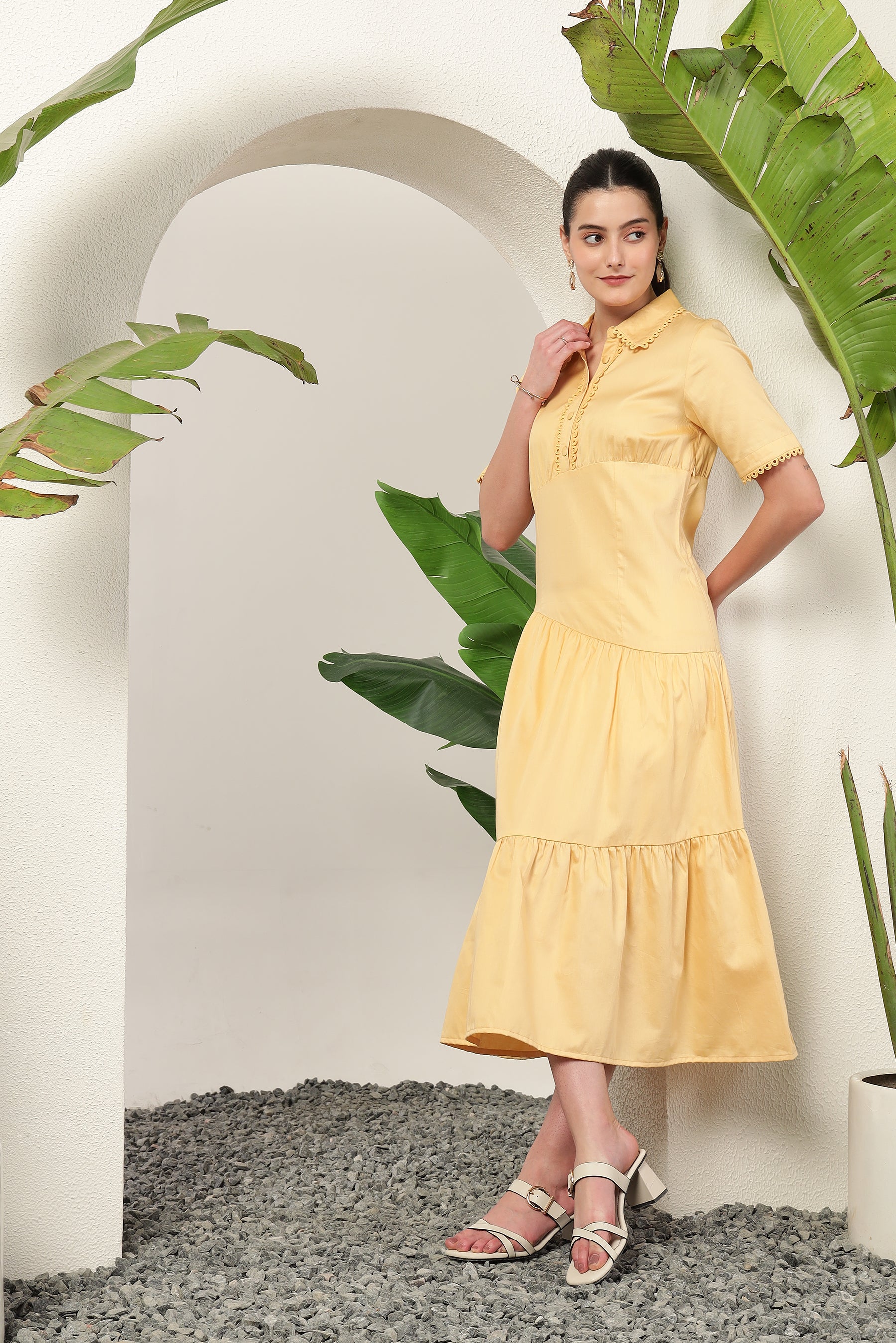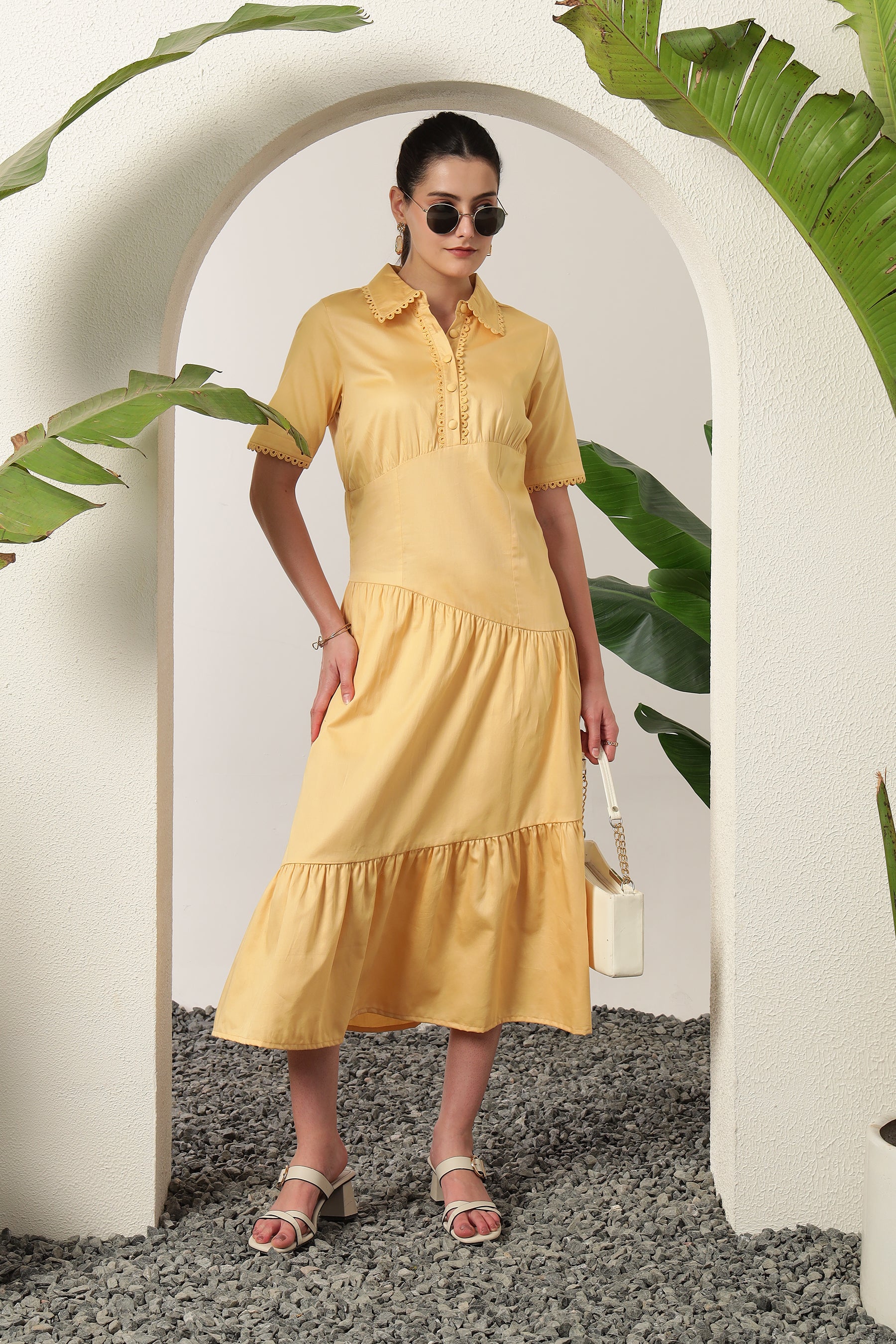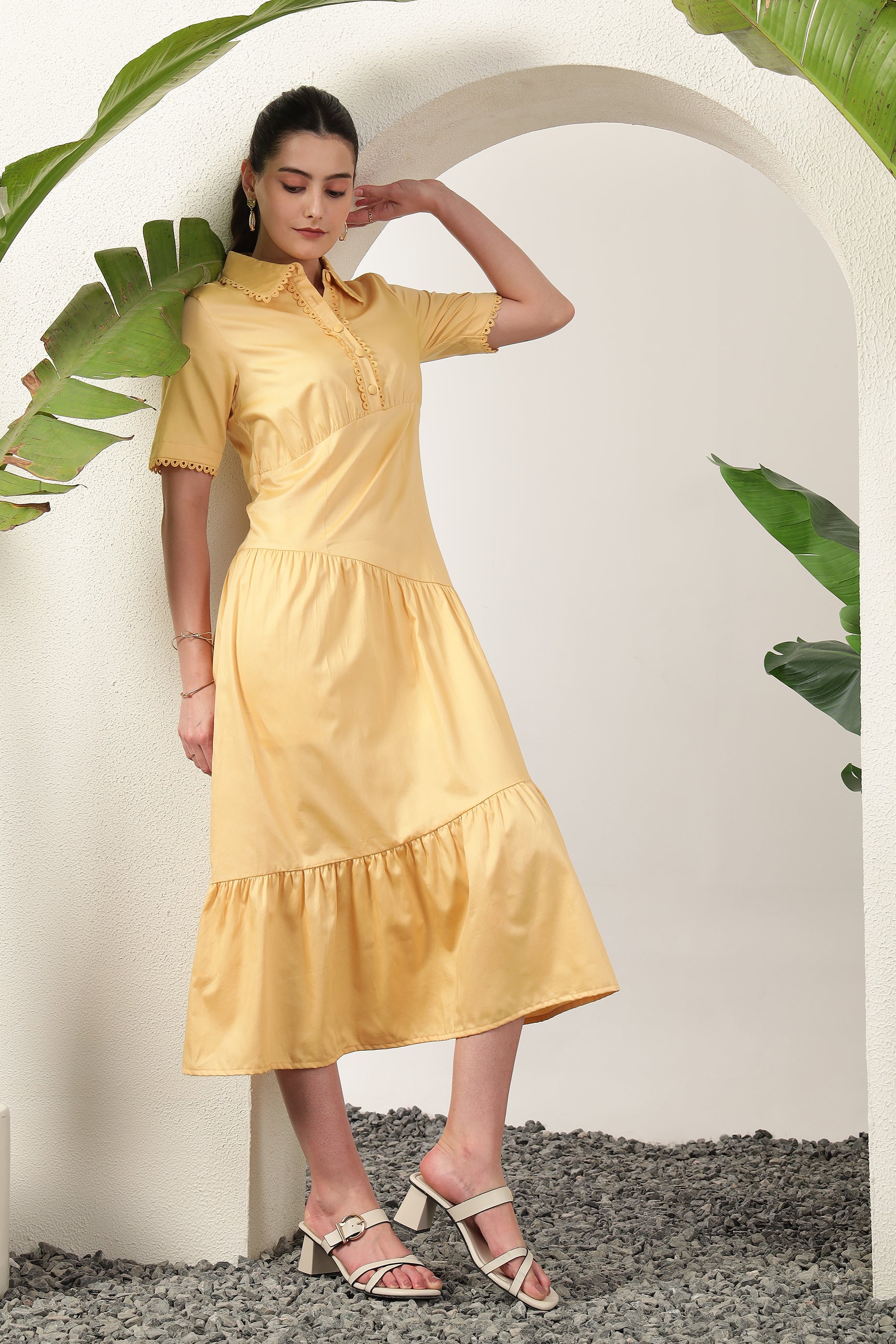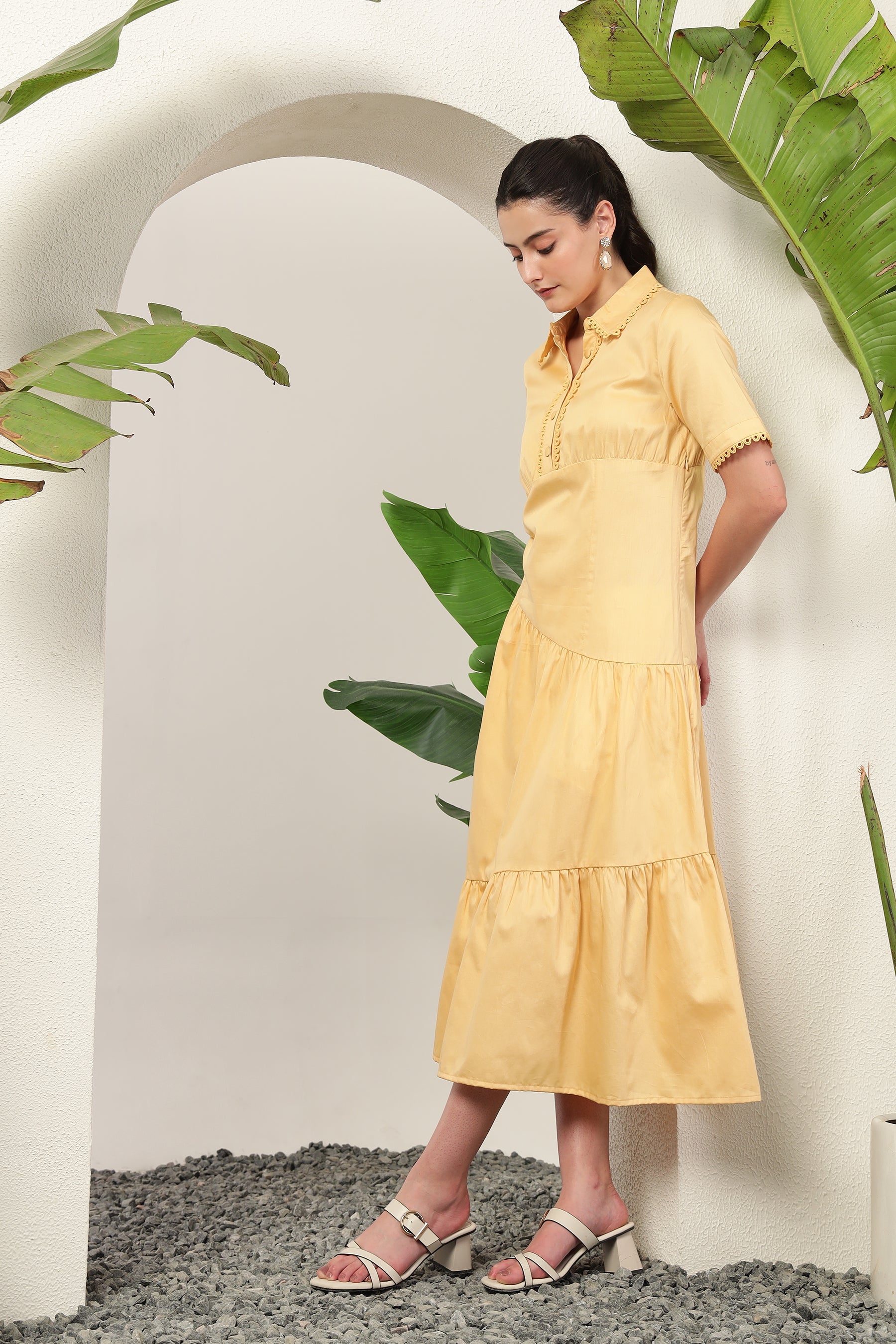 Elevate your wardrobe with the Junel Dress in butter yellow. This sophisticated silhouette features elegant panelling and thoughtful gathering that flatters your figure. Delicate monotone lace details add refined texture without overwhelming. Versatile enough to transition seamlessly from daytime brunches to evening soirées, this chic piece is an essential companion for your vacation collection or everyday elegance.