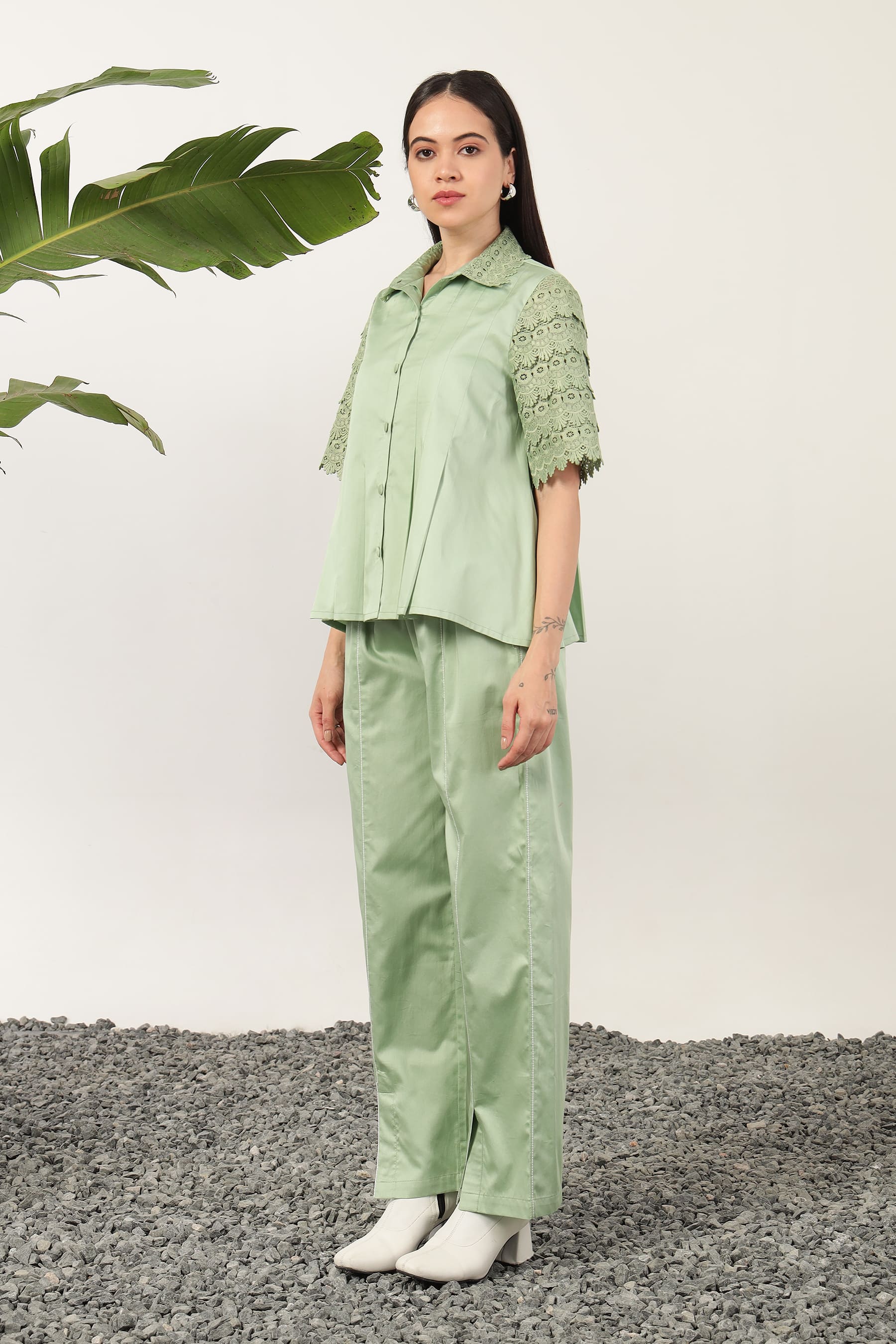 Step into effortless elegance with the Fresca Pleat Cordset – your go-to for modern sophistication. Crafted in a calming sage green hue, this set features flattering pleat detailing on both front and back, adding graceful structure to your silhouette. The delicate lace-trimmed sleeves lend a touch of femininity, while the elasticated pants promise all-day comfort without compromising on style.