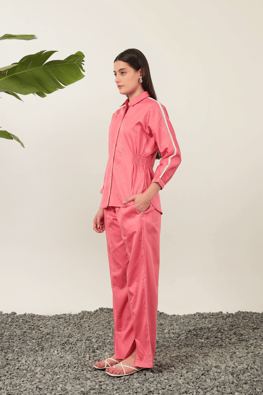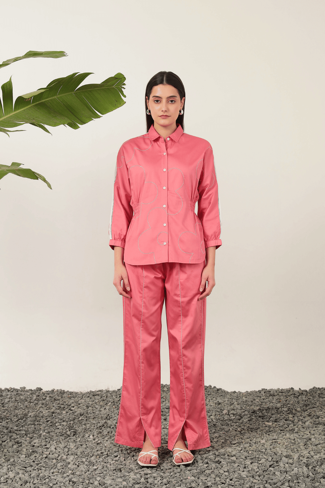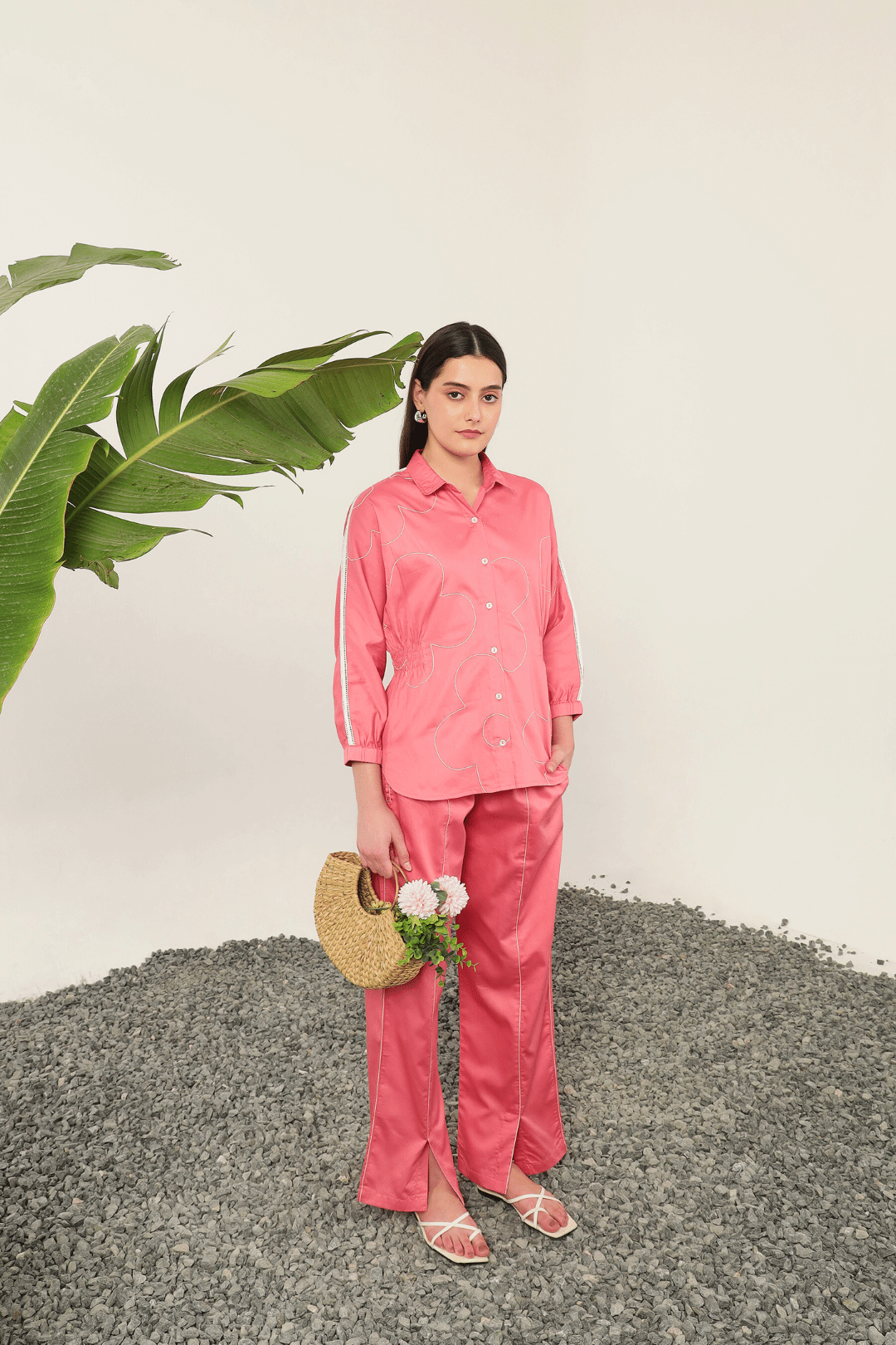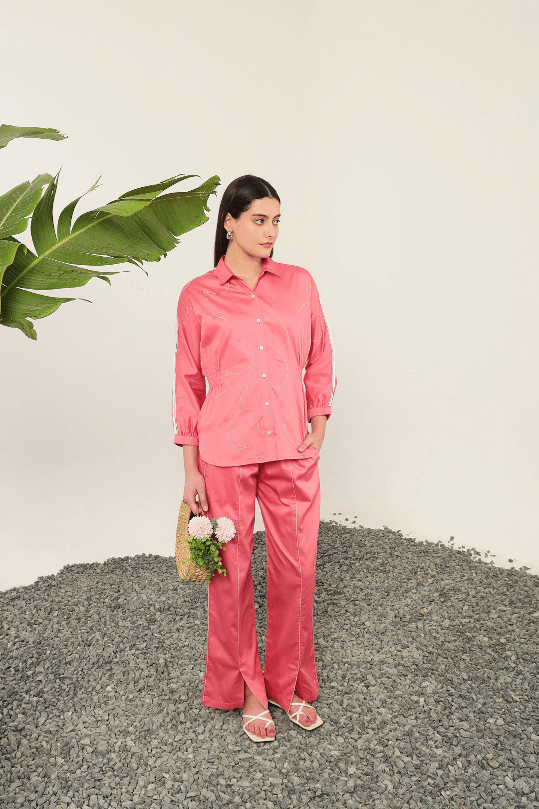 Exquisite thread embroidery adorns this sophisticated Rose Pink Roma Cordset, featuring delicate flat flower patterns and elegant lace shoulder detailing. The refined design includes a tasteful front slit and comfortable elasticated waist and shirt waist for a flattering silhouette. Finished with graceful kimono sleeves, this piece effortlessly combines timeless elegance with contemporary comfort.