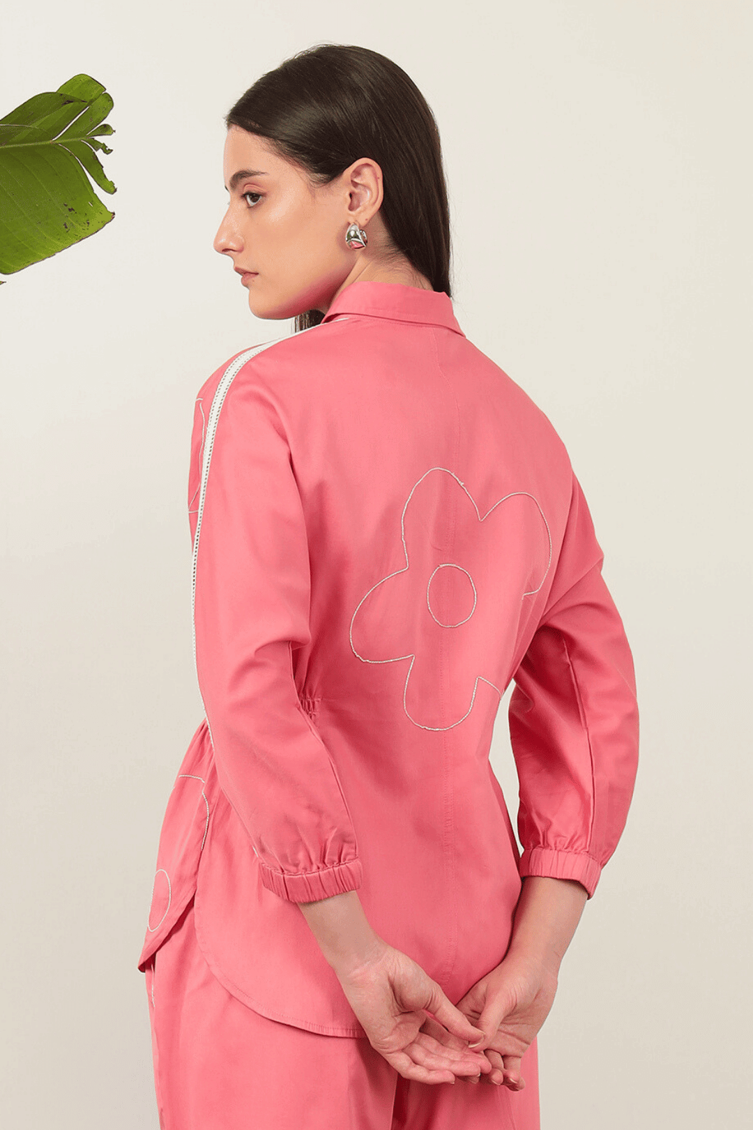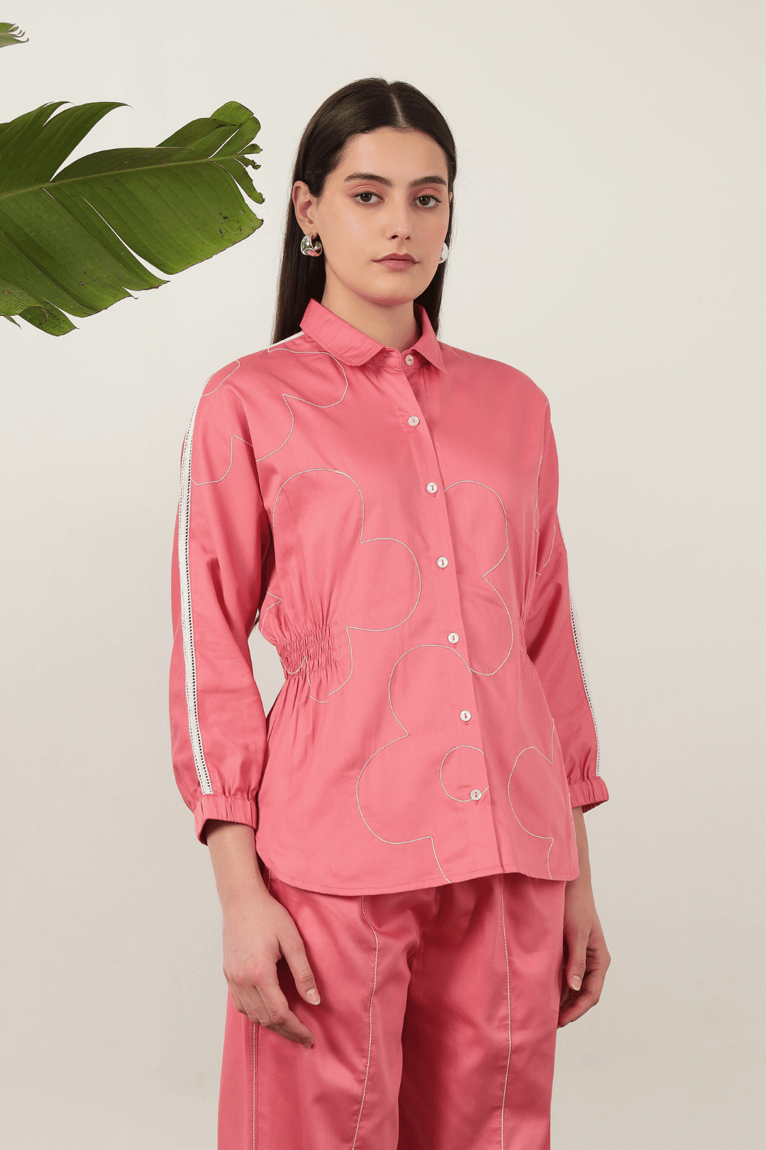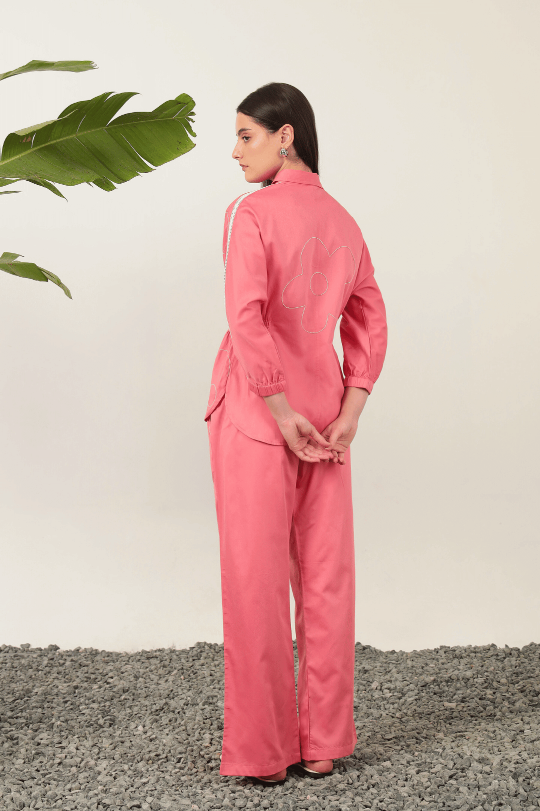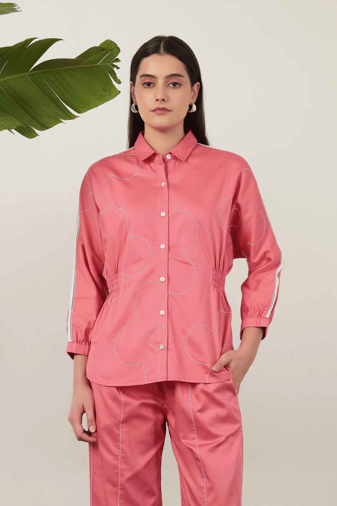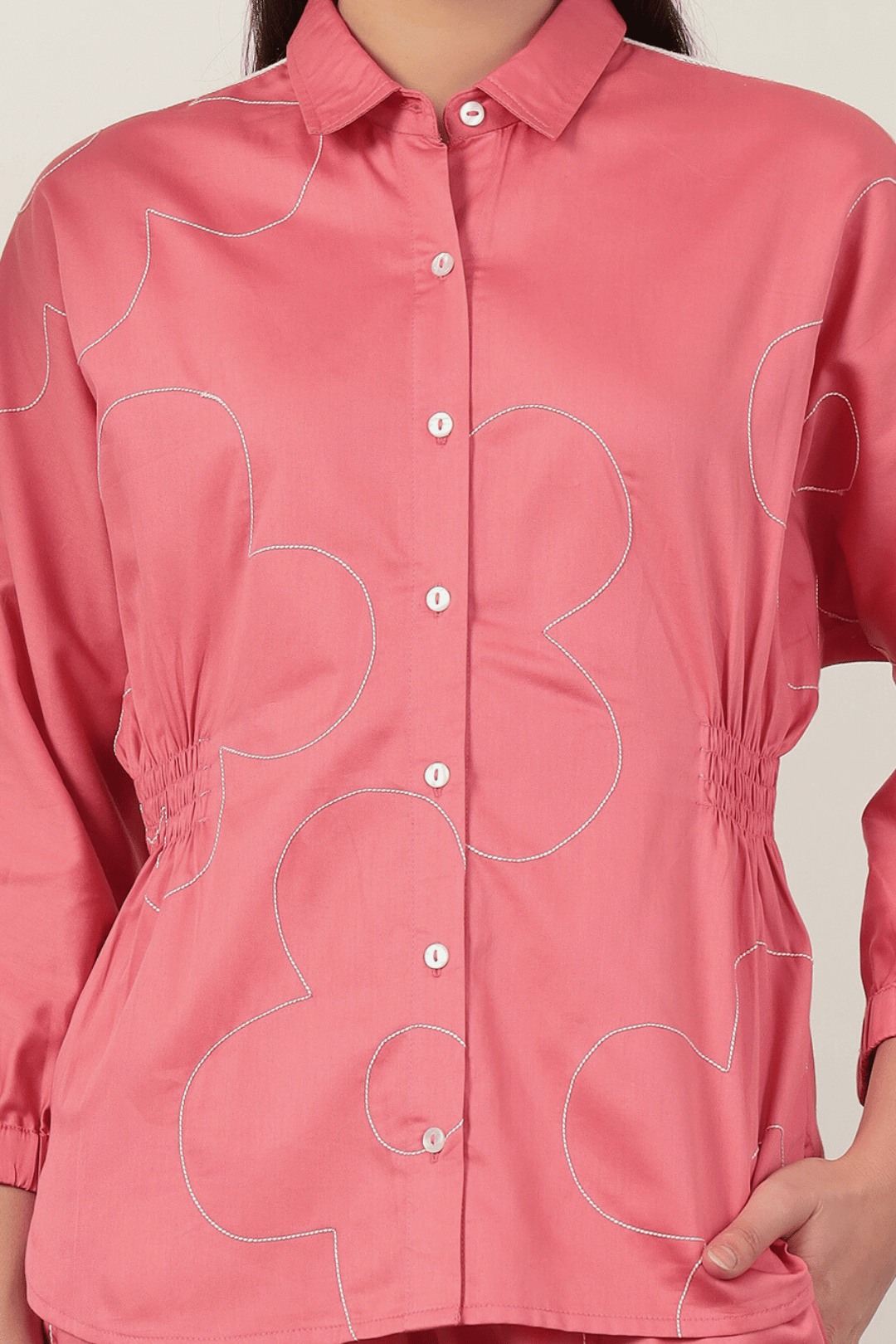Exquisite thread embroidery adorns this sophisticated Rose Pink Roma Cordset, featuring delicate flat flower patterns and elegant lace shoulder detailing. The refined design includes a tasteful front slit and comfortable elasticated waist and shirt waist for a flattering silhouette. Finished with graceful kimono sleeves, this piece effortlessly combines timeless elegance with contemporary comfort.