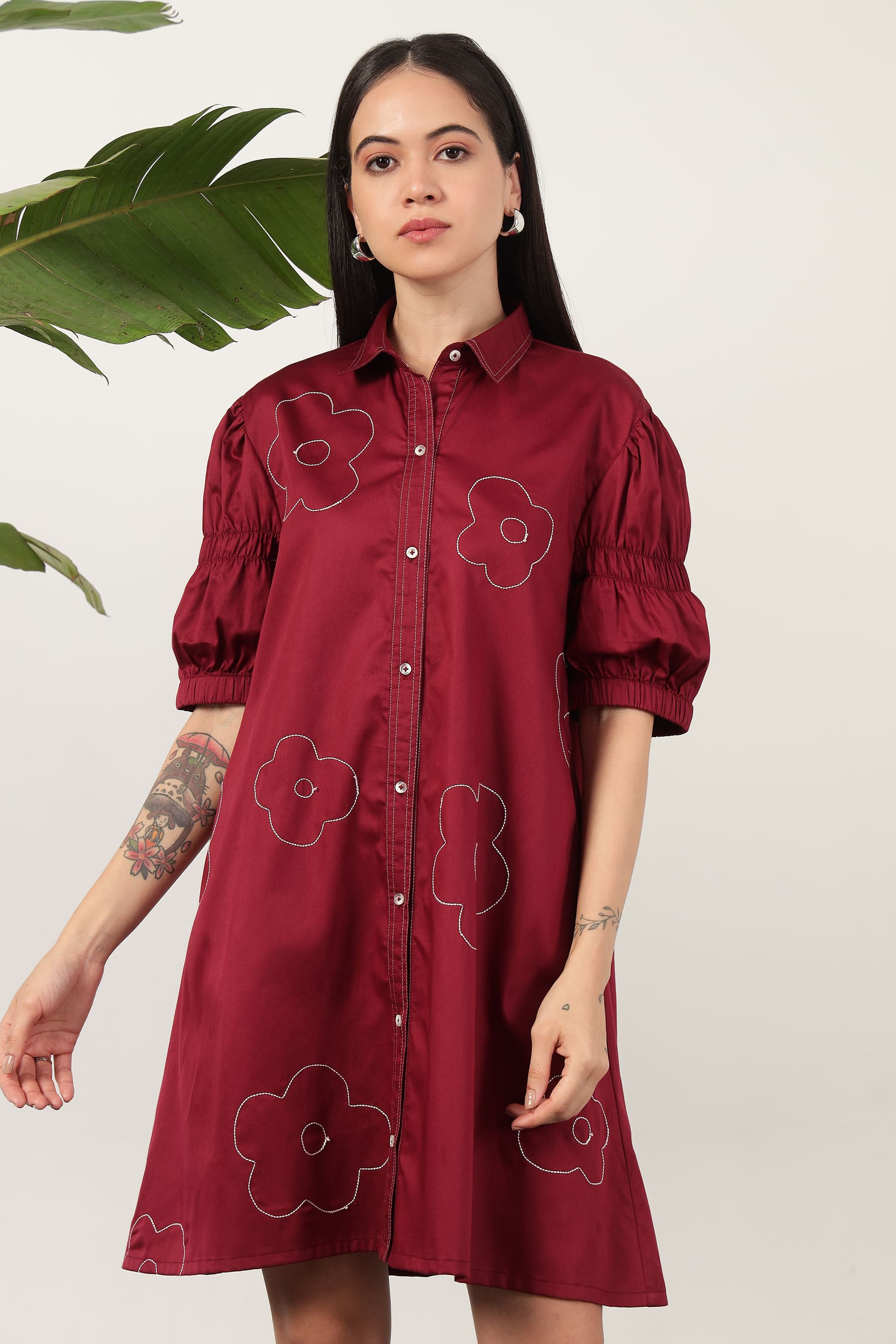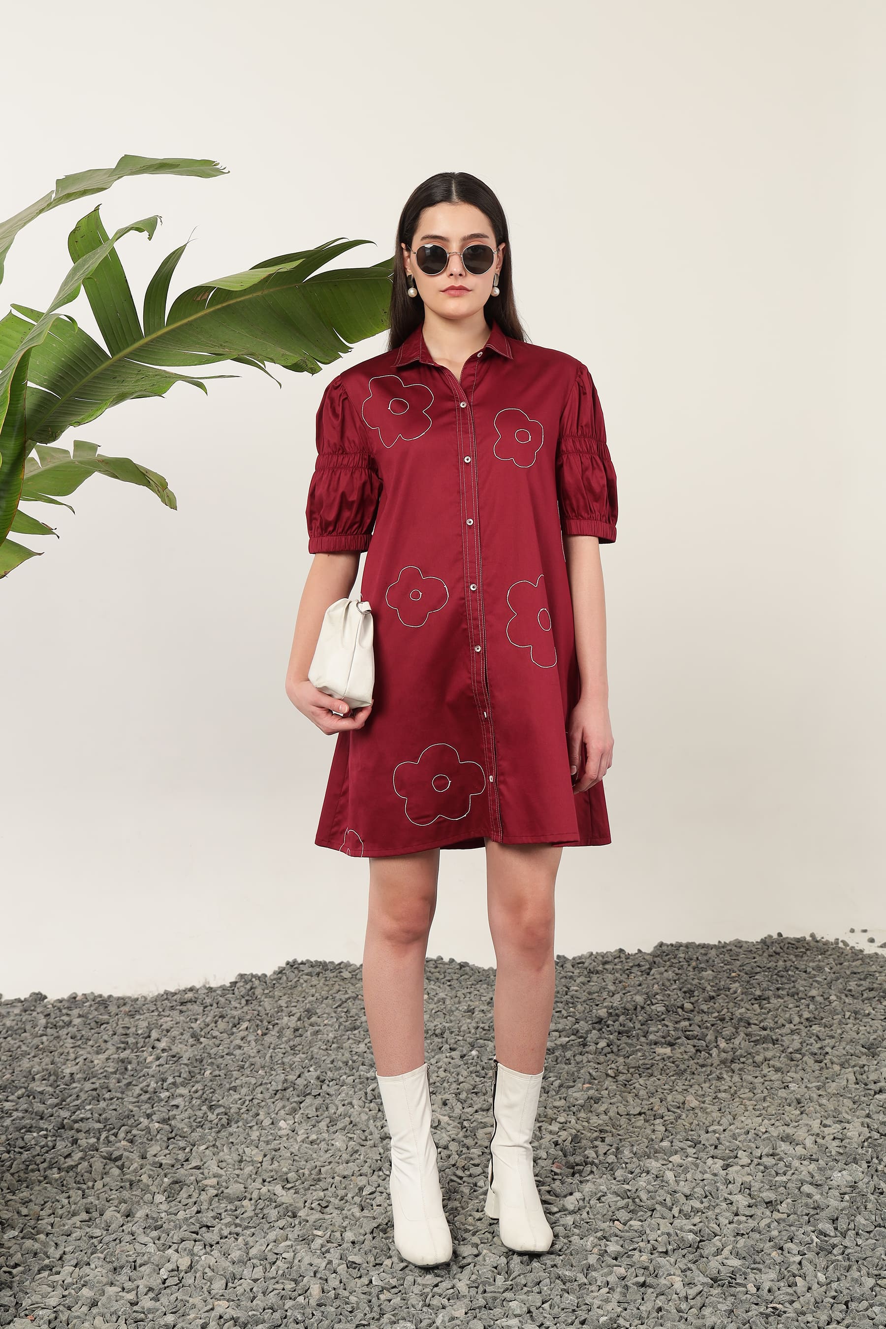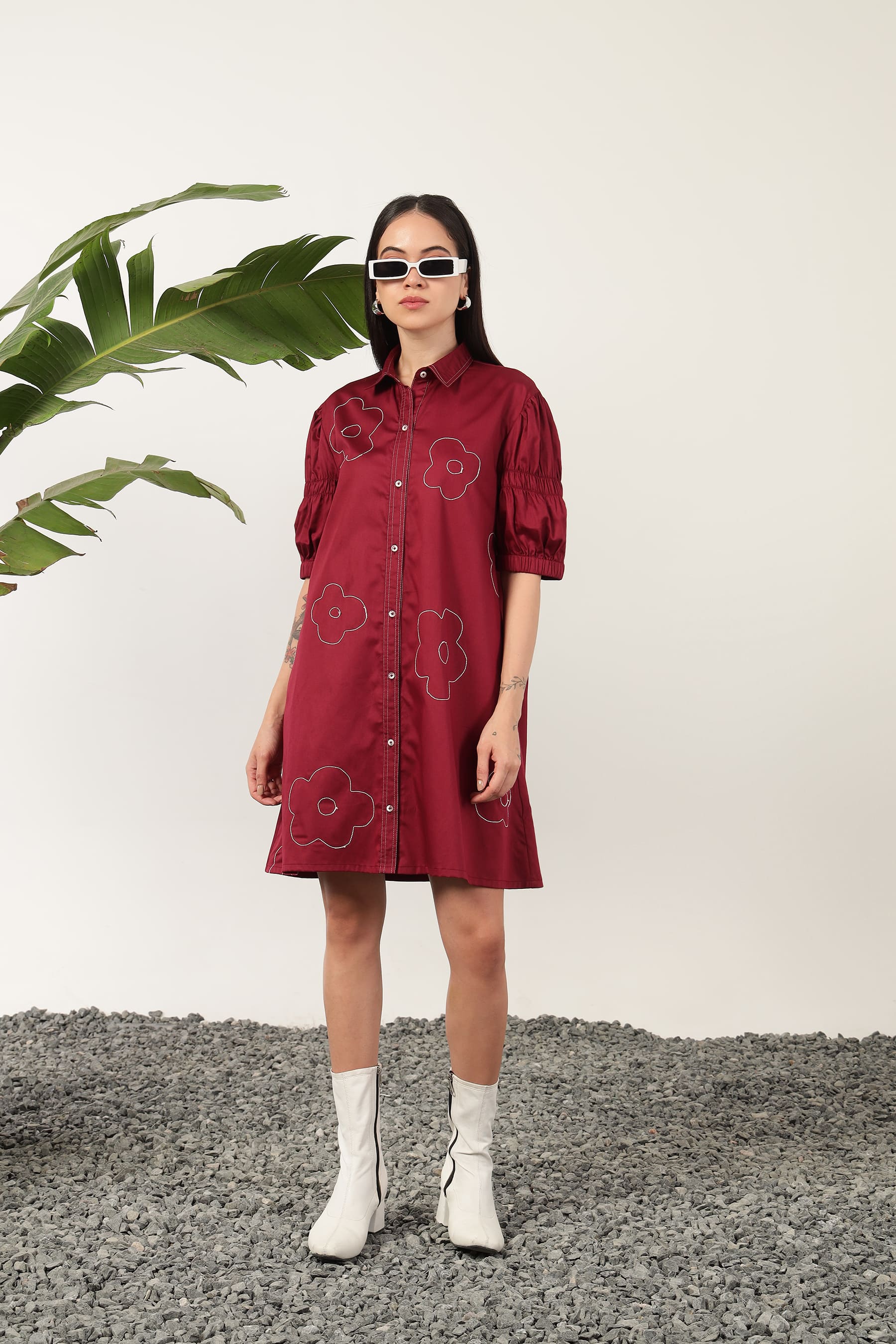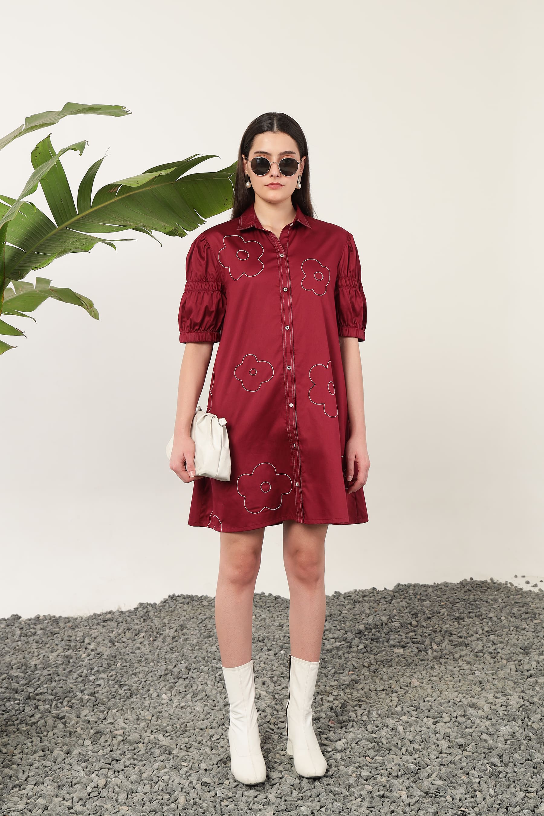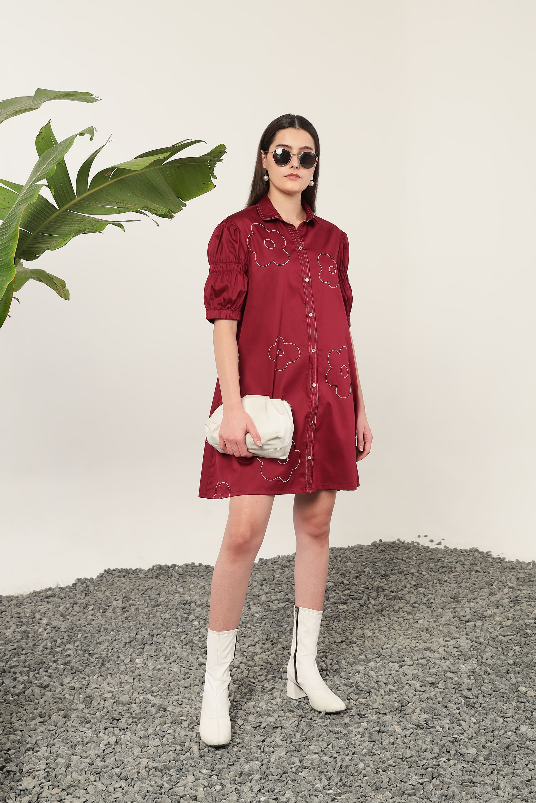 Elevate your vacation wardrobe with the Stella Floral Shirt Dress in rich burgundy. This sophisticated piece features delicate white thread flower line embroidery on luxurious cotton satin fabric. The elasticated sleeve details provide both comfort and elegance, while the flattering A-line silhouette creates a chic, effortless profile perfect for refined leisure occasions.