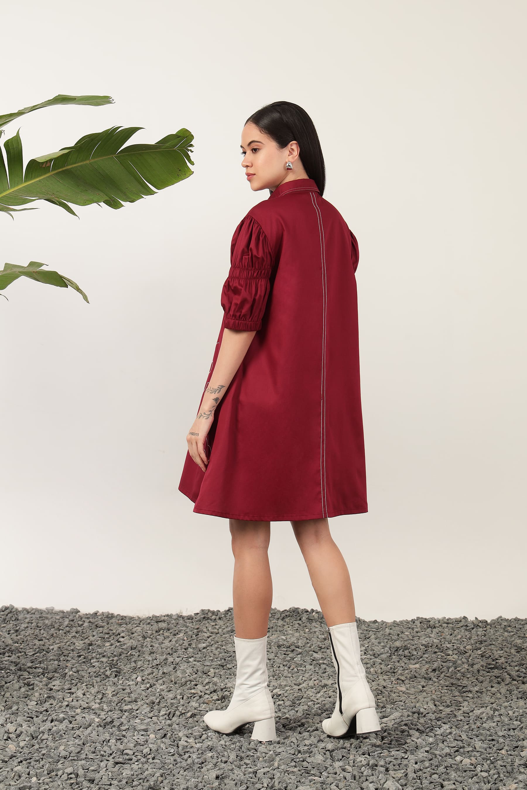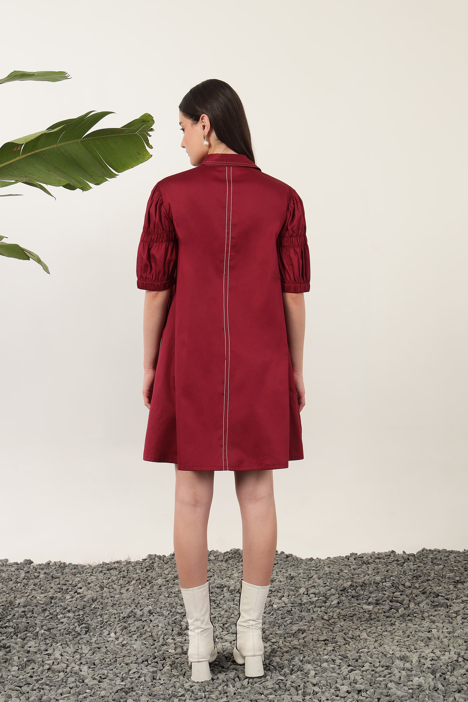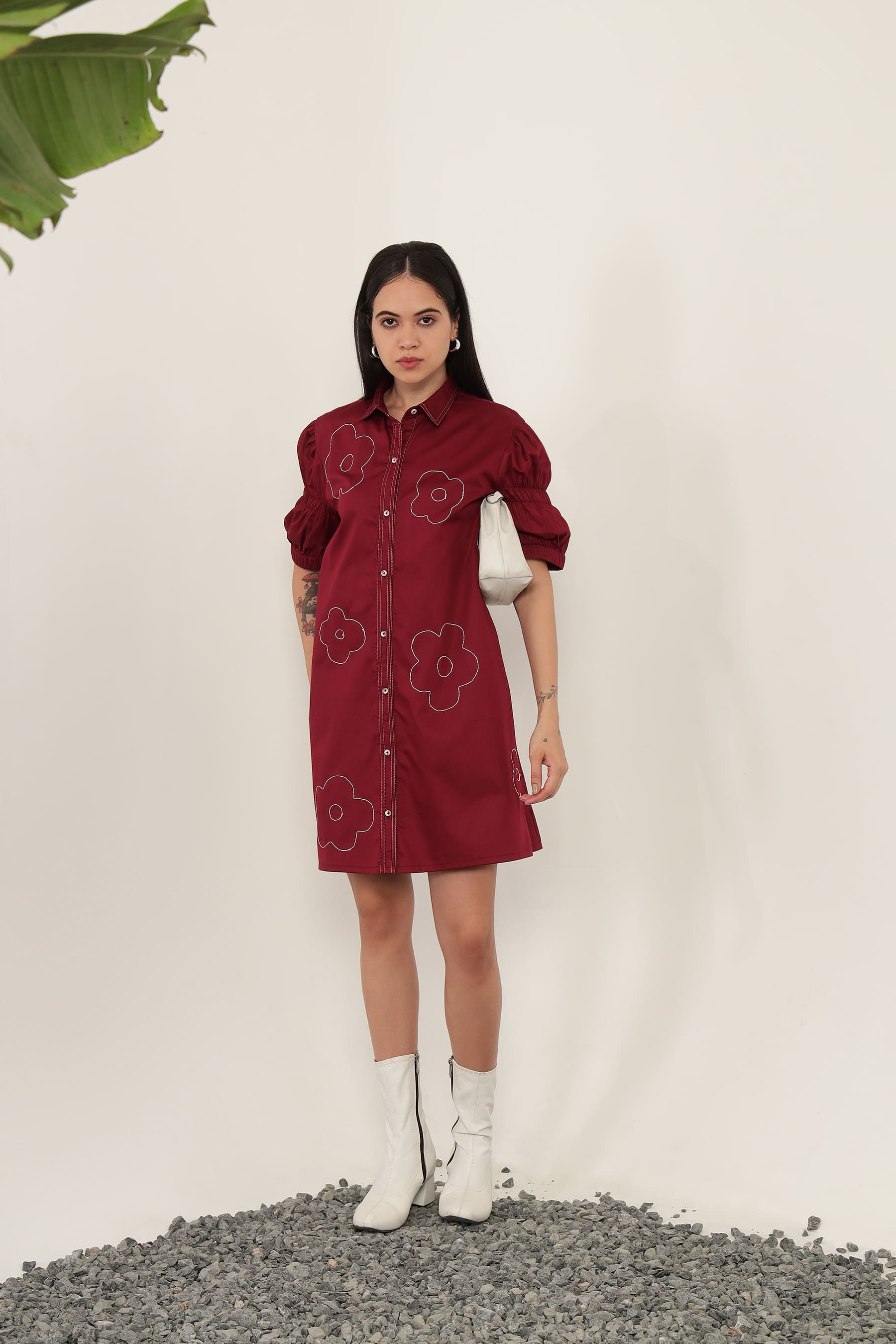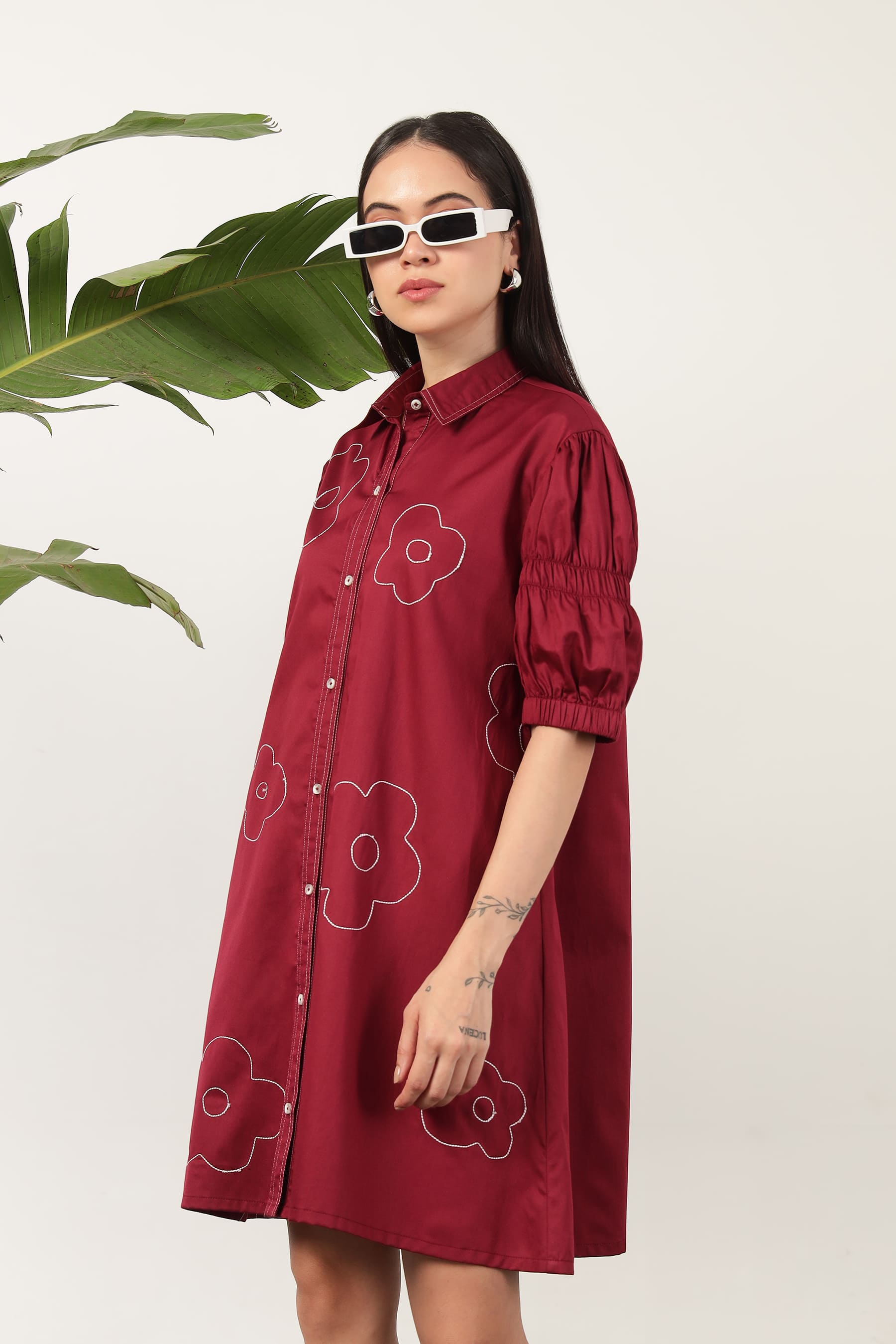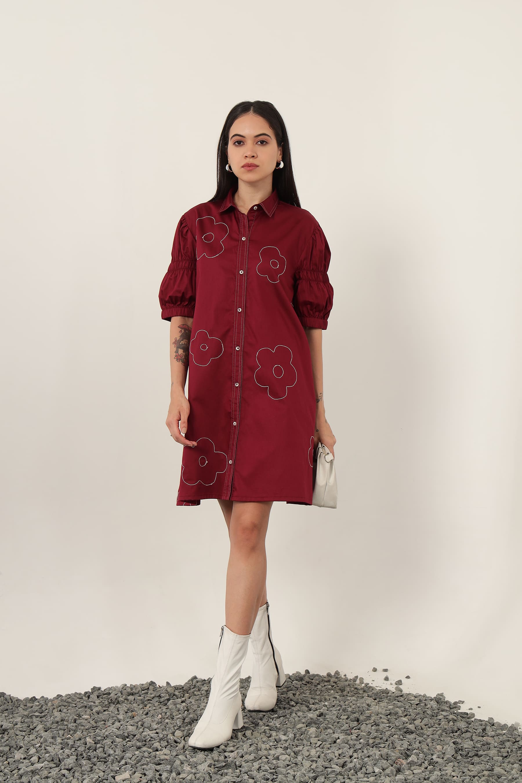 Elevate your vacation wardrobe with the Stella Floral Shirt Dress in rich burgundy. This sophisticated piece features delicate white thread flower line embroidery on luxurious cotton satin fabric. The elasticated sleeve details provide both comfort and elegance, while the flattering A-line silhouette creates a chic, effortless profile perfect for refined leisure occasions.