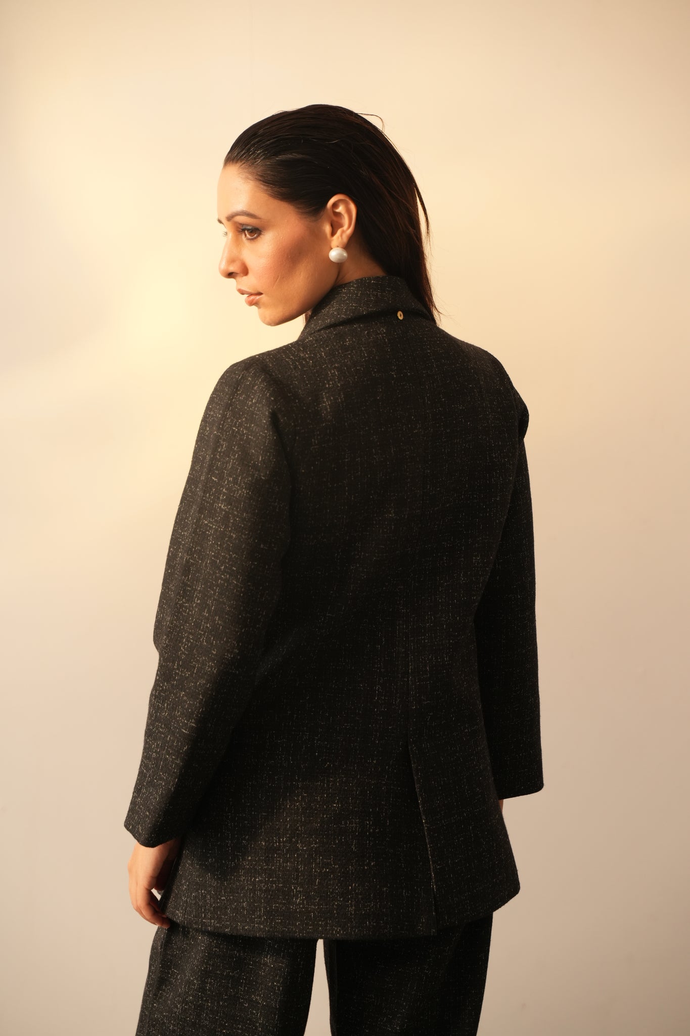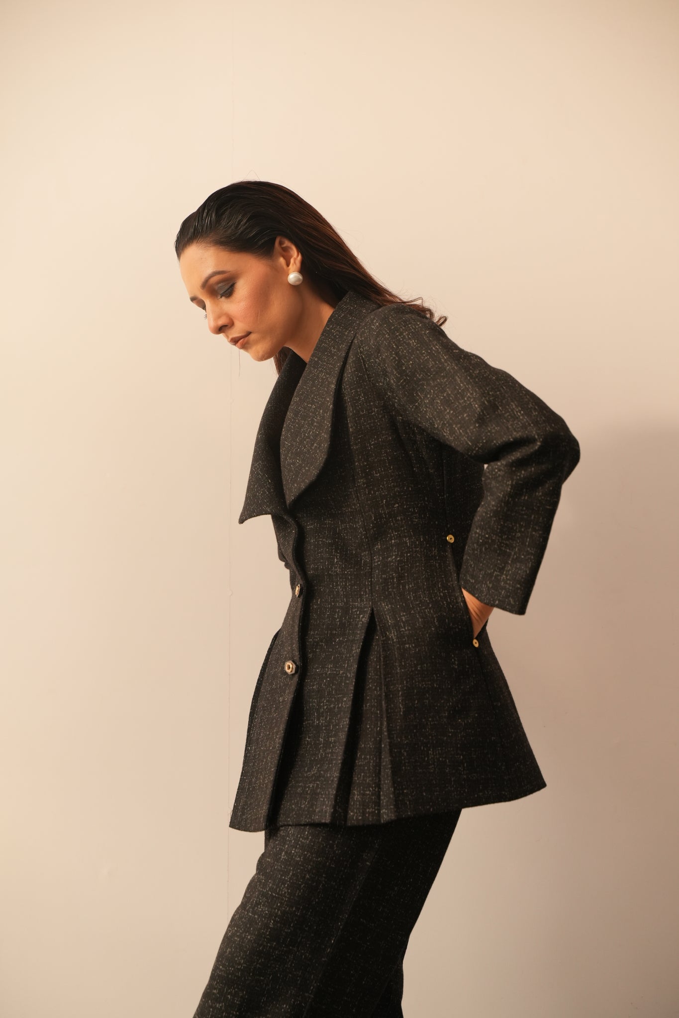 The Serena Black Slub Jacket is fashionable, versatile, and perfect for any occasion. Crafted with wool fabric in classic black slub for a timeless elegance, this jacket features a round, feminine lapel with a front box pleat and adorned with 2 stunning buttons & pocket for a subtly sophisticated look.