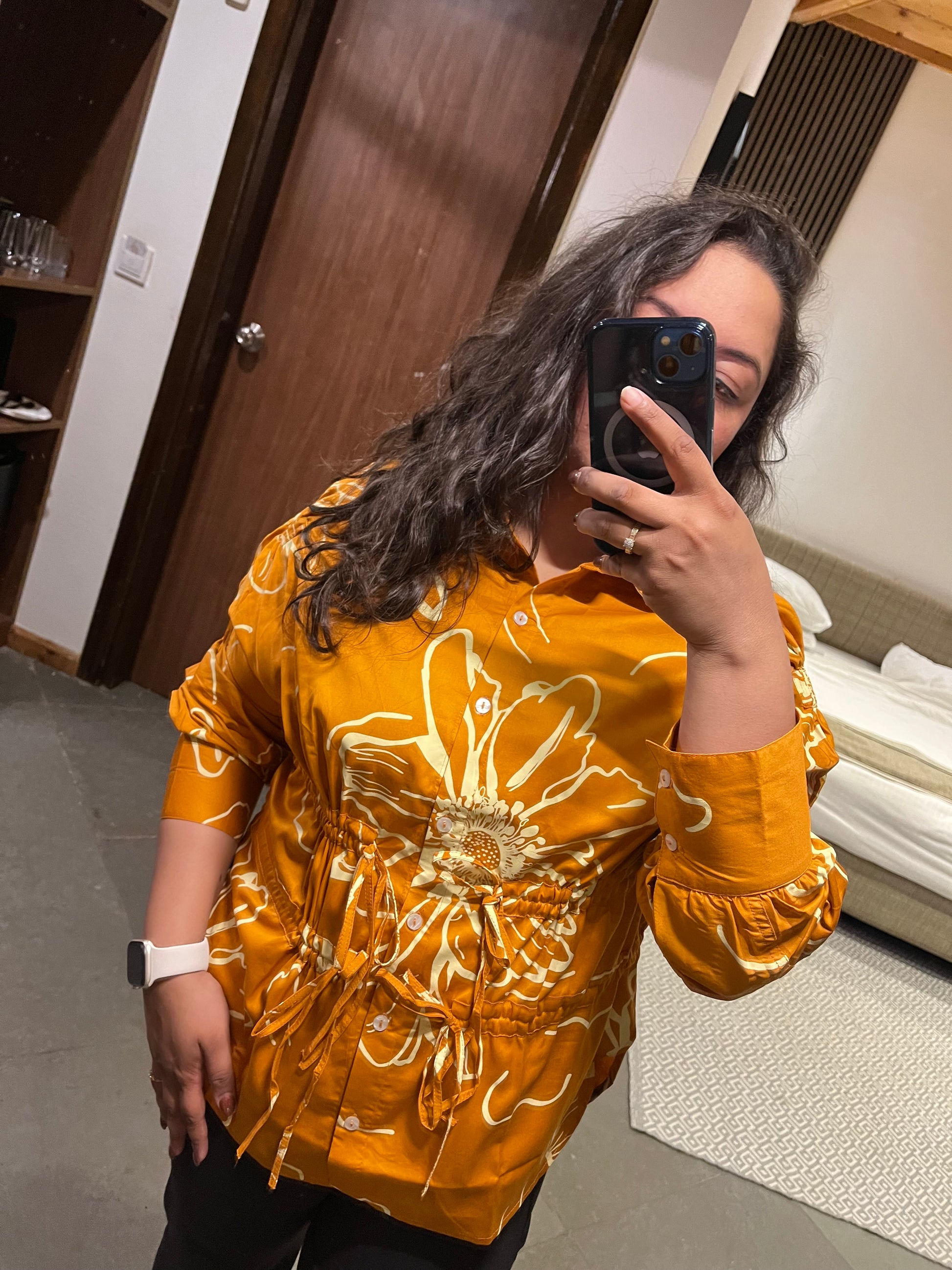 Flora, the name of the Roman goddess of flowers and spring, who enjoyed eternal youth, same as our flora shirt. Hand printed in Tangerine colour on luxurious cotton satin fabric. Has draw strings on the waist to scrunch it the way you want it. Flora shirt is definitely the best to pair up with your favourite pair of denims.