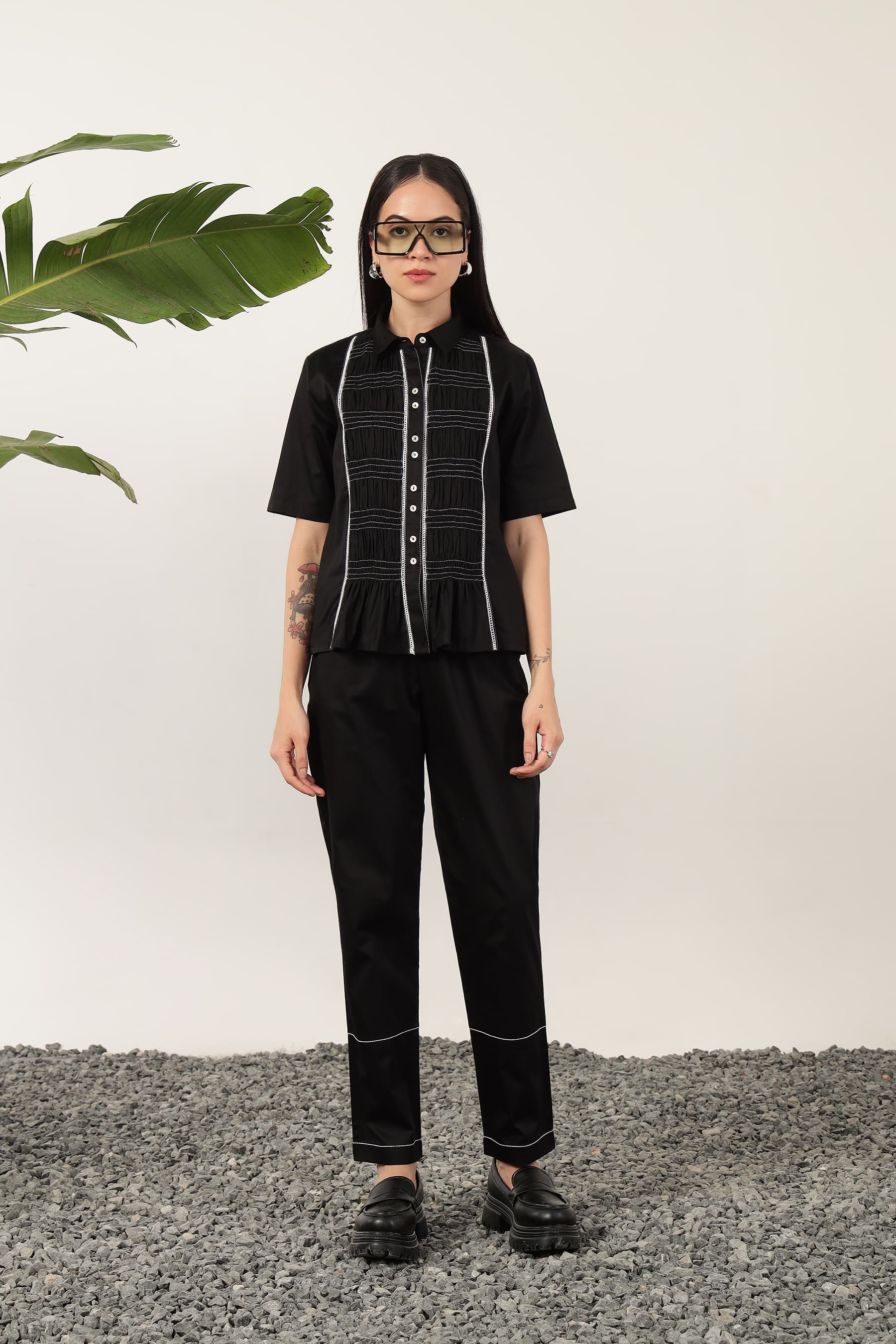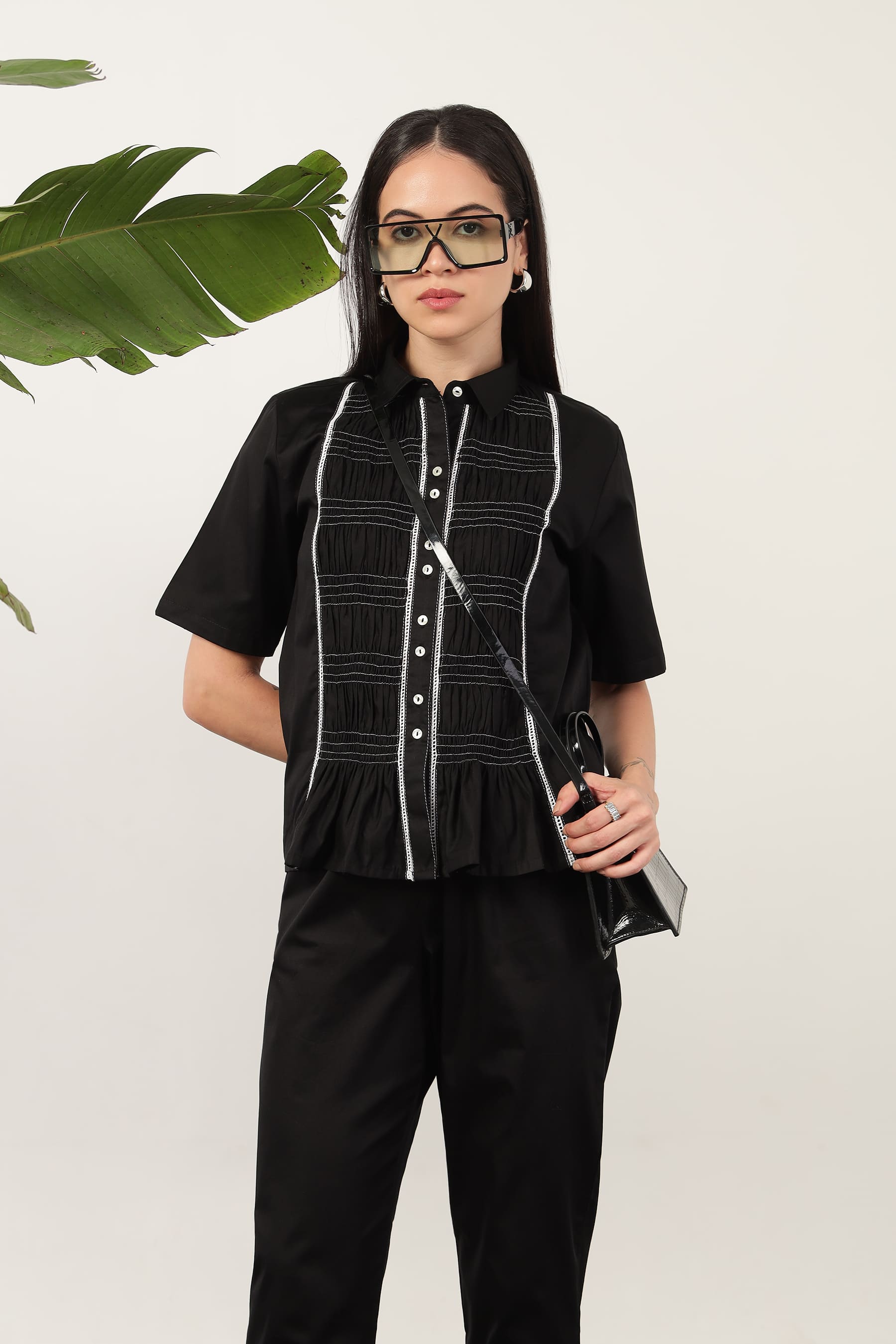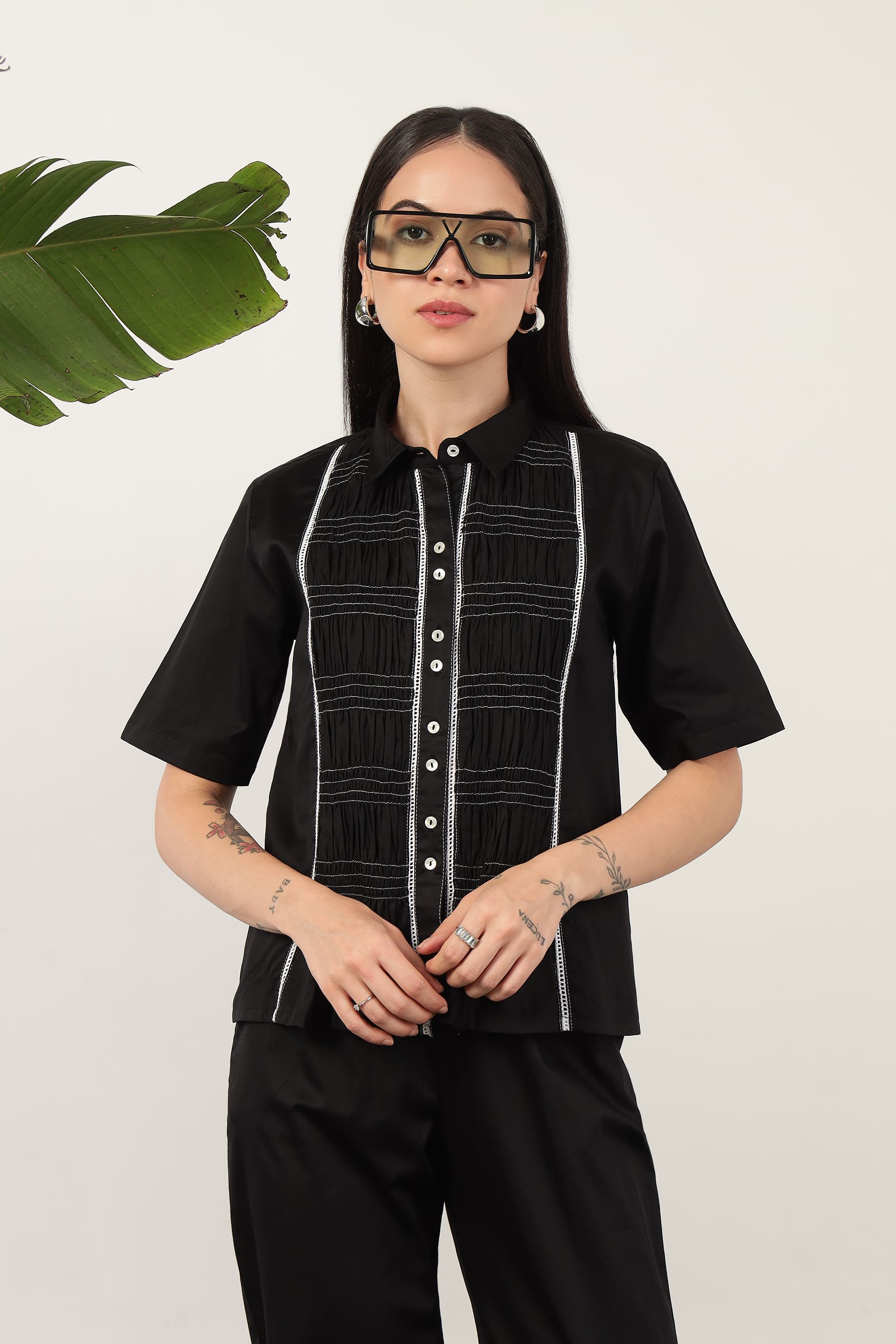 The Vento Shirt in Black is a refined blend of elegance and ease. Tailored from luxurious cotton satin, it features delicate lace embellishments and meticulous contrast stitching that adds depth and sophistication. Designed with a relaxed silhouette, this versatile shirt transitions seamlessly from office meetings to evening outings, making it a timeless essential in any modern wardrobe.