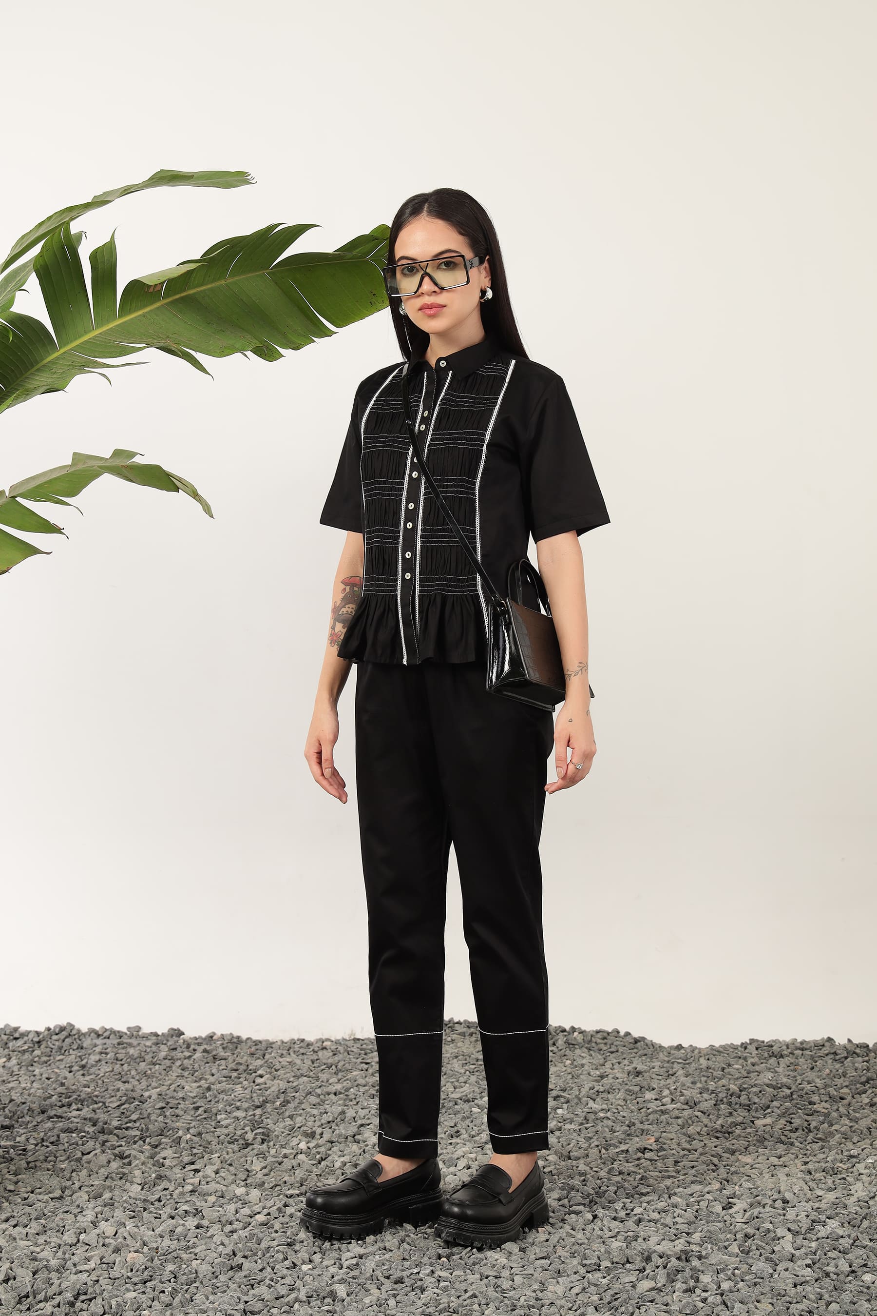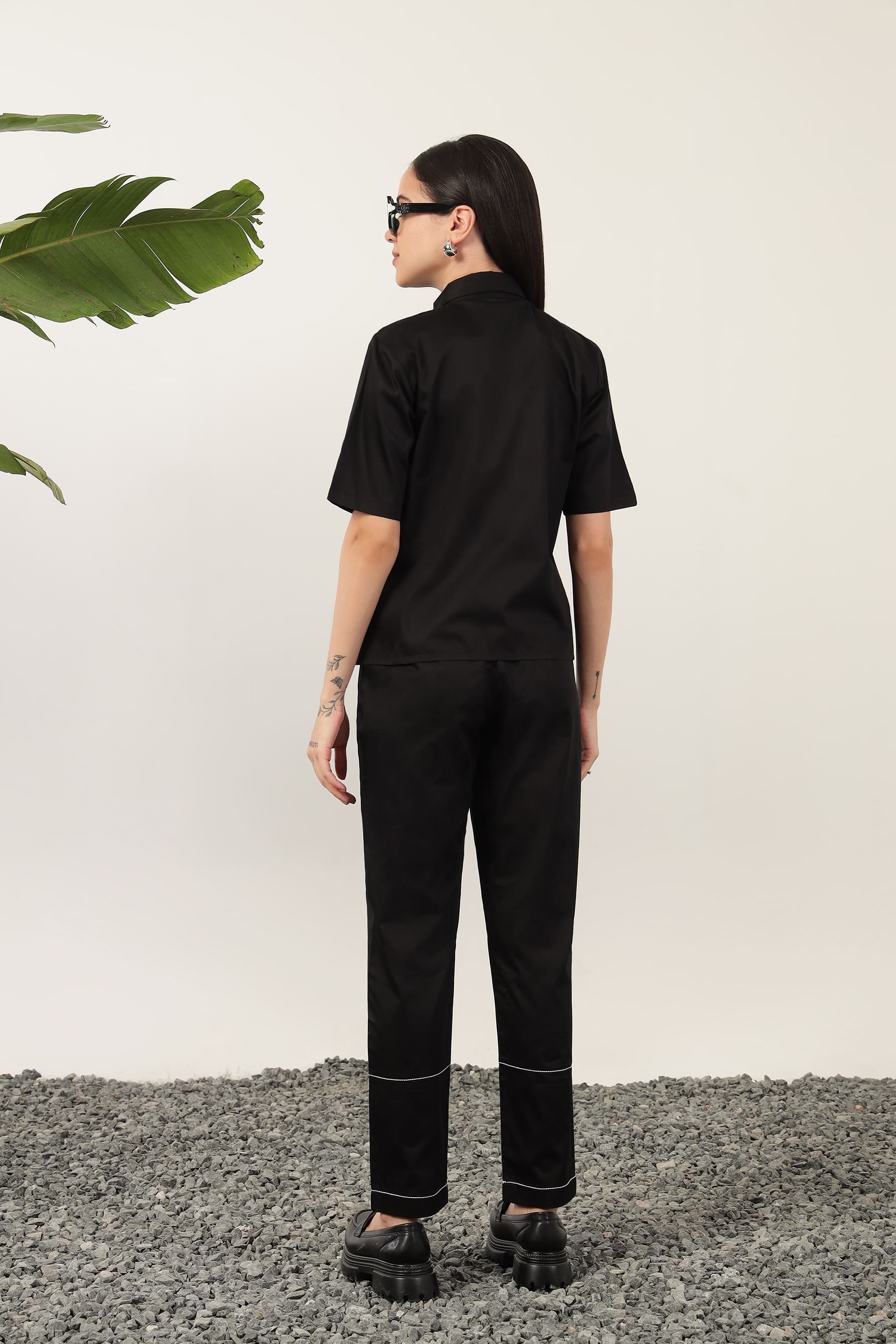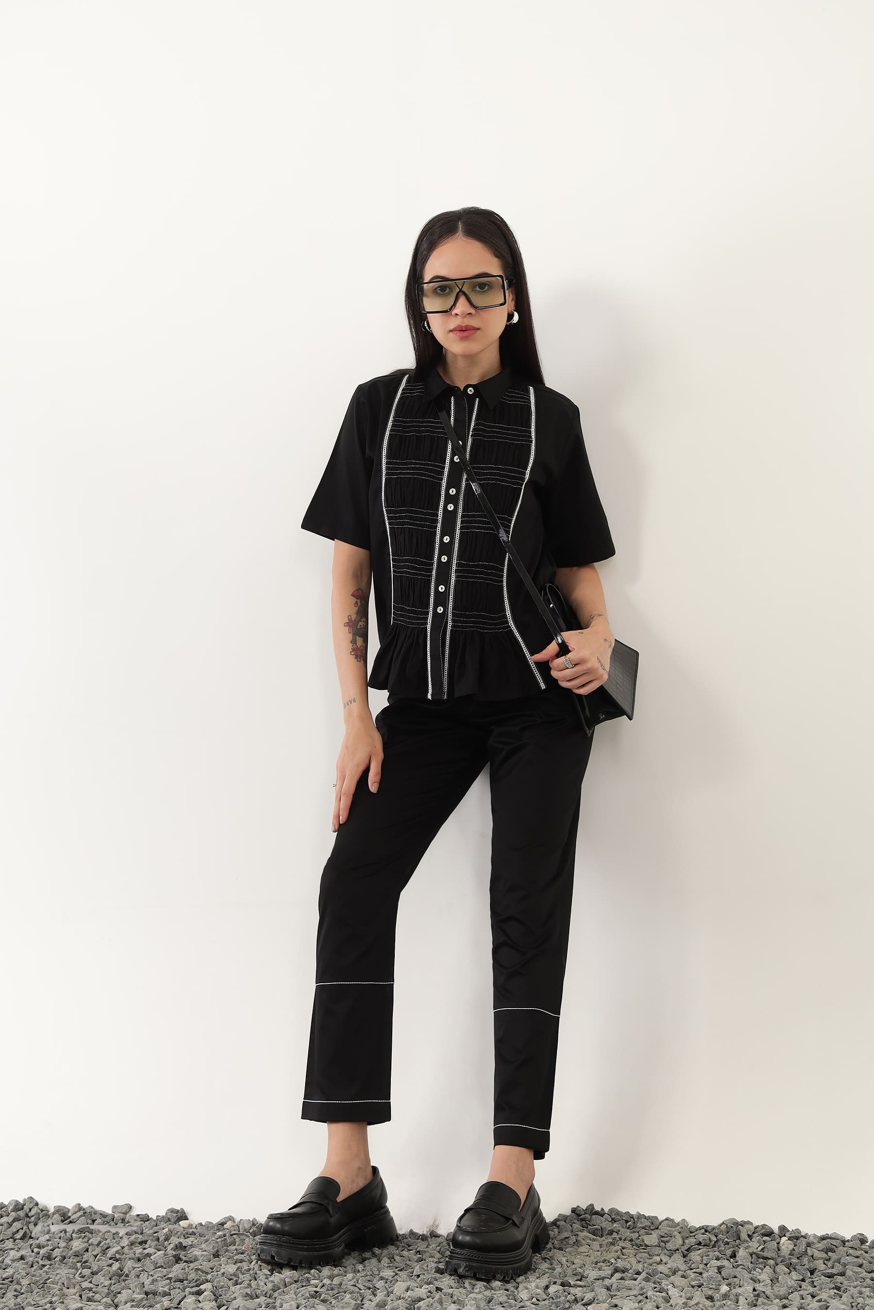 The Vento Shirt in Black is a refined blend of elegance and ease. Tailored from luxurious cotton satin, it features delicate lace embellishments and meticulous contrast stitching that adds depth and sophistication. Designed with a relaxed silhouette, this versatile shirt transitions seamlessly from office meetings to evening outings, making it a timeless essential in any modern wardrobe.