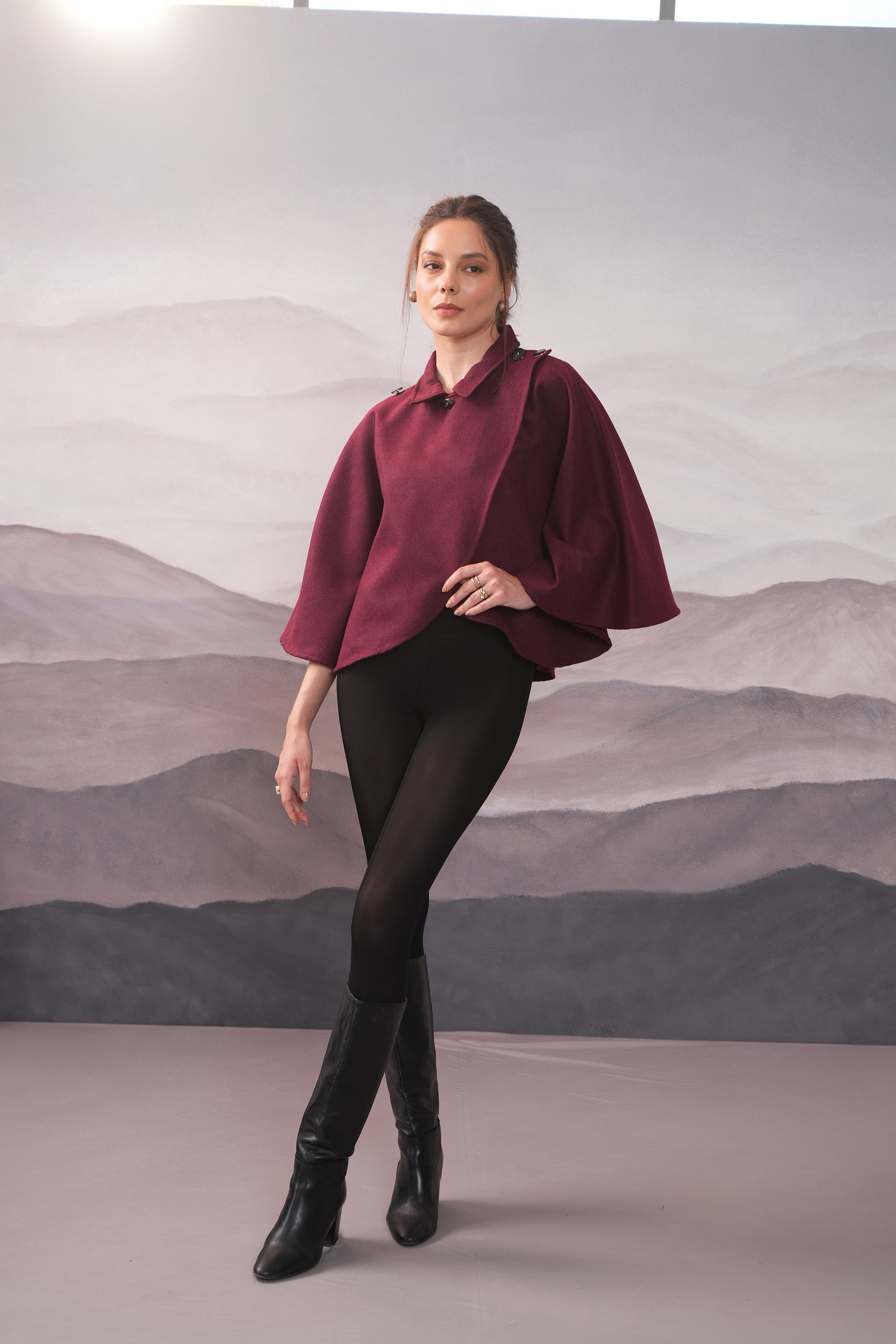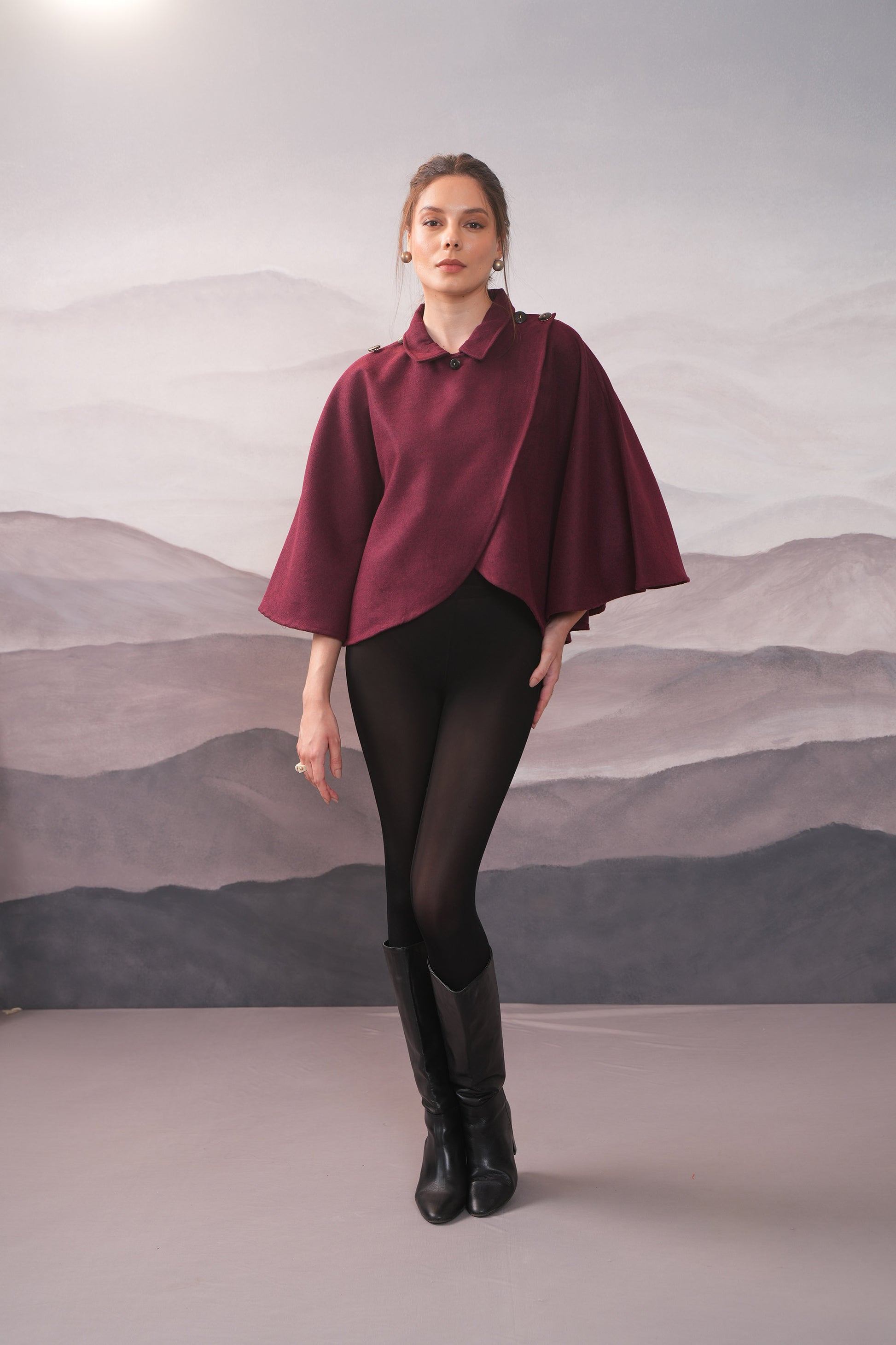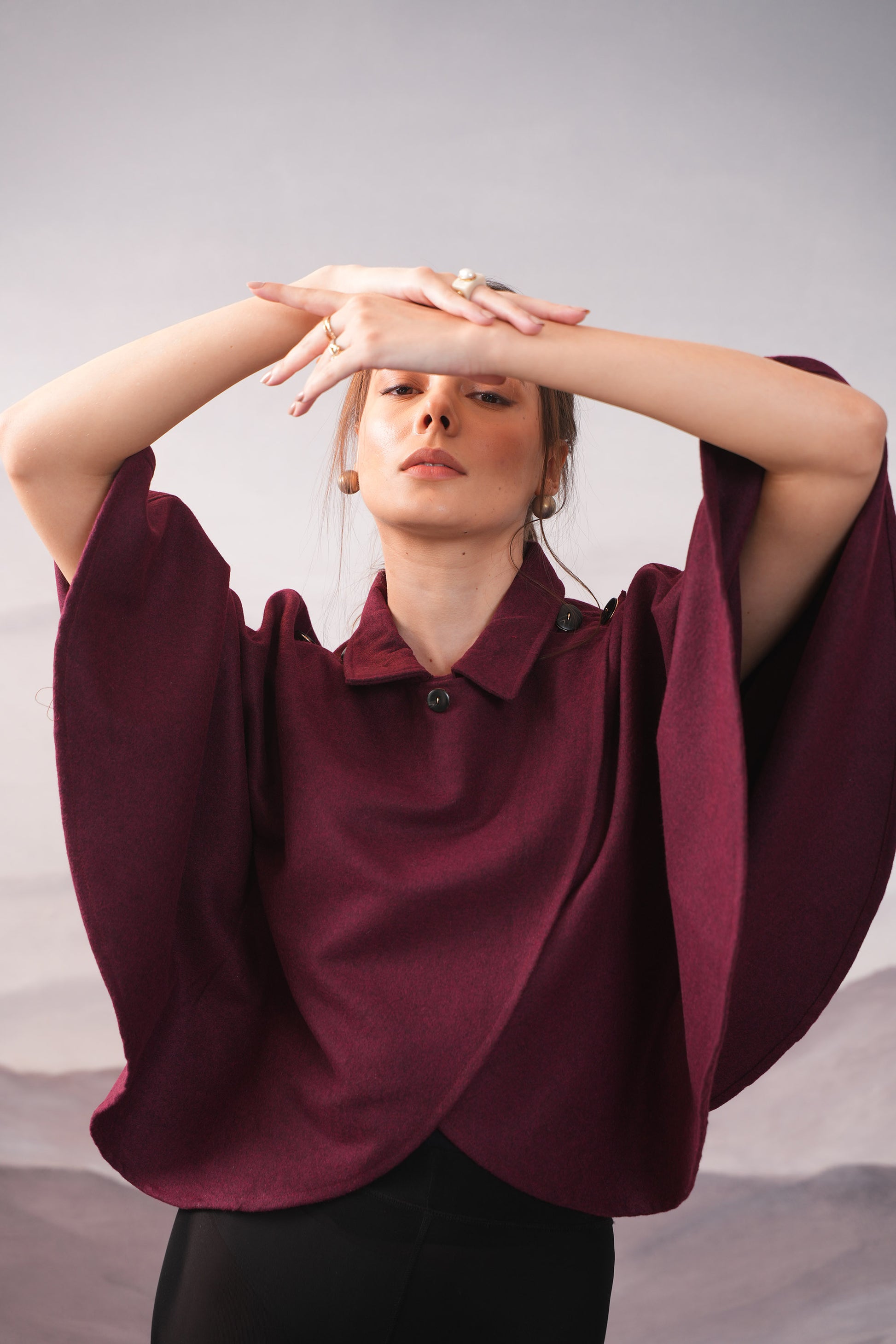 Stay warm and stylish with our wine wool cape. Made with high-quality woollen fabric, this chic cape is perfect for any occasion, from brunches to dinners. Pair it with your favorite bottoms for a smart silhouette. With its rich burgundy colour, this cape will elevate any outfit.