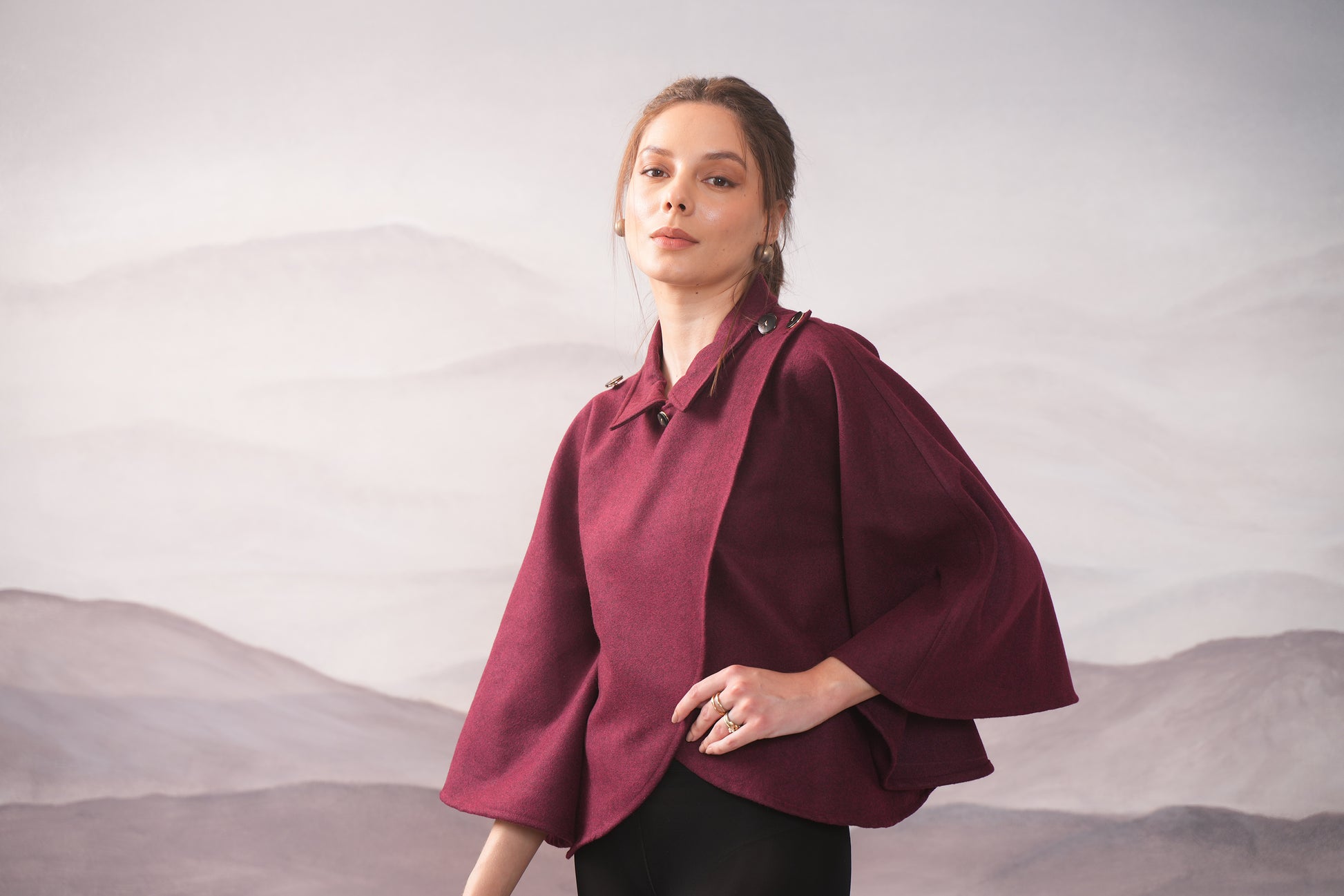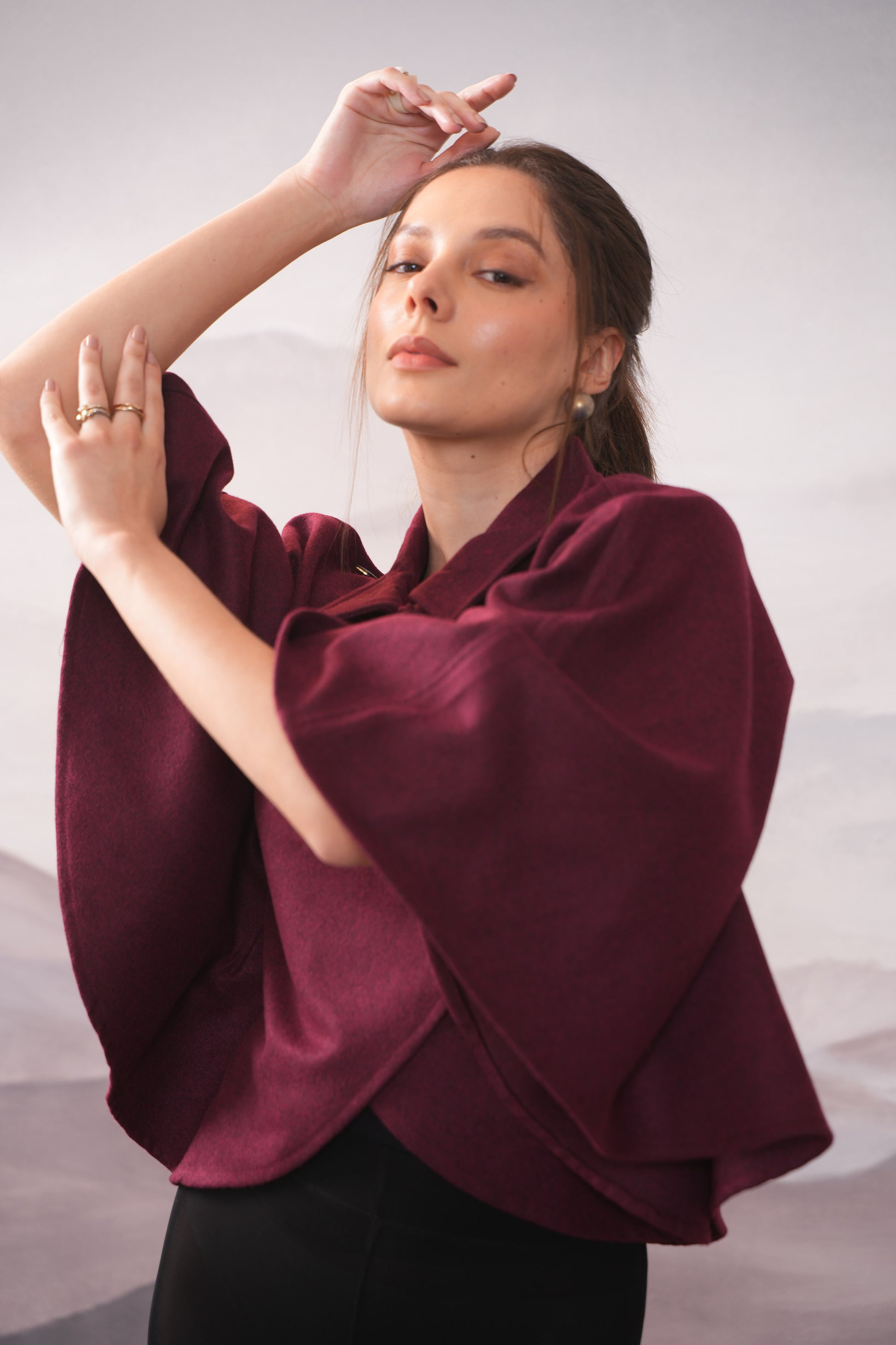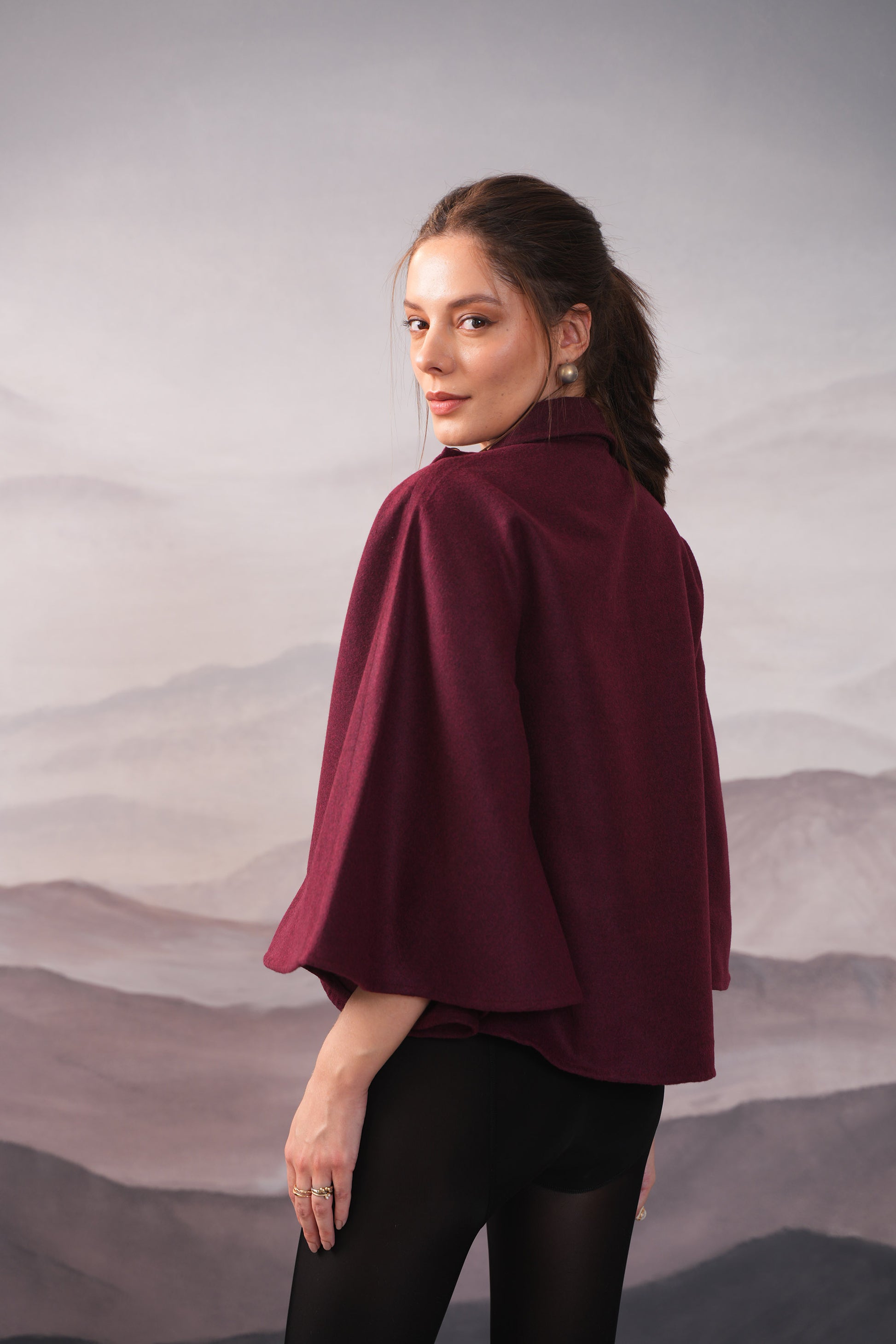 Stay warm and stylish with our wine wool cape. Made with high-quality woollen fabric, this chic cape is perfect for any occasion, from brunches to dinners. Pair it with your favorite bottoms for a smart silhouette. With its rich burgundy colour, this cape will elevate any outfit.