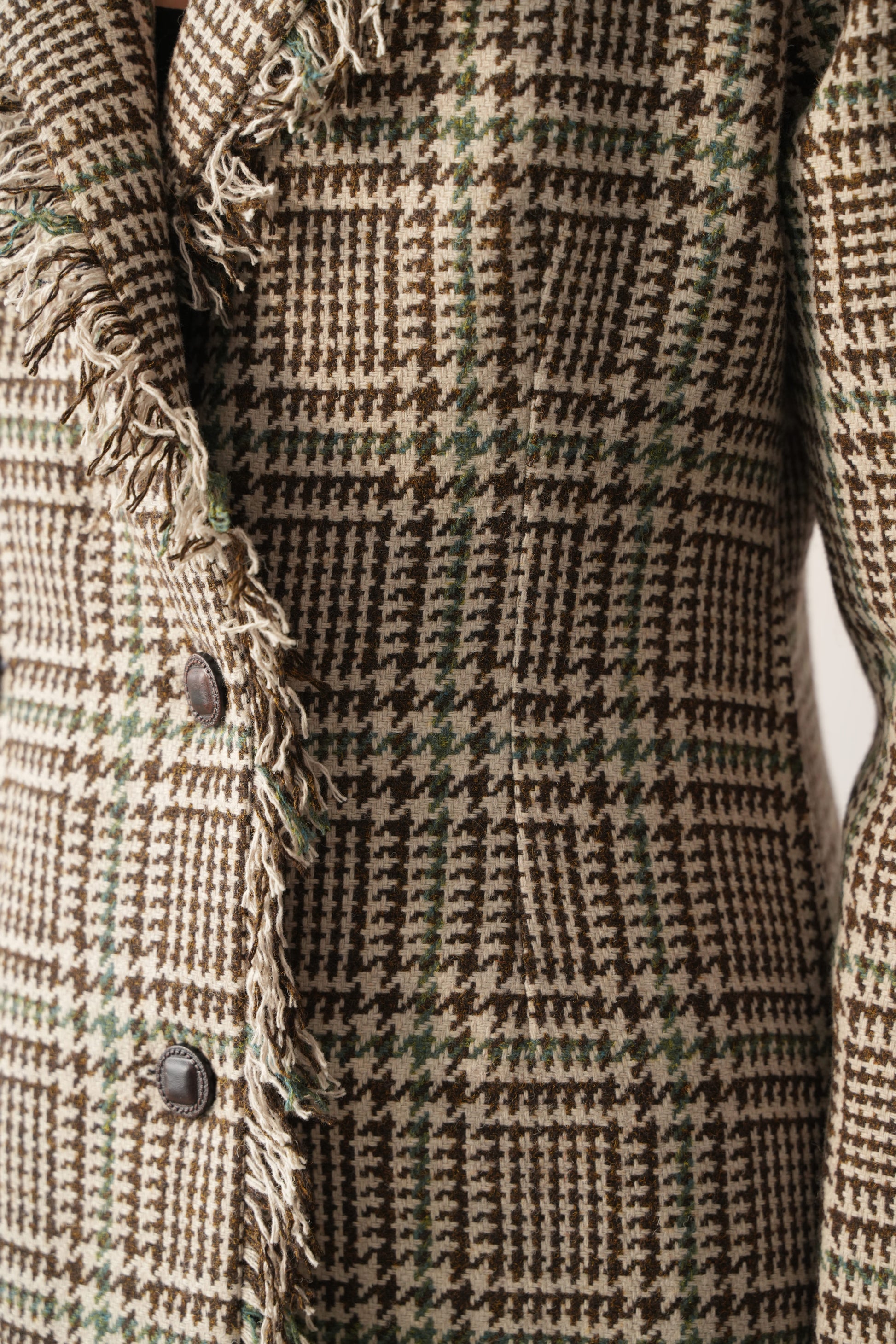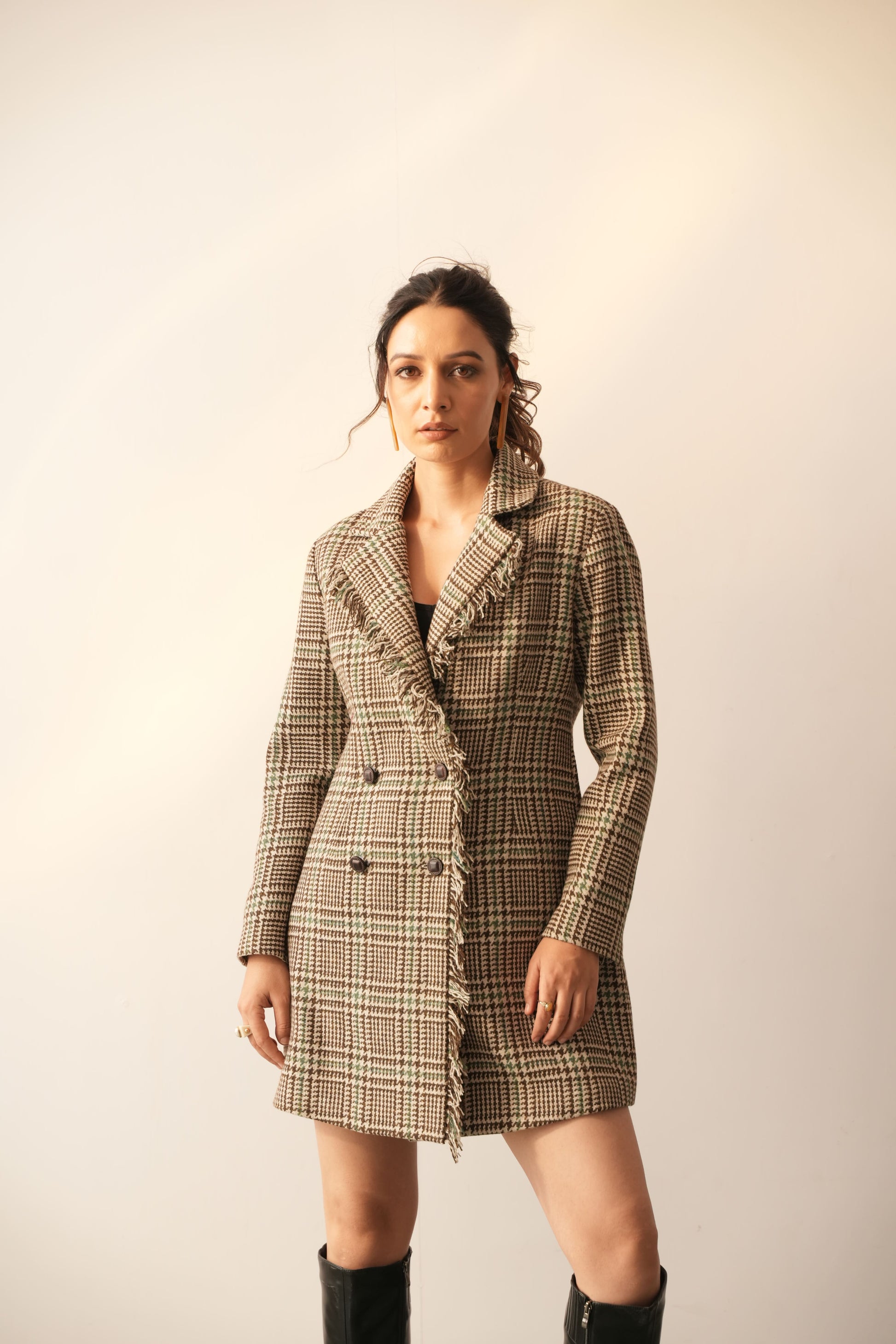 This Brown Fray Lapel Jacket Dress is a stylish essential for your wardrobe. Crafted from a luxurious brown checkered wool blend, it offers both warmth and style. Features like fray lapel detailing and elegant styling make this the perfect piece for any casual or special occasion. Enjoy the chic and comfortable fit of this dress-jacket combo and the many ways it can be styled.